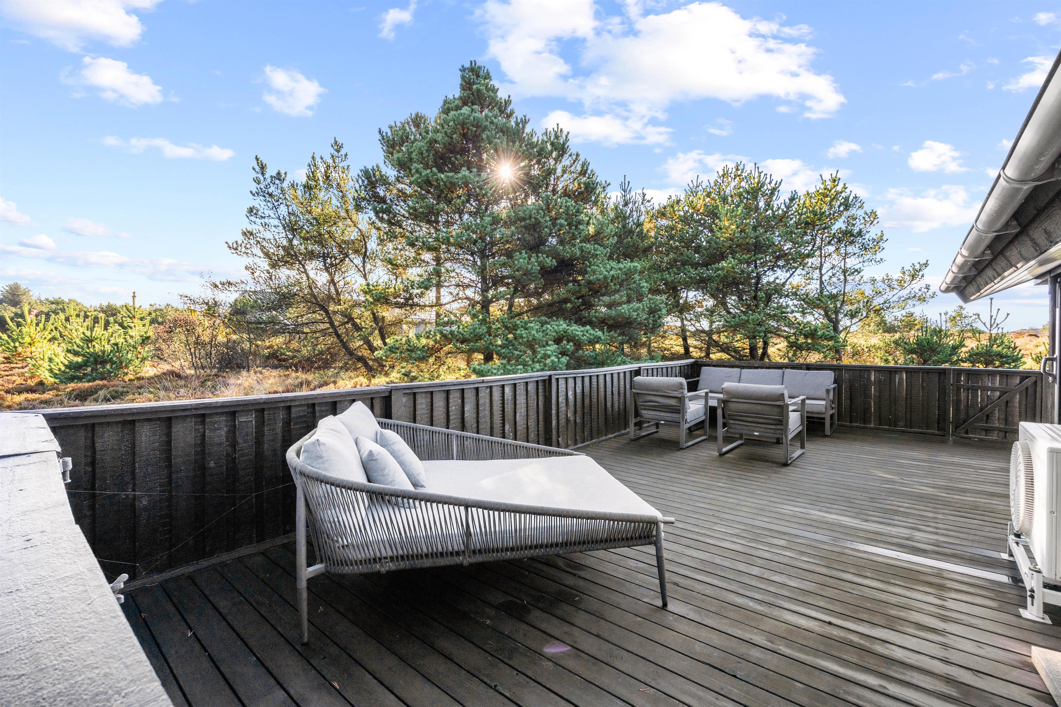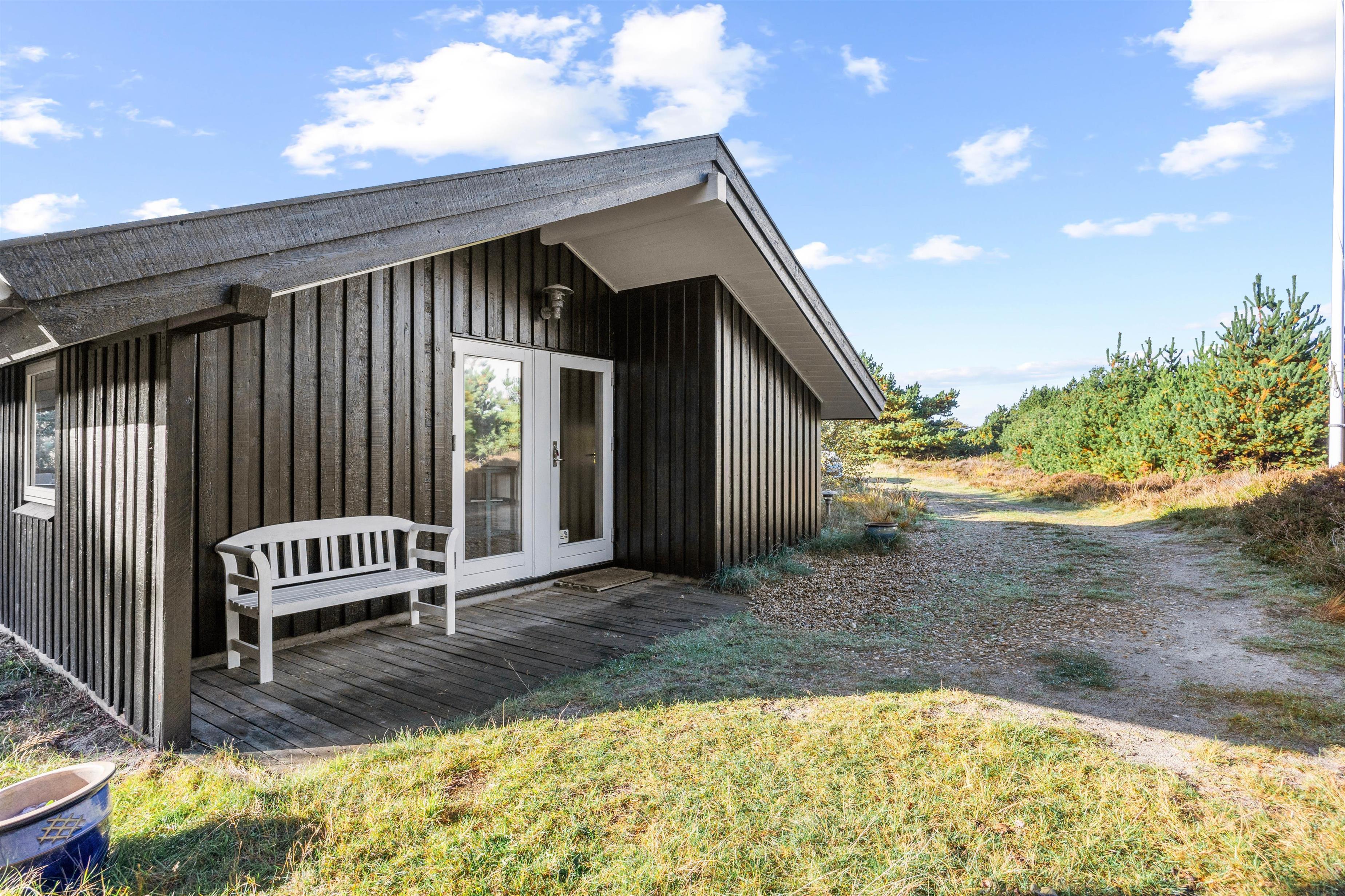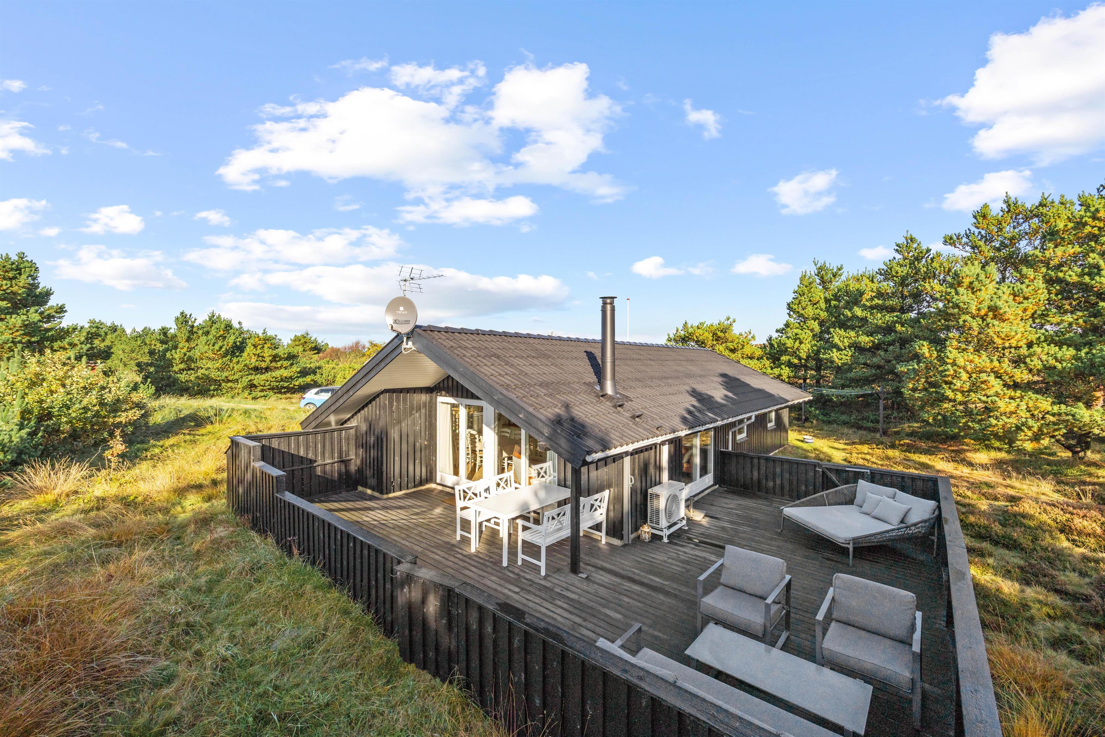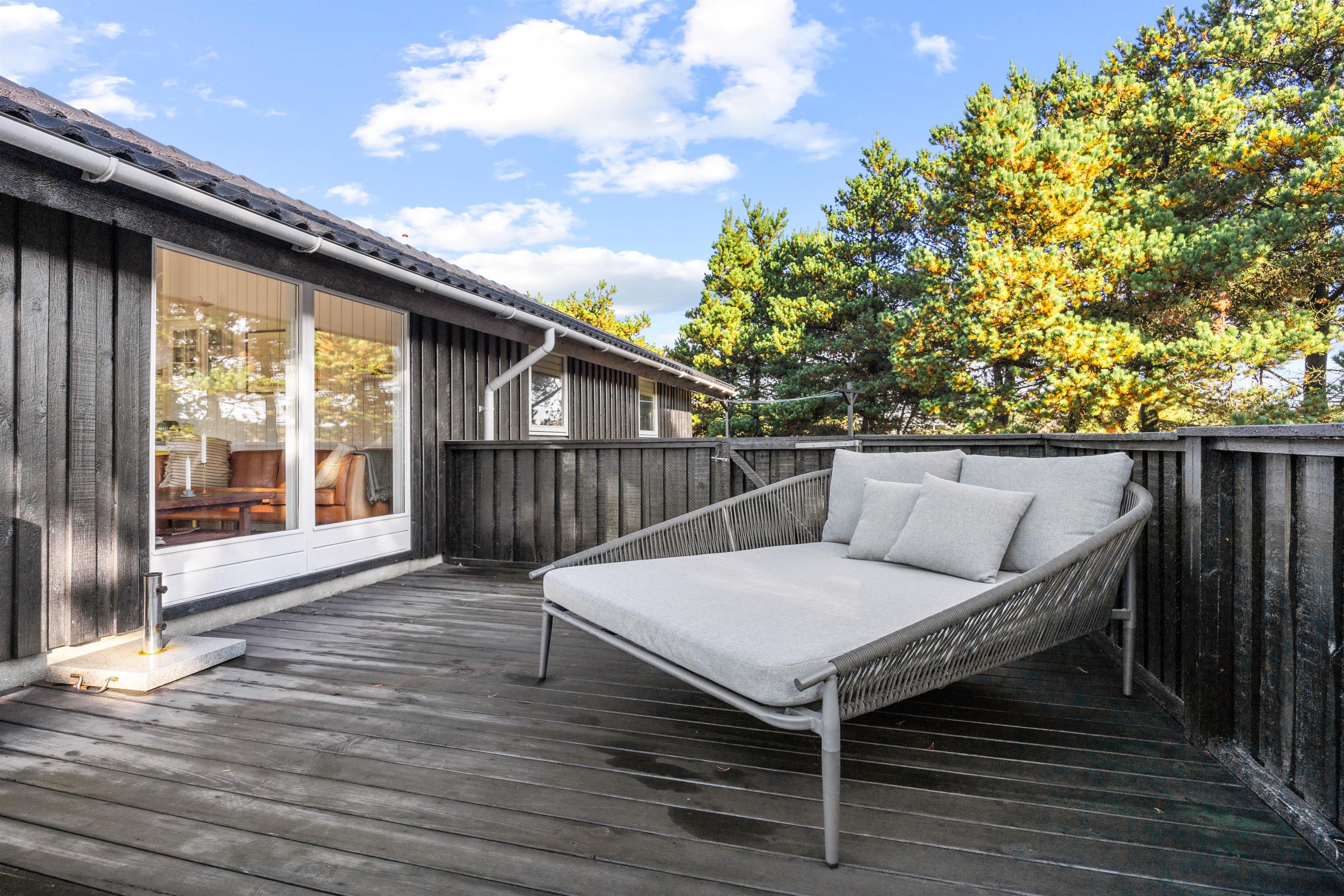 Udearealet omkring sommerhuset er et sandt paradis for friluftselskere. Beliggende på en 1346 m2 stor naturgrund kan du nyde en smuk og uforstyrret klitgrund, der giver dig en autentisk naturoplevelse lige udenfor døren. Den afskærmede, lukkede og overdækkede terrasse er et perfekt sted at tilbringe tid udendørs, uanset vejret. Her kan du slappe af i det fri med en god bog eller nyde et måltid tilberedt på gasgrillen, der også står til din rådighed - det er balsam for sjælen.