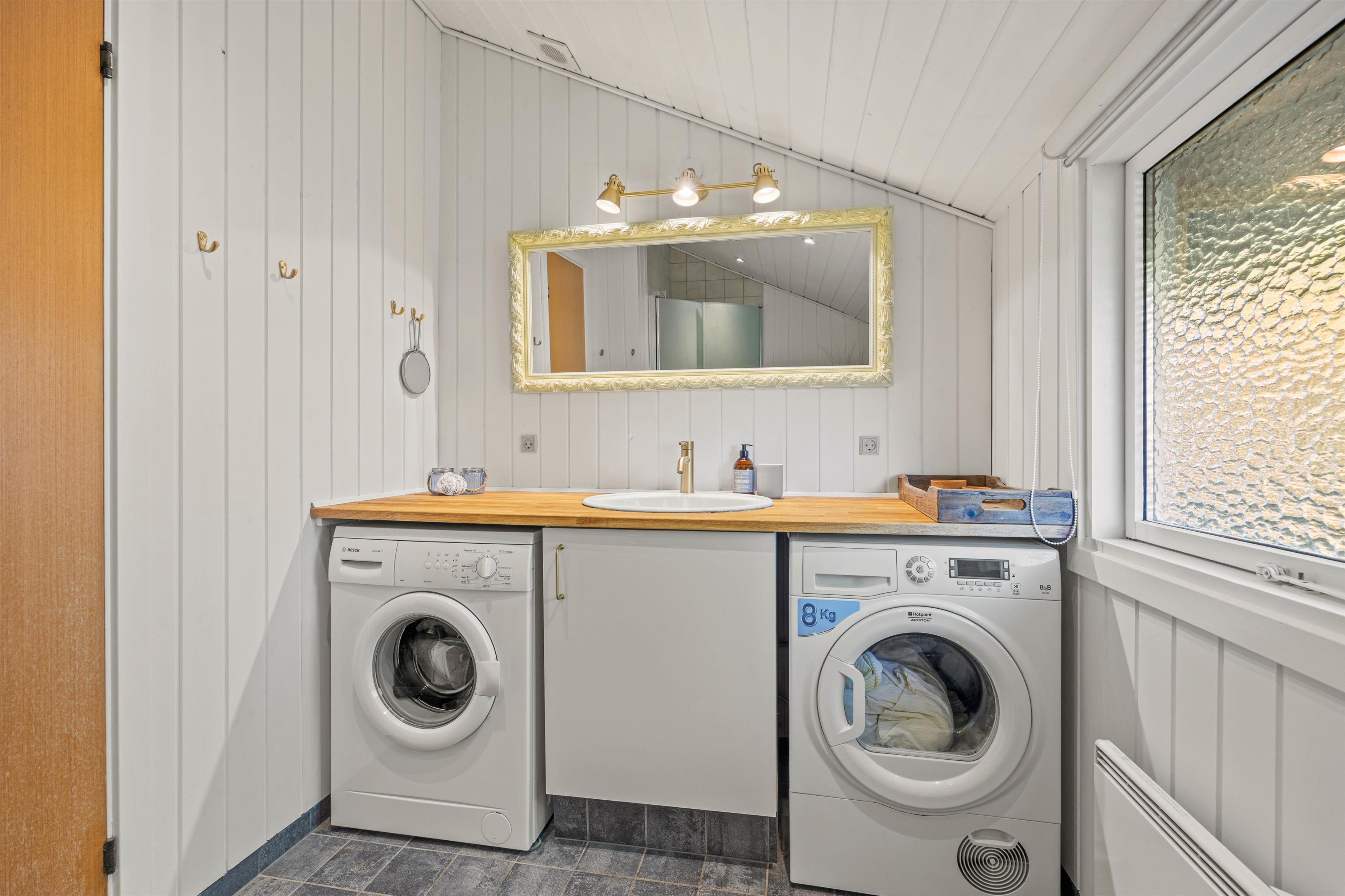Ligustervej 3 er udstyret med de praktiske faciliteter, som gør ferien ekstra bekvem: opvaskemaskinen tager hånd om servicet efter hyggelige måltider, mens vaskemaskine og tørretumbler sikrer, at friske klæder altid er inden for rækkevidde, selv under længere ophold. På kølige dage kan du nyde den behagelige varme fra en effektiv luft-til-luft varmepumpe eller hygge dig ved brændeovnen, som skaber en indbydende og afslappet stemning.