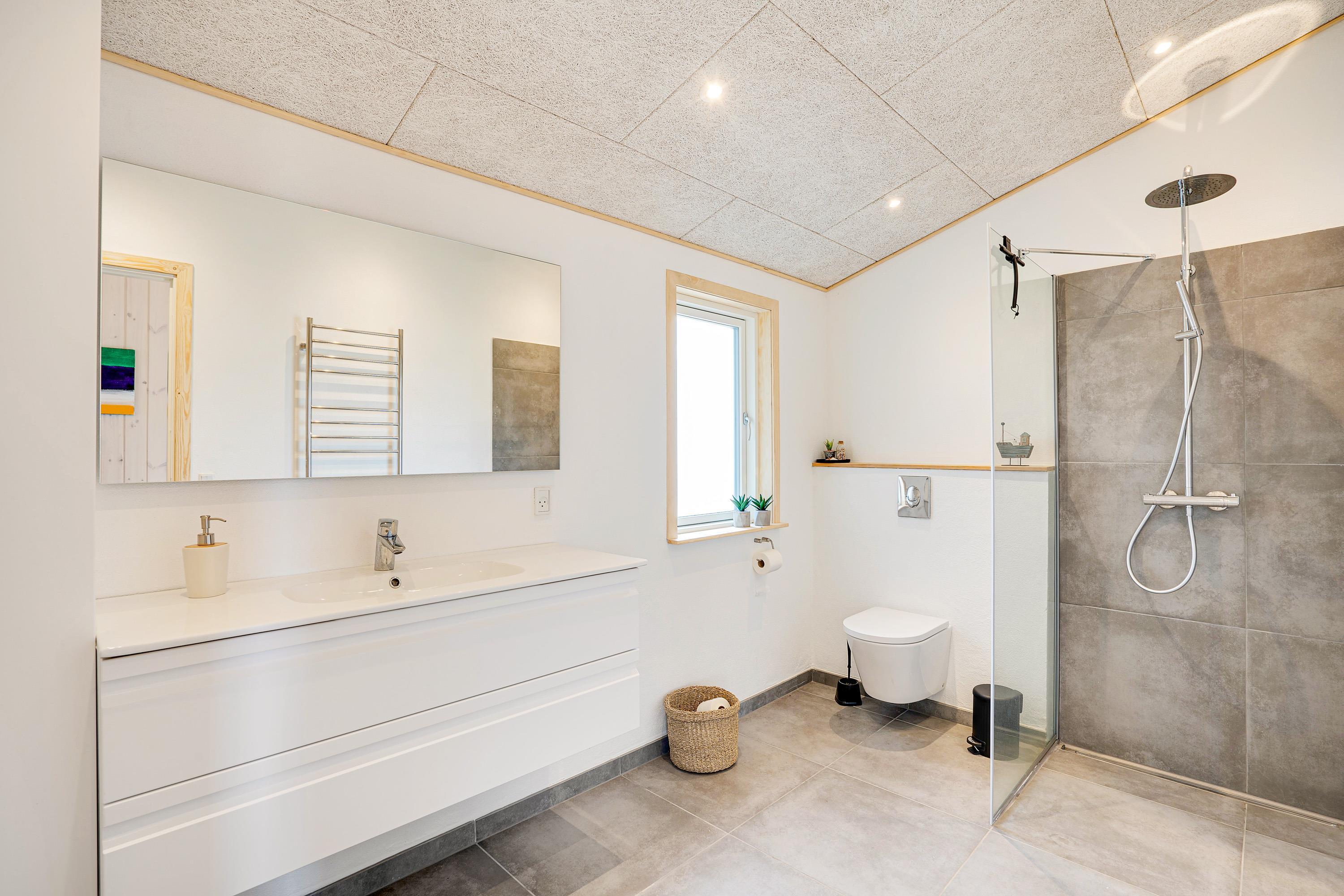 Ferieboligen er indrettet med 2 badeværelser, så I slipper for kø til brusebadet om morgenen. Der er også en energivenlig varmepumpe og en brændeovn i køkkenalrummet, som tilfører omgivelserne en ekstra portion hyggelig, klassisk sommerhusstemning.