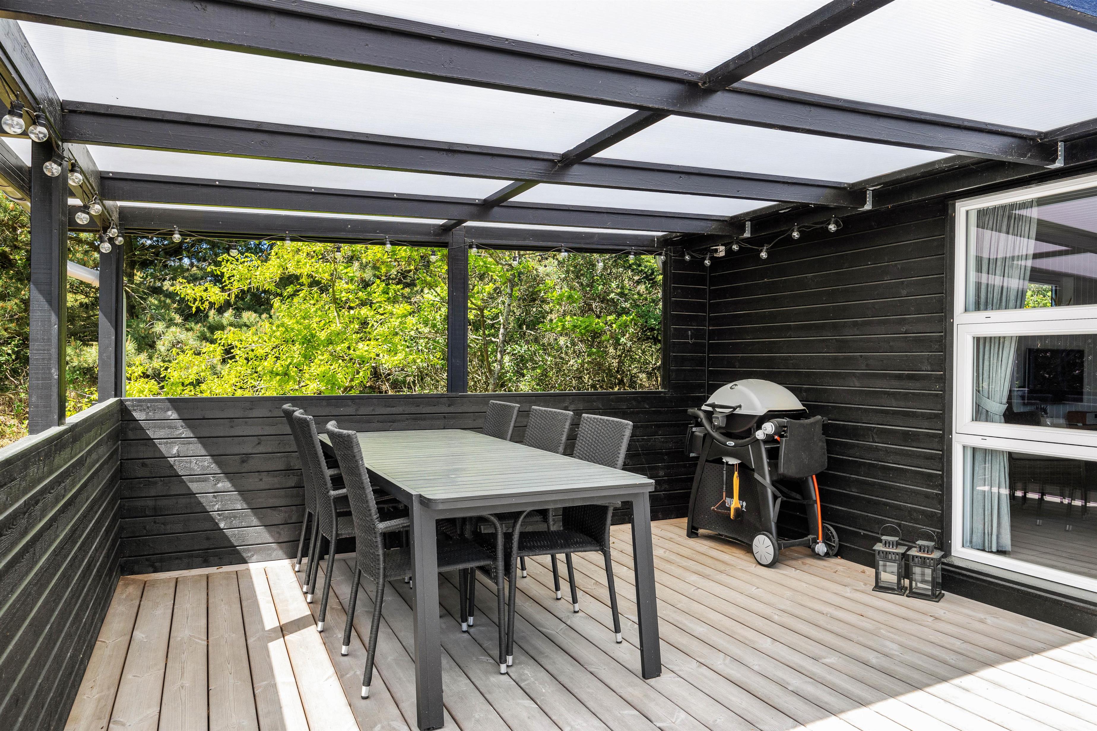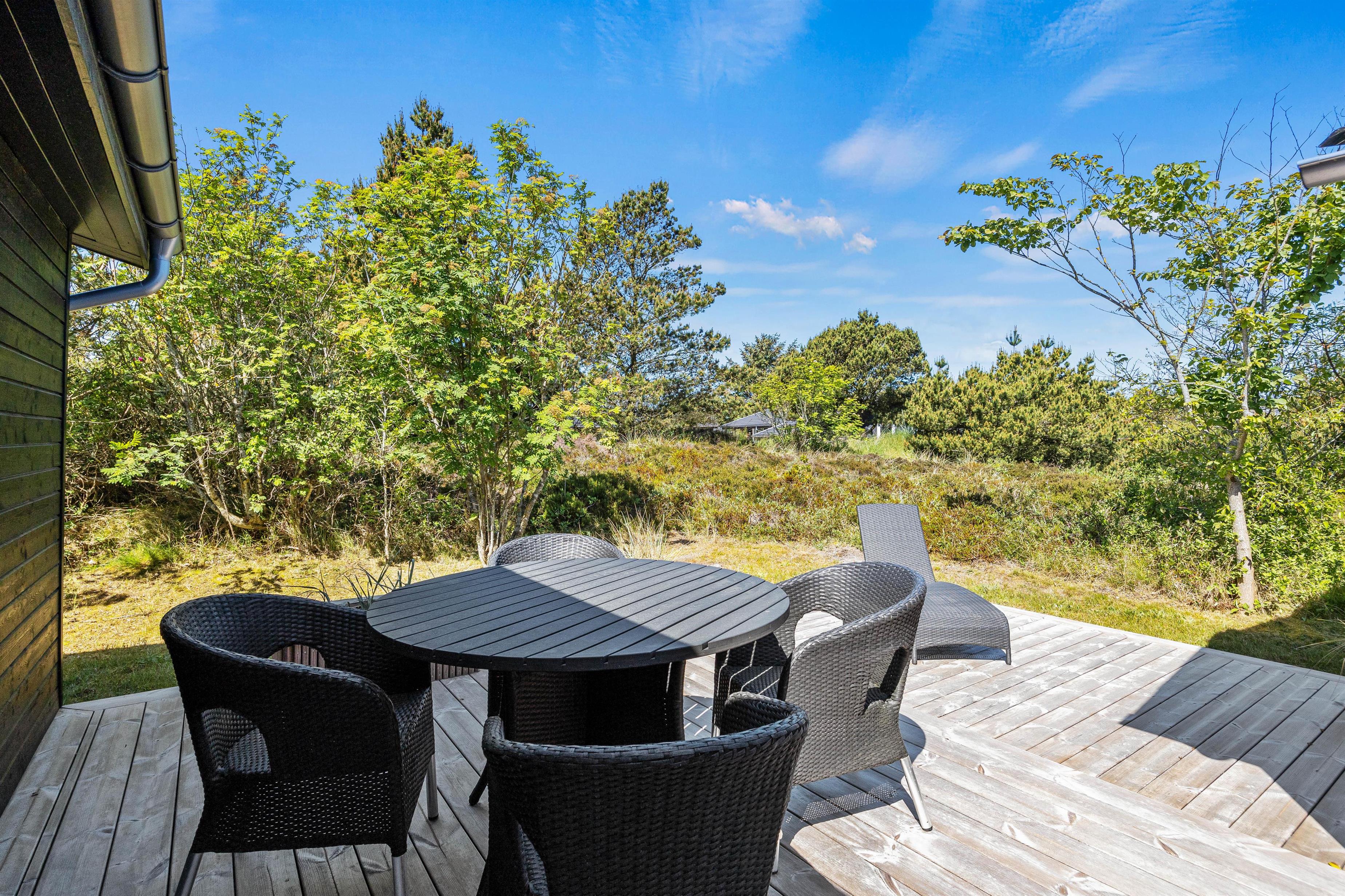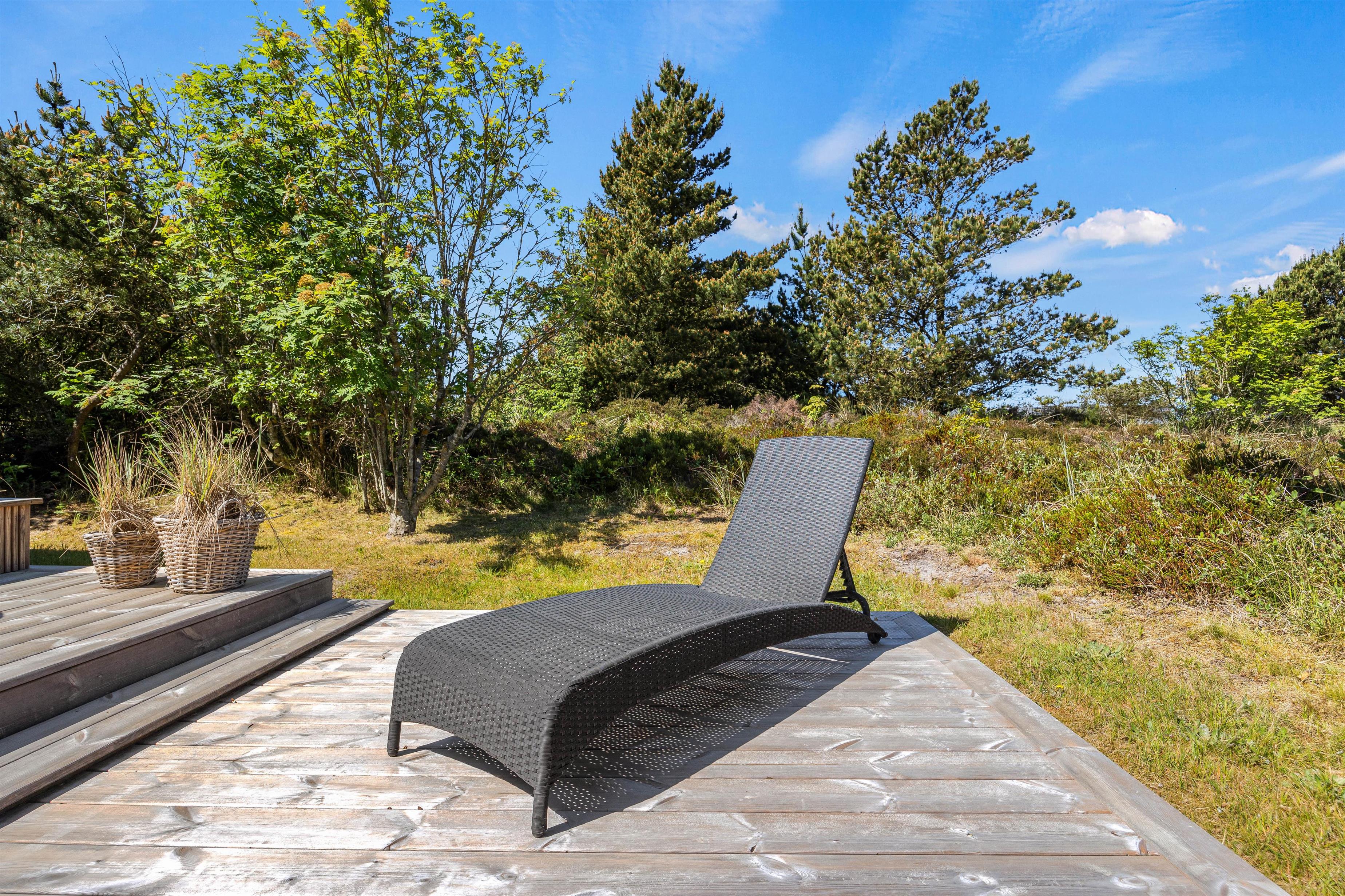 På den lækre træterrasse, der ligger omkring dette feriehus, er det altid muligt at finde et hyggeligt læhjørne. Terrassen, som er delvis overdækket og afskærmet med lukkede sider, er det perfekte sted at nyde solen døgnet rundt, men kan også bruges til lange grillaftener med rødvin og snak. Husets gasgrill vil kunne være jer behjælpelige med at tilberede aftensmaden.