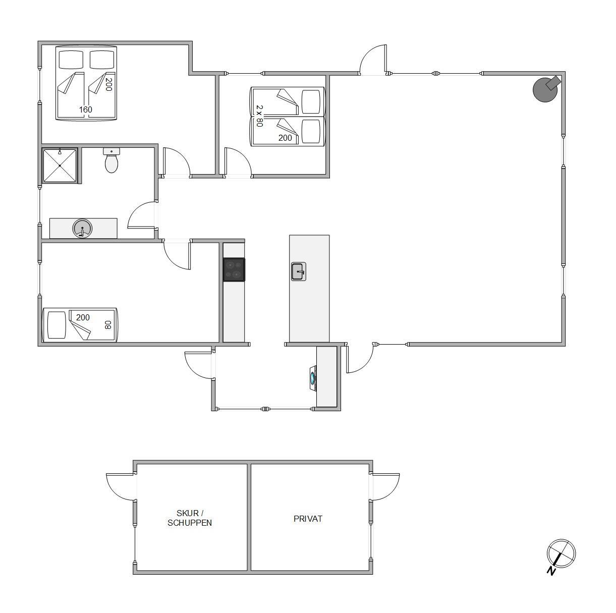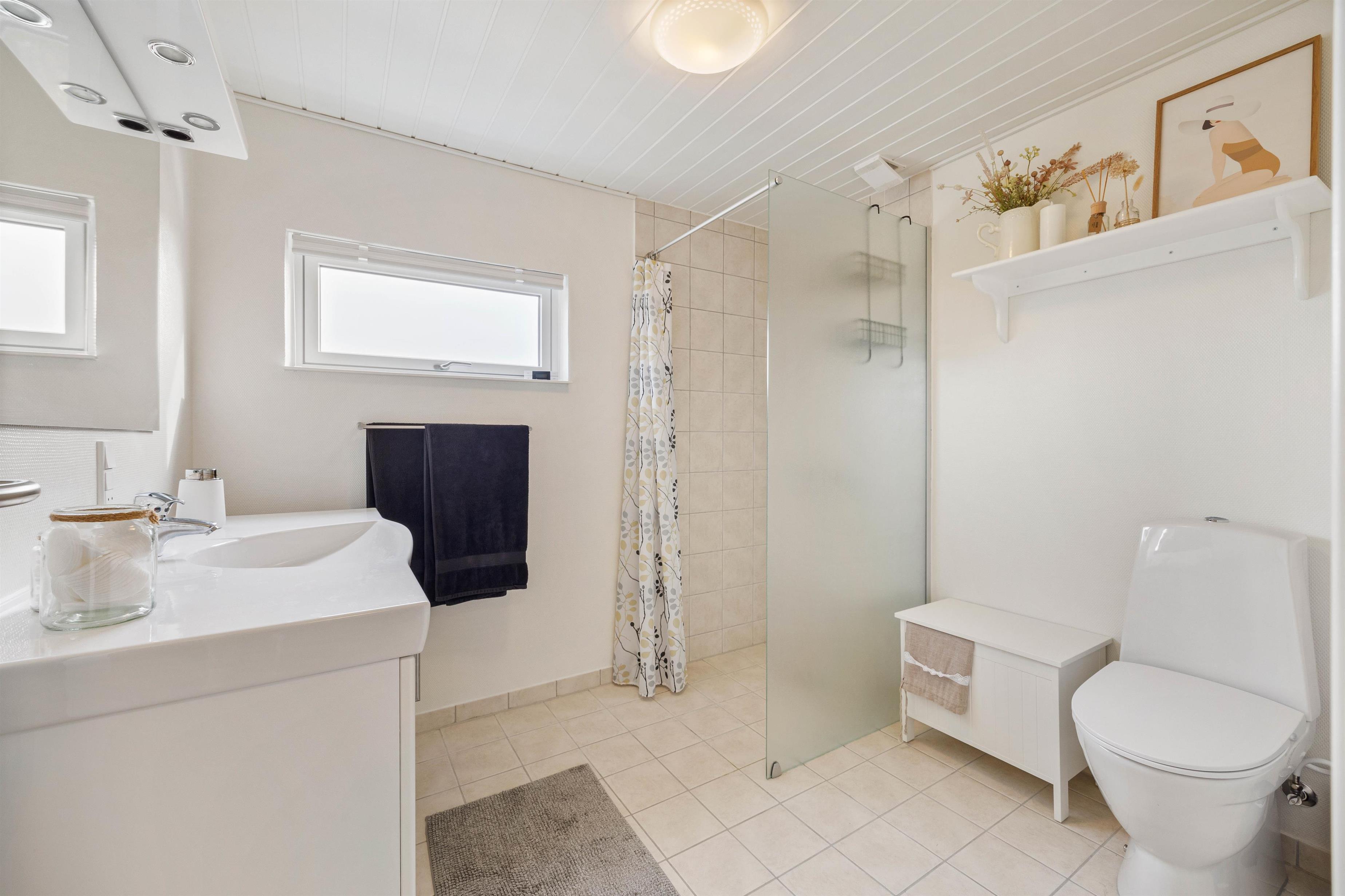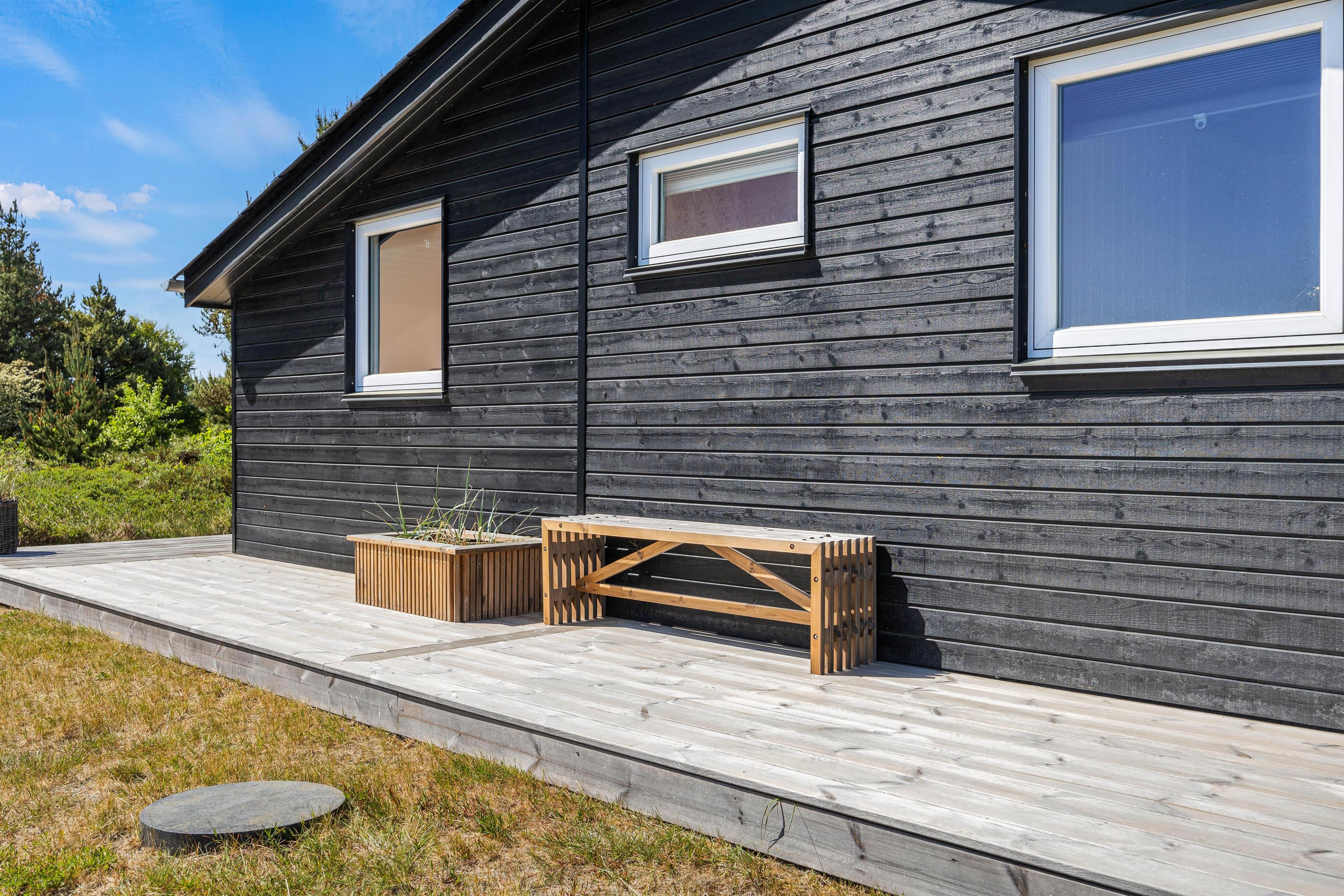 På den lækre træterrasse, der ligger omkring dette feriehus, er det altid muligt at finde et hyggeligt læhjørne. Terrassen, som er delvis overdækket og afskærmet med lukkede sider, er det perfekte sted at nyde solen døgnet rundt, men kan også bruges til lange grillaftener med rødvin og snak. Husets gasgrill vil kunne være jer behjælpelige med at tilberede aftensmaden.