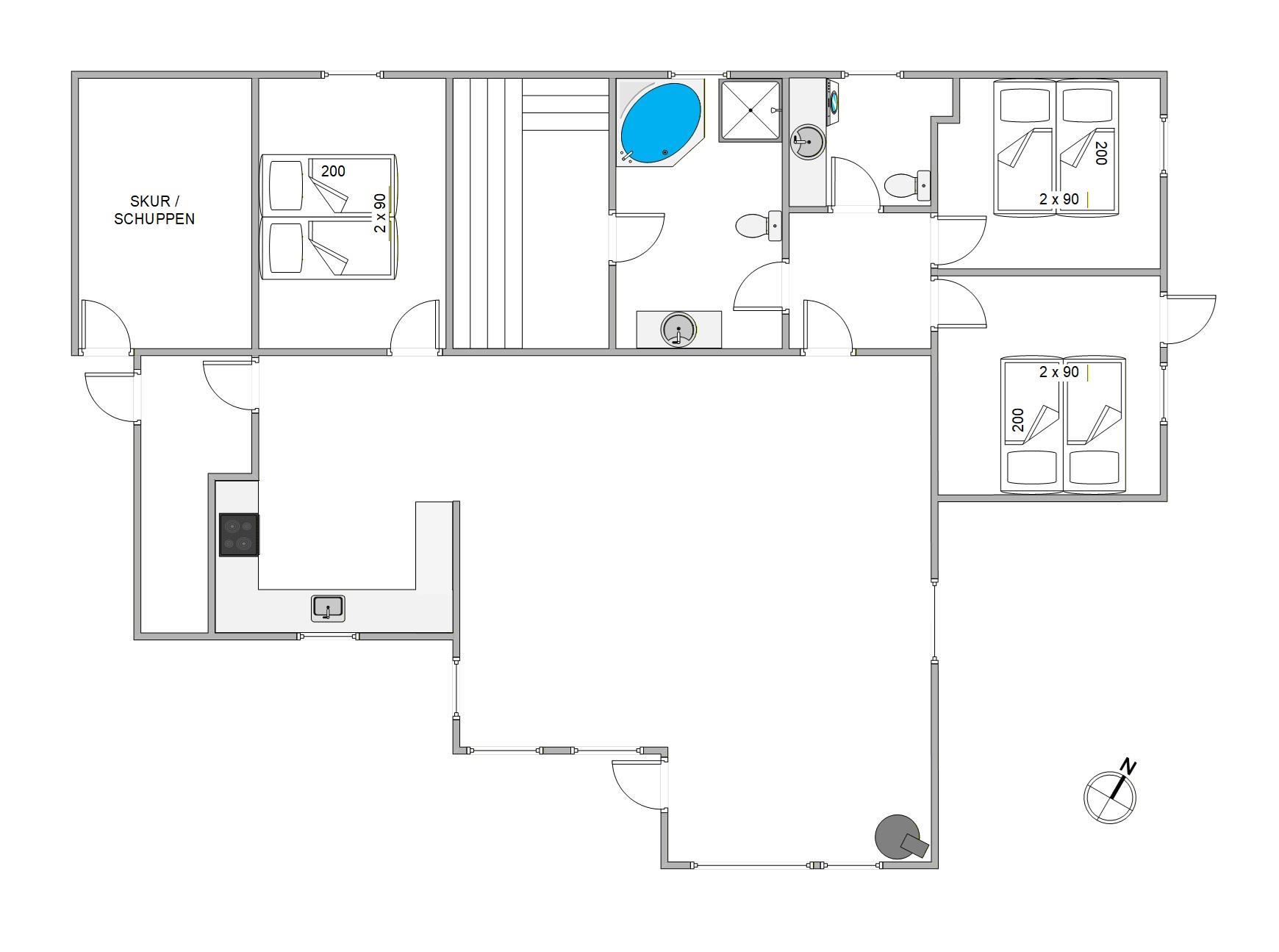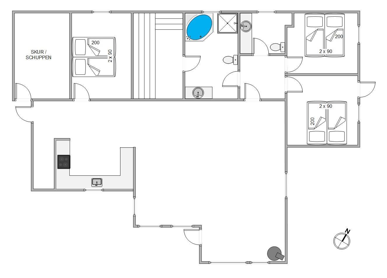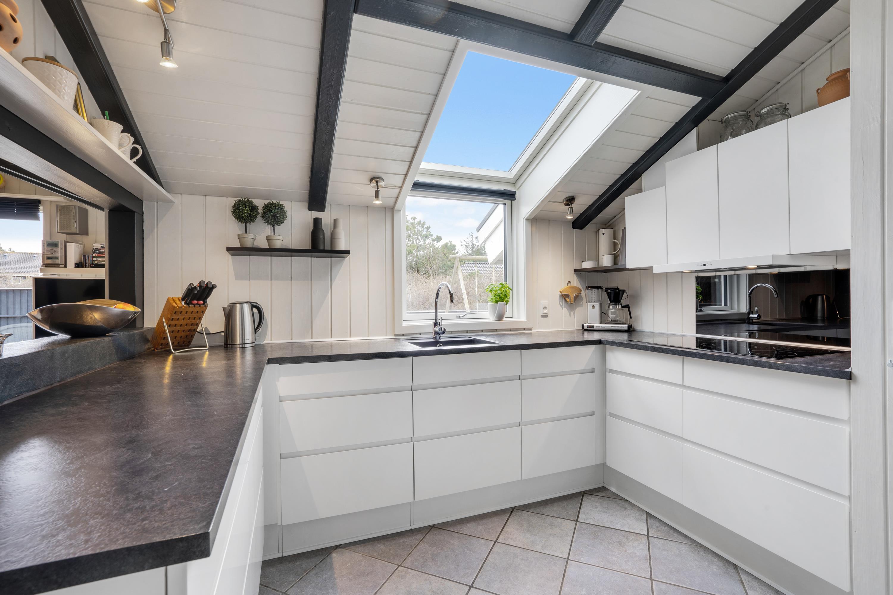 I køkkenet har I alt, I har brug for, når der skal tilberedes lækre måltider på ferien. Opvasken skal I ikke tænke på, for den klarer opvaskemaskinen selvfølgelig. Mens nogle af jer står i køkkenet og klarer madlavningen, kan resten af feriegæsterne hygge sig i stuen. Køkken og stue er forenet i én opholdsstue, så I vil stadig kunne nyde hinandens selskab.