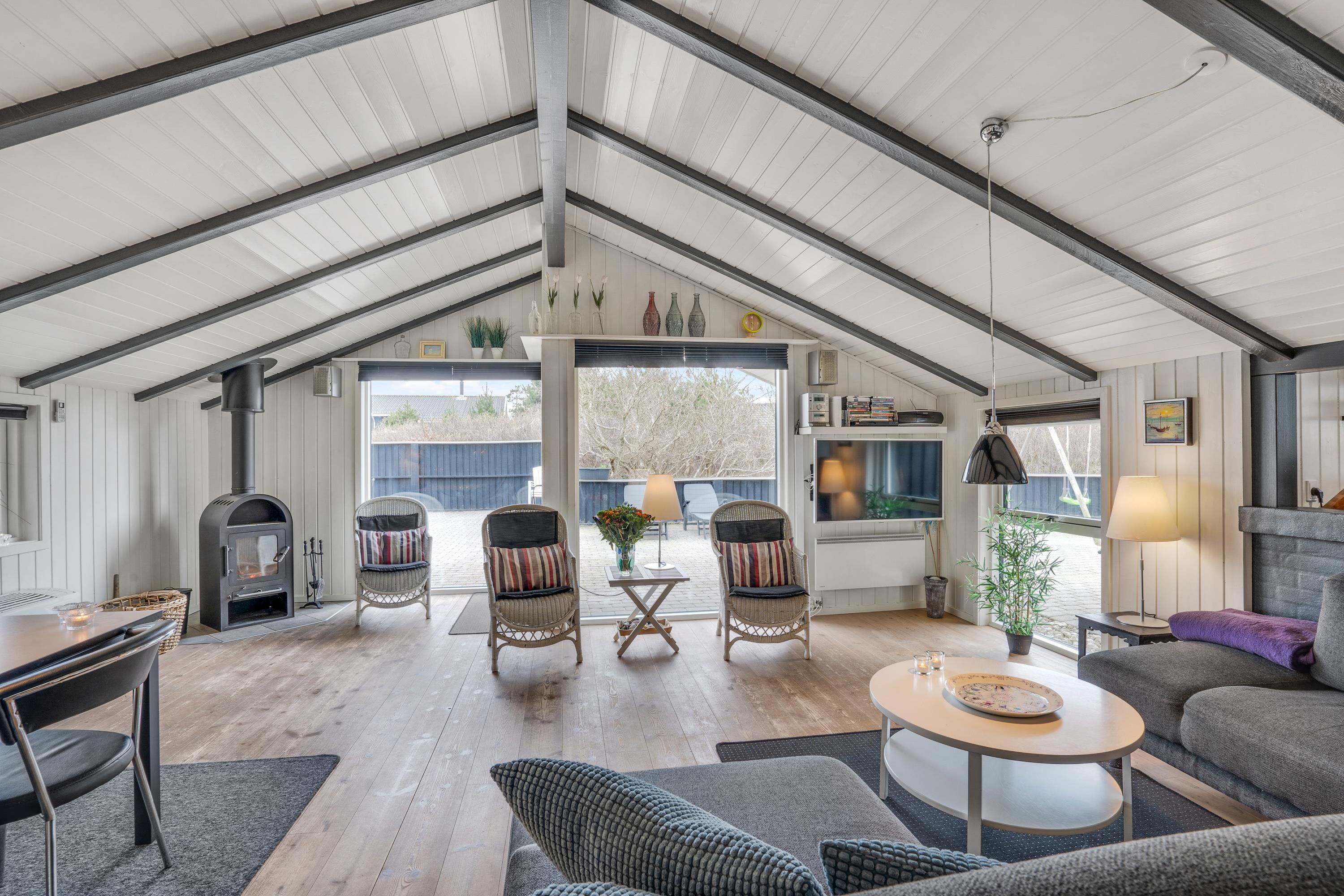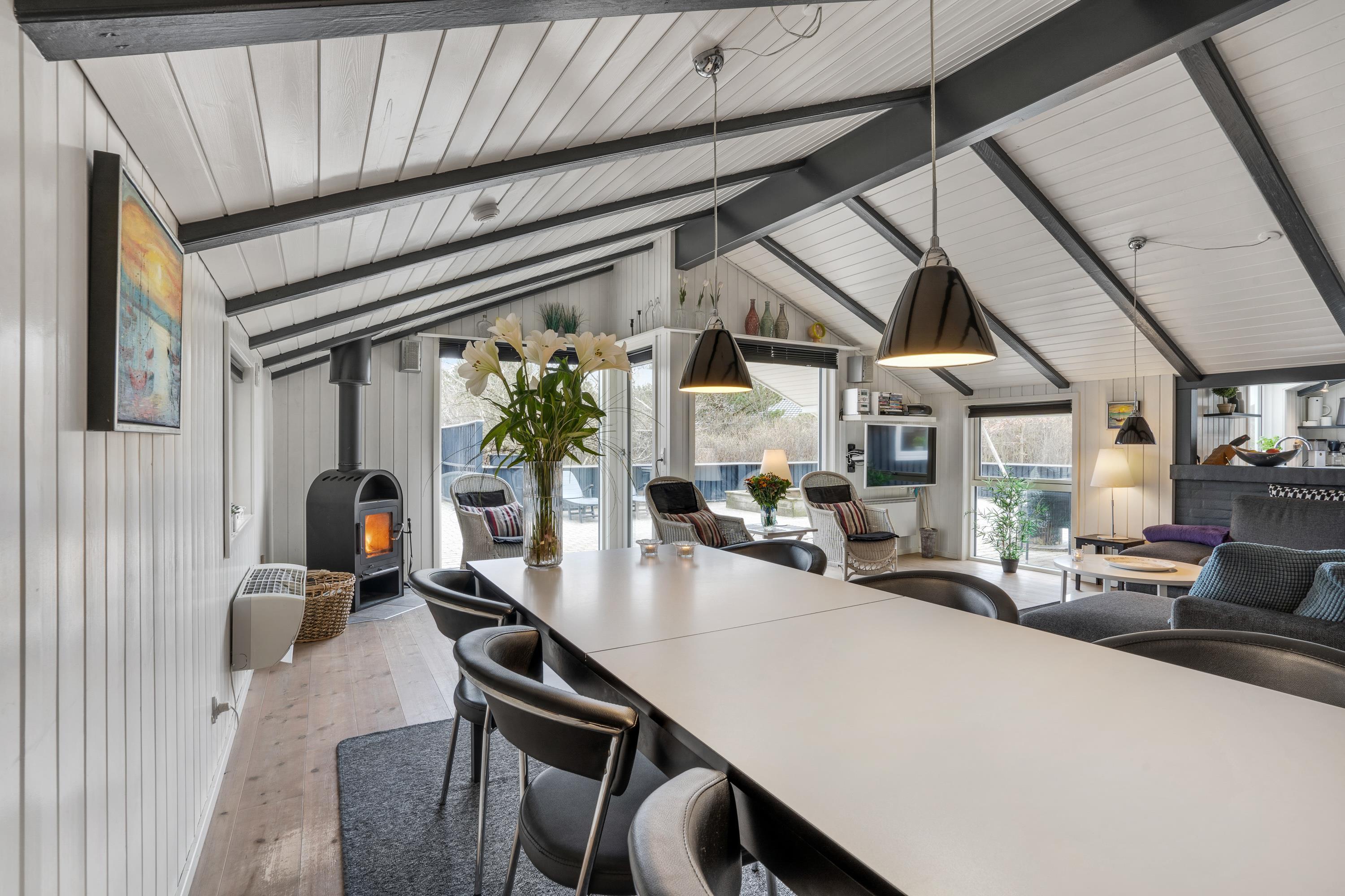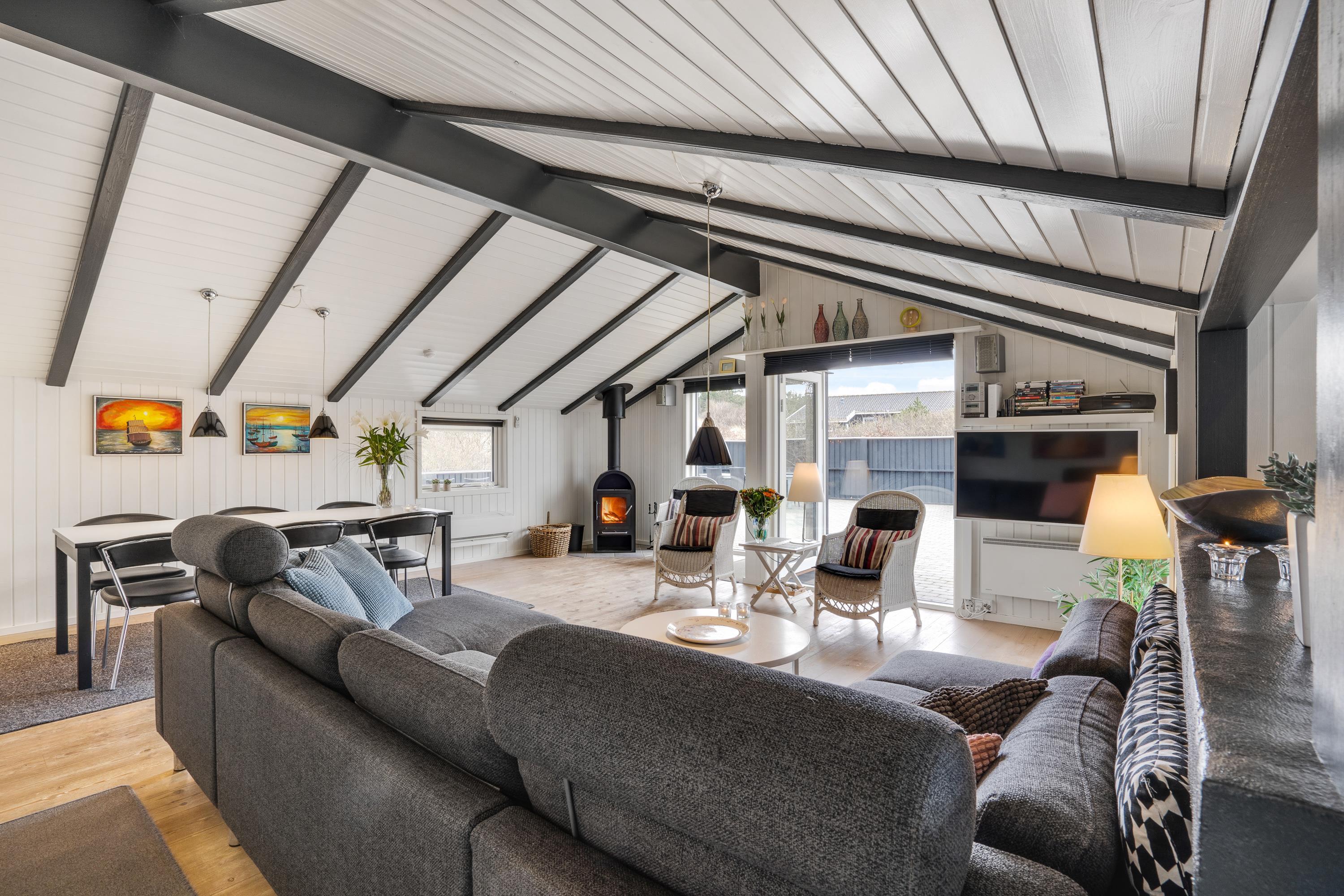 Sommerhuset, der er renoveret i 2018, har en lys og indbydende indretning, som I straks vil føle jer hjemme i, når I ankommer på ferieadressen. De synlige bjælker og brændeovnen sætter prikken over i’et for sommerhusstemningen og -følelsen.