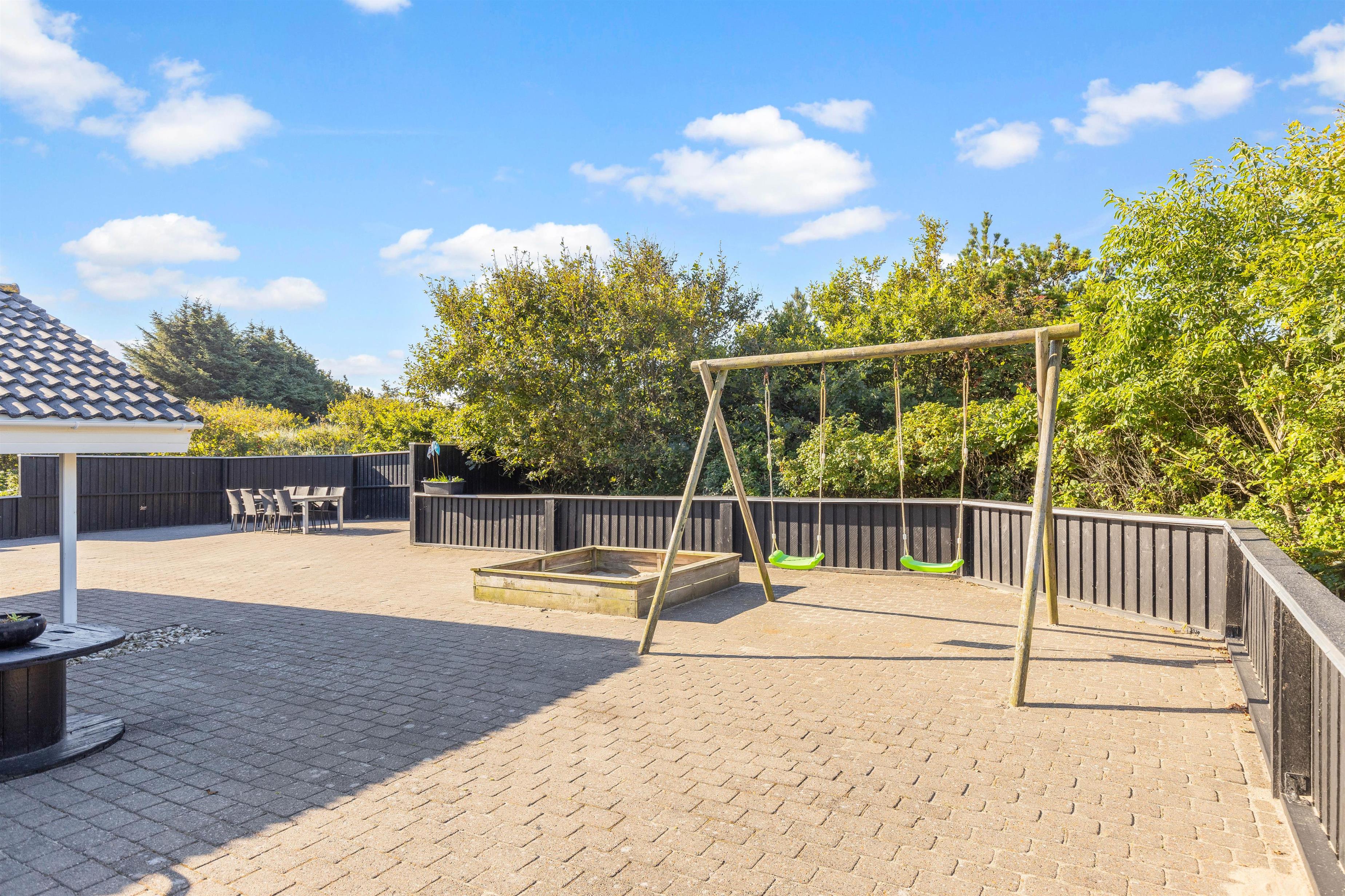 Stor, lukket terrasse med sandkasse til de mindste