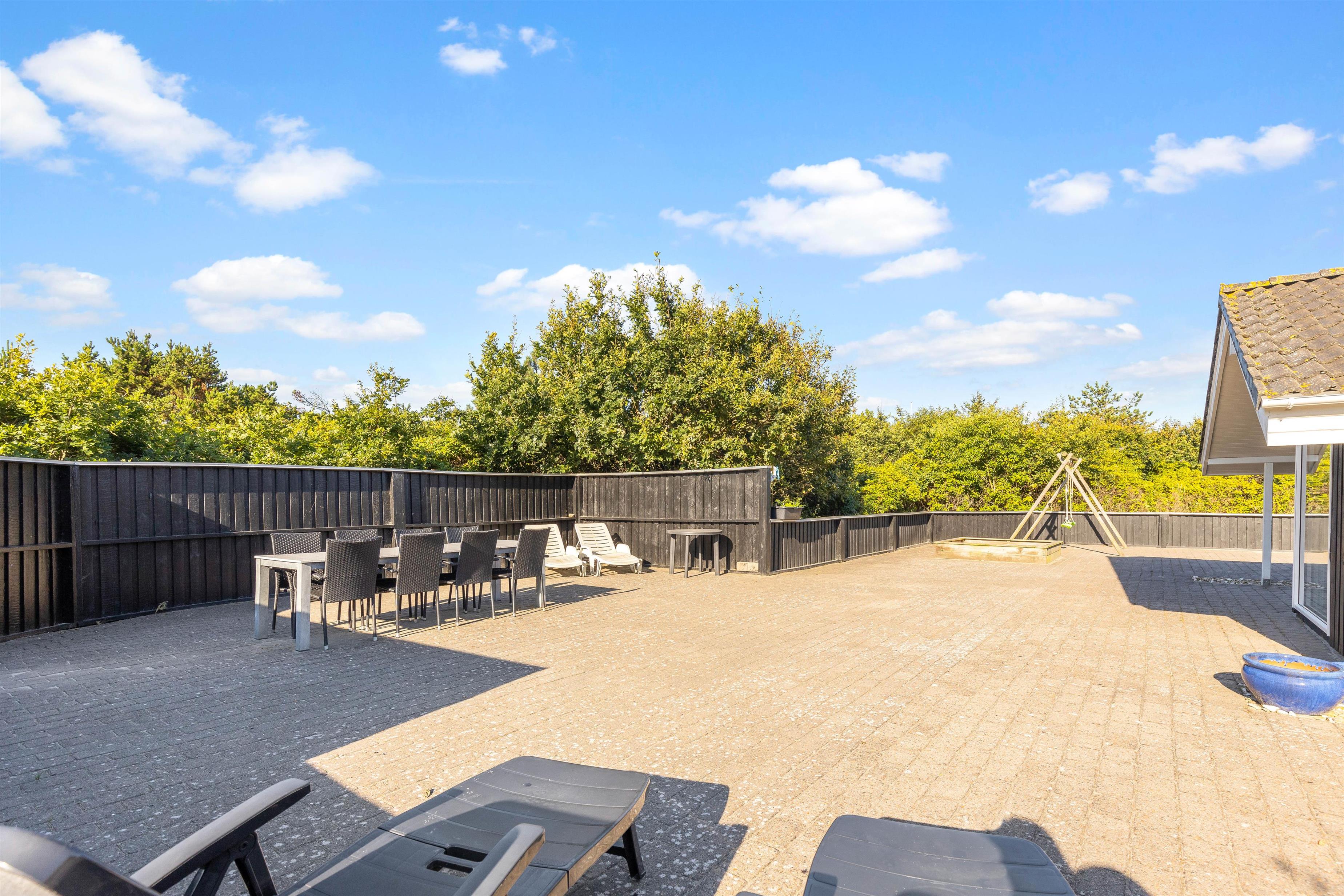 På terrassen kan både store og små nyde de solskinsfyldte feriedage. De voksne kan sætte sig godt til rette i liggestole og havemøbler, og finde et godt spot i solen. Alt imens kan børnene give den gas med at bygge flotte sandslotte i sandkassen.