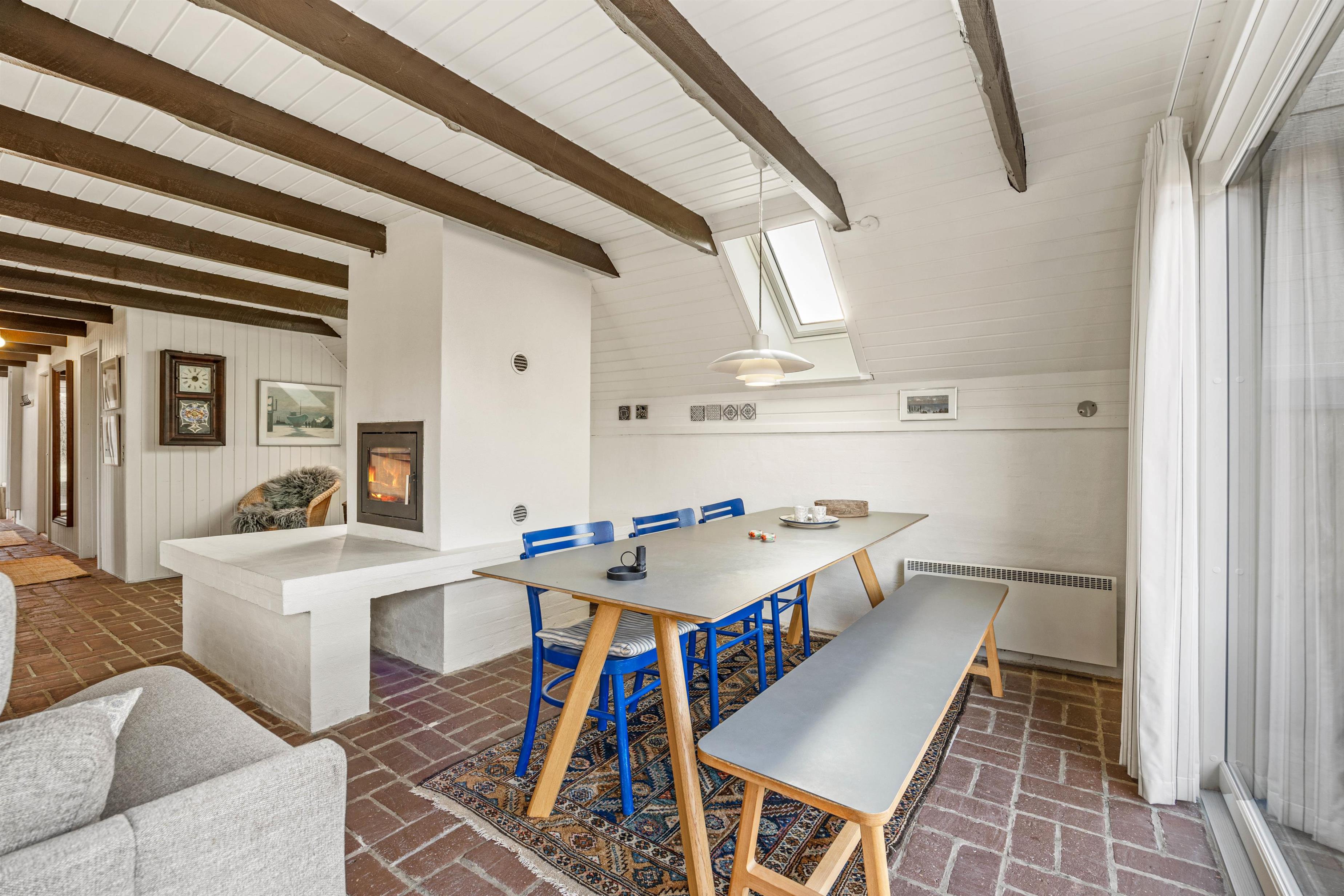 Sommerhuset, der er renoveret i 2025, fremstår indbydende med lyse rum. Her er kredset for hyggen, og opholdsrummet er hyggeligt indrettet med komfortable møbler, smukke mørke loftsbjælker, og det store vindue mod vest inviterer lyset - og den omkringliggende natur - indenfor. Her kan I planlægge feriedagenes program, læse en god bog eler nyde varmen fra den indbydende brændeovn. Den moderne varmepumpe sørger for en behagelig temperatur hele året rundt.
