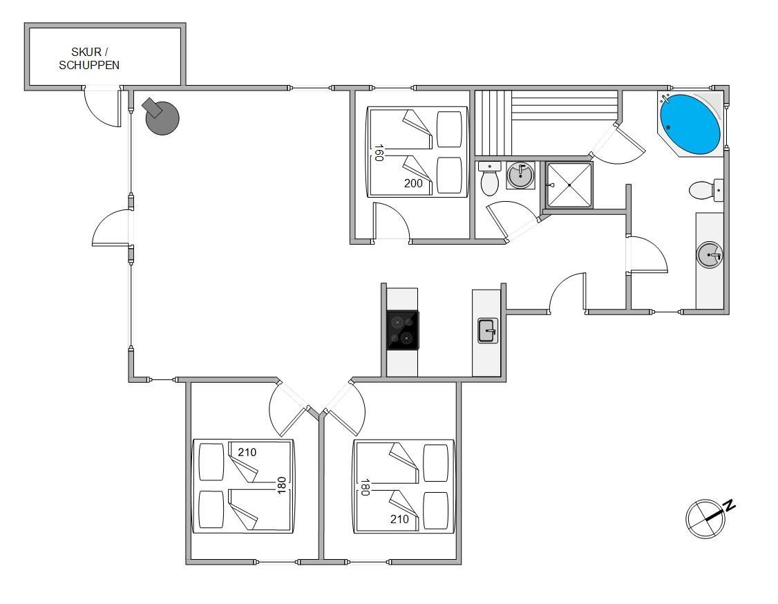 Velkommen i et velholdt sommerhus, som er praktisk og lækkert indrettet med et frisk pift af blå. Huset er lyst og venligt og indeholder alt det, der hører til en afslapningsferie med et strejf af luksus – her er der nemlig både sauna og spa!
