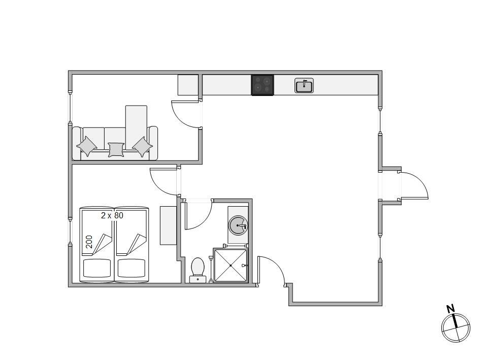 Fra parkeringspladsen fører en trappe jer til den velindrettede lejlighed på 43 m2, som fremstår lys og moderne og byder på alle fornøjeligheder, der hører en badeferie til. Lejlighedens kombinerede stue og spisestue byder op til hygge og samvær. Lejlighedens køkken er veludstyret og indeholder både en kombineret mini-/mikroovn og en opvaskemaskine.