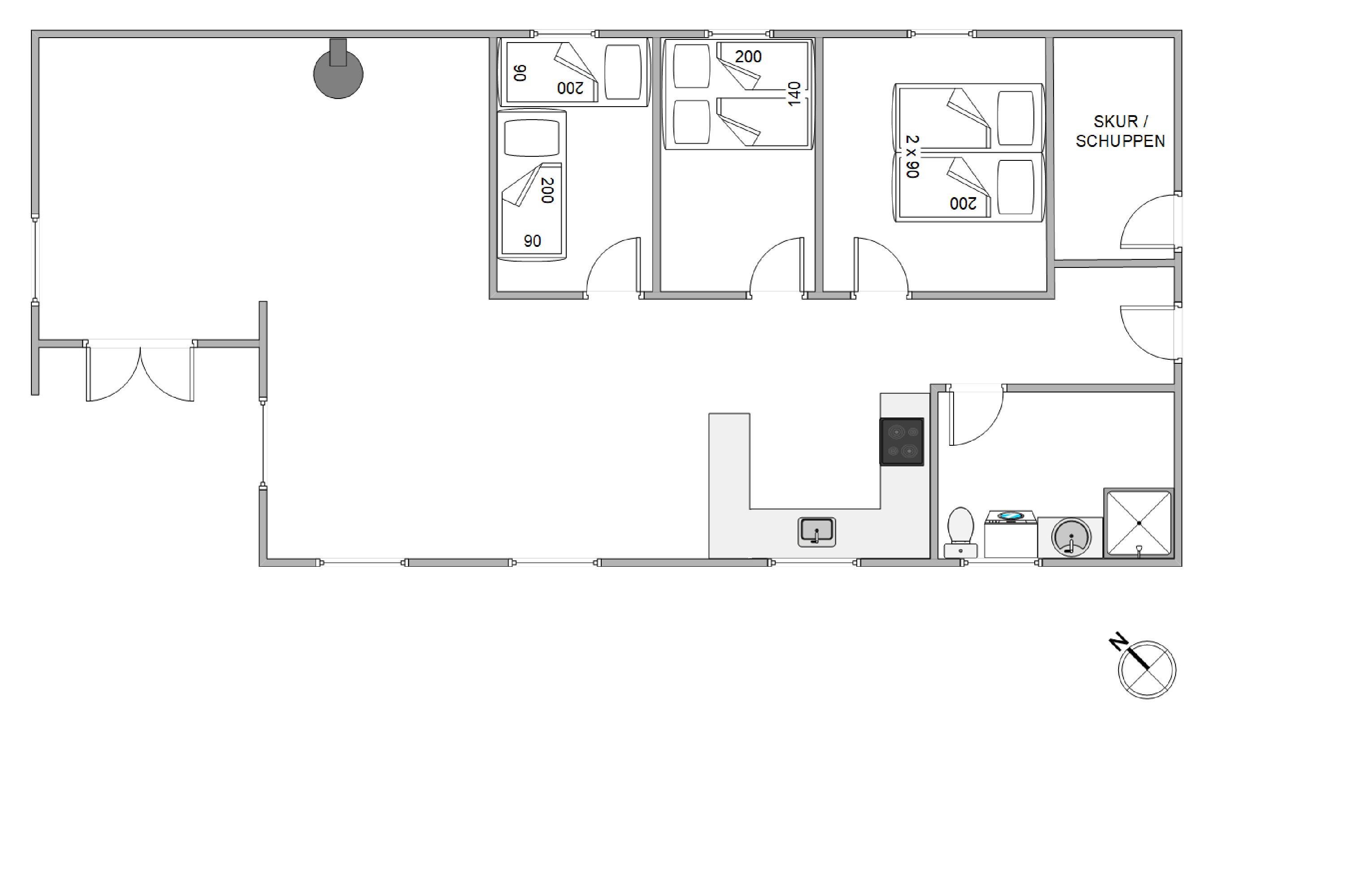 Samlingspunktet i dette sommerhus er det store opholdsrum med stue, spiseplads og det moderne køkken i ét. Her er plads til alle, og alle er med i fællesskabet, uanset for det er med madlavningen i det veludstyrede køkken med bl.a. mikroovn og opvaskemaskine – eller om I spiller et brætspil ved spisebordet, mens I nyder varmen af den knitrende ild i brændeovnen. De mange vinduespartier inviterer ikke kun sollyset, men også den smukke og altid vekslende natur, helt ind i sommerhuset.