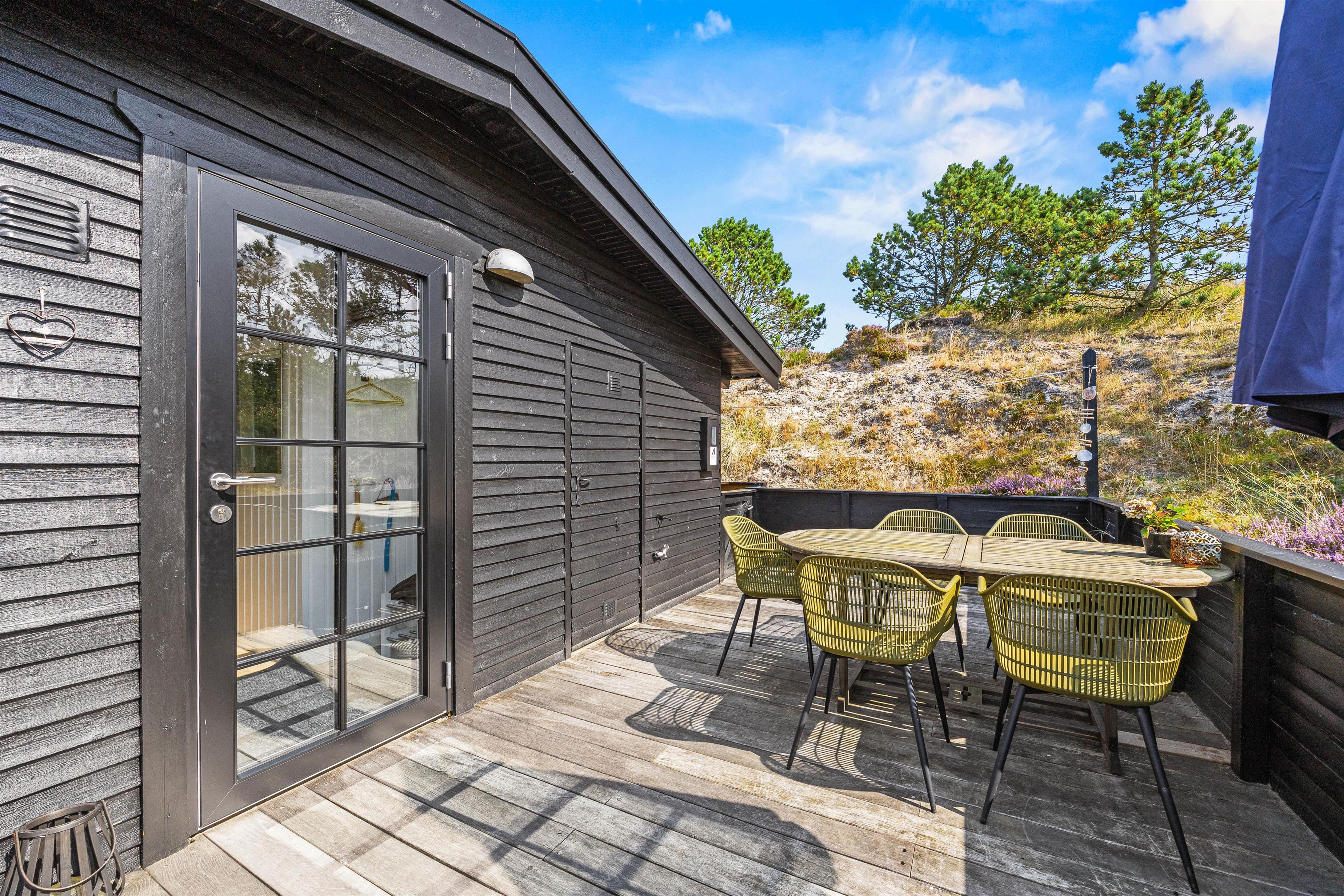 Sommerhusets store træterrasse, der strækker fra øst til vest om sommerhuset, falder yderst naturligt ind i den omkringliggende omgivelse, og I vil derfor opleve naturen i denne egn på nær hånd. Rundt omkring på terrassen er der kreeret flere siddepladser, hvilket gør at I kan nyde både jeres morgenkaffe, men også jeres aftensmad på terrassen. Lav en dejlig grillmiddag med gasgrillen, og nyd den under den overdækkede terrasse i aftensolens skær: solnedgangen midt i den uspolerede natur er en enestående oplevelse, I ikke må gå glip af.