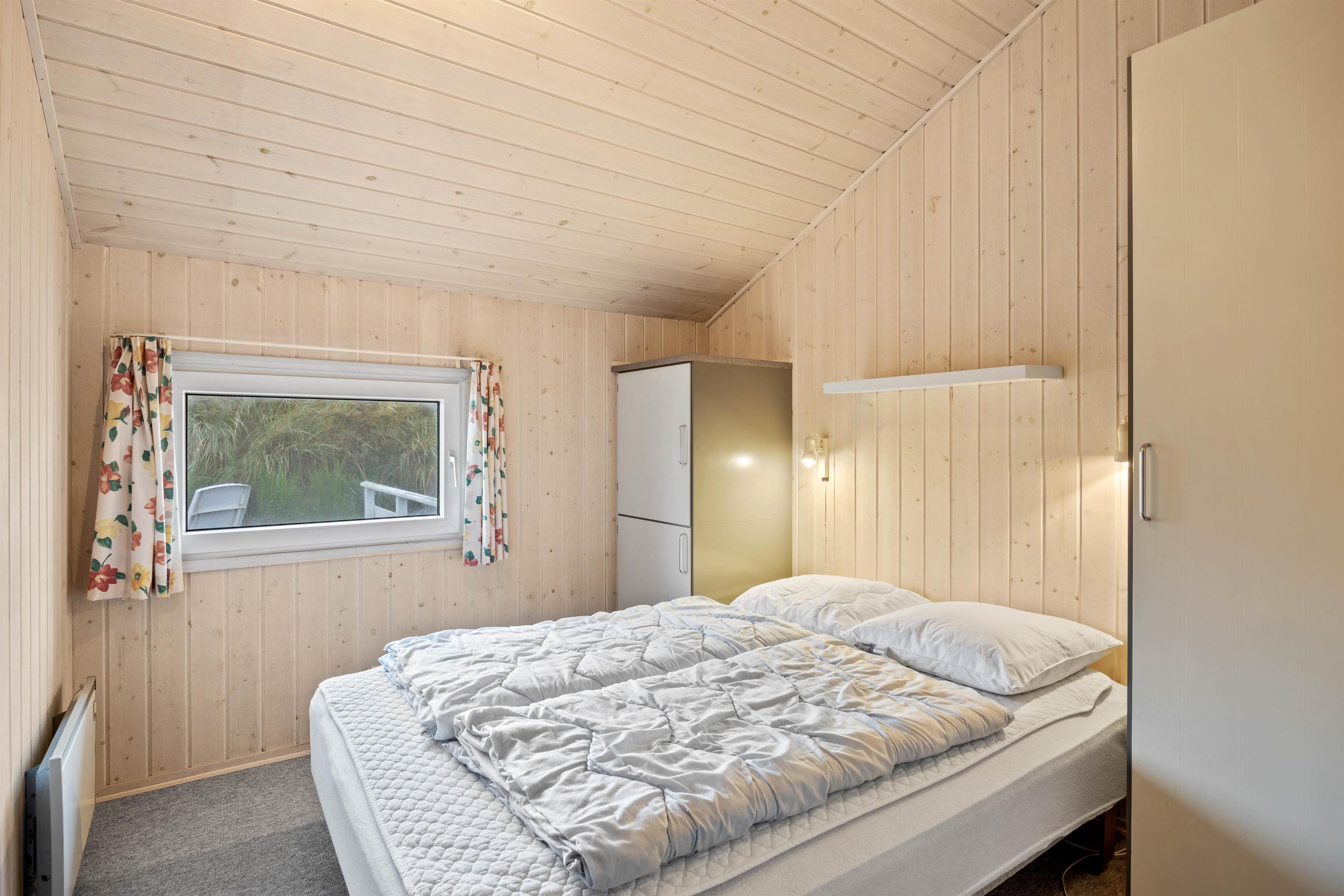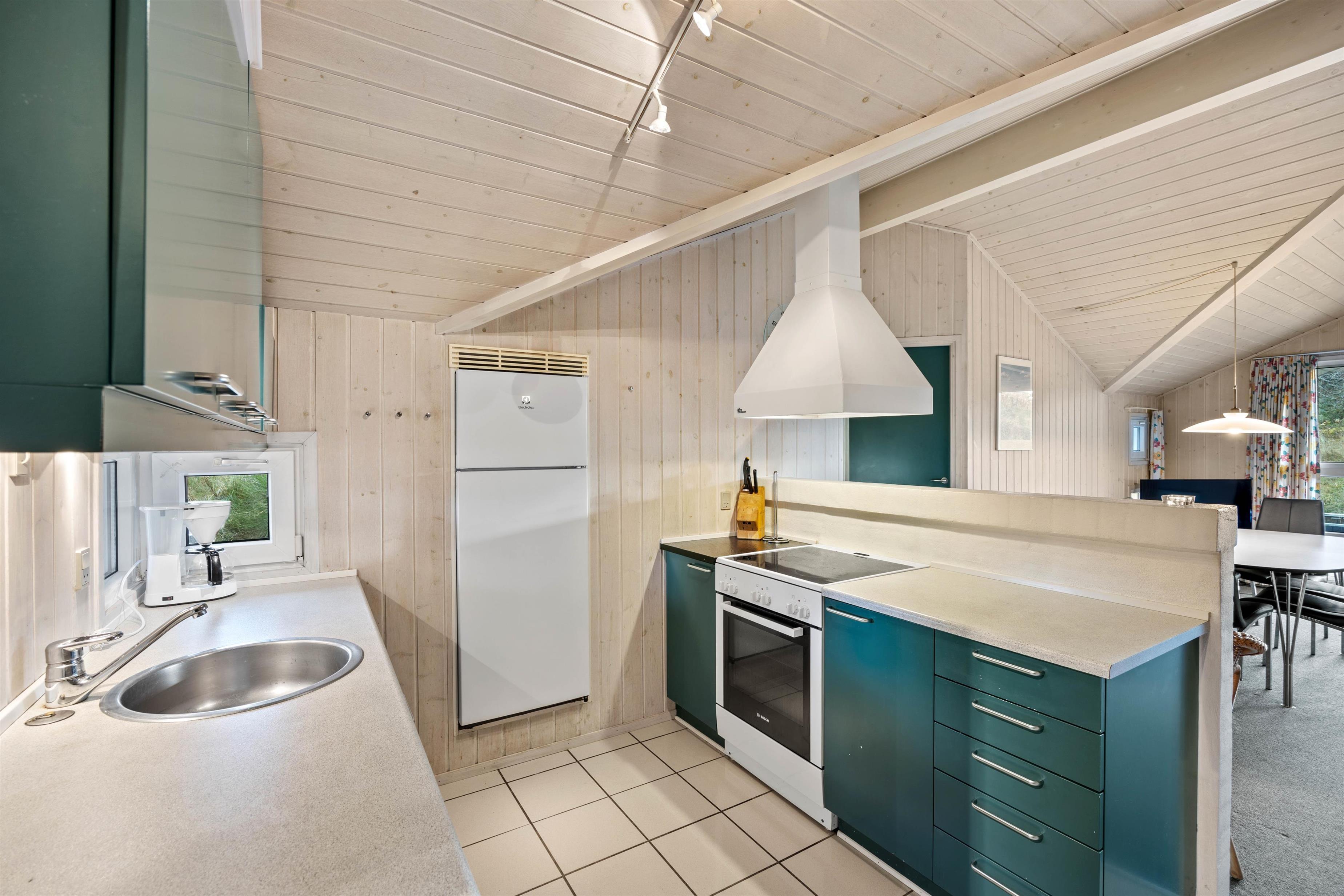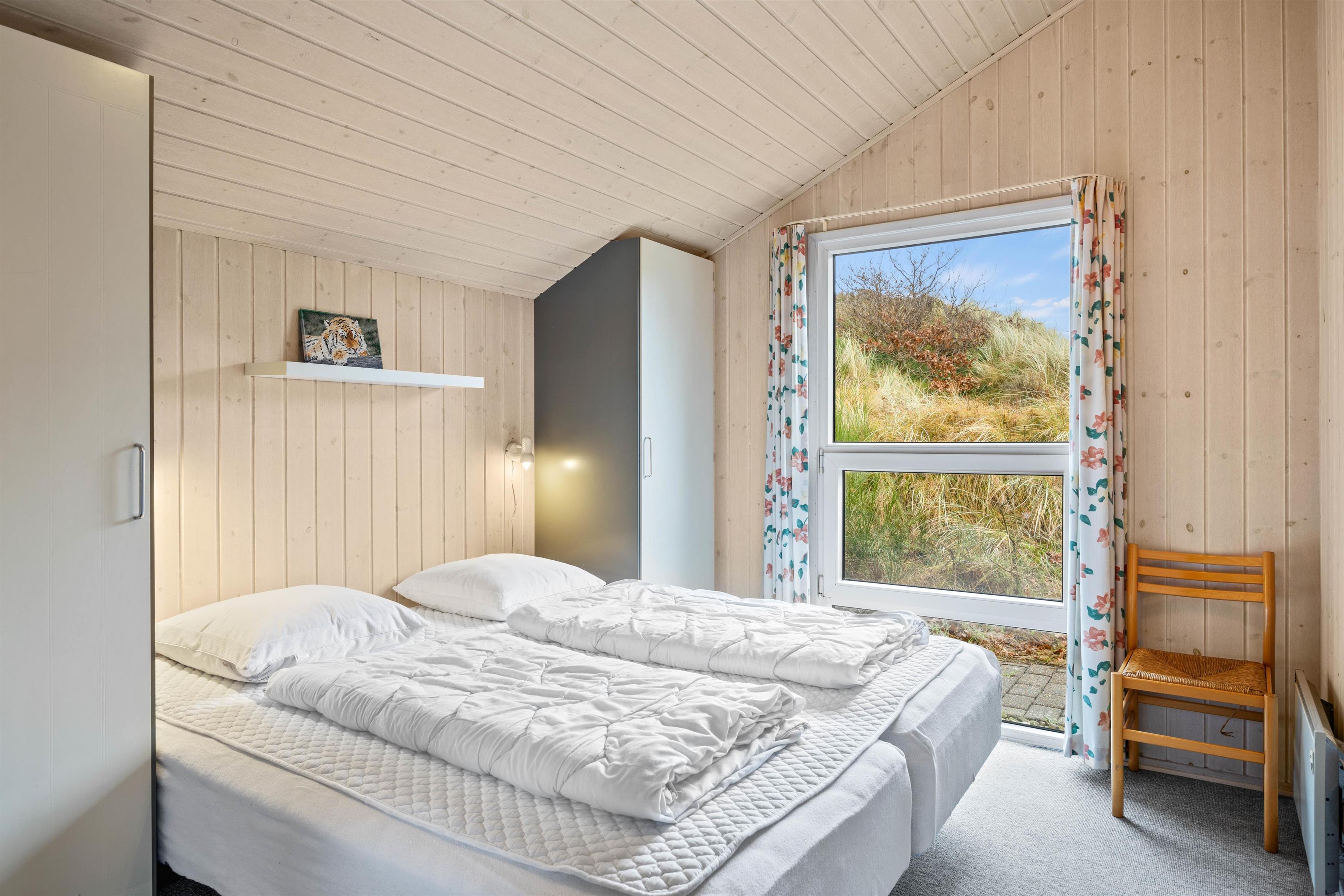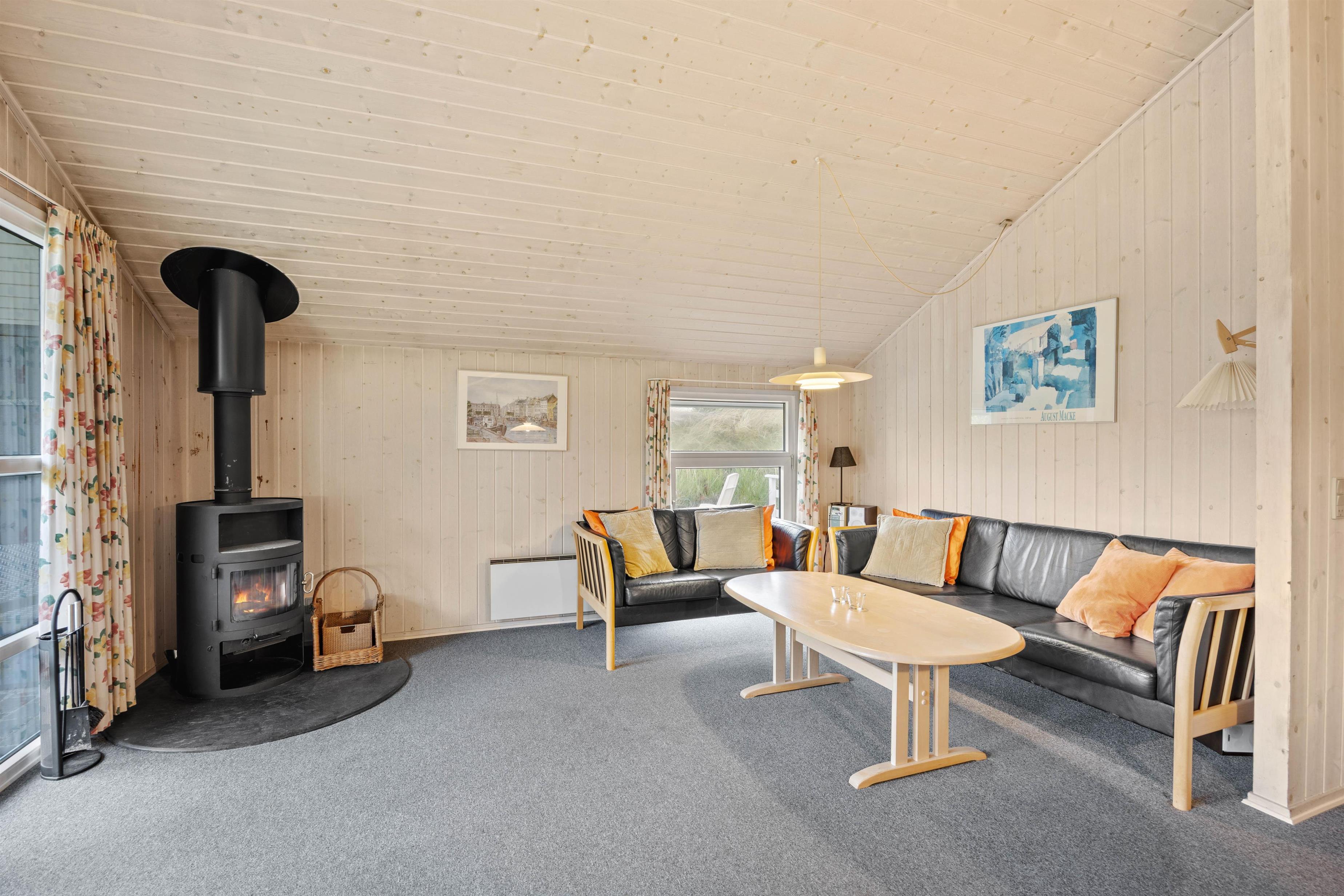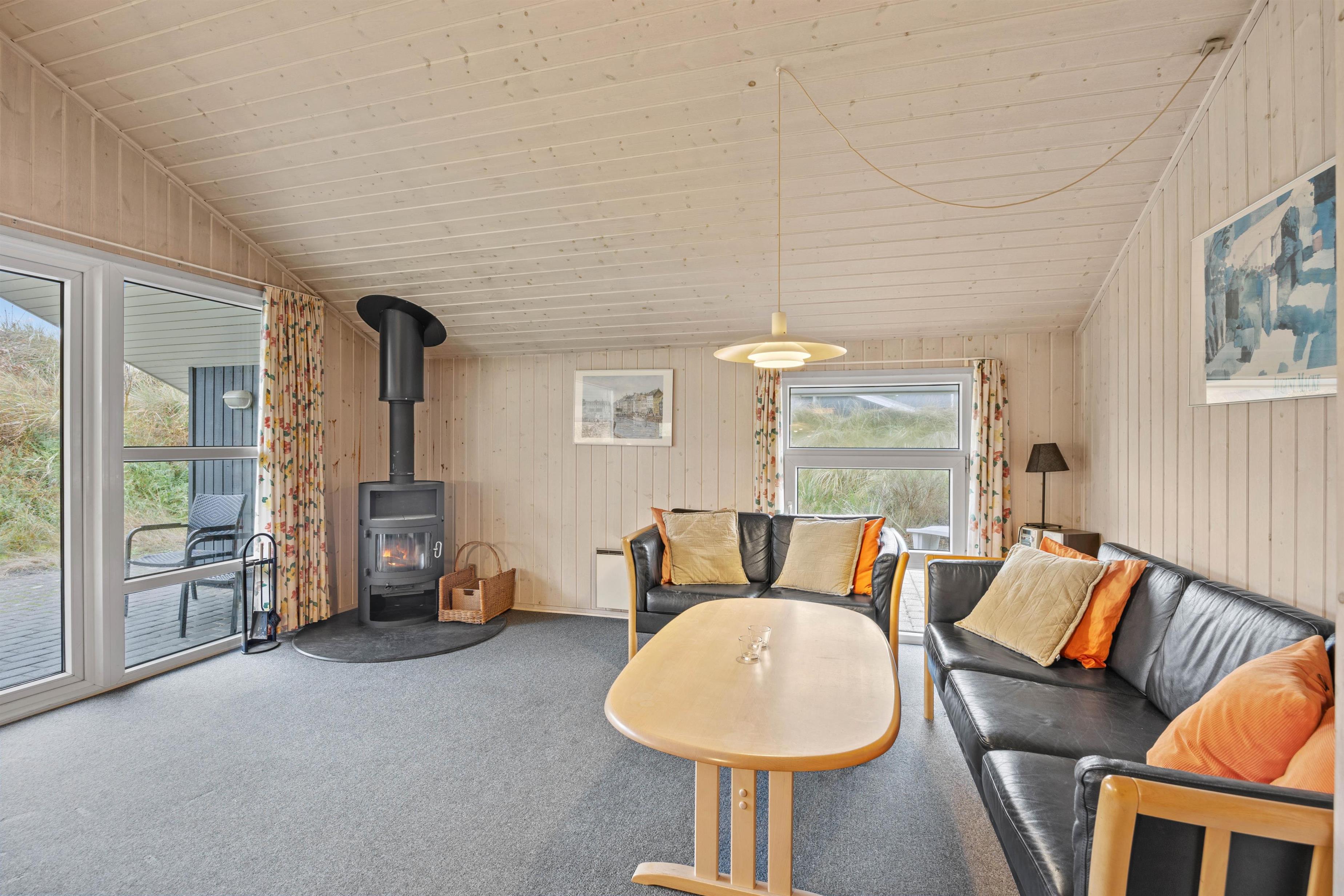 Det skønne feriehus rummer plads til op til 6 personer fordelt på tre fine og velindrettede soveværelser. Både fra soveværelserne såvel som opholdsrummet har I en herlig udsigt ud over det omkringliggende klitlandskab. Nyd udsigten, mens der bliver lavet mad, spillet kort eller slappet af på sofaen med den knitrende brændeovn i baggrunden. Integreret fryser på 40 liter.