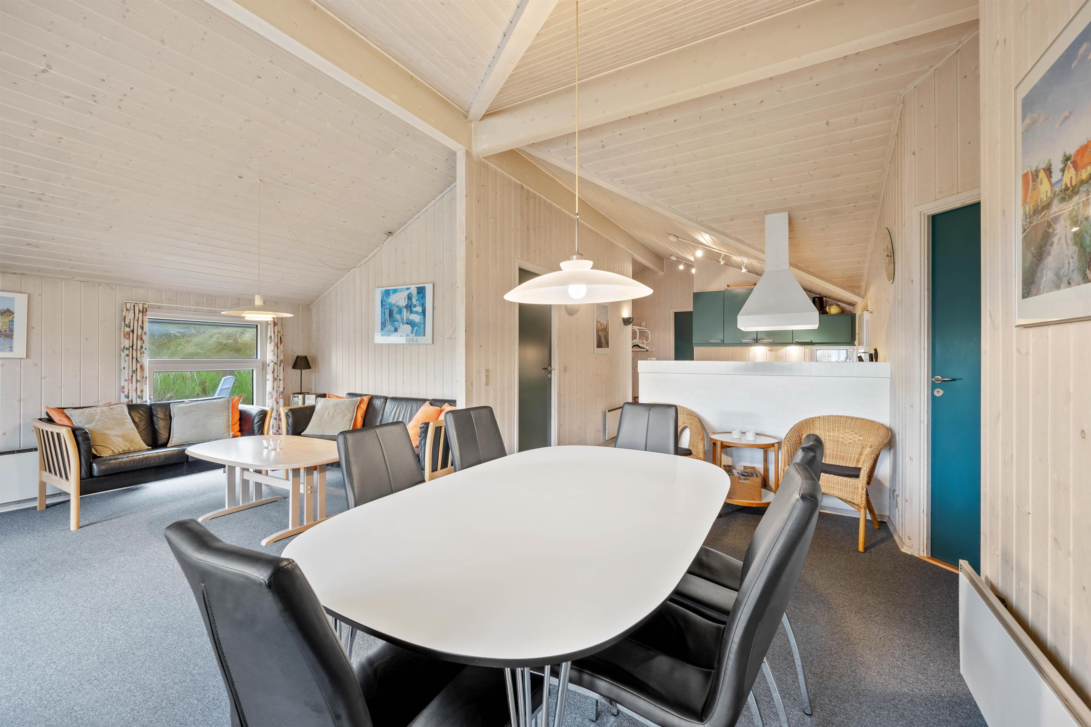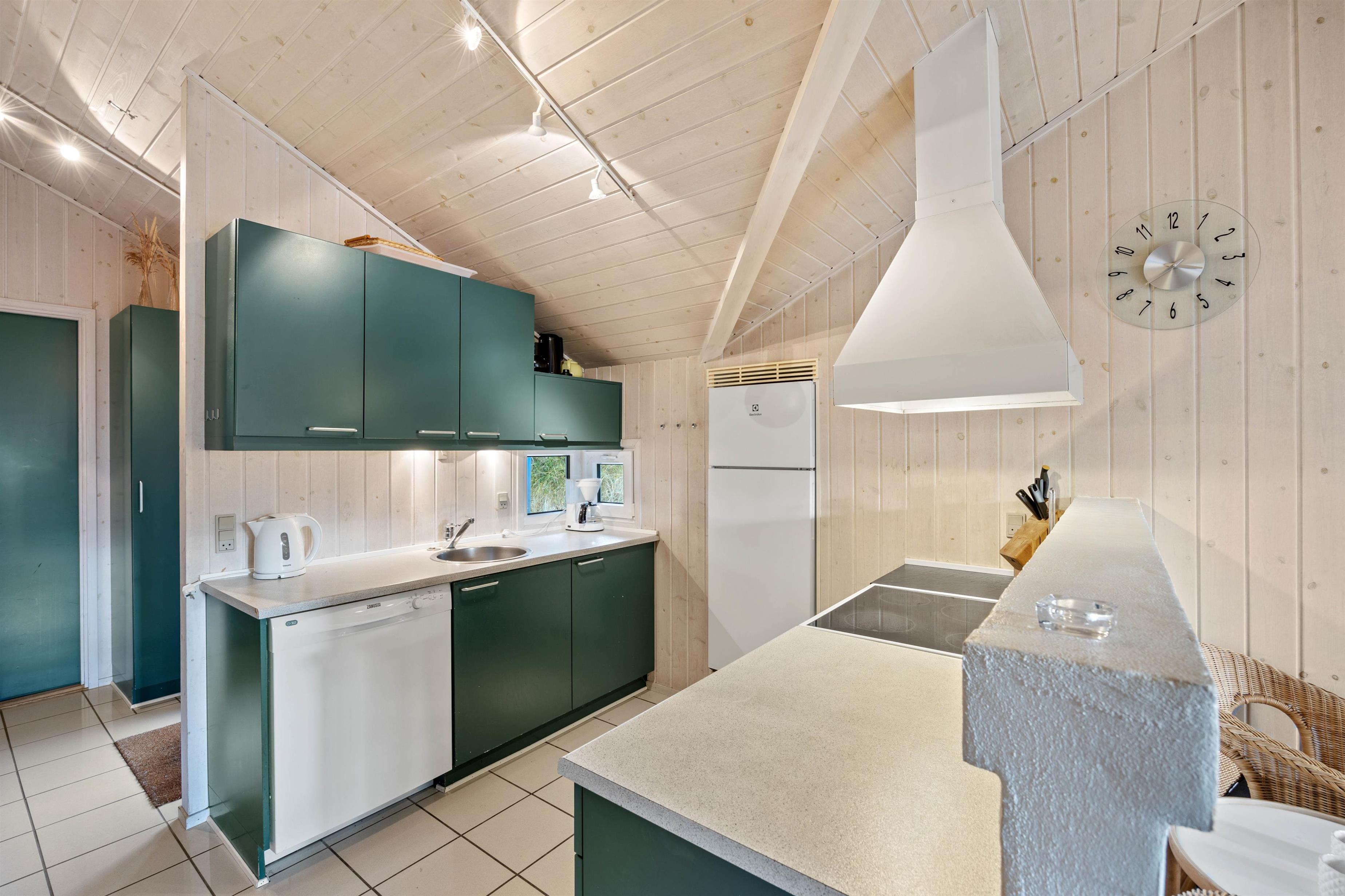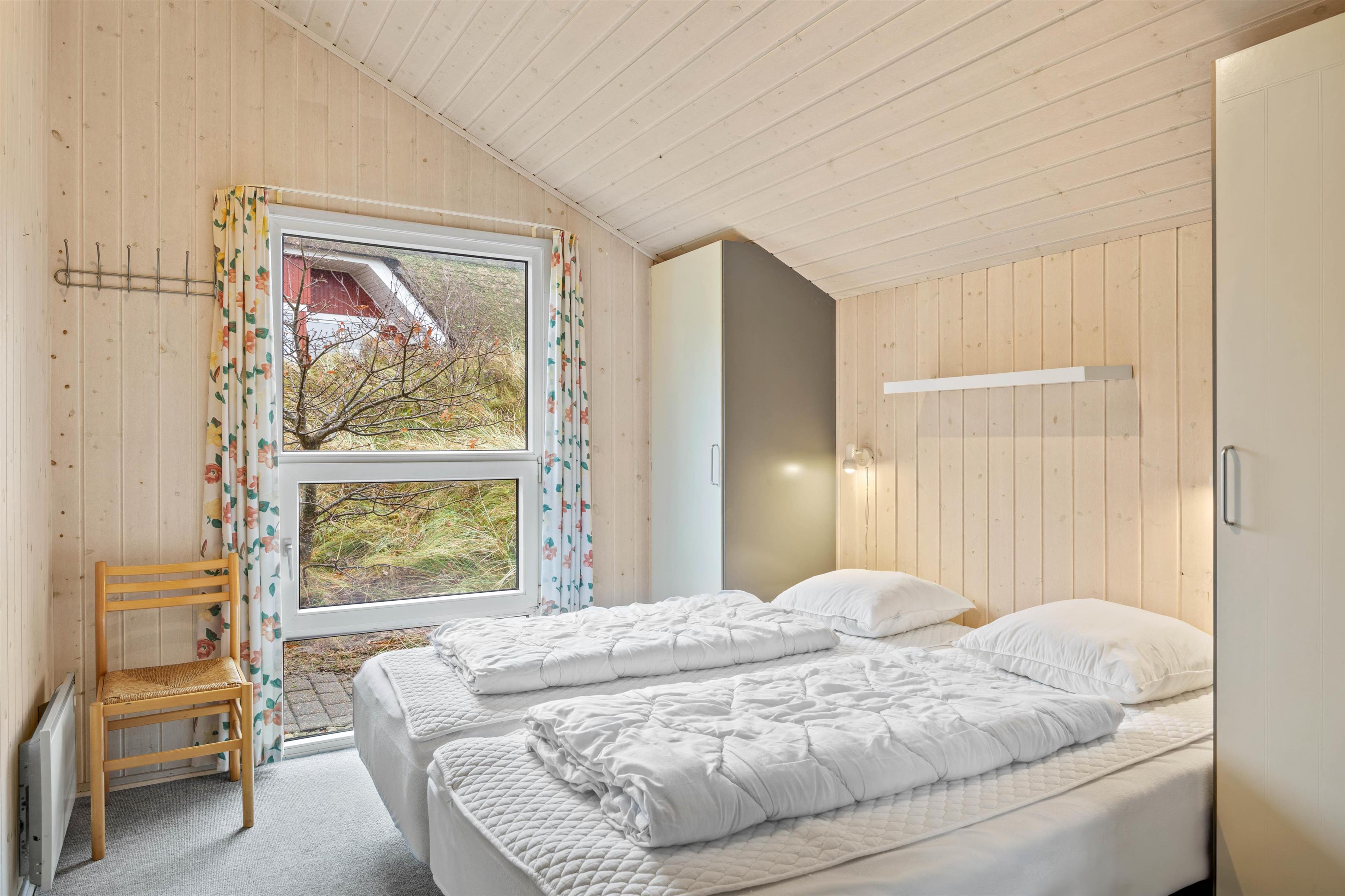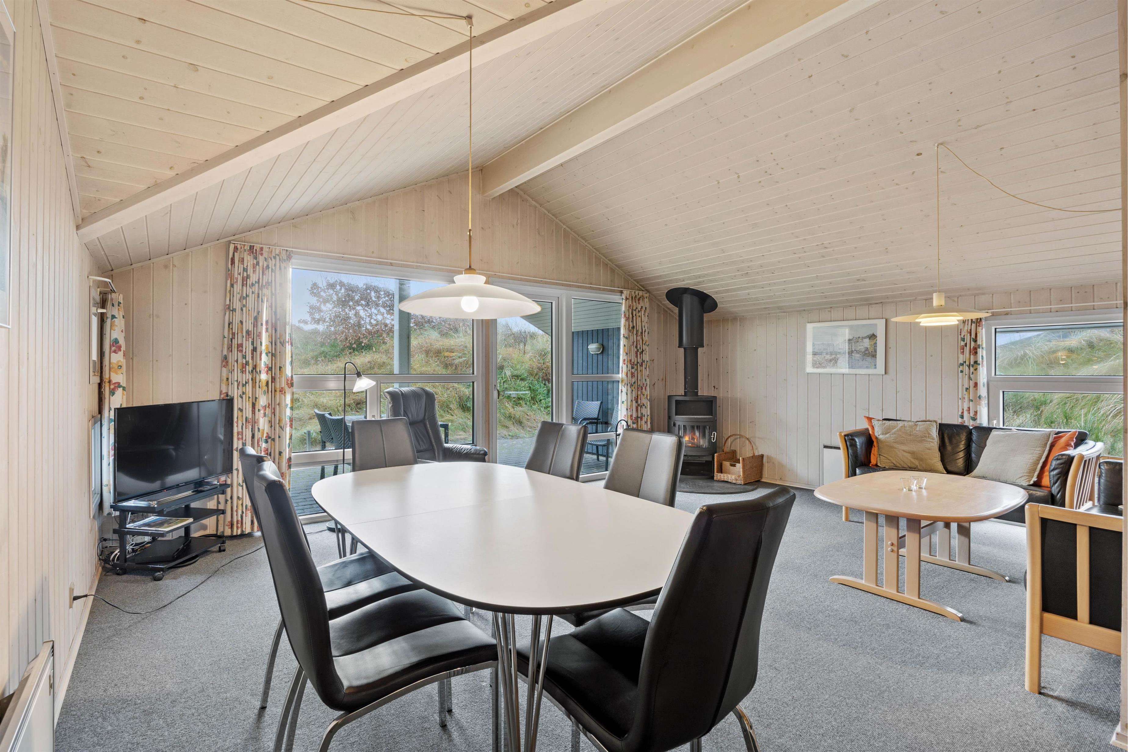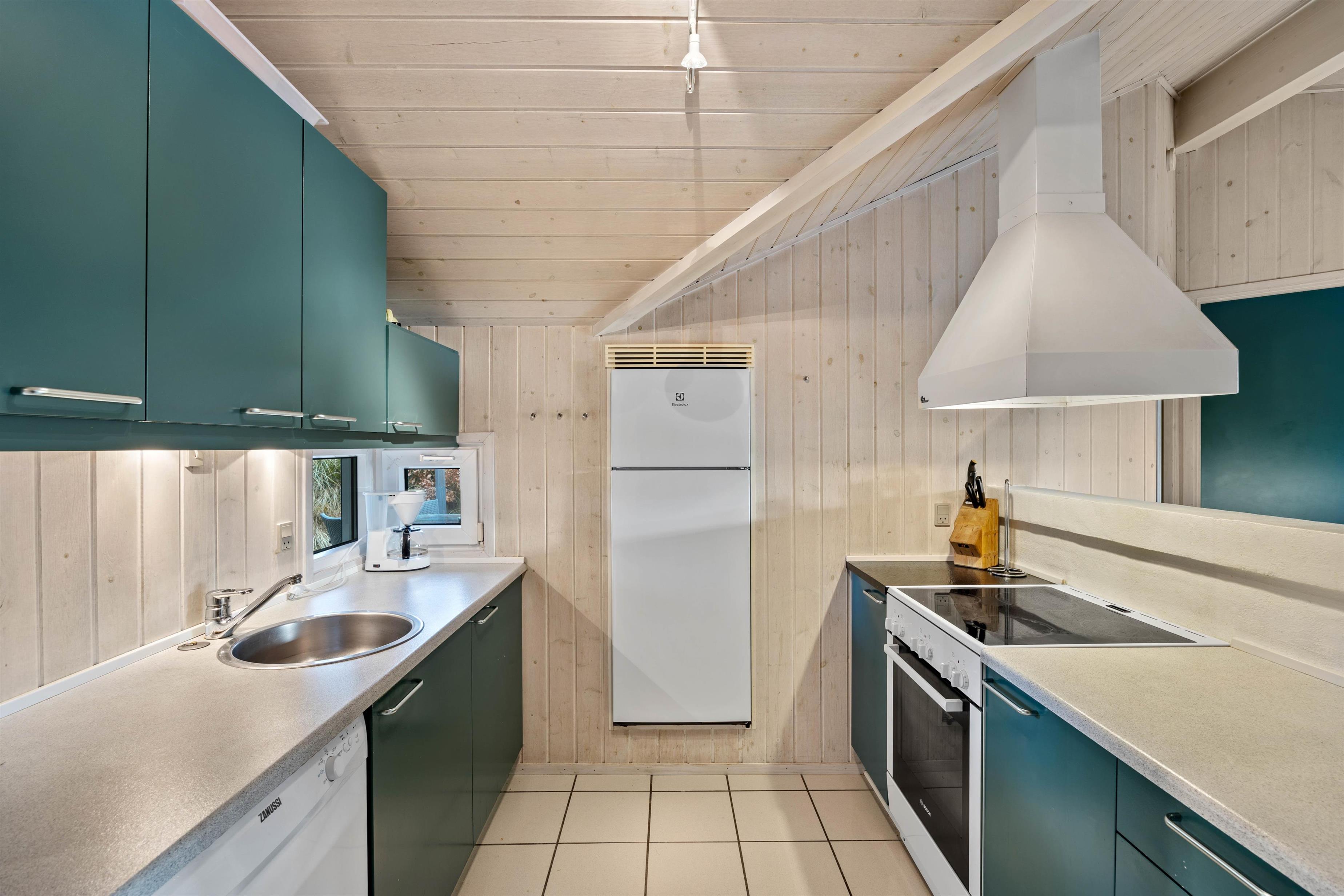 Det skønne feriehus rummer plads til op til 6 personer fordelt på tre fine og velindrettede soveværelser. Både fra soveværelserne såvel som opholdsrummet har I en herlig udsigt ud over det omkringliggende klitlandskab. Nyd udsigten, mens der bliver lavet mad, spillet kort eller slappet af på sofaen med den knitrende brændeovn i baggrunden. Integreret fryser på 40 liter.
