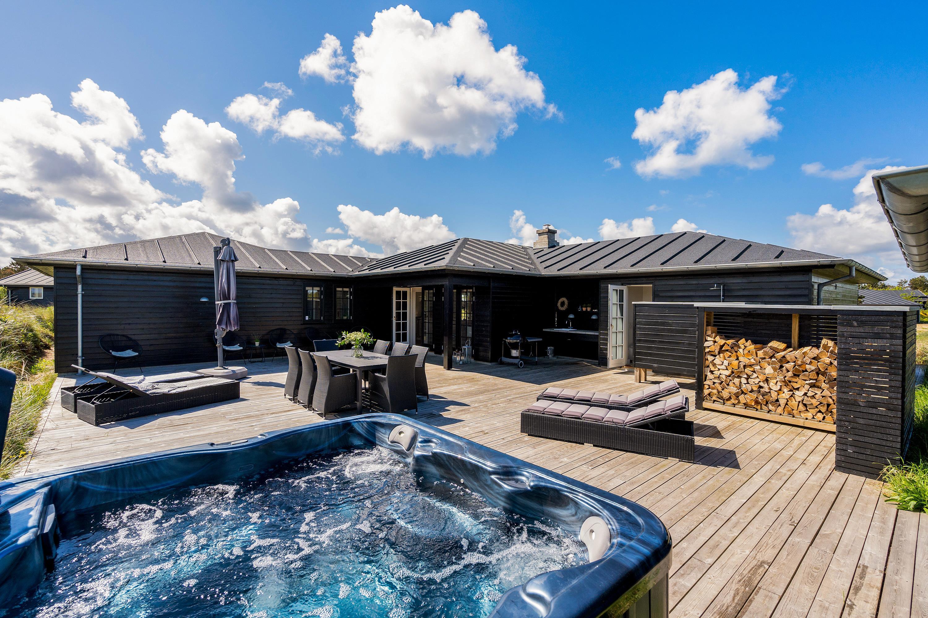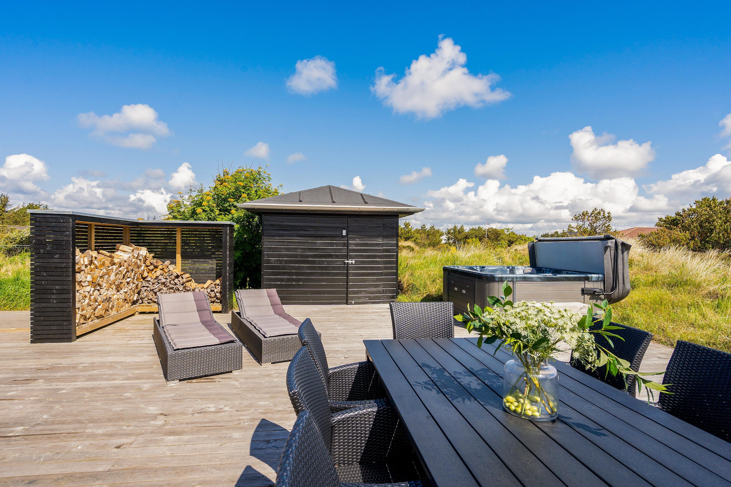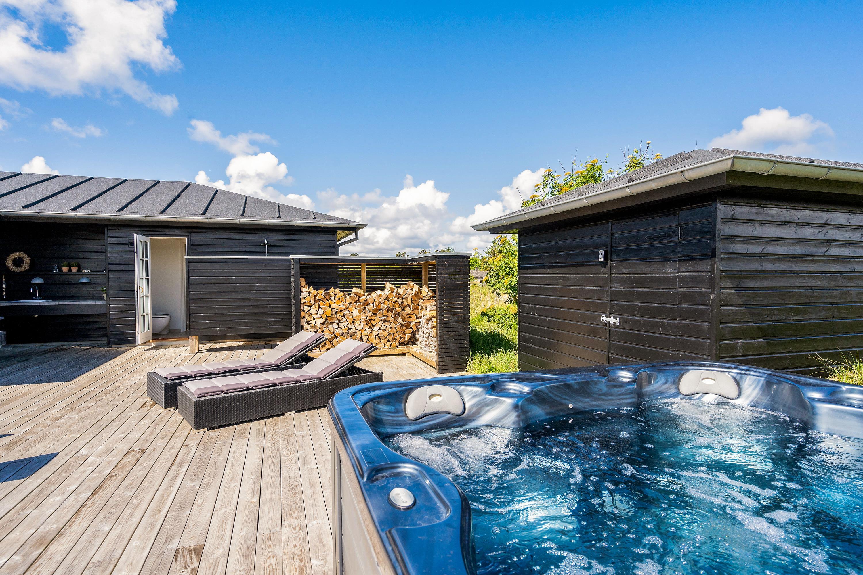 Det store terrassedæk er klar til alle slags udendørs hygge – her kan der både laves mad, slappes af og når det er tid til lidt bobler, så står den store 6 personers udespa klar til dagens wellnessindslag efter et grundigt skyl under udebruseren, som også er perfekt til at skylle saltvand og sand af, efter en tur på stranden.