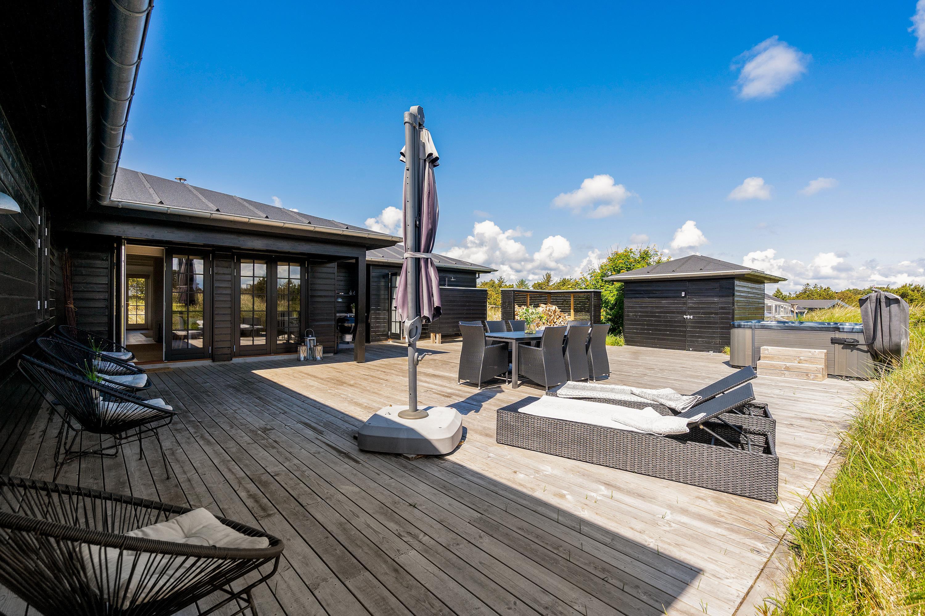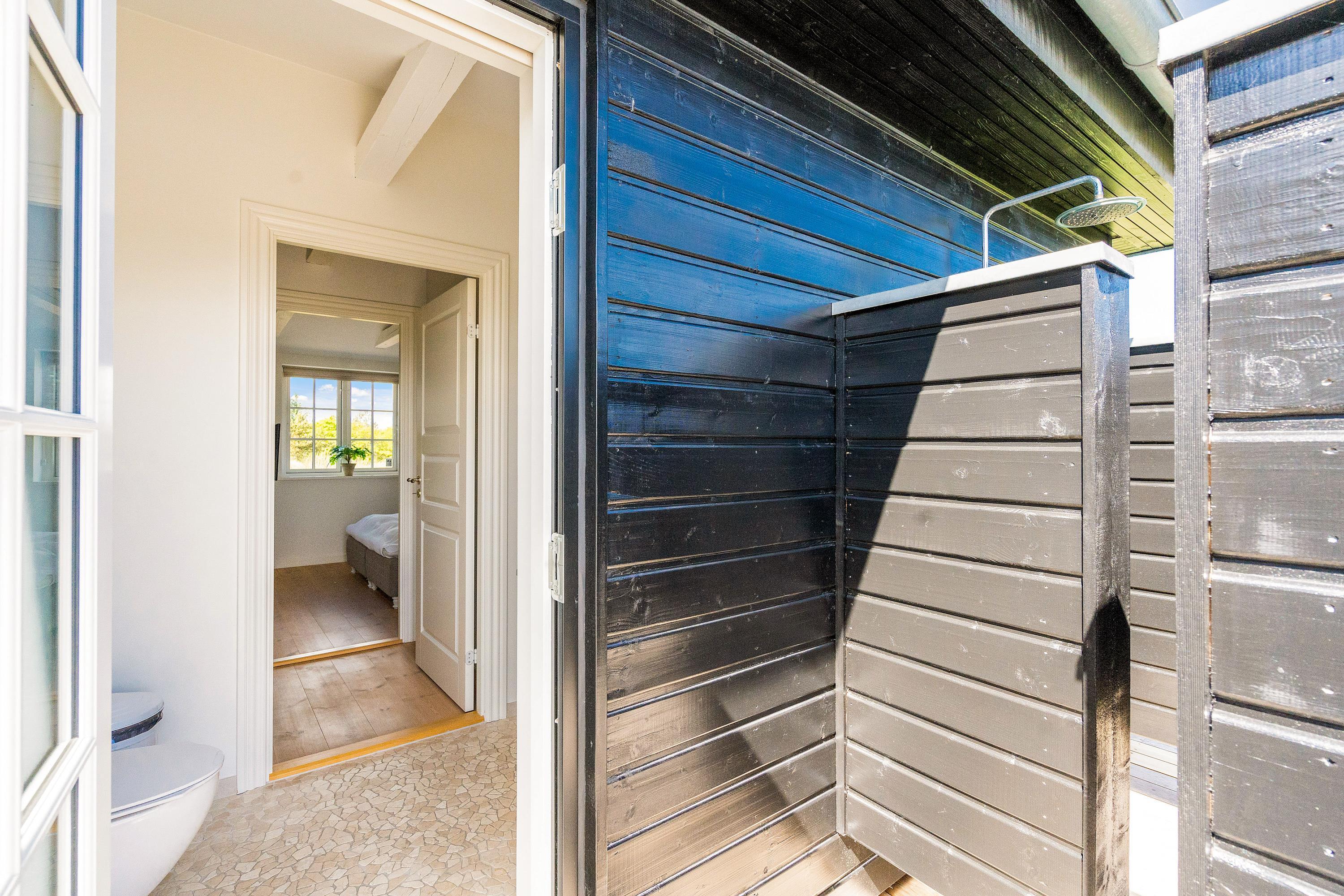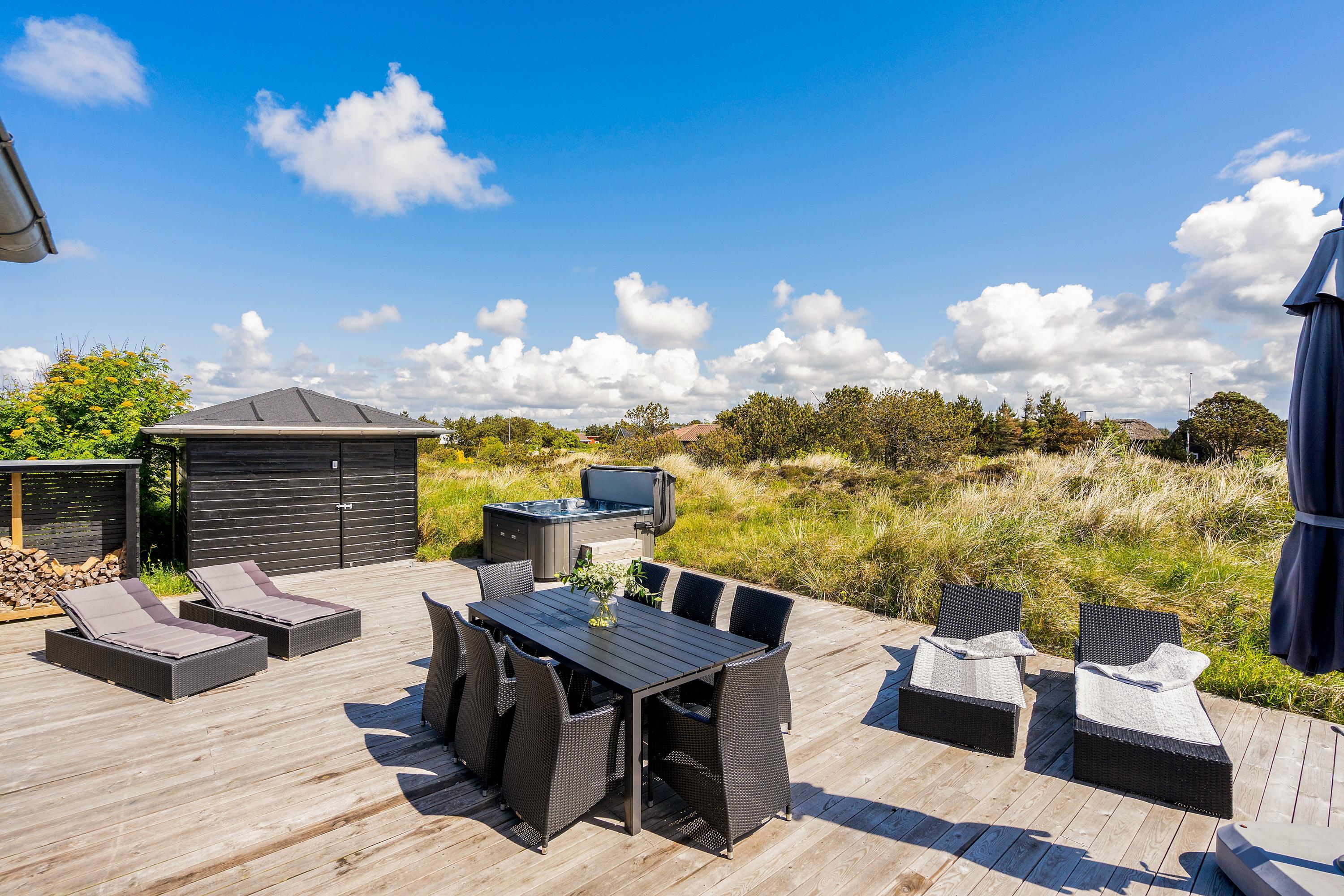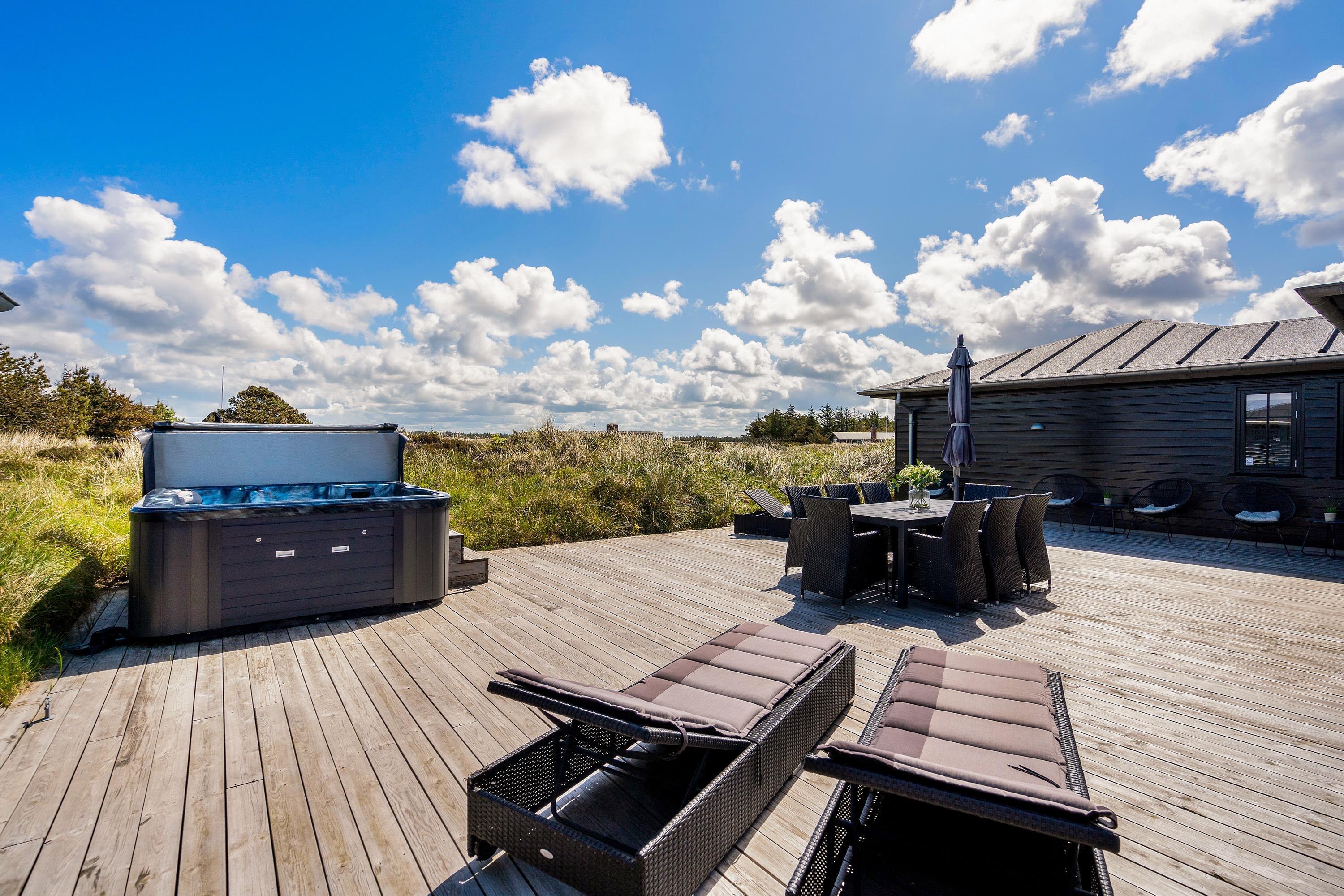 Det store terrassedæk er klar til alle slags udendørs hygge – her kan der både laves mad, slappes af og når det er tid til lidt bobler, så står den store 6 personers udespa klar til dagens wellnessindslag efter et grundigt skyl under udebruseren, som også er perfekt til at skylle saltvand og sand af, efter en tur på stranden.