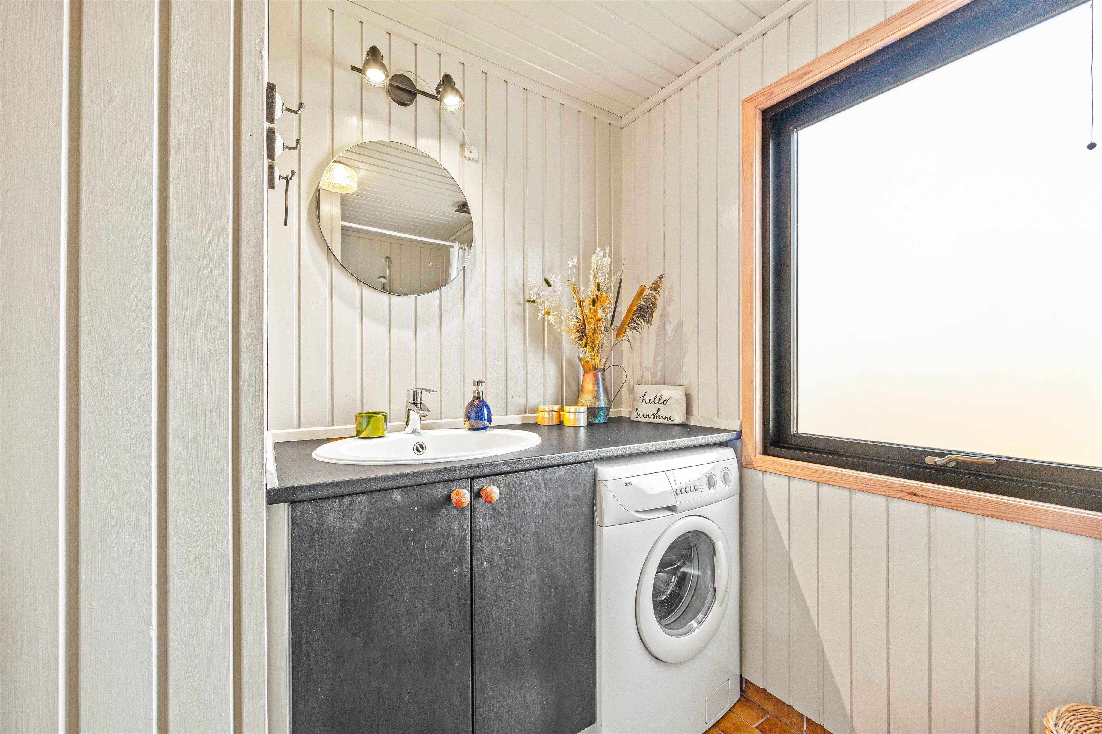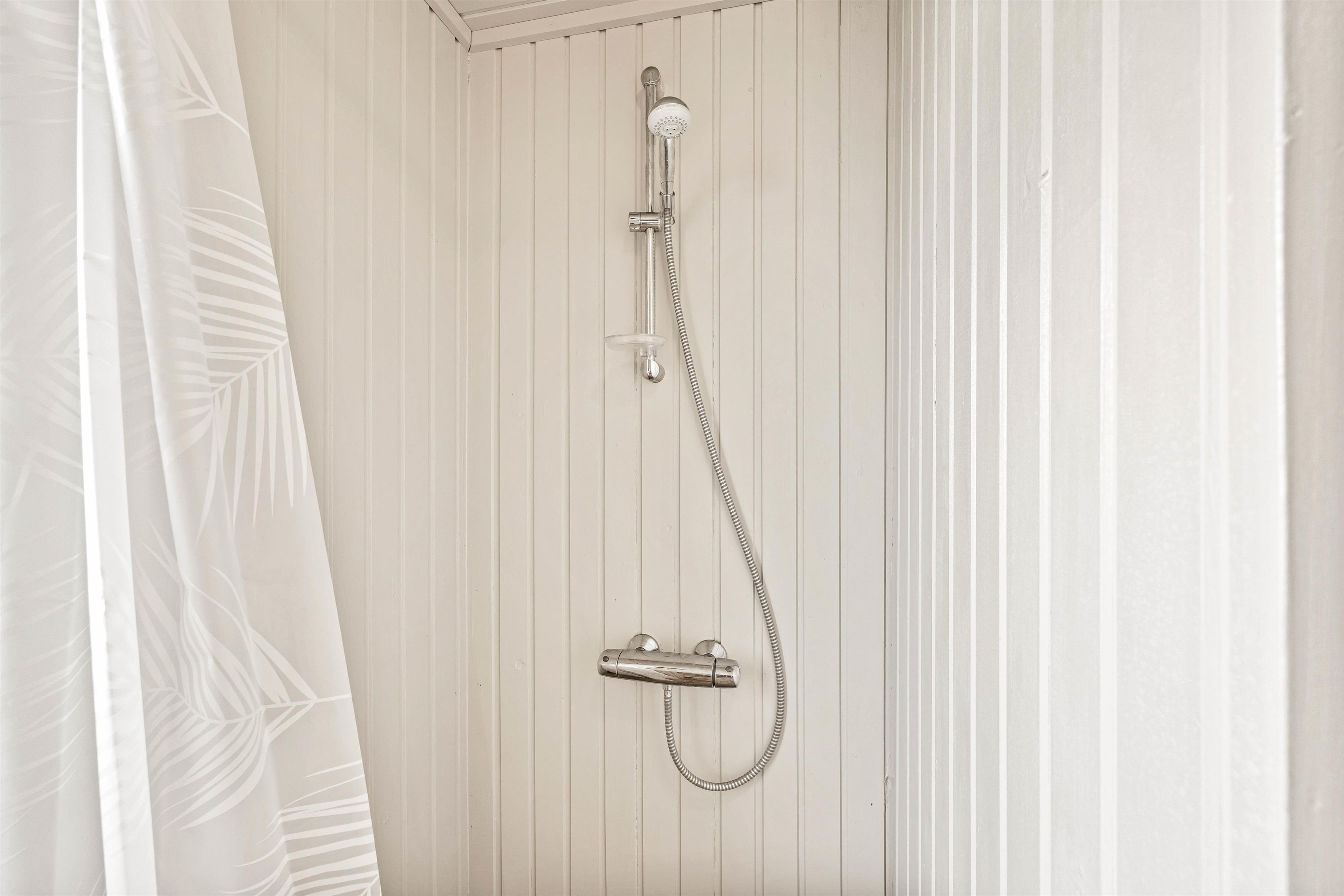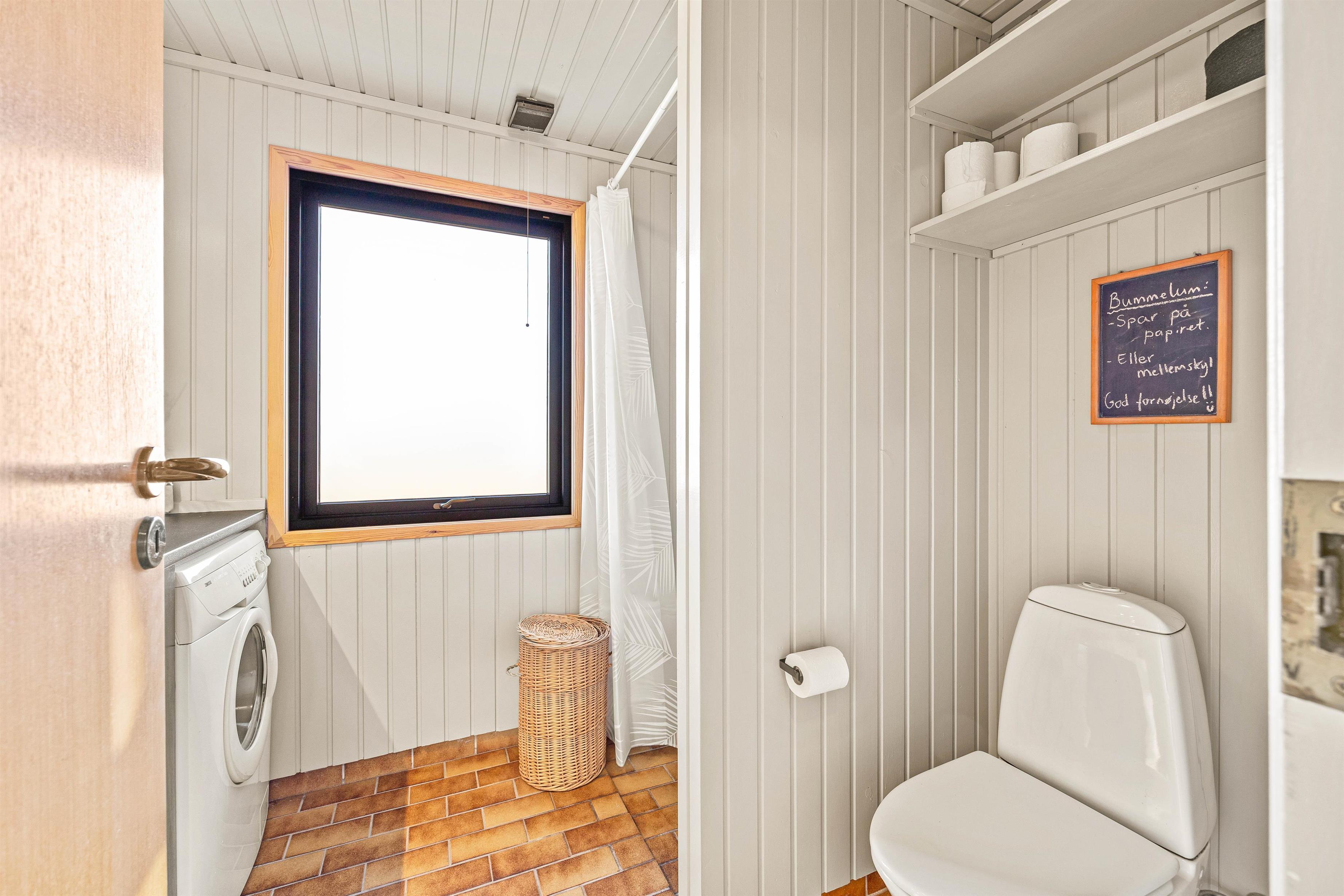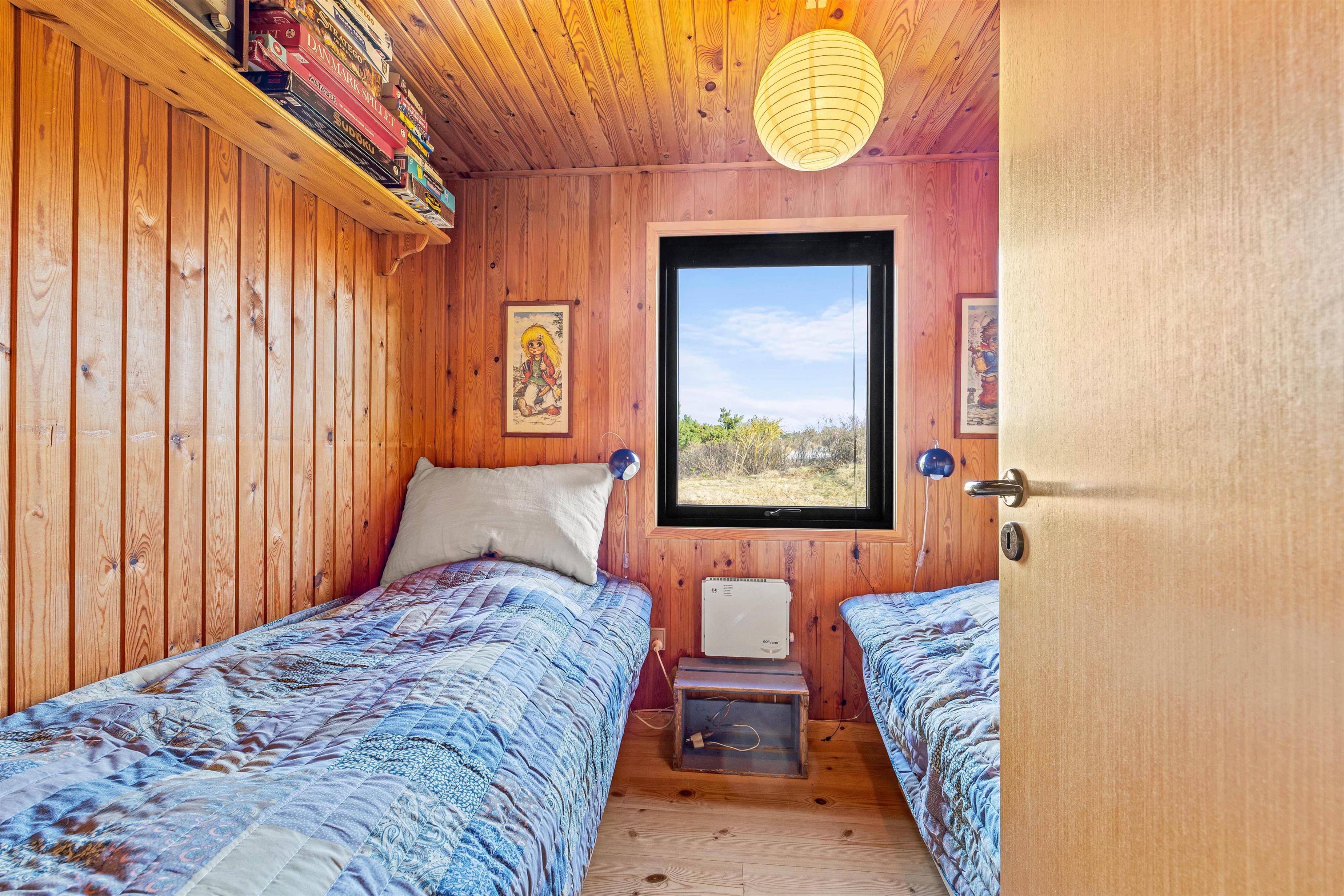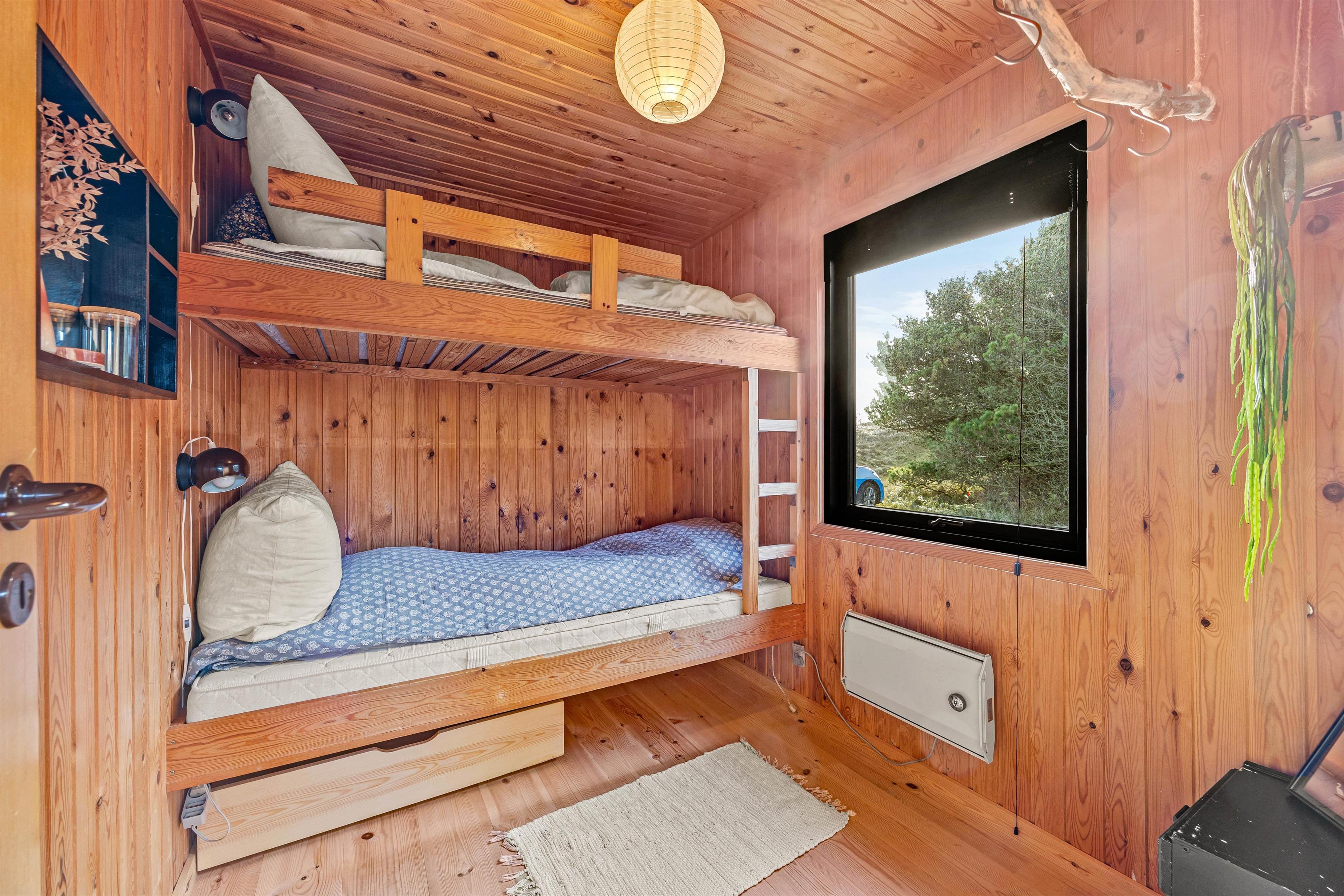 De 4 sovepladser, som dette sommerhus råder over er fordelt over 3 soveværelser: det ene af soveværelserne er indrettet med en dobbeltseng, det andet soveværelse med 2 enkeltmandssenge, og et tredje soveværelse indeholder en etageseng - et oplagt soveværelse til børnene. Sommerhusets badeværelse er indrettet lyst, og her kan I også finde vaskemaskinen, som kan være jer behjælpelige med at holde jeres badehåndklæder nyvasket.