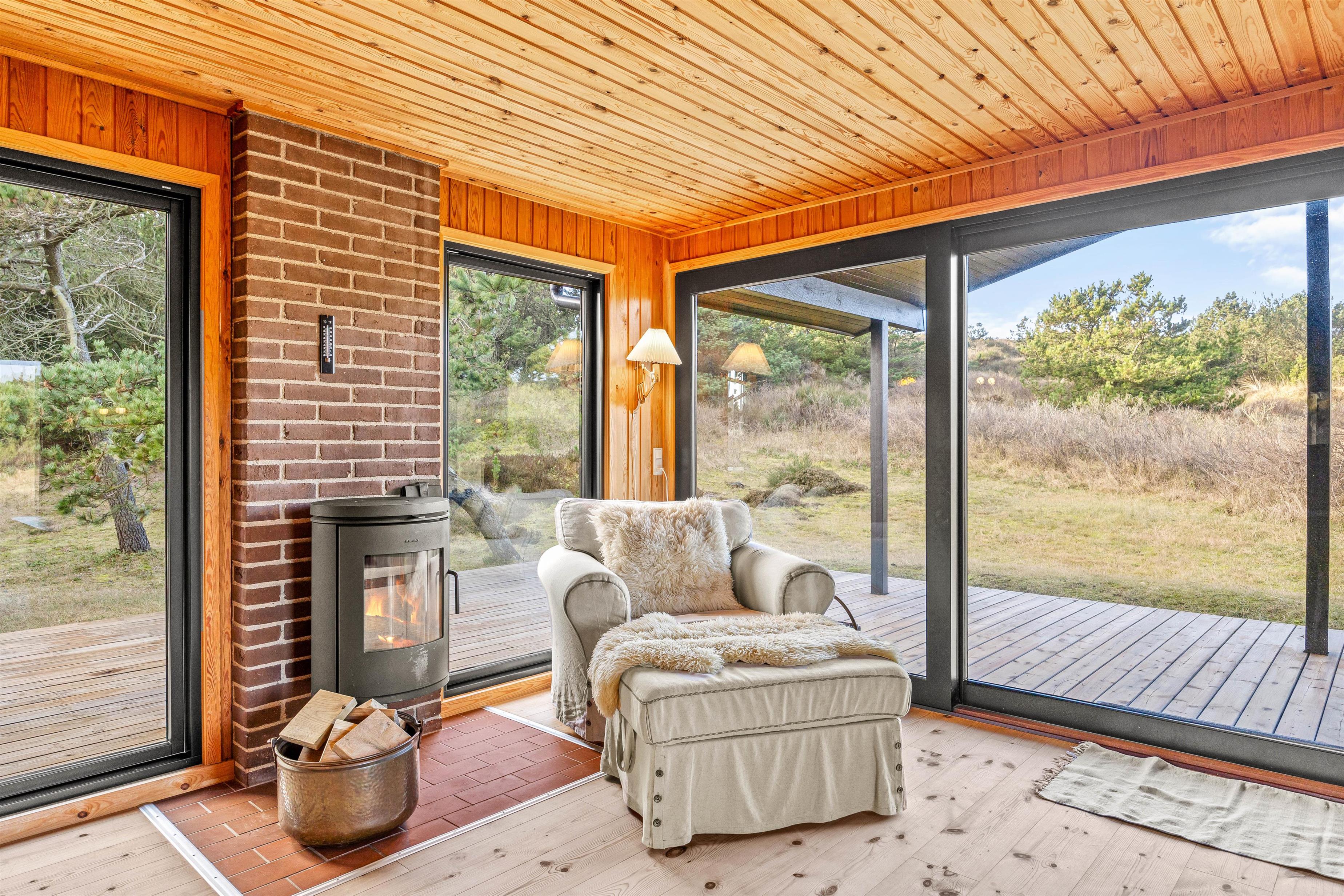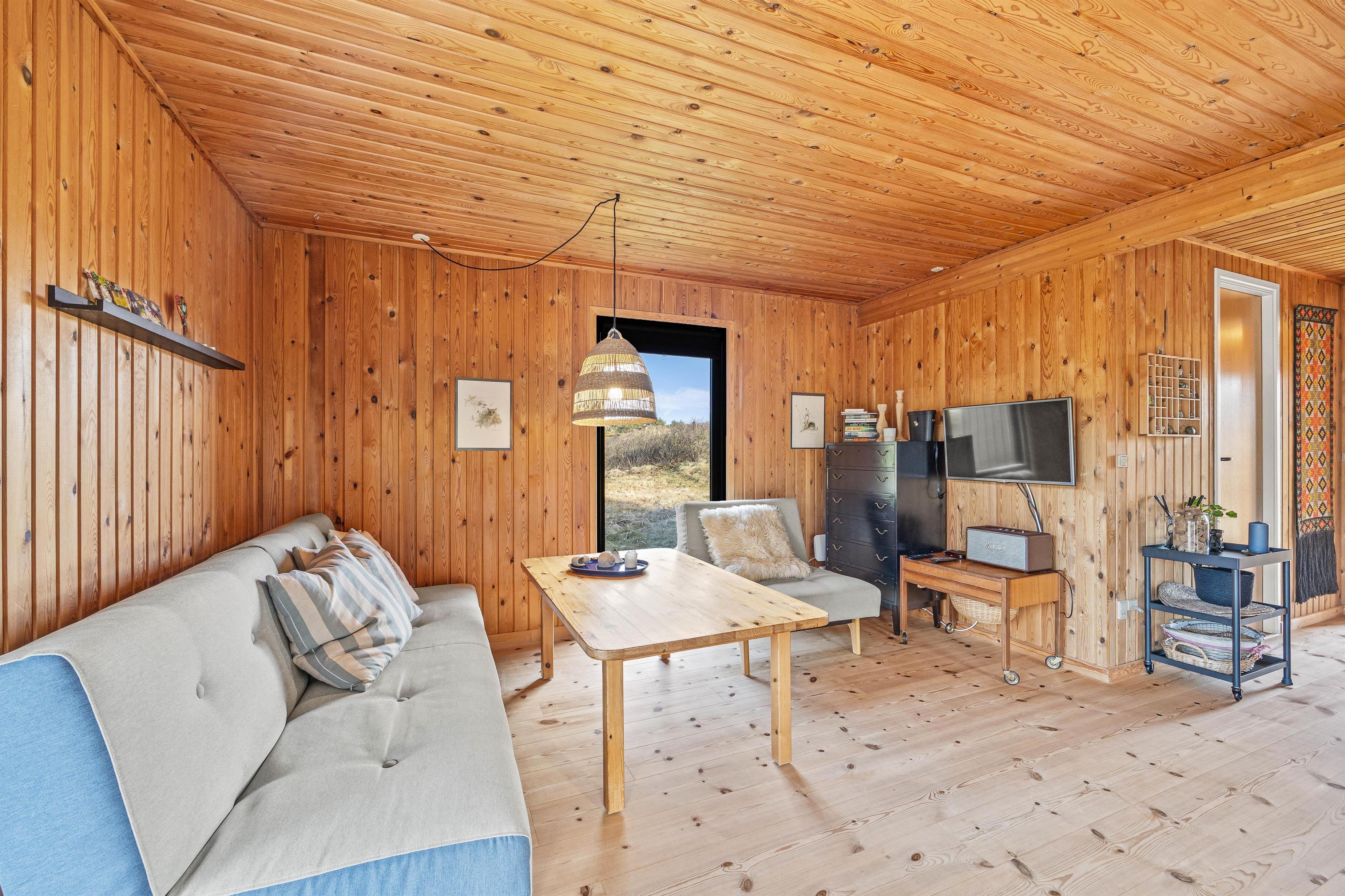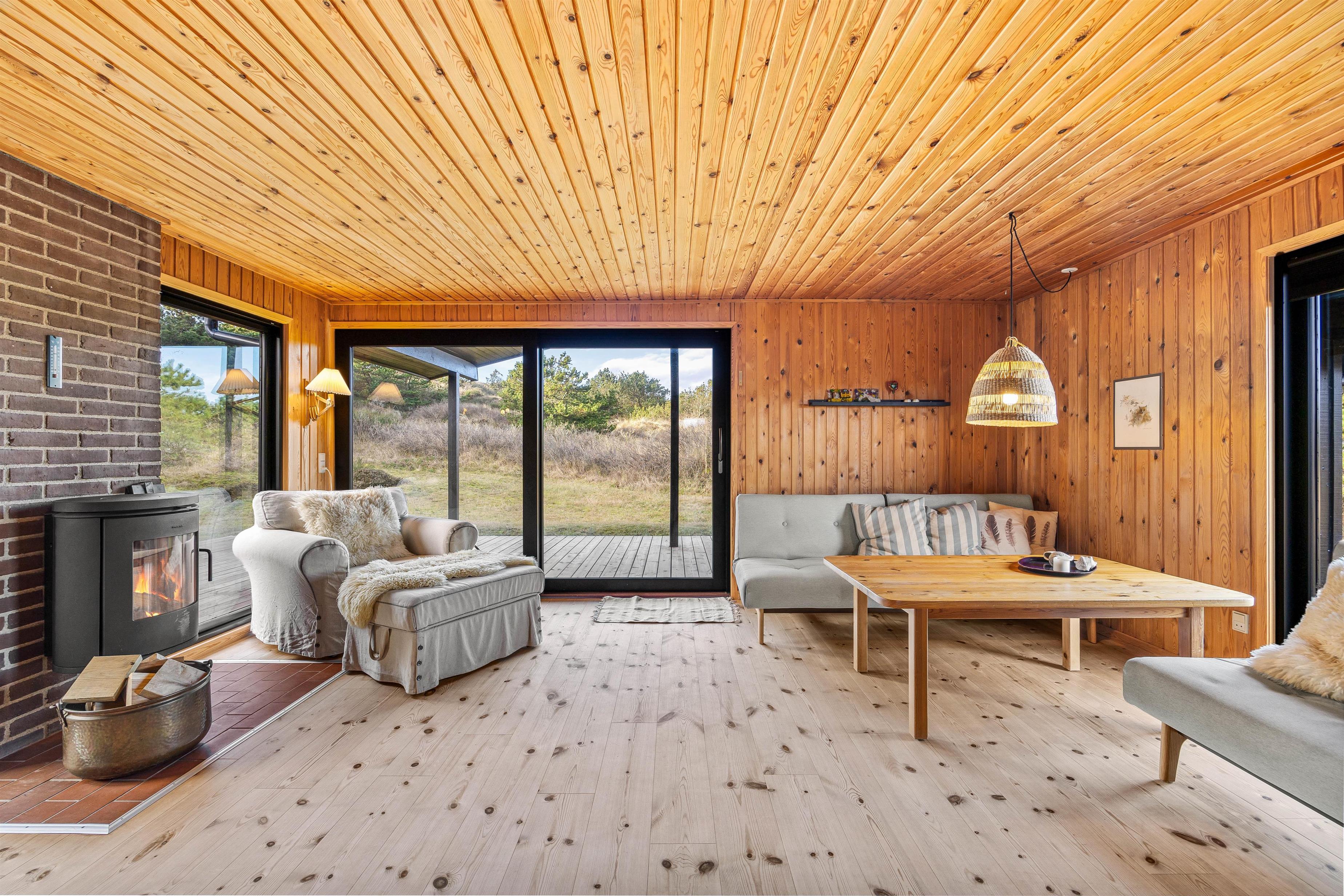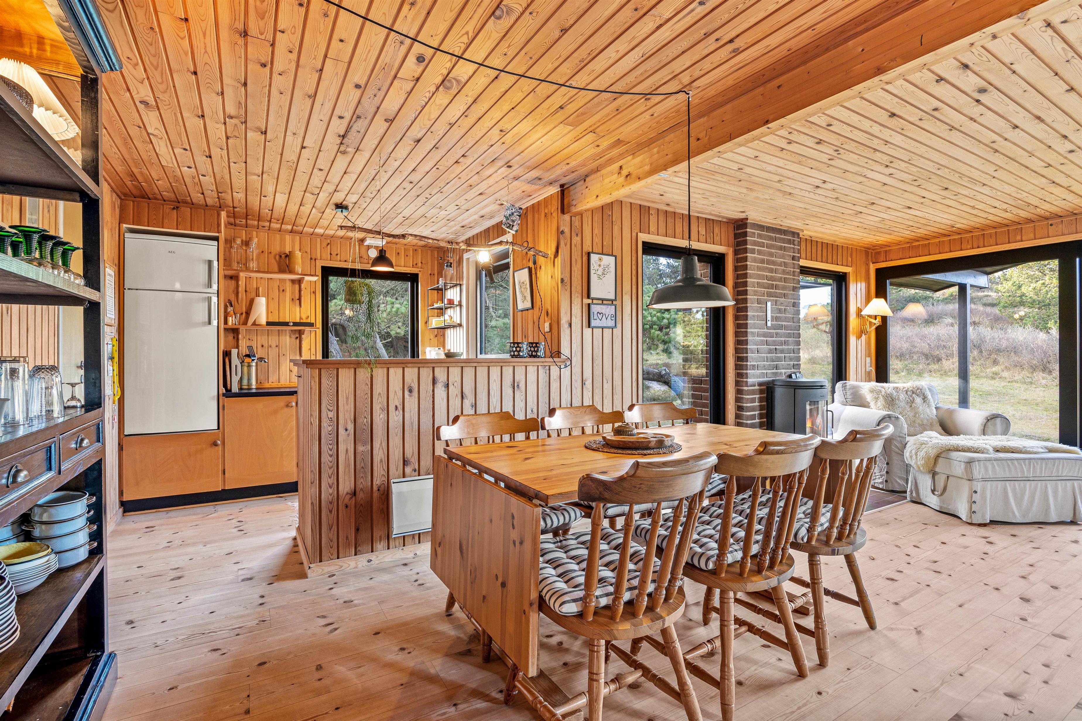 I dette træbeklædte sommerhus vil I mærke feriestemningen, så snart I træder ind: Stuen og køkken er i åben forbindelse, og dermed et åbent rum med god plads til samvær for hele familien. Stuen med både fladskærms TV og DVD afspiller indbyder til afslapning med film i sofaen eller lænestolen, imens brændeovnen knitrer i baggrunden. De mange vinduer i dette skønne rum lukker ikke bare et fantastisk lys ind, men byder også muligheden for at betragte den enestående natur rundt omkring dette sommerhus.