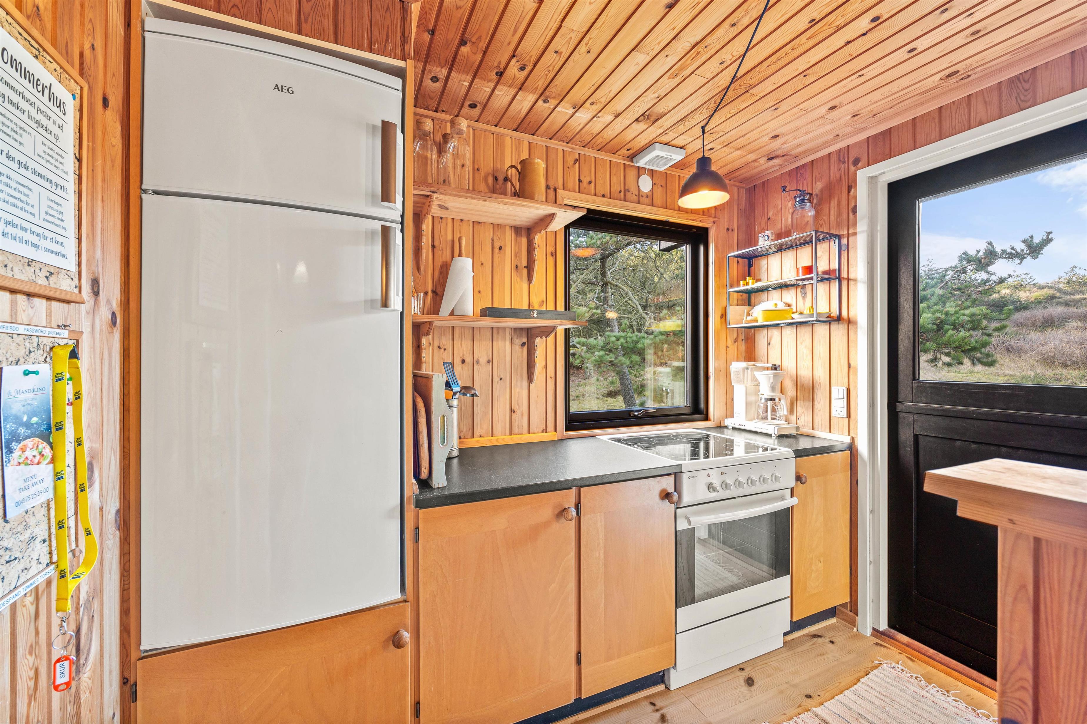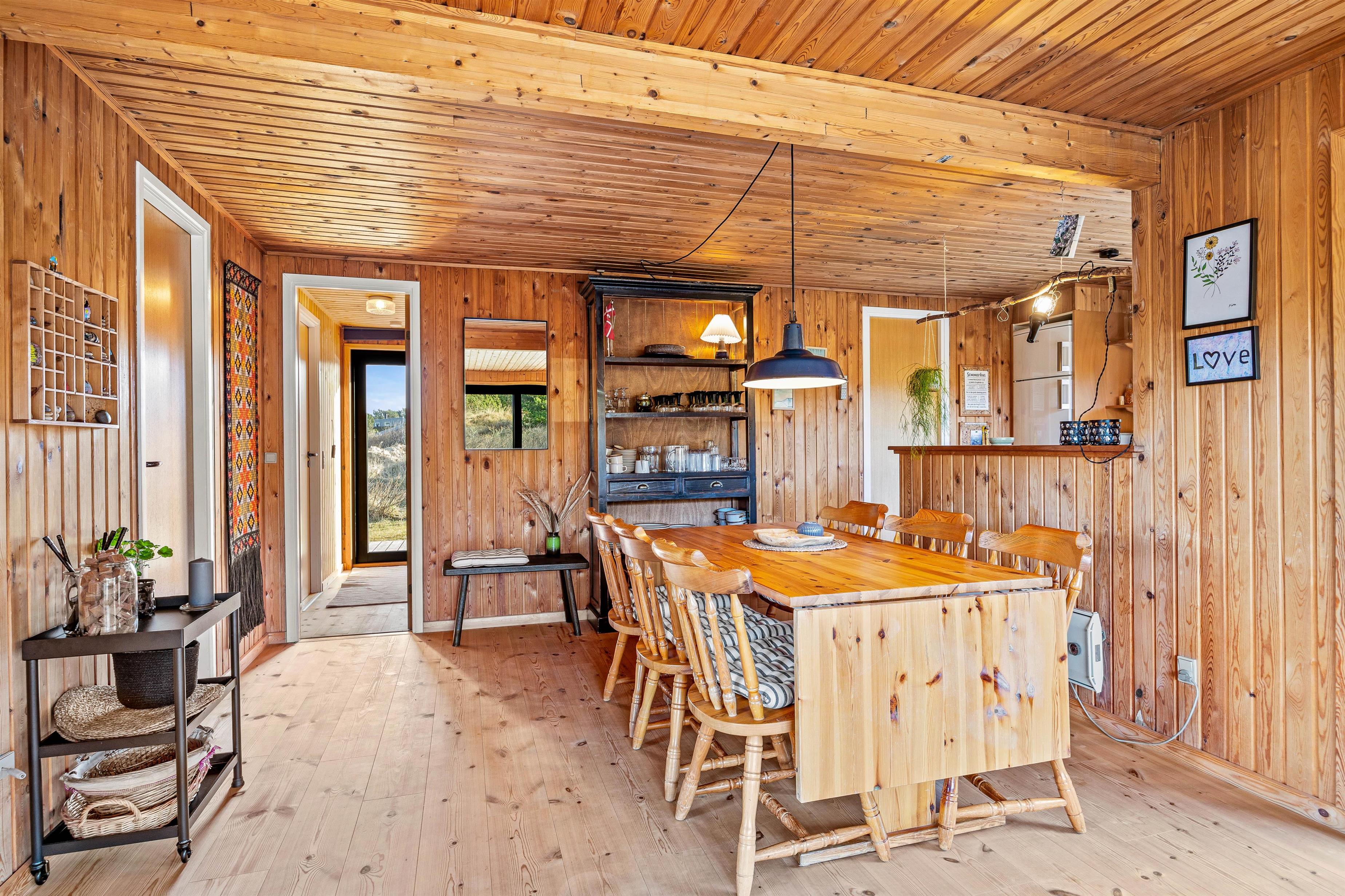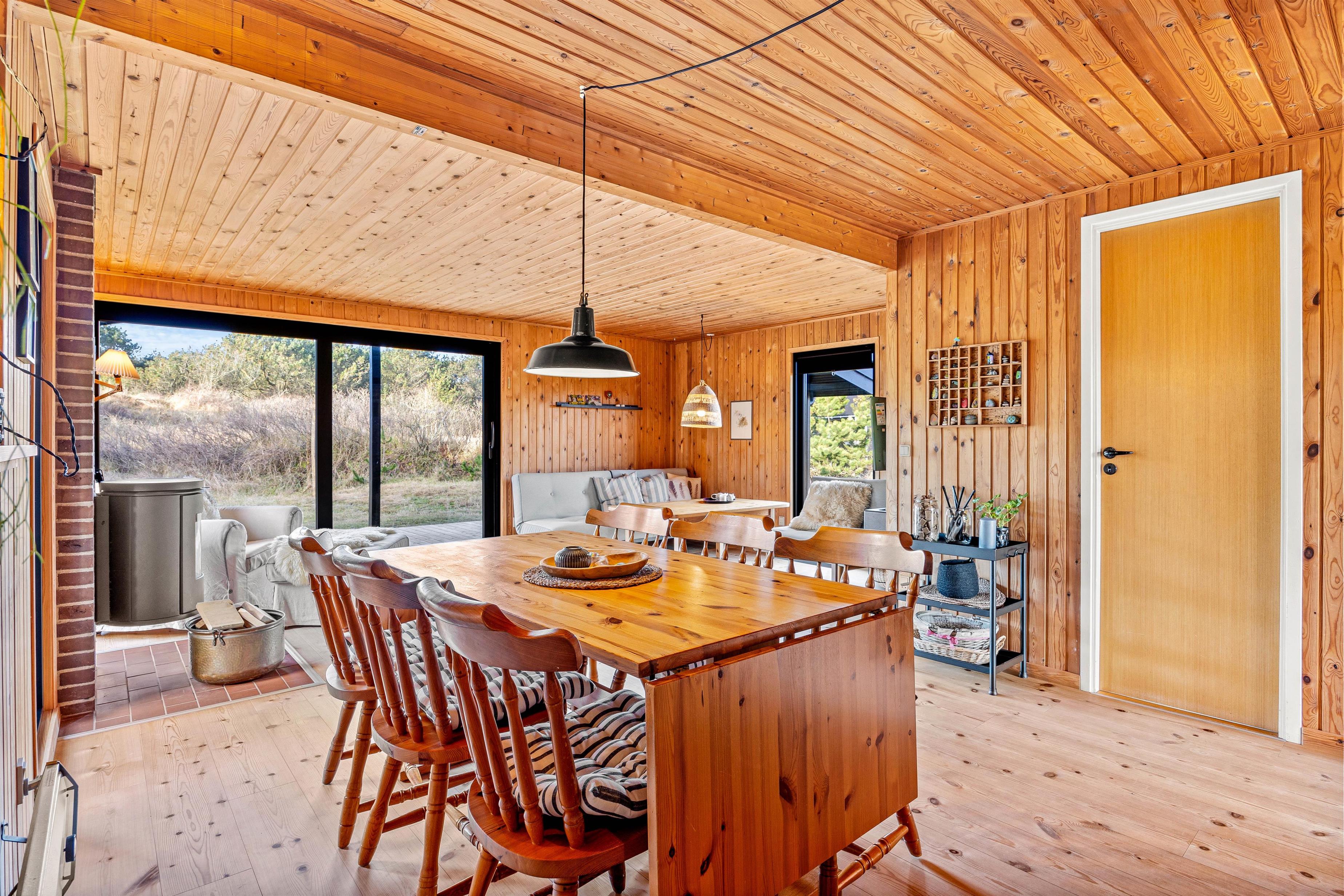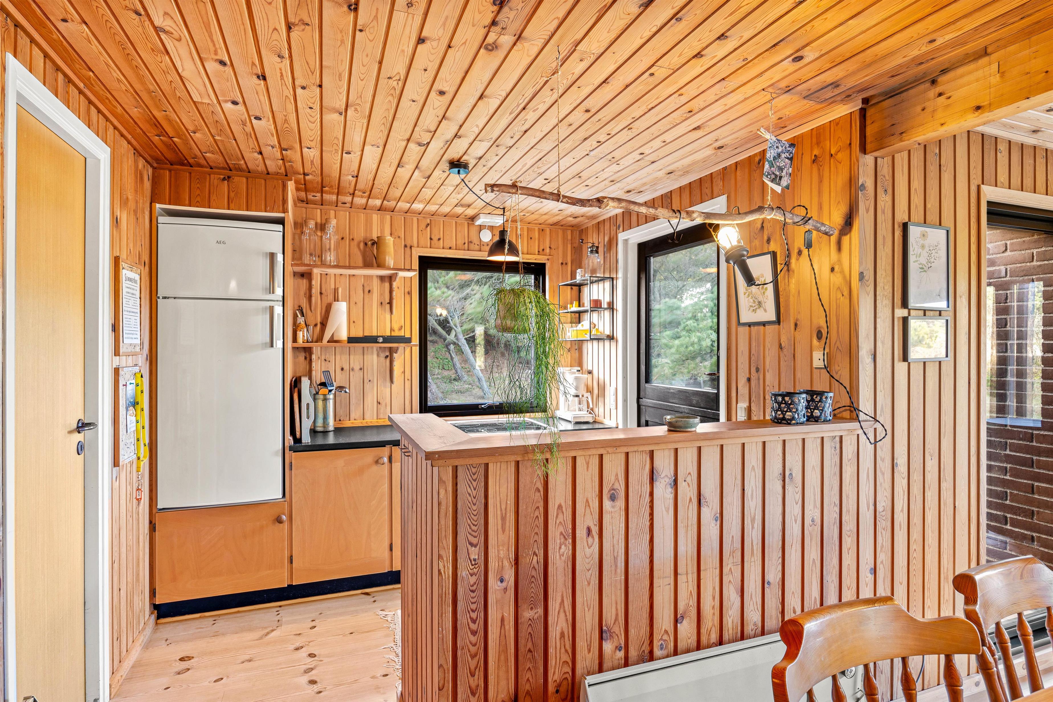 I dette træbeklædte sommerhus vil I mærke feriestemningen, så snart I træder ind: Stuen og køkken er i åben forbindelse, og dermed et åbent rum med god plads til samvær for hele familien. Stuen med både fladskærms TV og DVD afspiller indbyder til afslapning med film i sofaen eller lænestolen, imens brændeovnen knitrer i baggrunden. De mange vinduer i dette skønne rum lukker ikke bare et fantastisk lys ind, men byder også muligheden for at betragte den enestående natur rundt omkring dette sommerhus.
