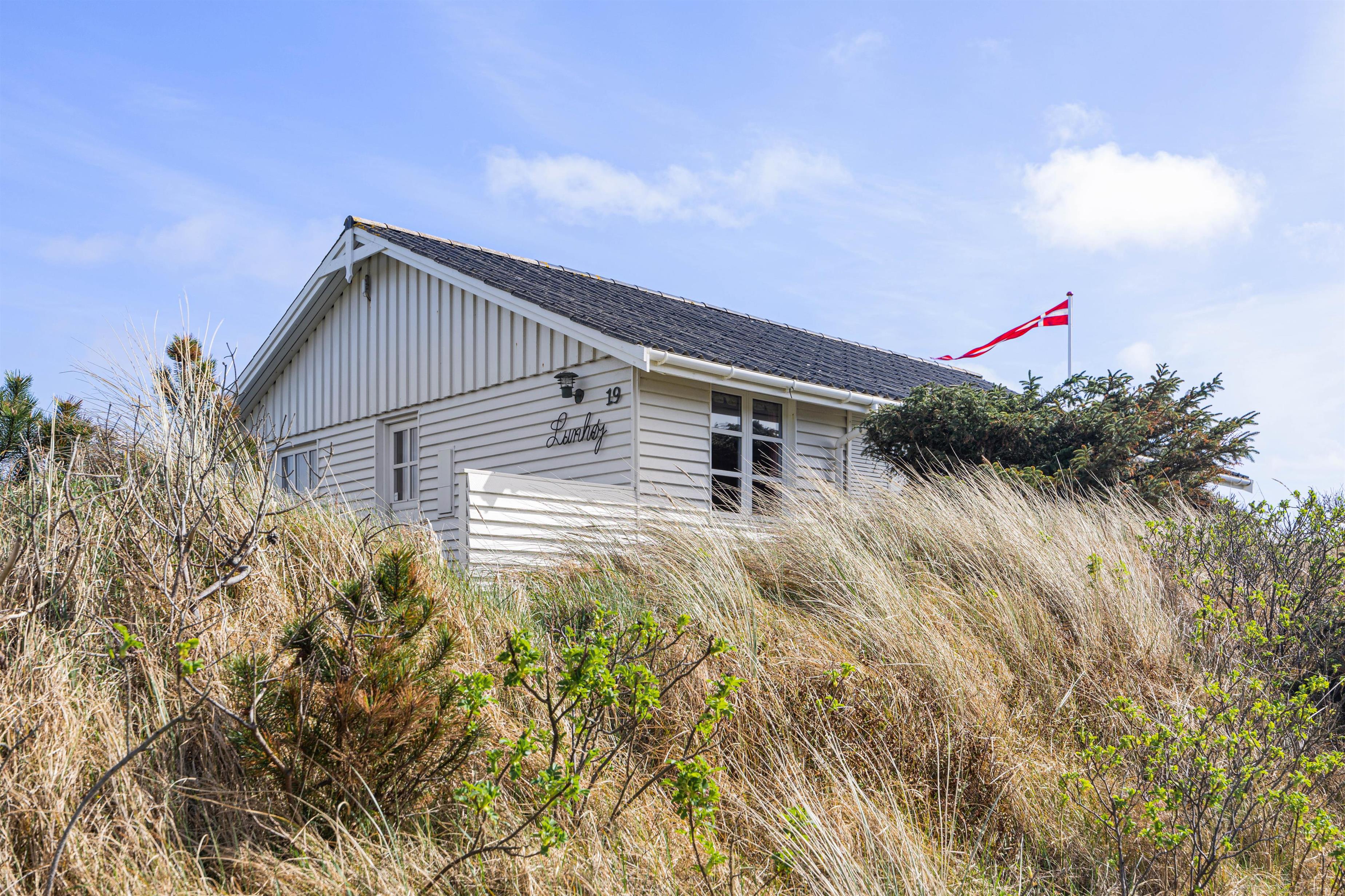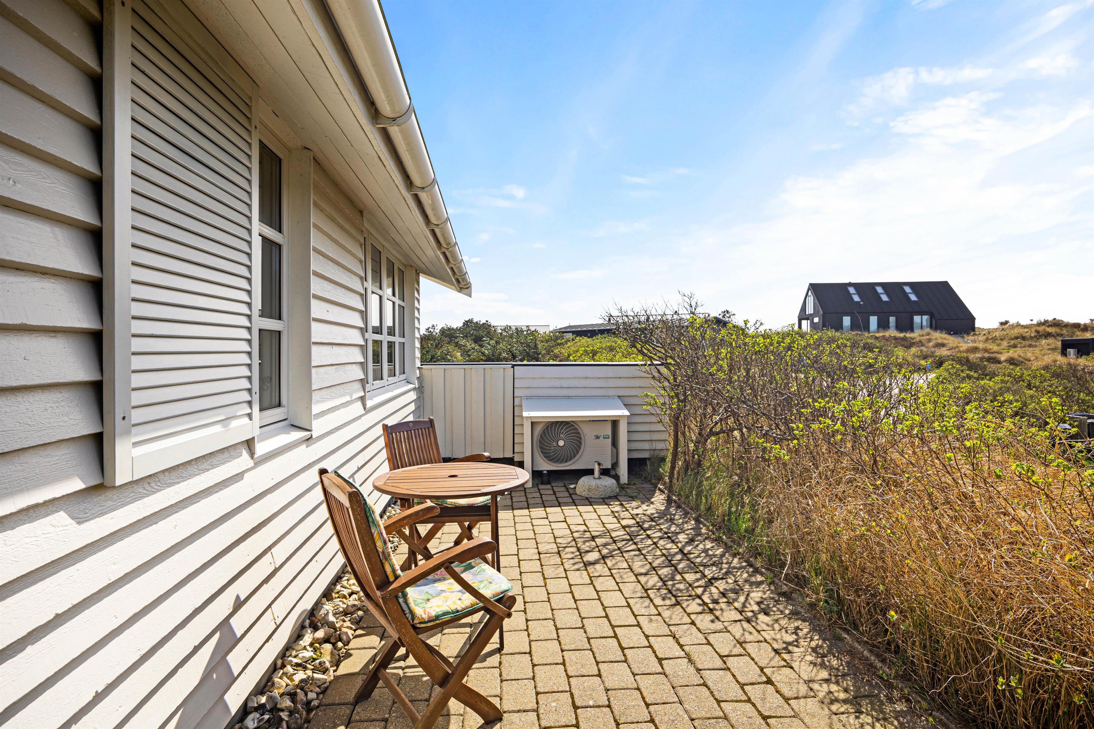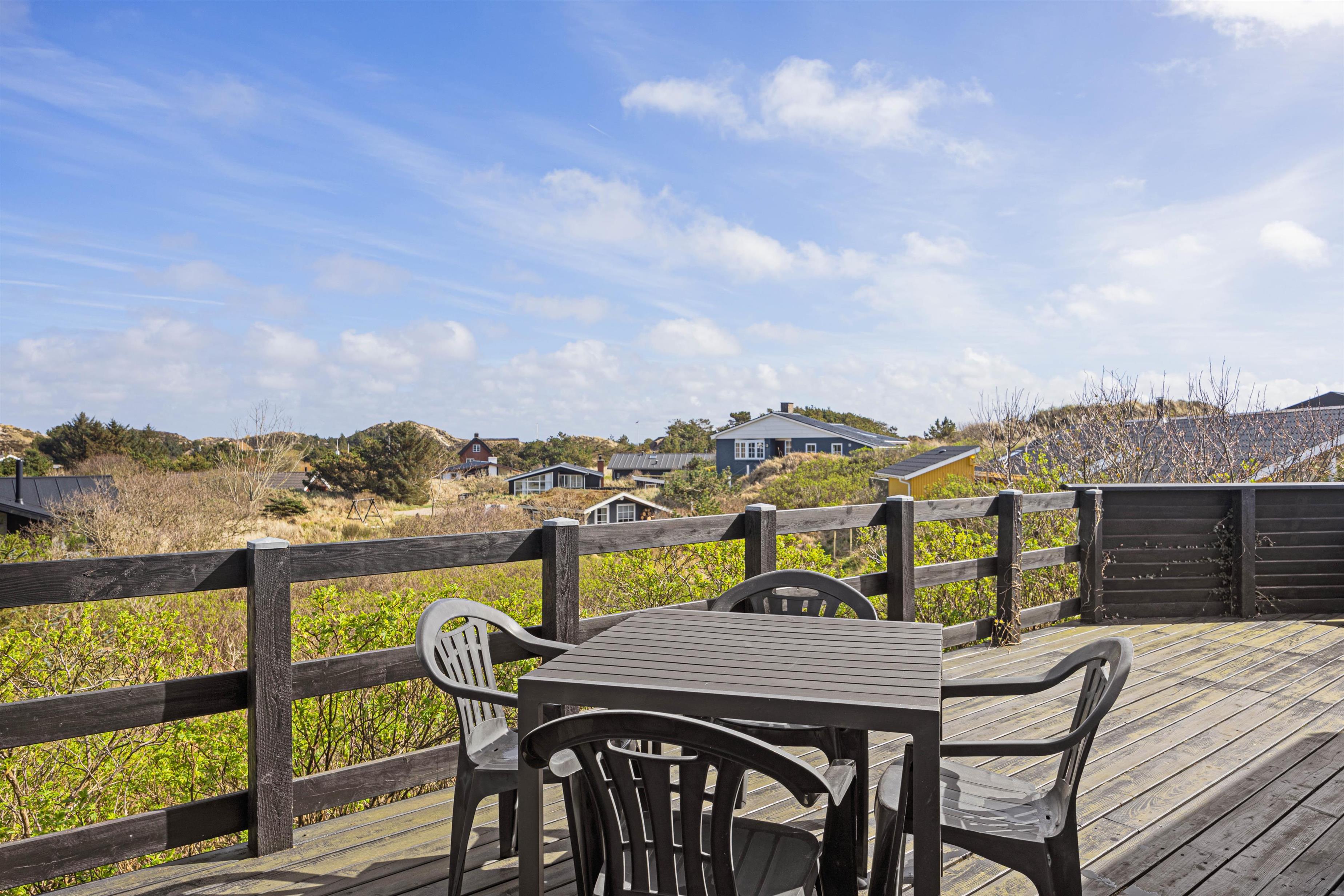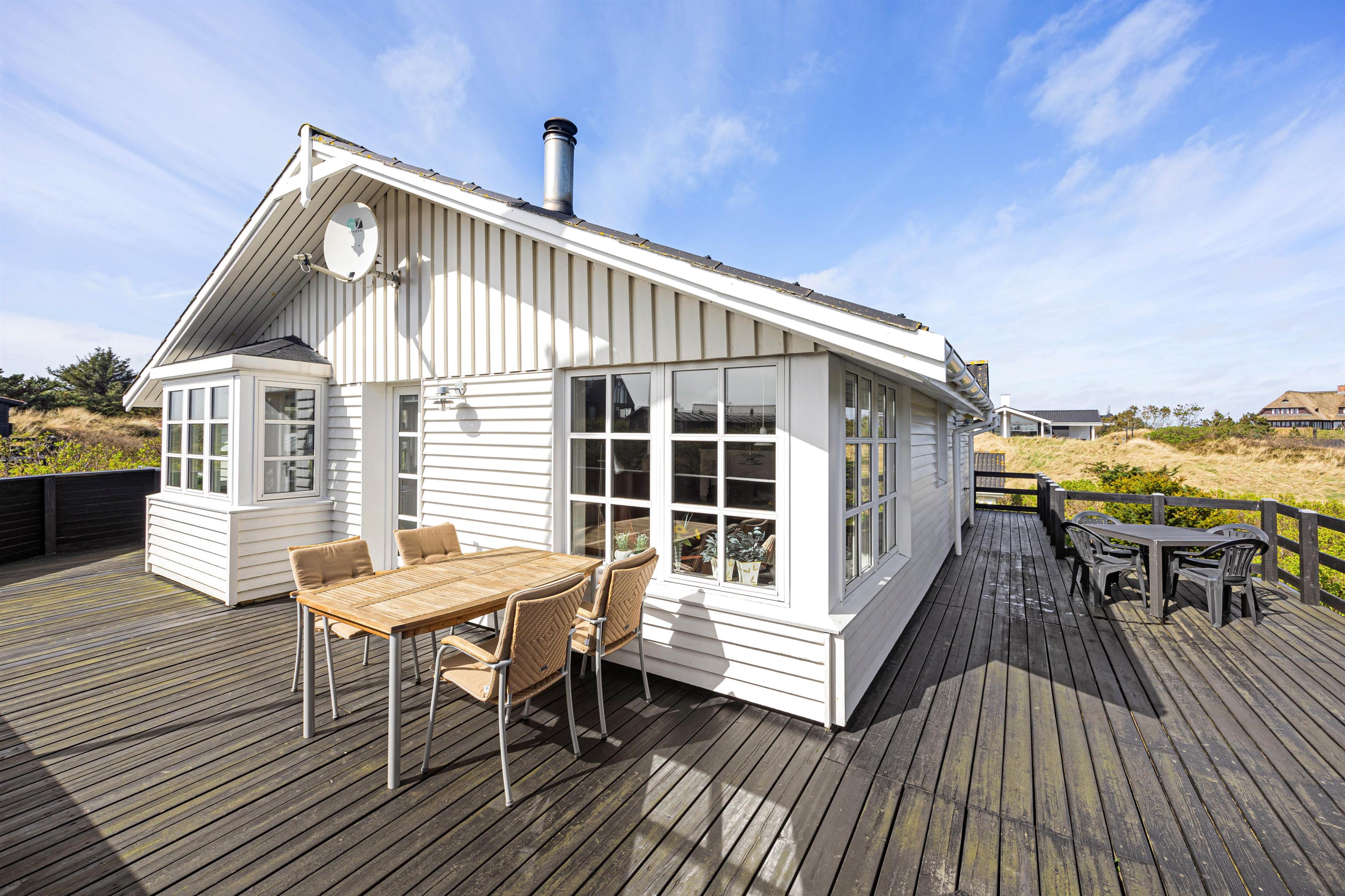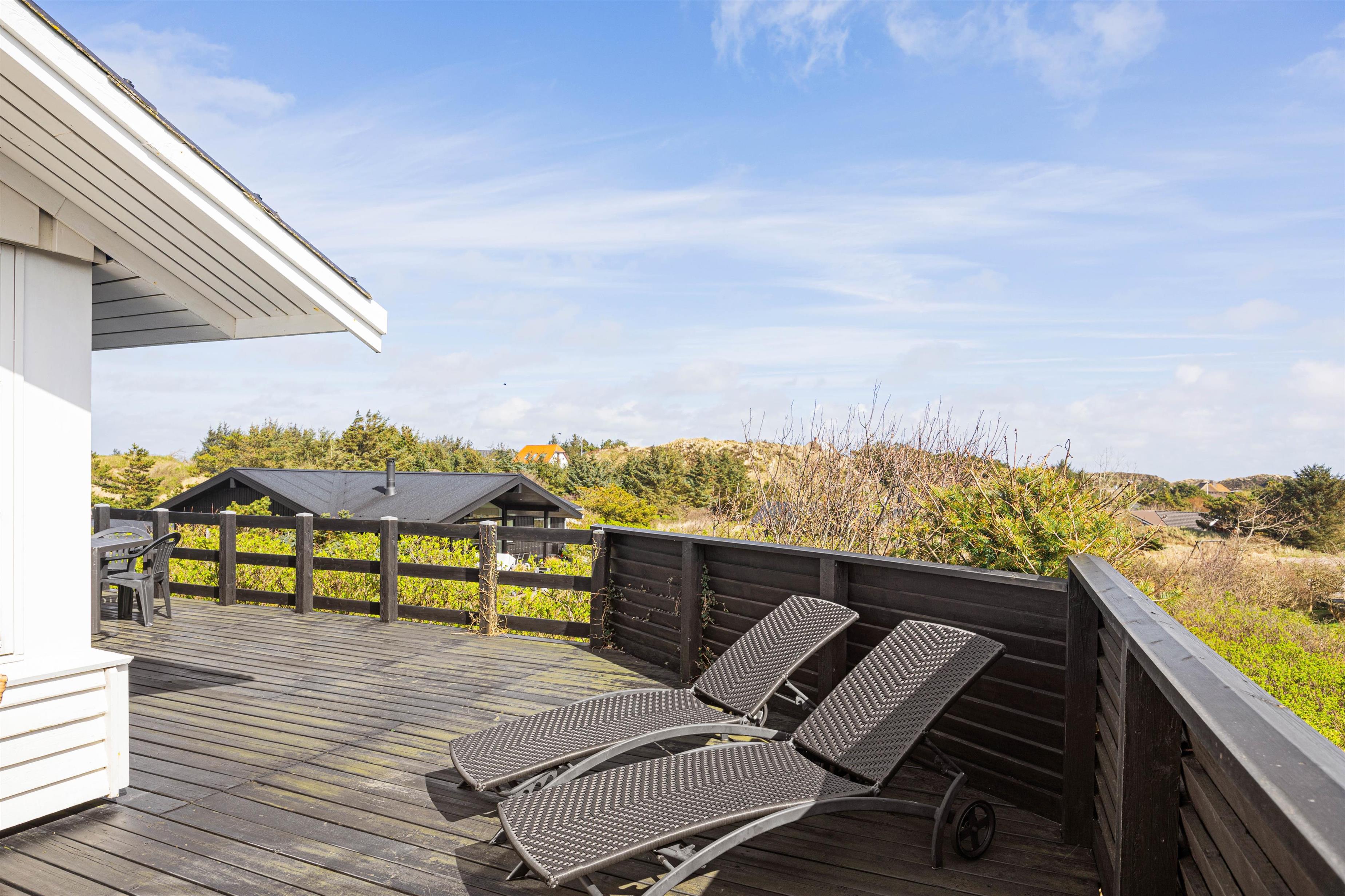 Fra stuen er der adgang til den store åbne træterrasse, hvorfra der er udsigt over klitterne. På den sydvendte terrasse, hvor der oftest er godt med læ, venter der havemøbler og grill.