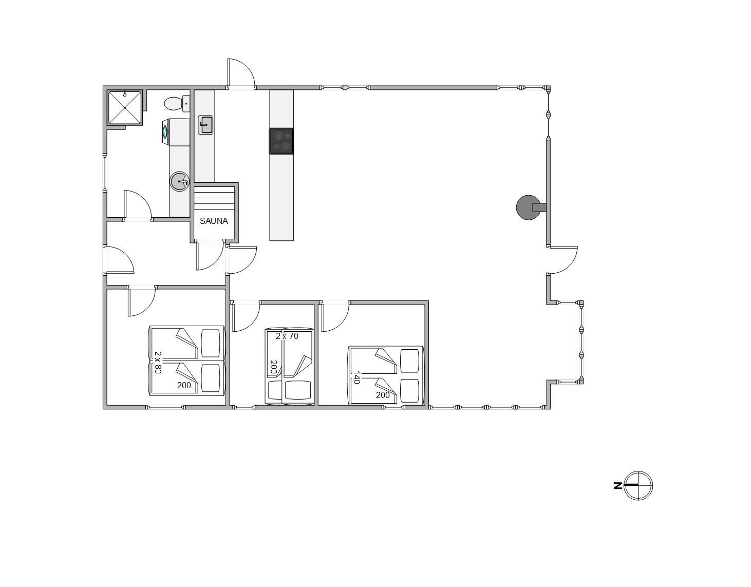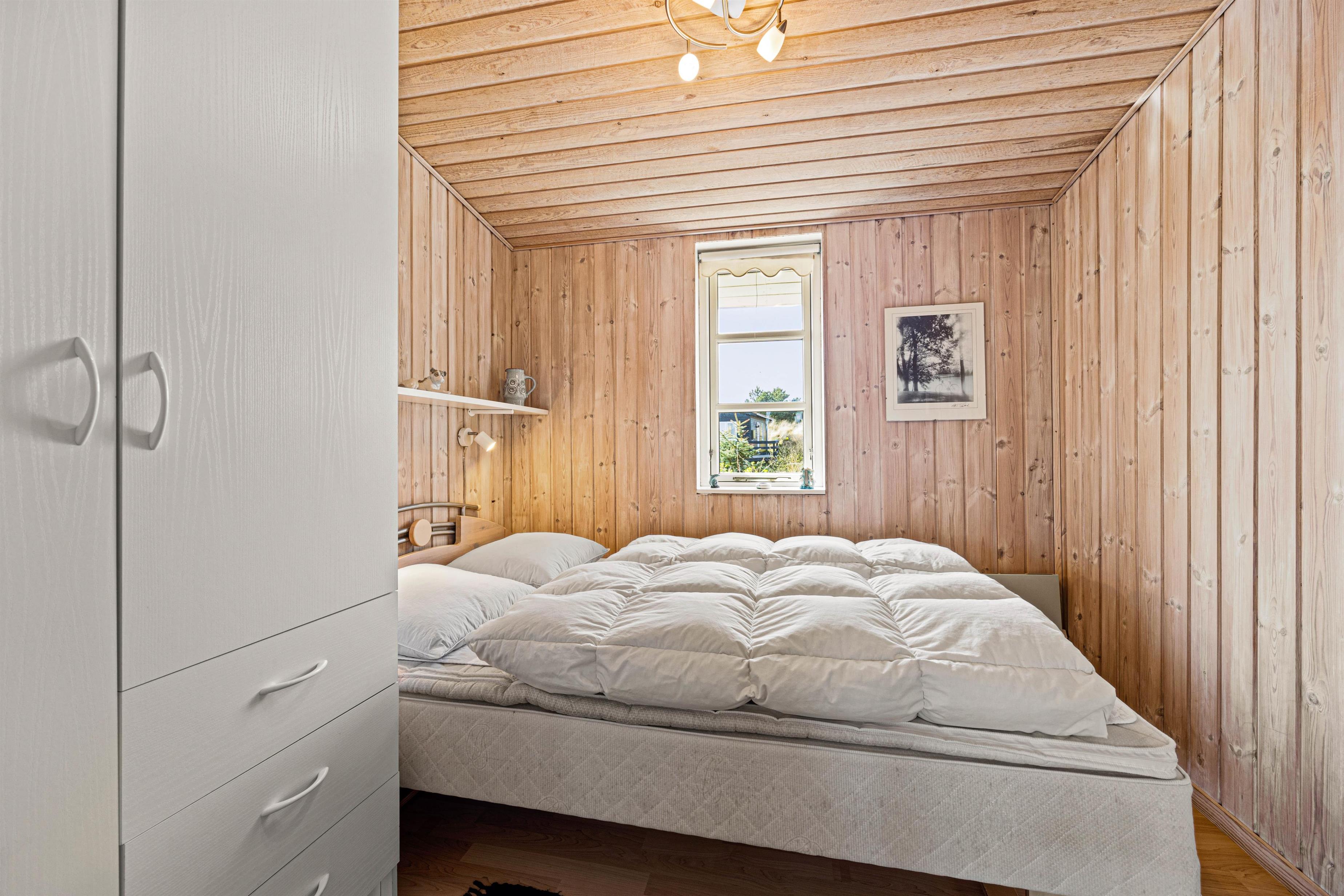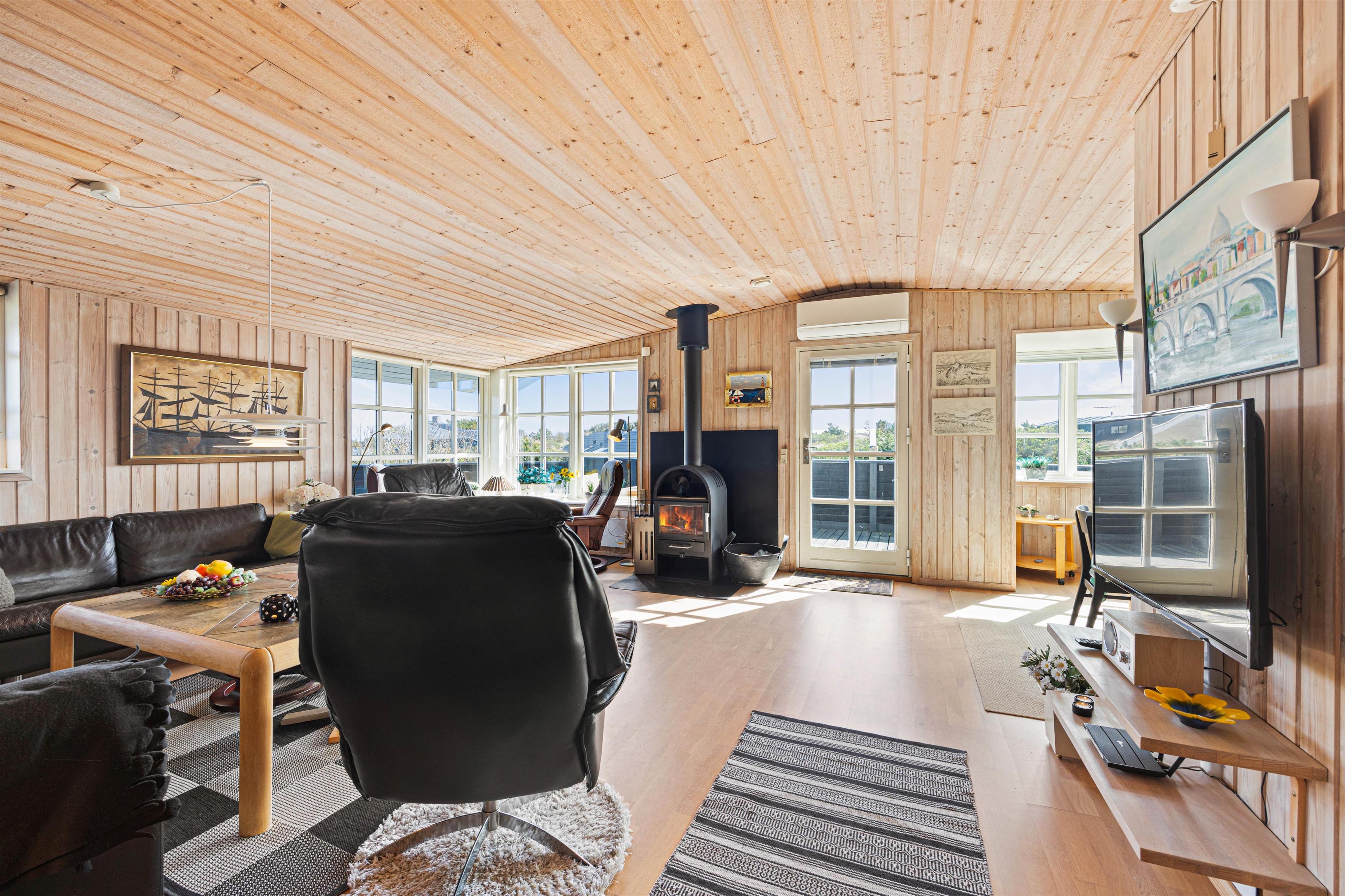 Feriehuset på 82 m2 er holdt i klassisk stil med naturlige træpaneler. Her er plads til seks feriegæster samt familiens firbenede ven. Planløsningen byder på tre værelser, et badeværelse med gulvvarme og adgang til lille sauna samt et åbent køkken, der sammen med stuen udgør et hyggeligt opholdsrum med brændeovn.