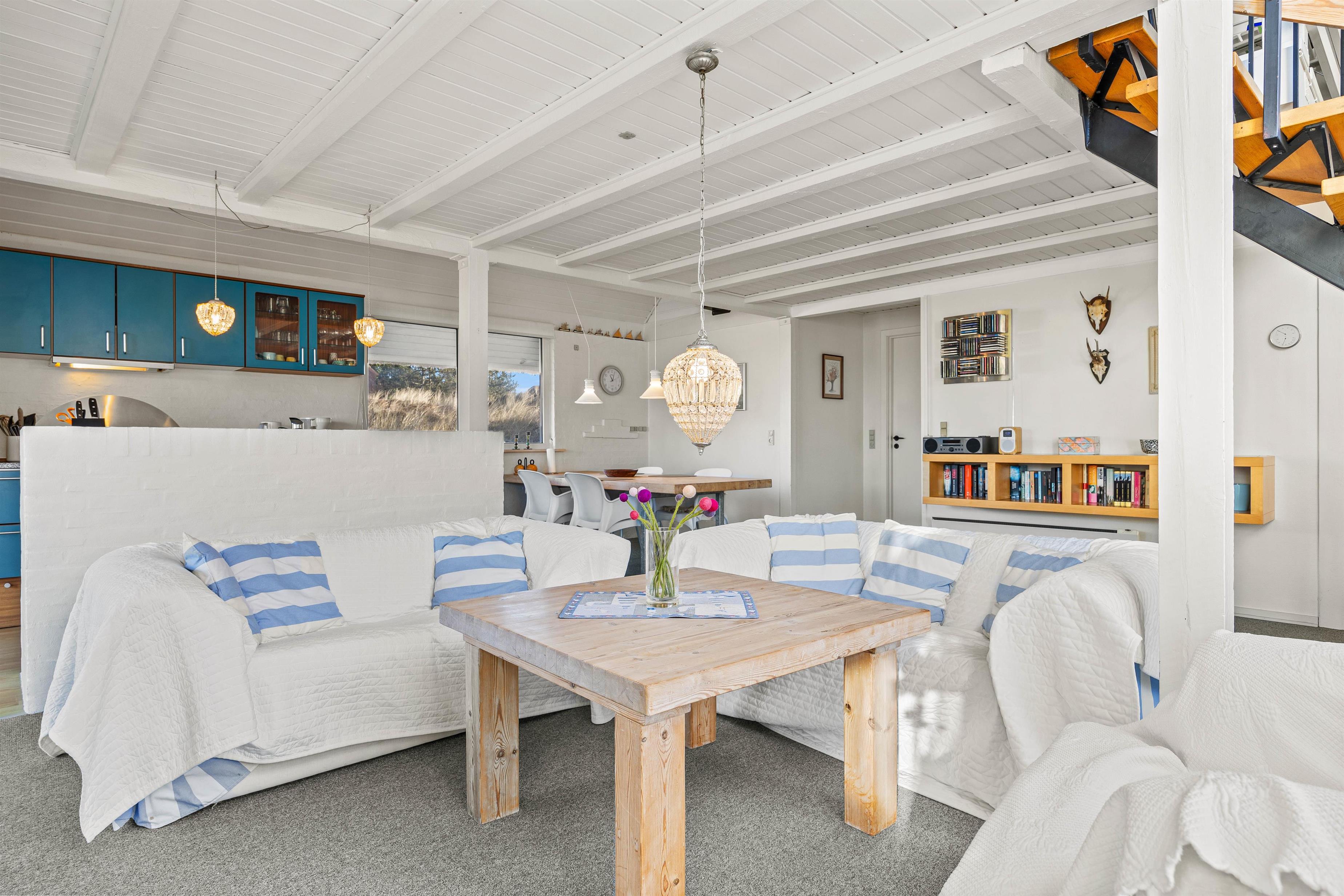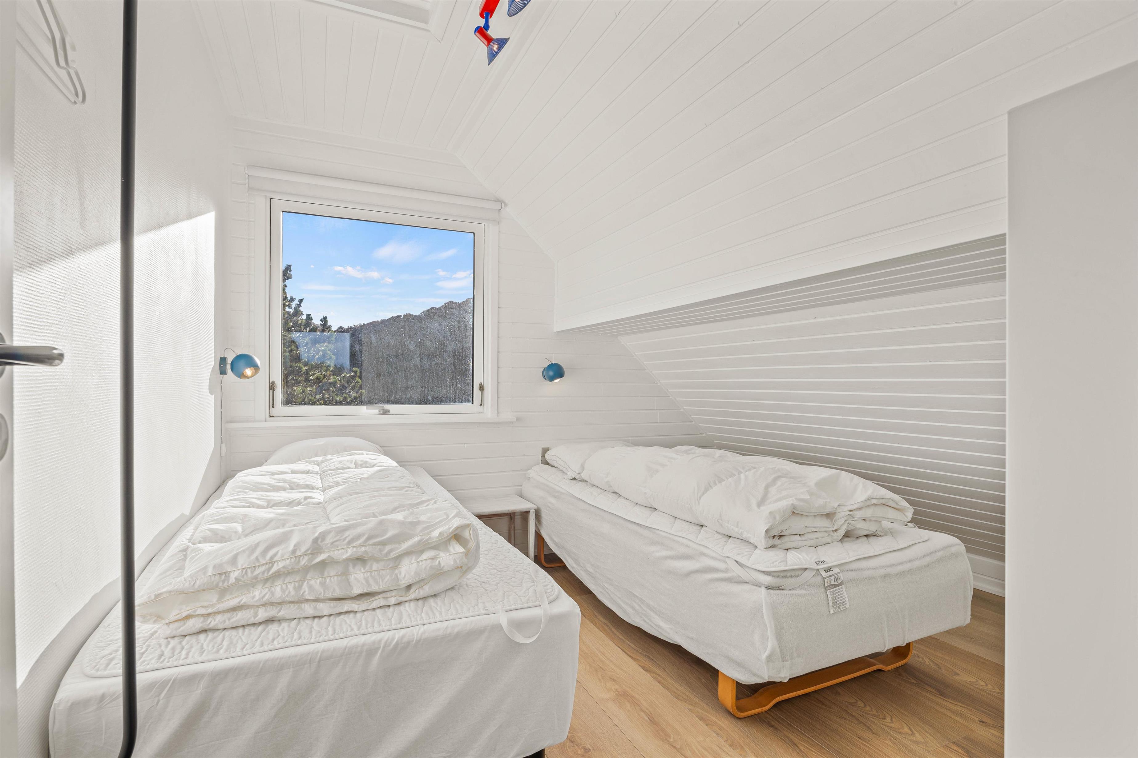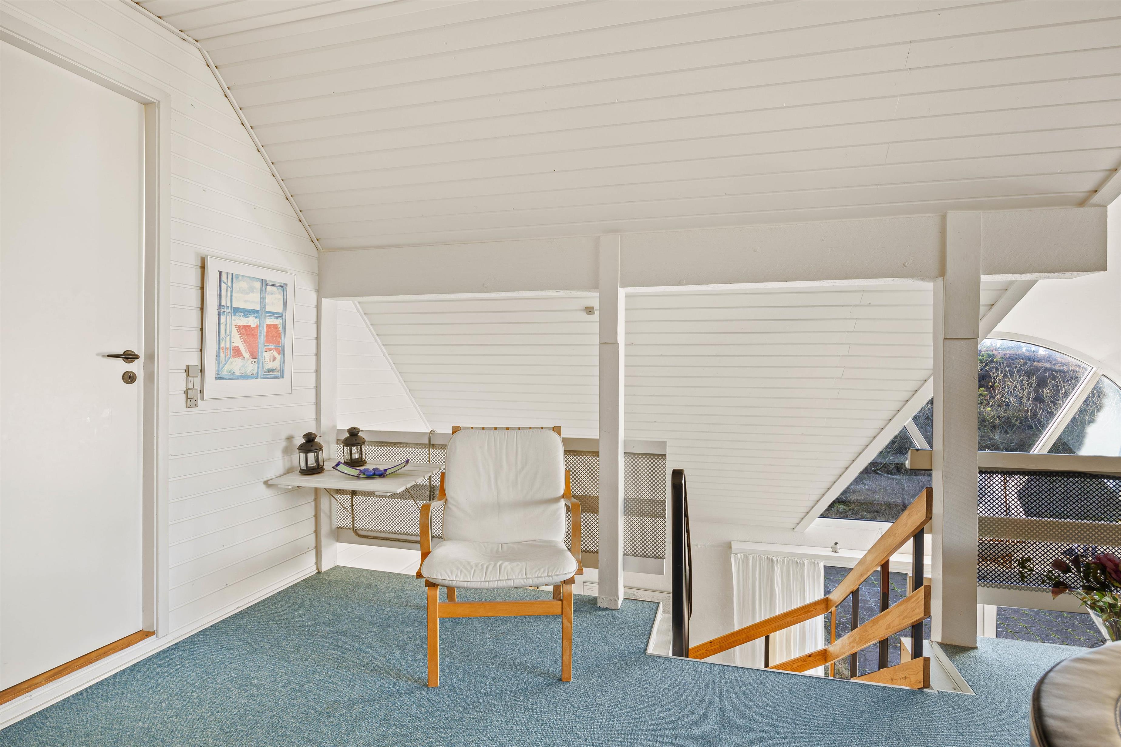 Fra stueetagen leder en trappe jer op til en hyggelig TV-stue – de flotte vinduer giver det flotteste lysindfald samt en skøn udsigt over klitterne herfra. Herfra kan I træde ud på sommerhusets balkon, hvorfra I også kan nyde den pragtfulde og enestående natur.