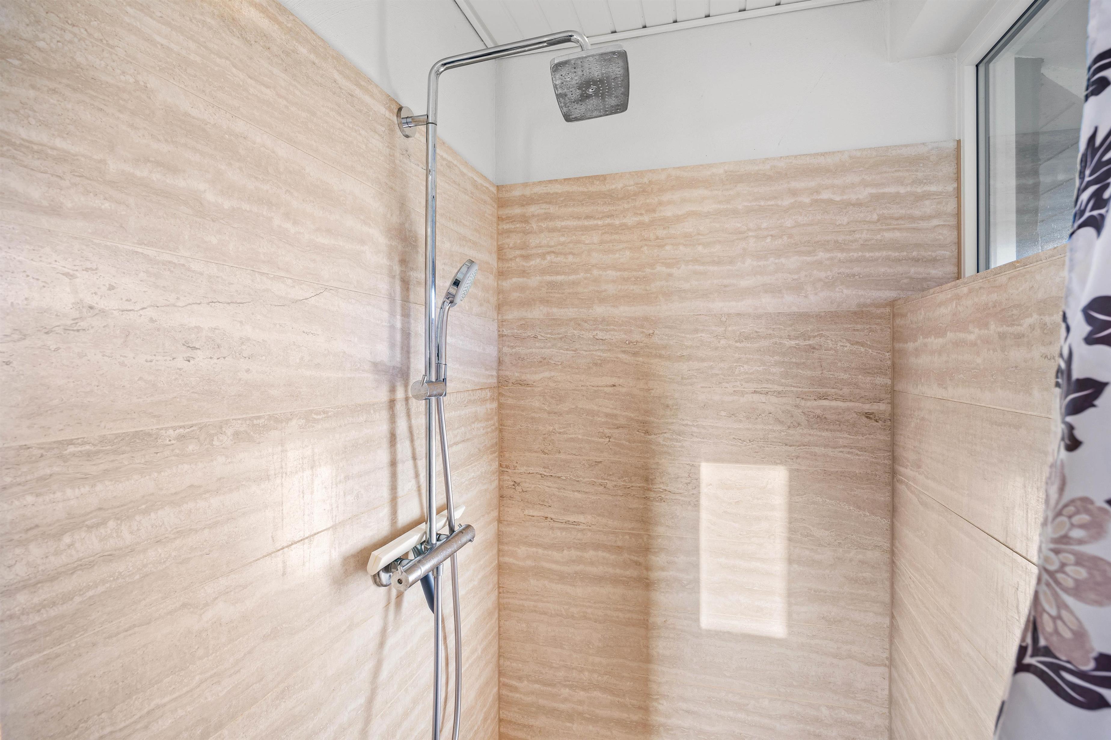 I det lyse badeværelse står både vaskemaskine og tørretumbler klar til at være behjælpelige med at få klaret jeres vasketøj.