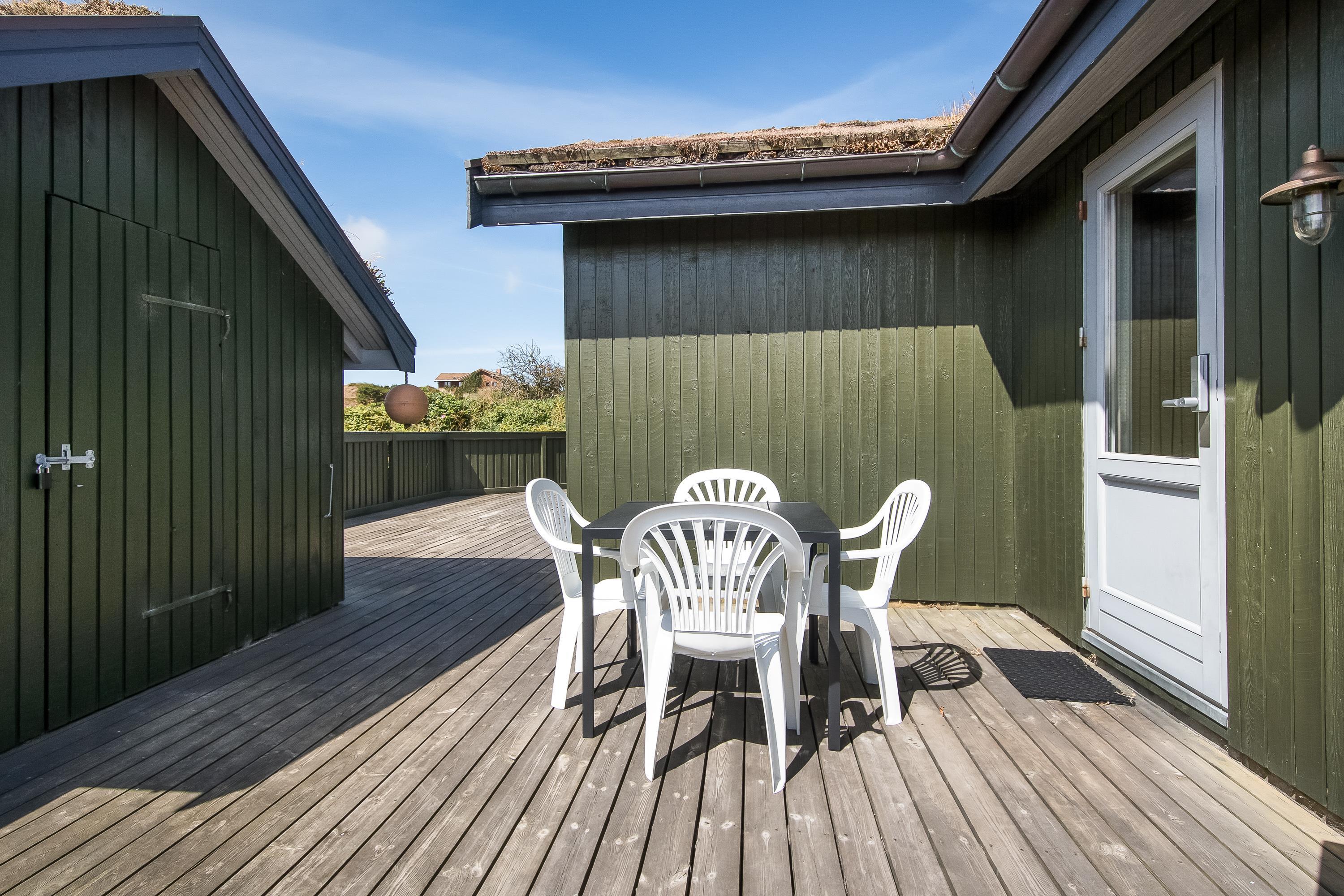 På Bellisvej 11 har I et dejligt stort lukket terrasseareal. Her er ikke kun læ og ugenerthed til lange dage med solslikkeri på liggestolen, men også ro og tryghed, da de mindste og hunden ikke kan smutte afsted op opdagelse. På terrassen finder I også en grill, så I kan holde en hyggelig grillaften under åben himmel i det lune vejr imens bølgerne bruser som let baggrundsmusik.