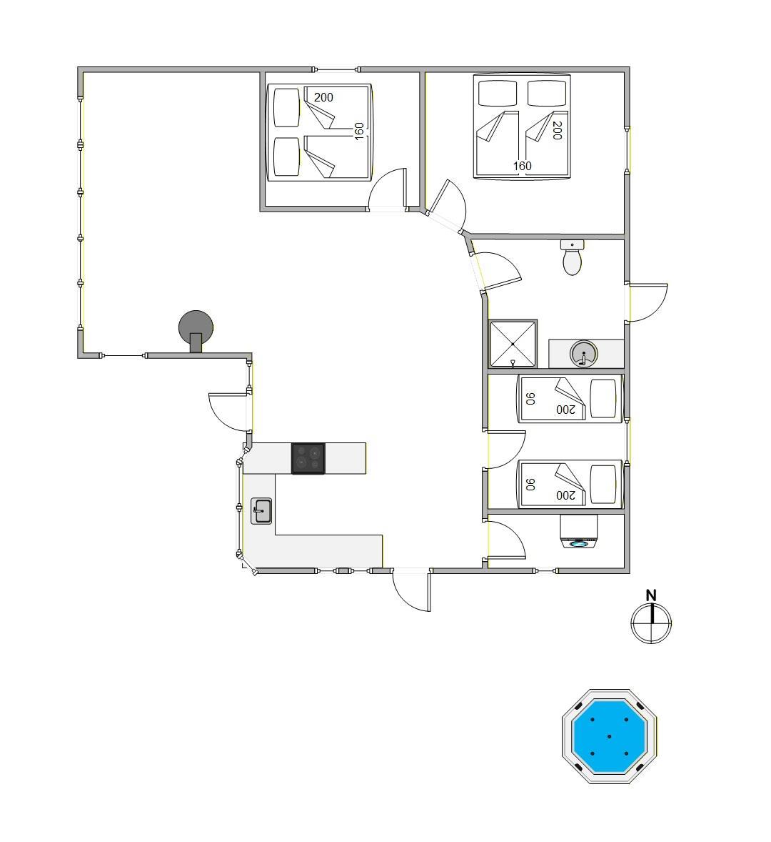 Der er 3 soveværelser i sommerhuset, som fordeler sig med 2 dobbeltsenge og 2 enkeltsenge. Det gør sommerhuset oplagt til både familier og venner, der rejser sammen. Værelserne giver jer gode muligheder for at finde ro og hvile efter en dag med oplevelser.