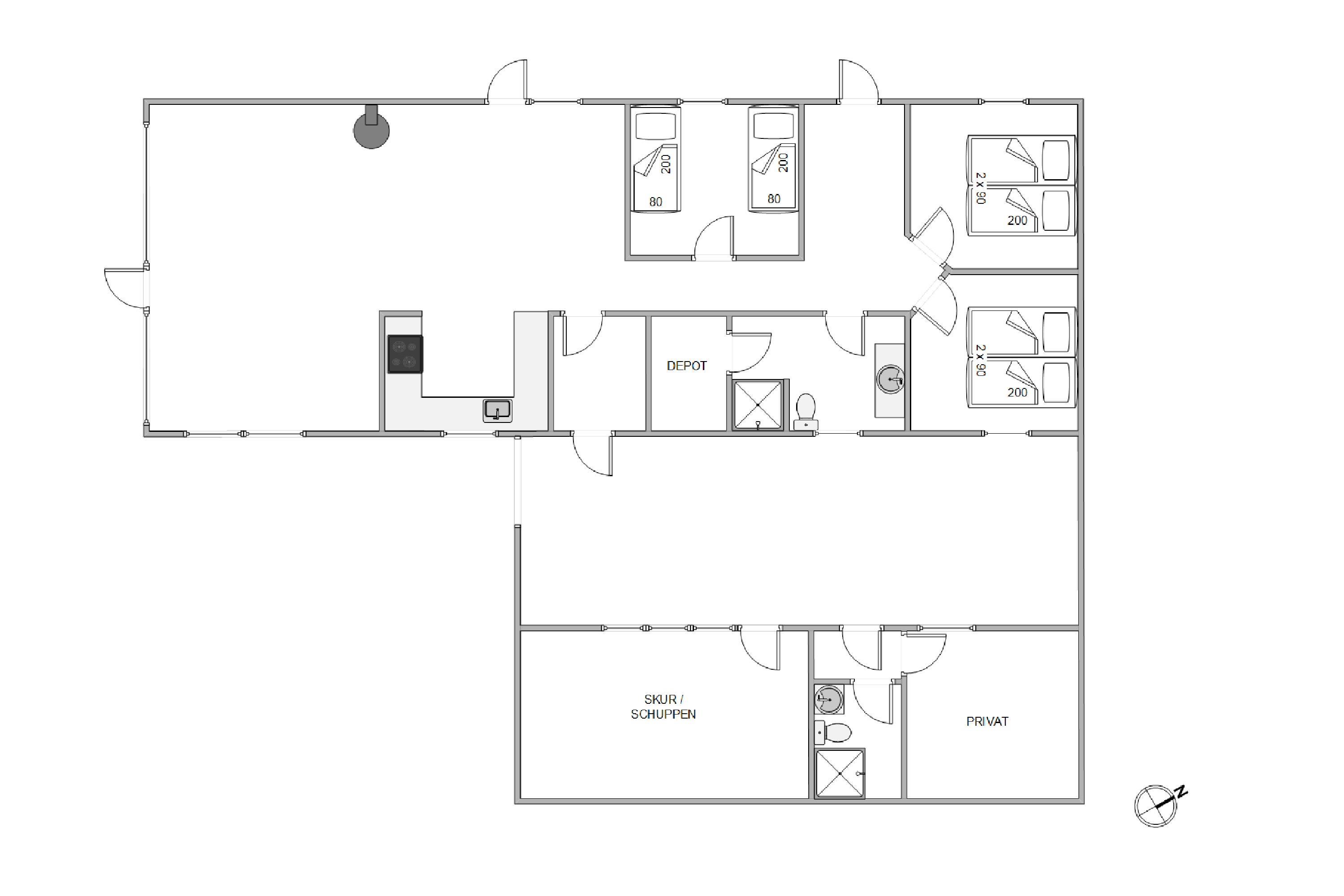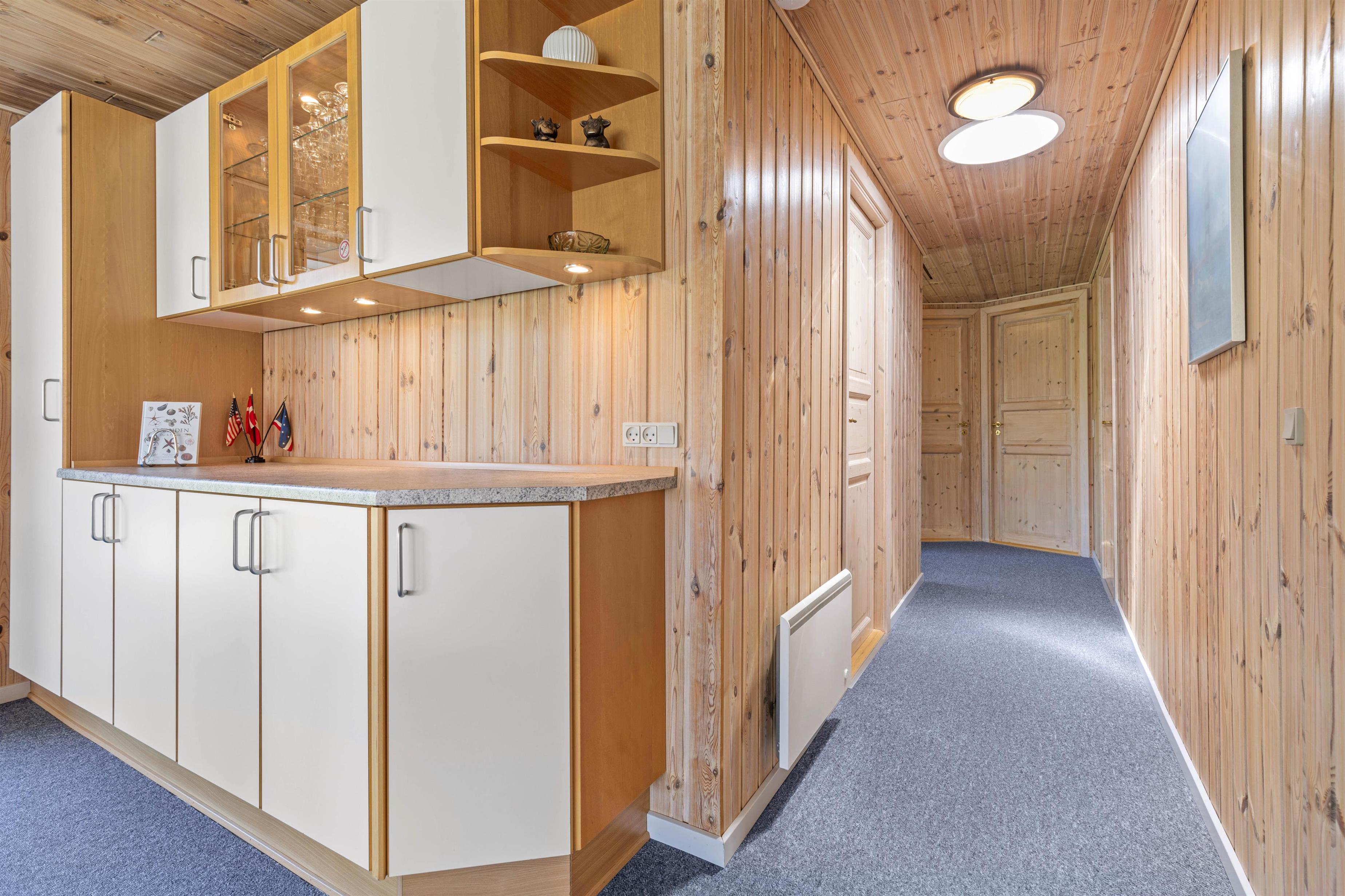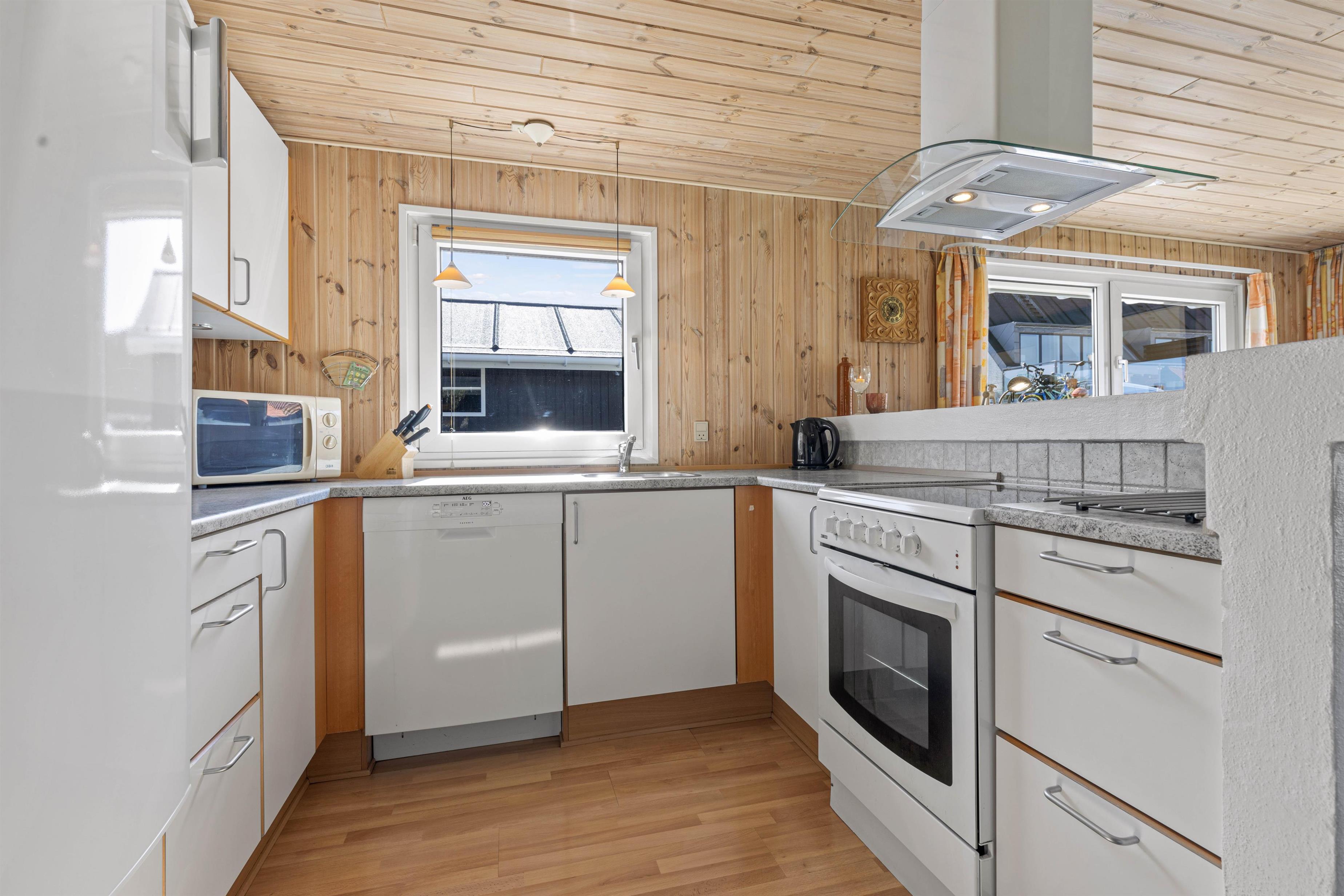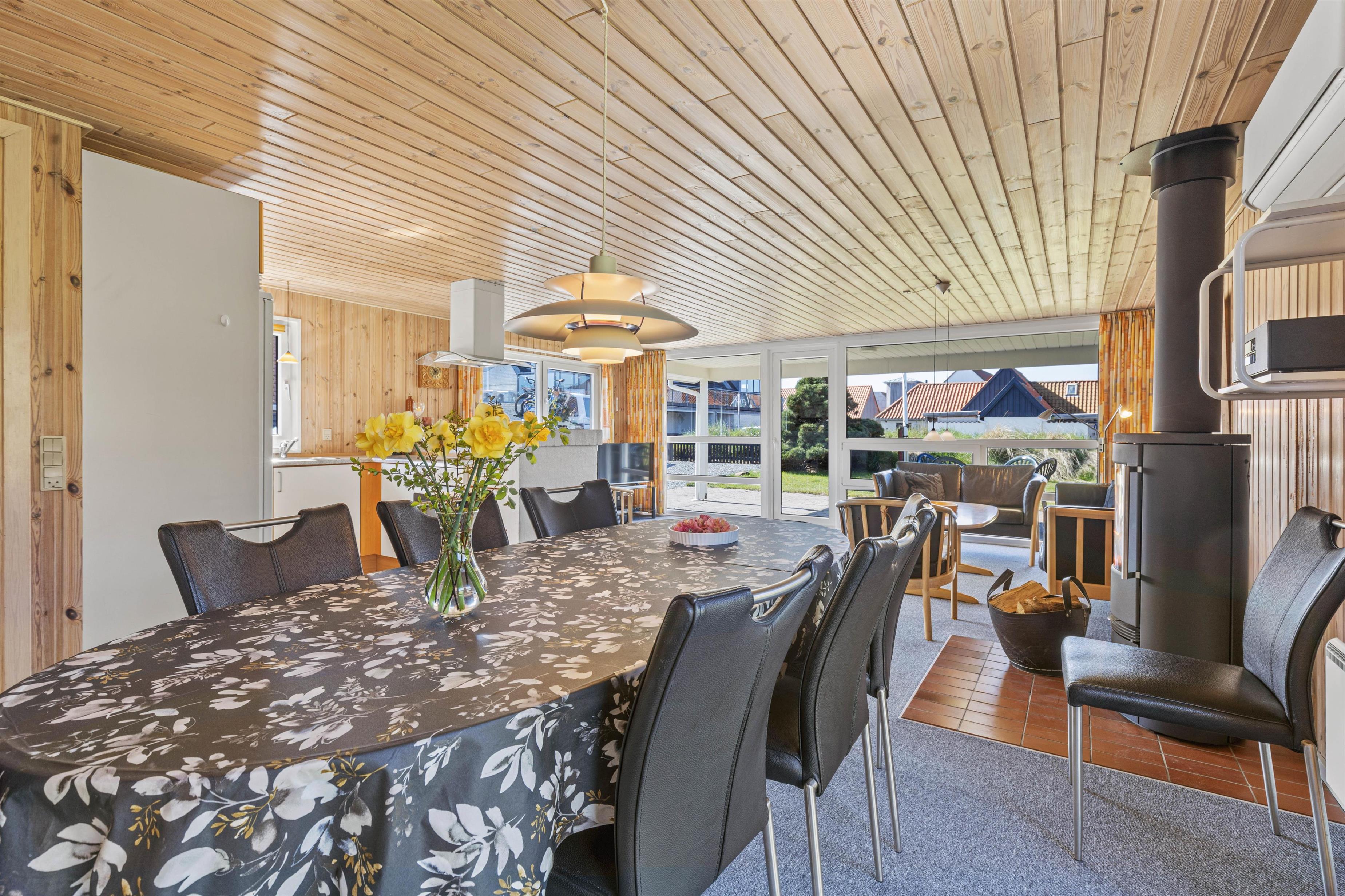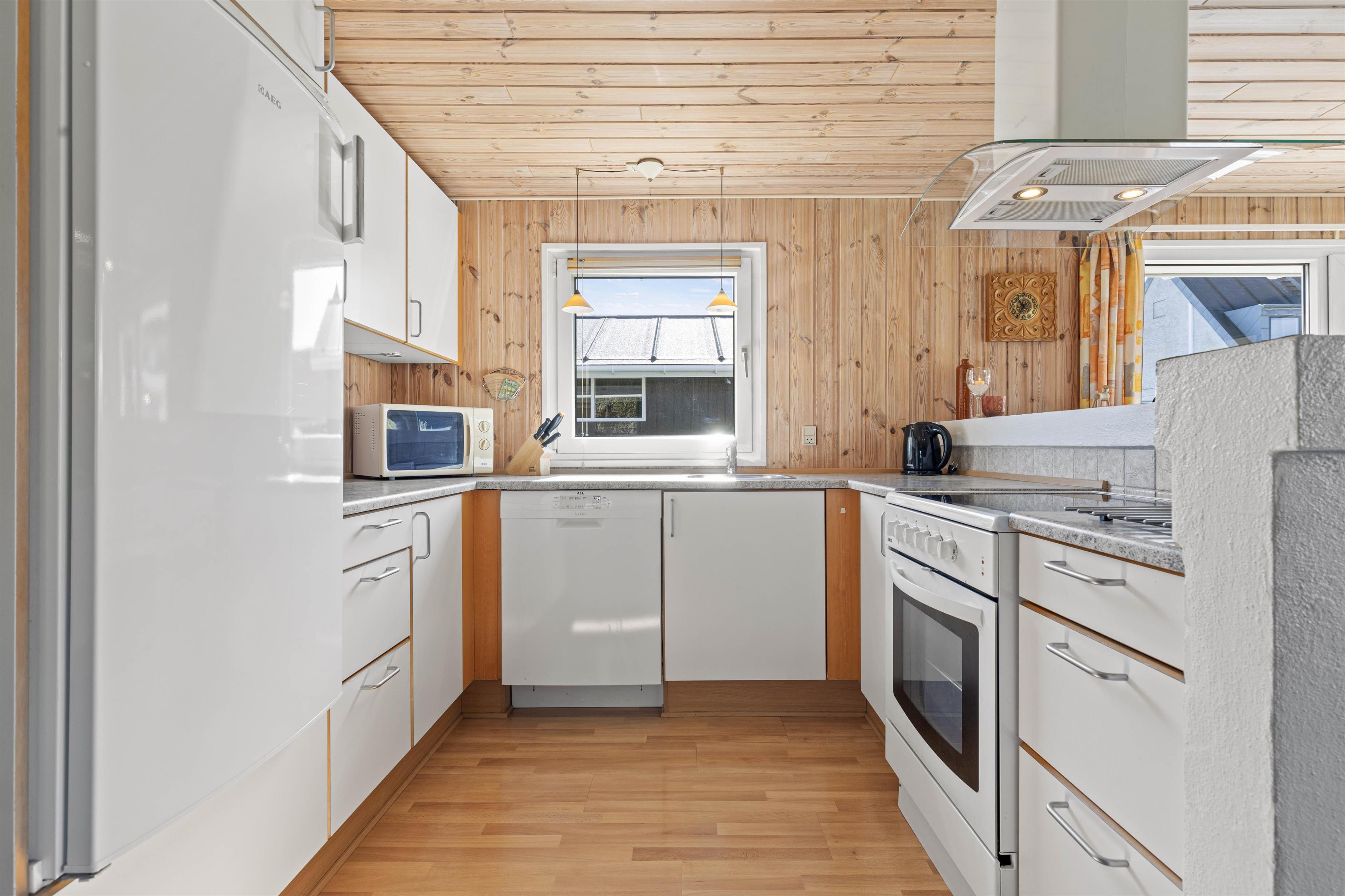 Så snart I træder ind ad døren, vil I blive budt varmt velkommen i de lyse omgivelser, der emmer af klassisk sommerhusstil. Det store kombinerede køkken- og stuerum er sommerhusets hjerte, og her er der lagt op til masser af hyggelige feriestunder. Tilbered lækre måltider i det veludstyrede køkken, og tilbring de sene aftener foran den knitrende brændeovn.