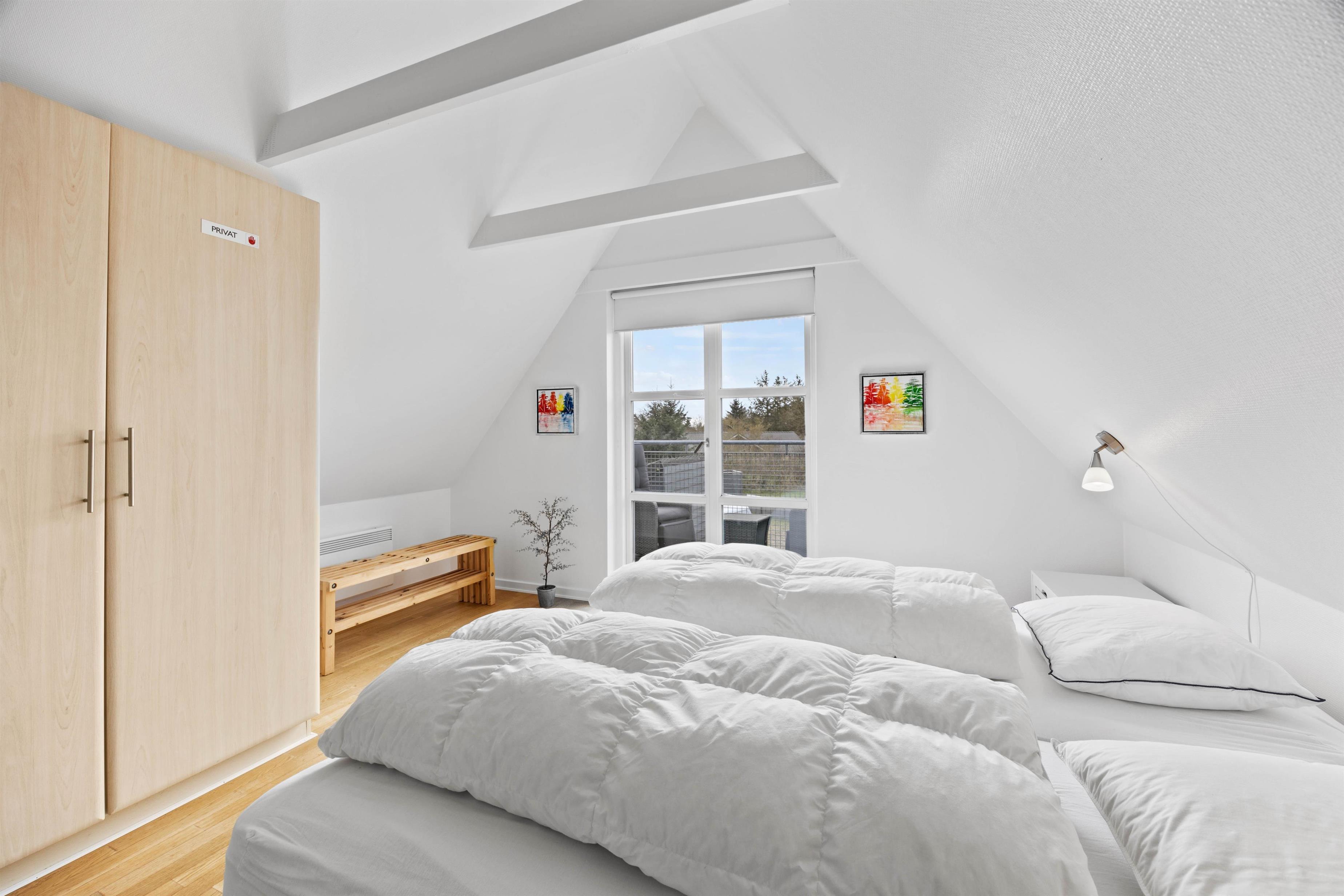 Når timerne bliver sene, vil I oppe af trappen på sommerhusets første sal finde lejlighedens to rummelige soverum samt et fint lille toilet. Ligefrem i trappeopgangen vil I blive mødt at en skabsvæg, hvor I har mulighed for at gemme tasker og pakkenelliker væk. På venstre hånd finder I det første soveværelse, som er lyst og venligt indrettet med to enkeltsenge. På højre side finder I det andet værelse med en dobbeltseng, 180x200, og mere skabsplads – fra dette værelse er der også adgang til en skøn altan ud i nordvest.
