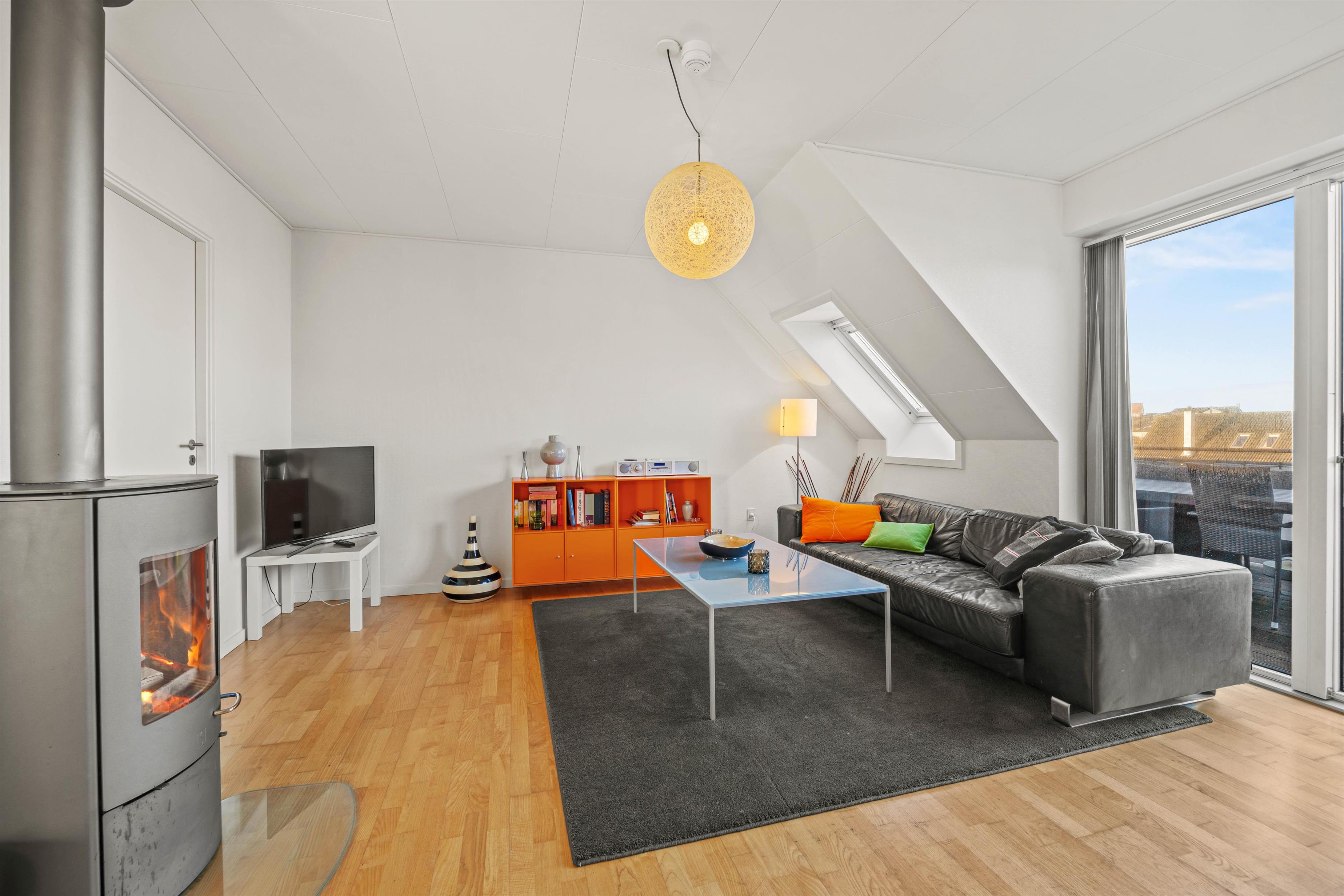 På første sal finder du en hyggelig og smagfuldt indrettet stue med brændeovn. Herfra er der udgang til en vestvendt balkon, som især er skøn at opholde sig på om aftenen, hvor du kan få fuld glæde af dagens sidste solskinstimer, mens du nyder den skønne udsigt over området, måske med et godt glas vin i hånden.