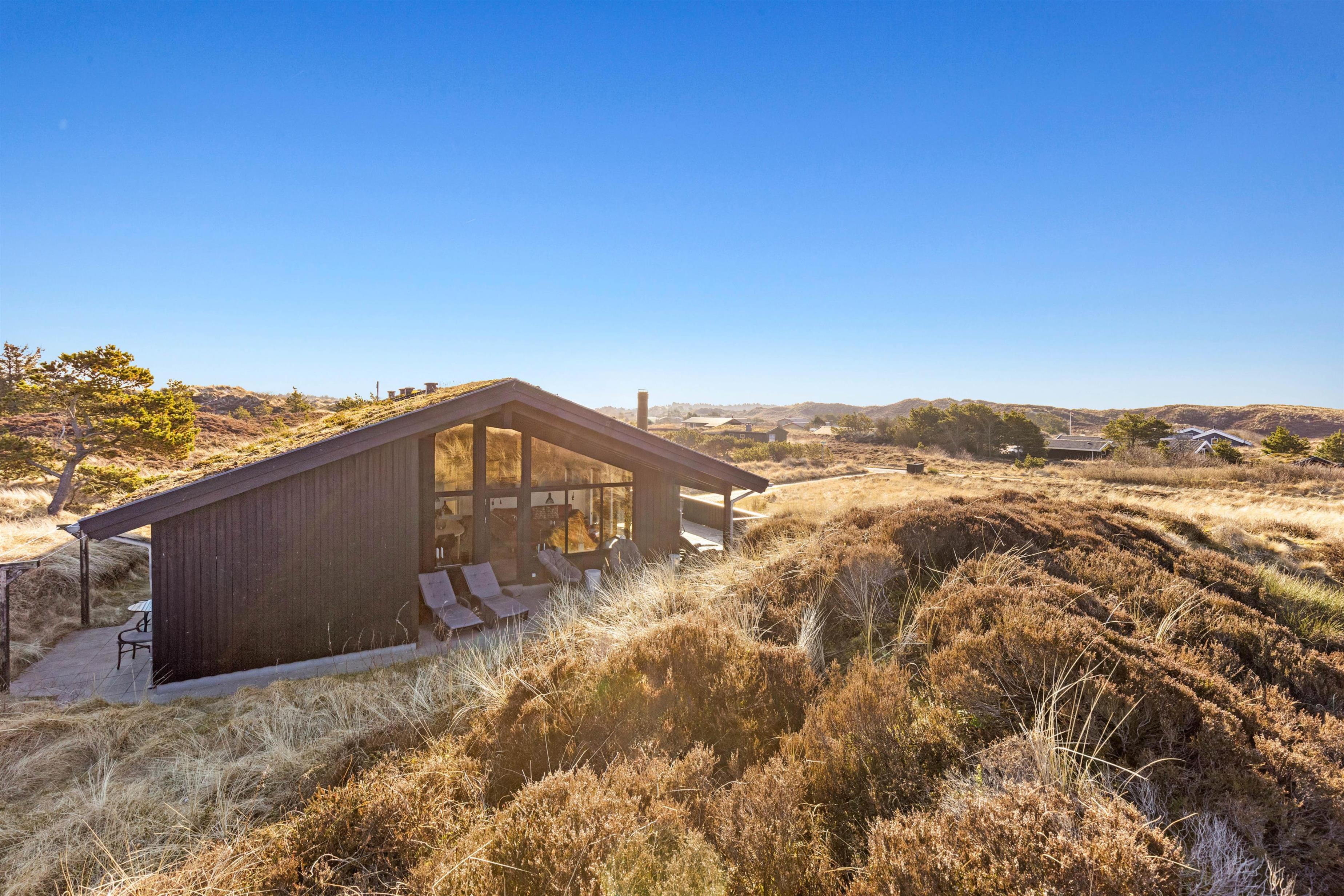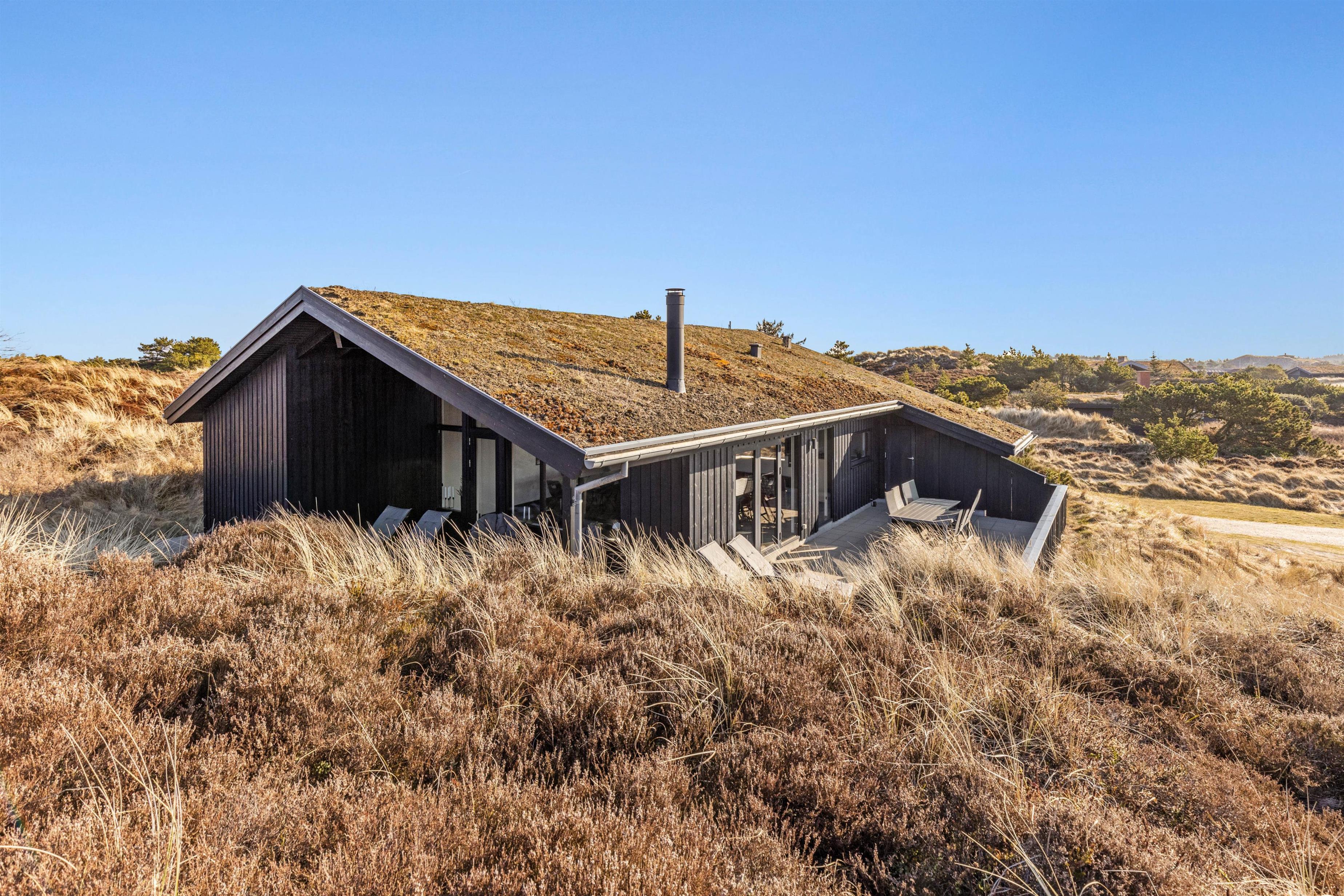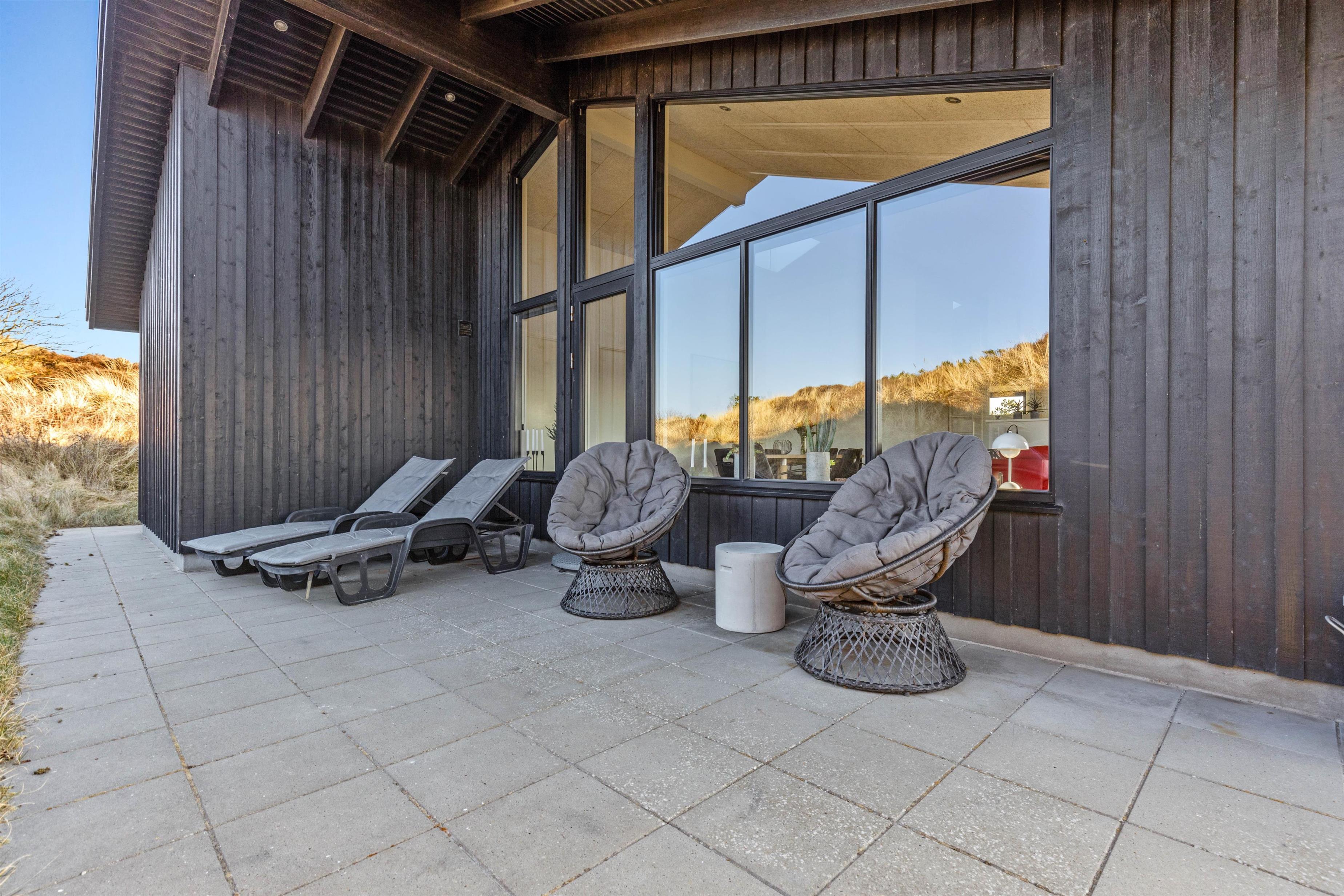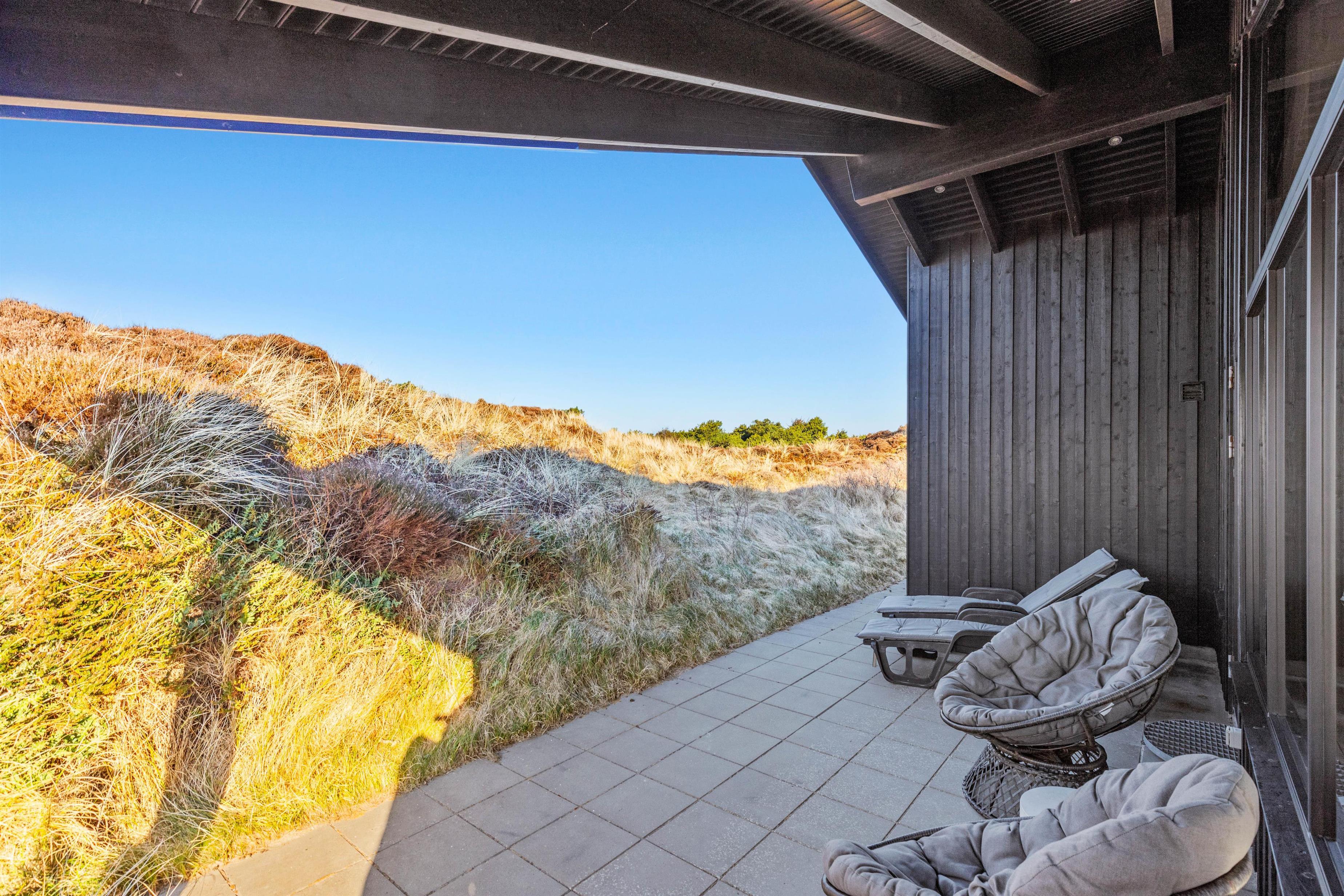 Udendørslivet kan I nyde på en af de 3 ugenerte terrasser, hvor der altid er mulighed for at finde en plads i læ. Den åbne terrasse er perfekt til solbadning, mens den overdækkede tilbyder skygge på de solrige dage. En afskærmet terrasse sikrer et privat rum til hyggelige grillaftener, og her er naturligvis både havemøbler og en grill til rådighed. Sommerhusets beliggenhed i klitterne sørger for et smukt udsigt over de nærmeste omgivelser.