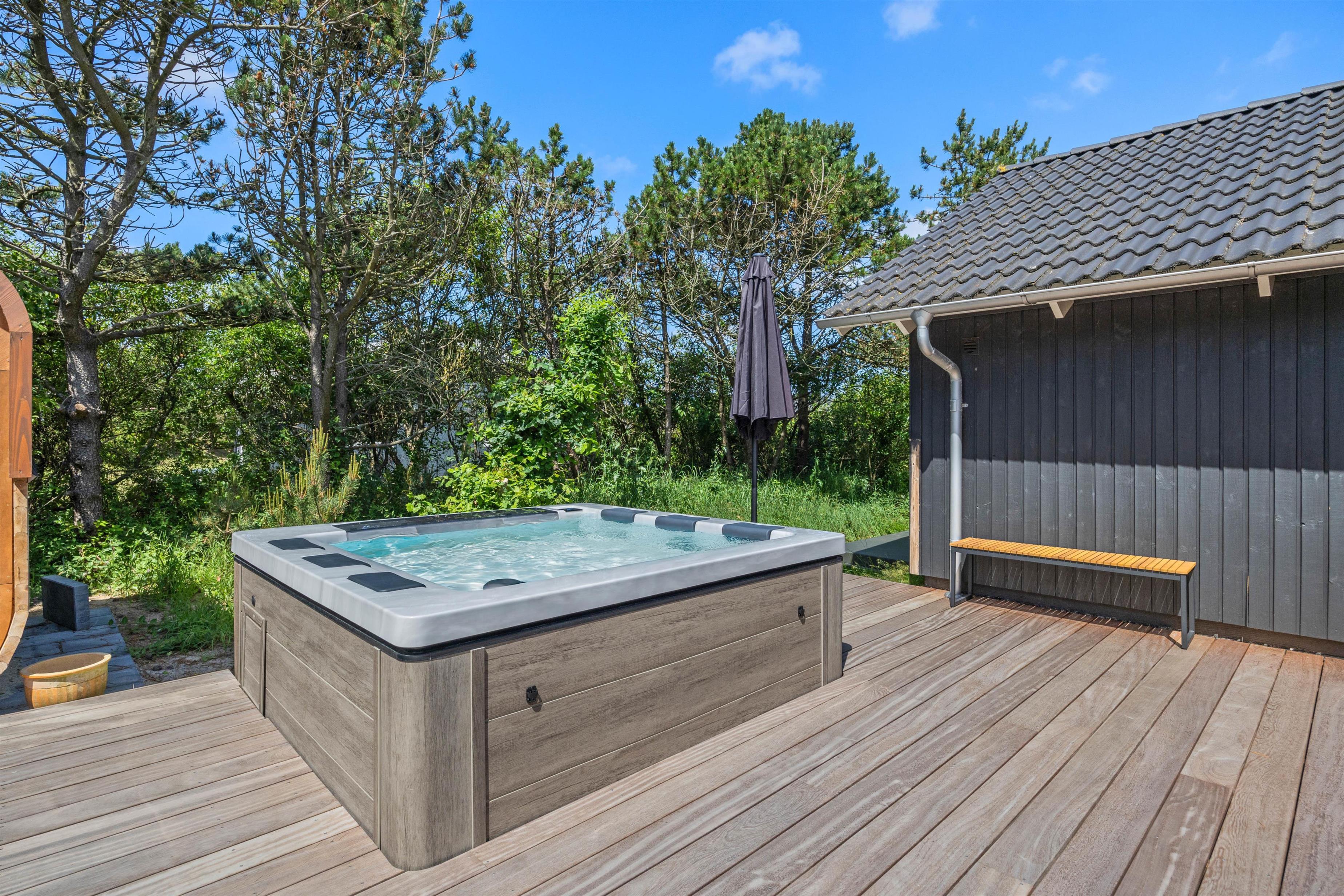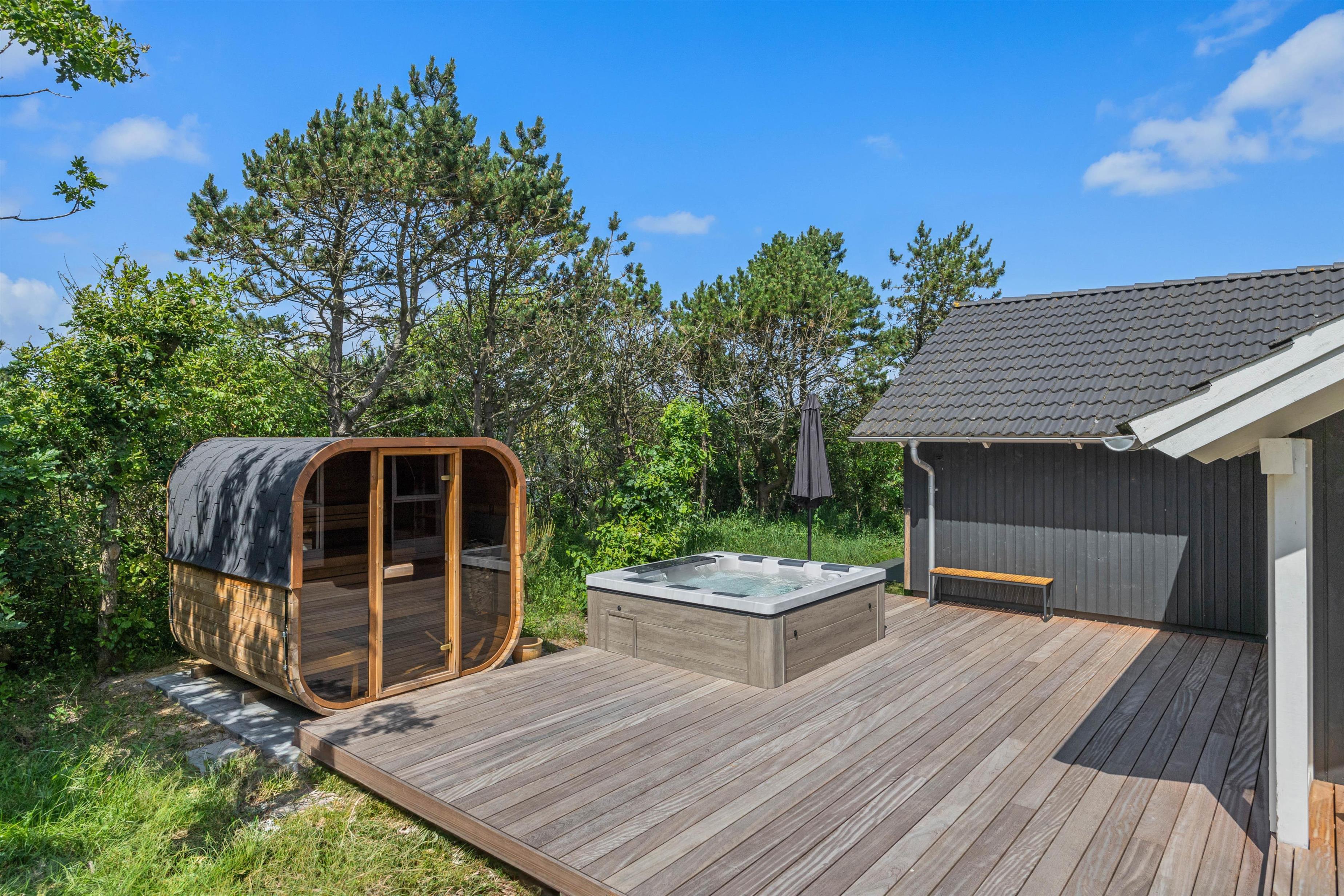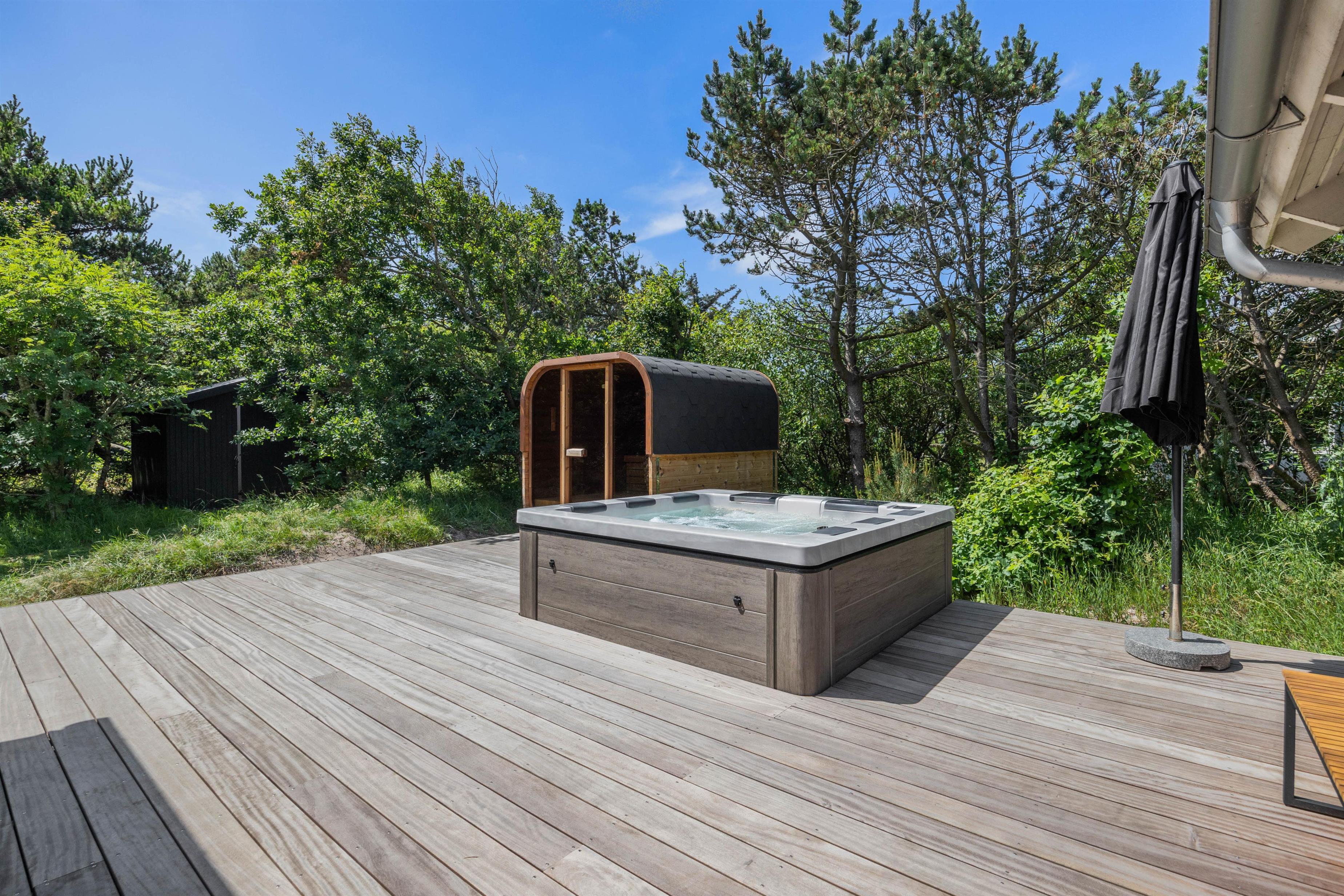 Godt afskærmet af træer og buske vil I på din store plænegrund kunne nyde afslappende feriedage - med både sandkasse og et legestativ med gynge er der rigeligt plads for også de mindste at boltre sig på. I kan også nyde en skøn udesauna, udespa og udebruser ved dette sommerhus.