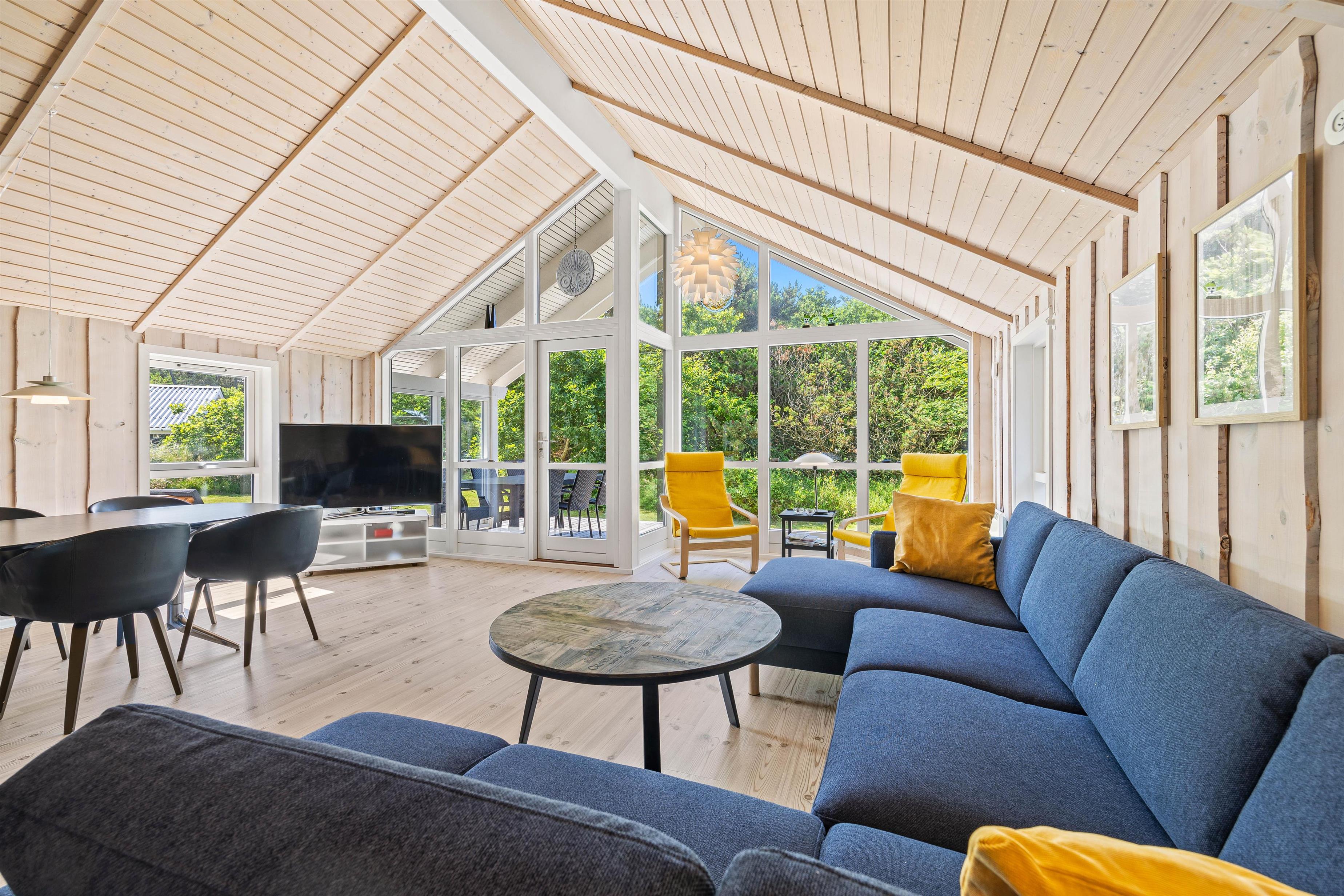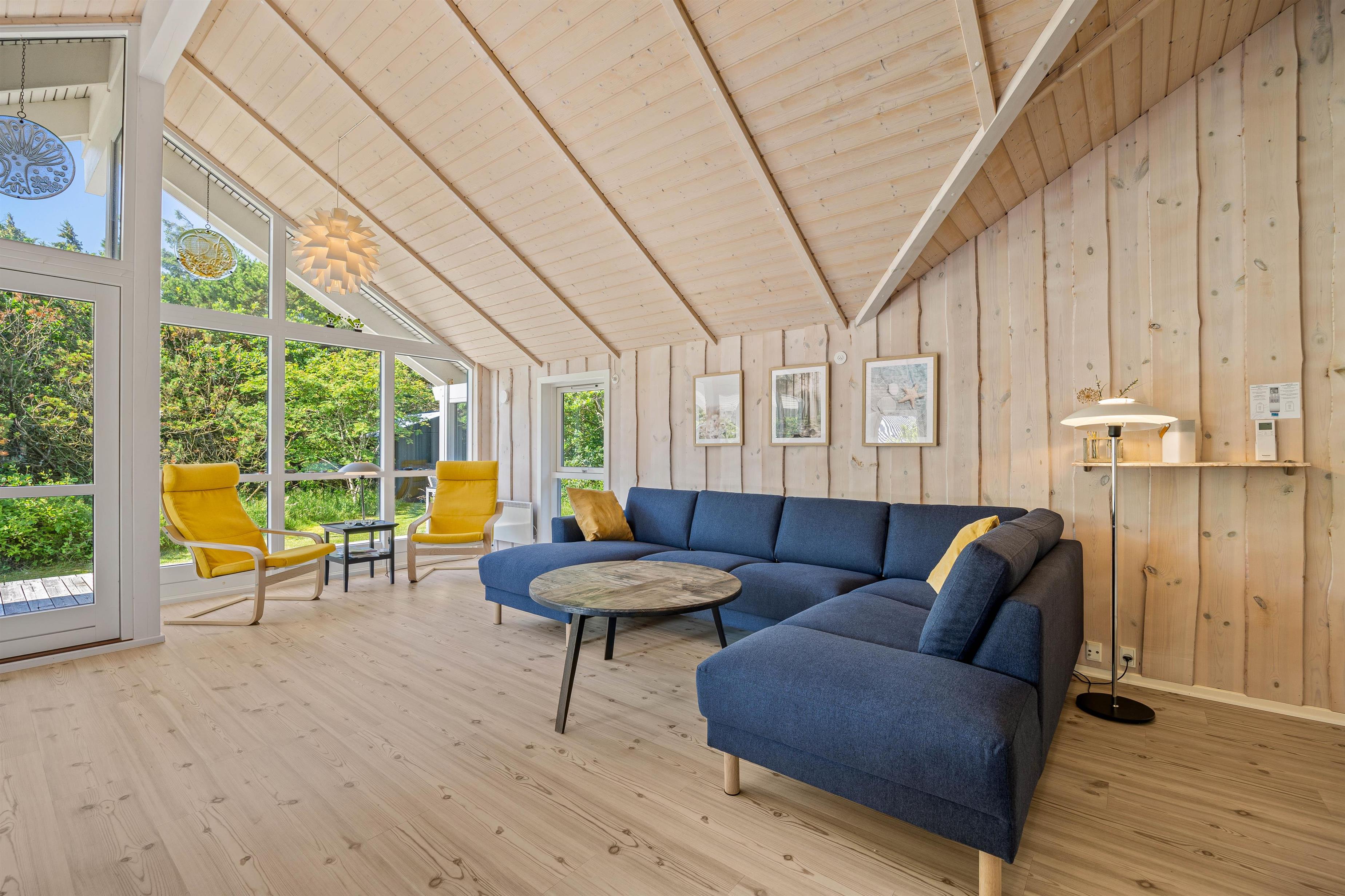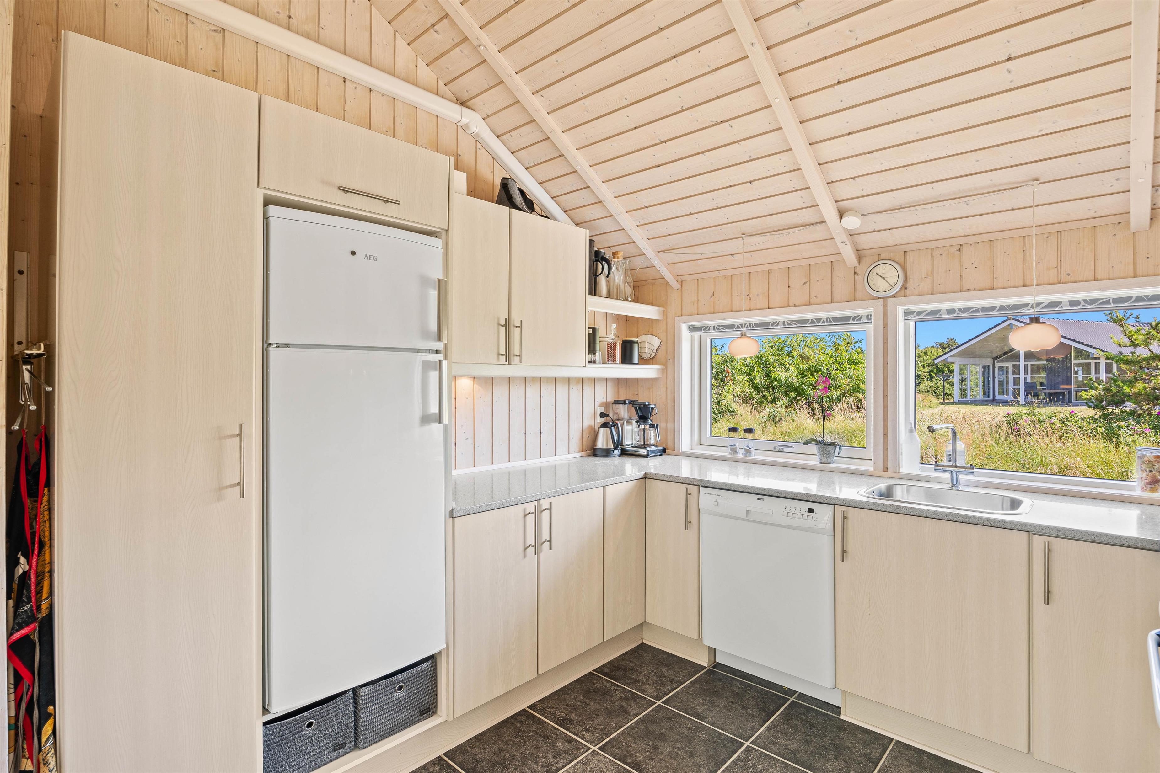 Indendørs møder I et lyst, rummeligt og velmøbleret sommerhus. Med et lyst loft til kip, strømmer der det skønneste lysindfald fra de store vinduer ud i sommerhuset. De mange vinduer giver også rig mulighed for at kigge ud på den enestående natur, som omgiver dette sommerhus. Det veludstyrede køkken ligger i forlængelsen af spisestuen, med både mikroovn og opvaskemaskine. Vaskemaskinen og tørretumbler i entreen er jer behjælpelige med de praktiske opgaver omkring tøjvask, så I vil have endnu mere tid til at slappe af og holde ferie.