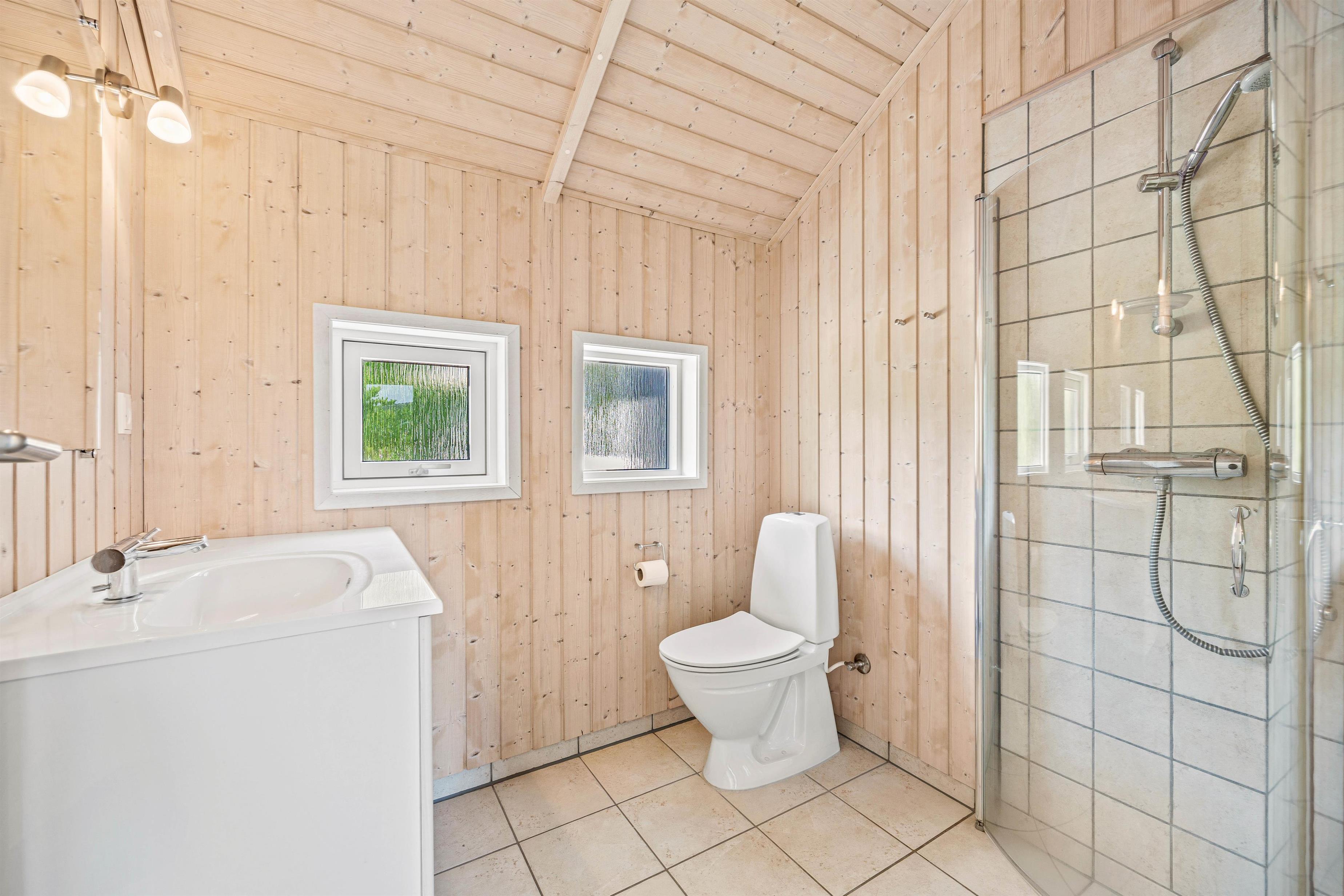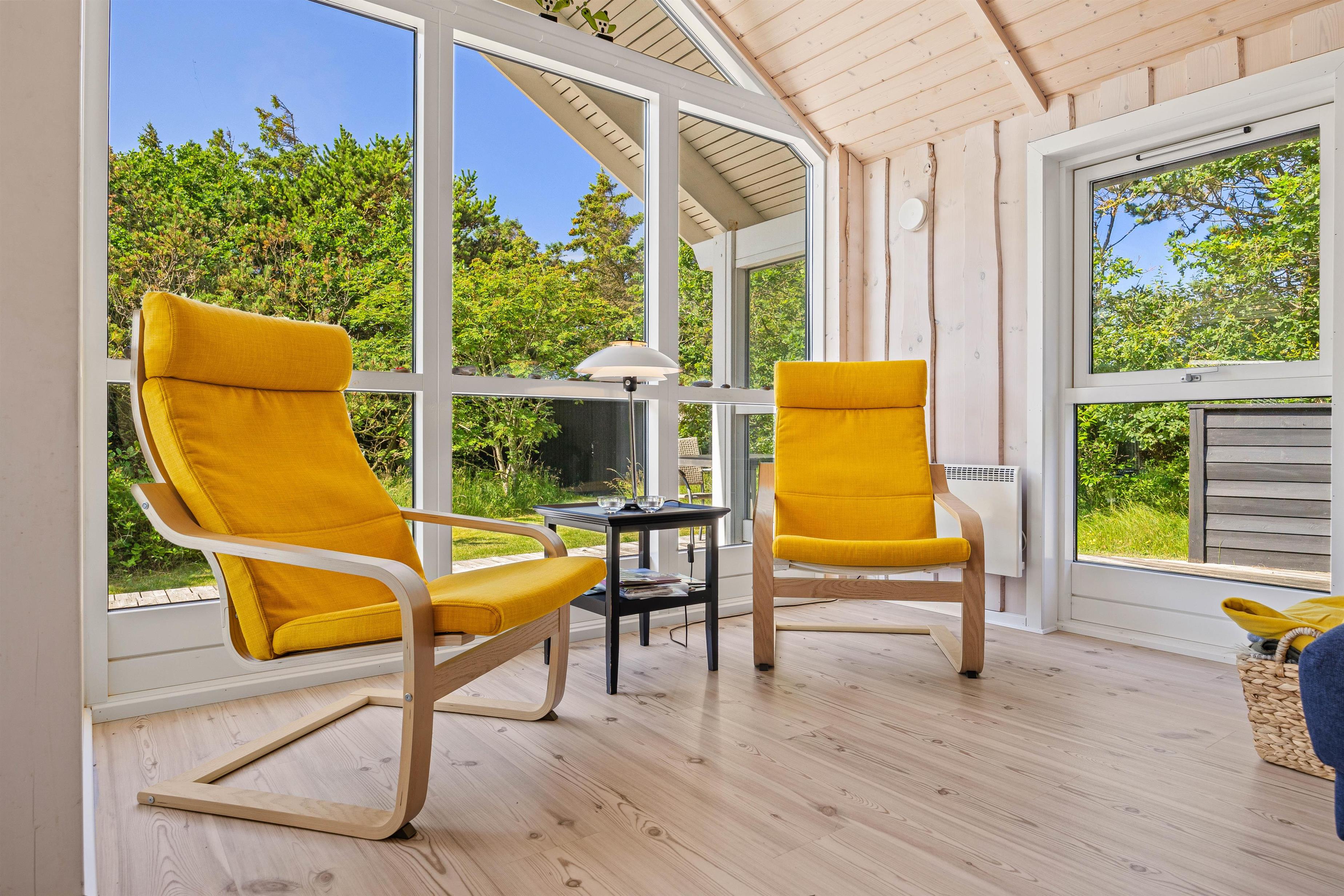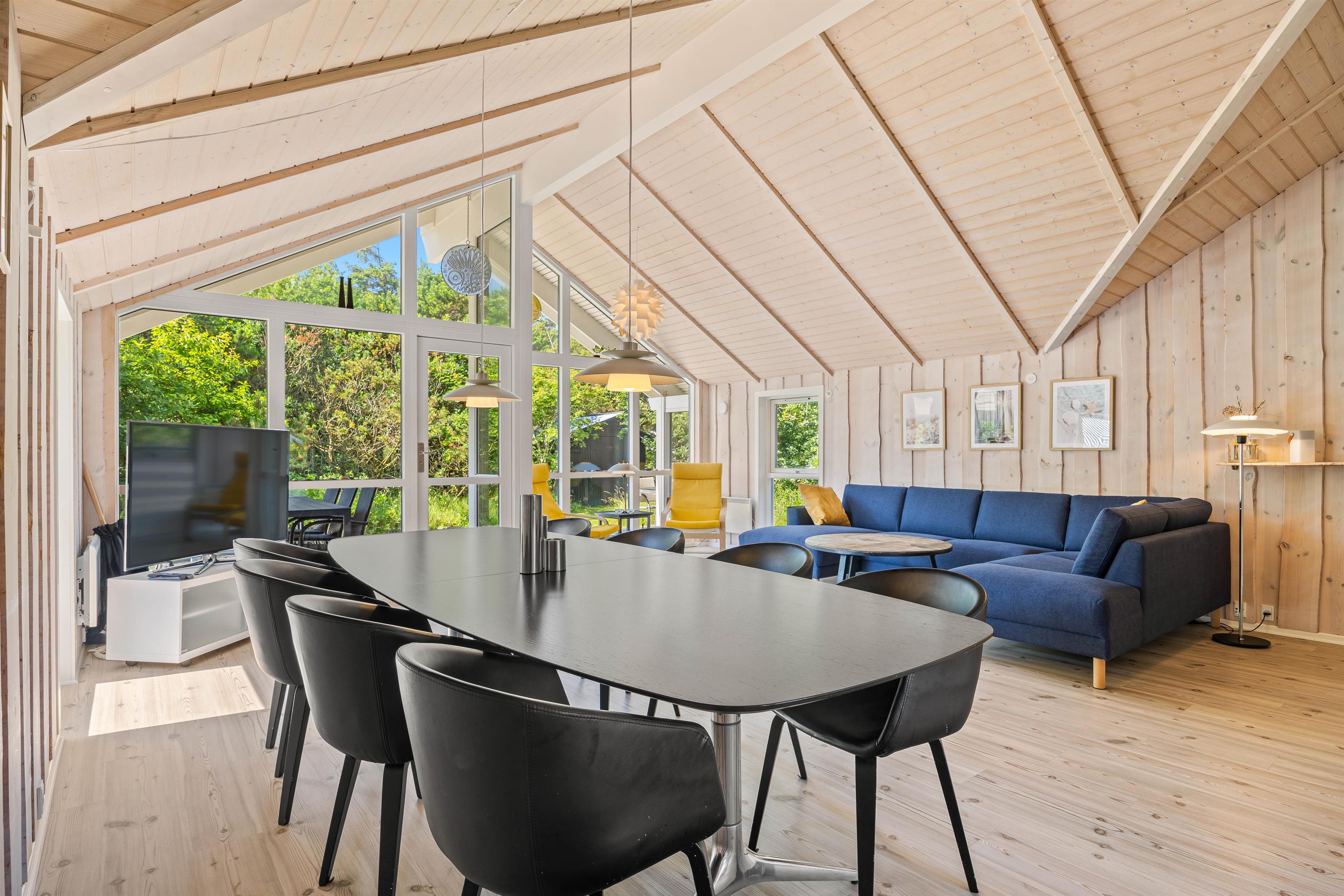 Indendørs møder I et lyst, rummeligt og velmøbleret sommerhus. Med et lyst loft til kip, strømmer der det skønneste lysindfald fra de store vinduer ud i sommerhuset. De mange vinduer giver også rig mulighed for at kigge ud på den enestående natur, som omgiver dette sommerhus. Det veludstyrede køkken ligger i forlængelsen af spisestuen, med både mikroovn og opvaskemaskine. Vaskemaskinen og tørretumbler i entreen er jer behjælpelige med de praktiske opgaver omkring tøjvask, så I vil have endnu mere tid til at slappe af og holde ferie.