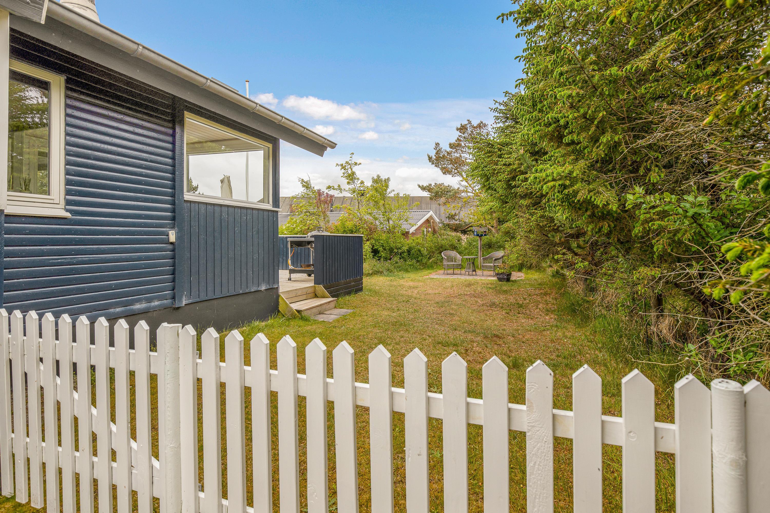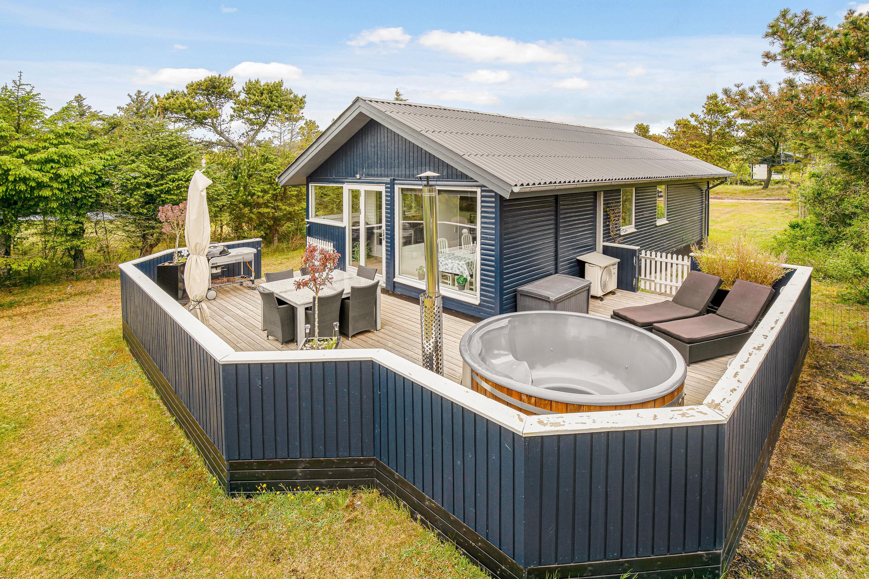 På den store, lukkede terrasse i baghaven finder I gode muligheder for at nyde vejret udenfor. Sommerhuset har grill, havemøbler, solvogne og parasol, så her kan I opholde jer og tilberede de lækreste feriemåltider på grillen. Her finder I også vildmarksbadet, så når mørket falder på, kan I sætte jer til rette i det det store kar og bare slappe af mens I nyder varmen.