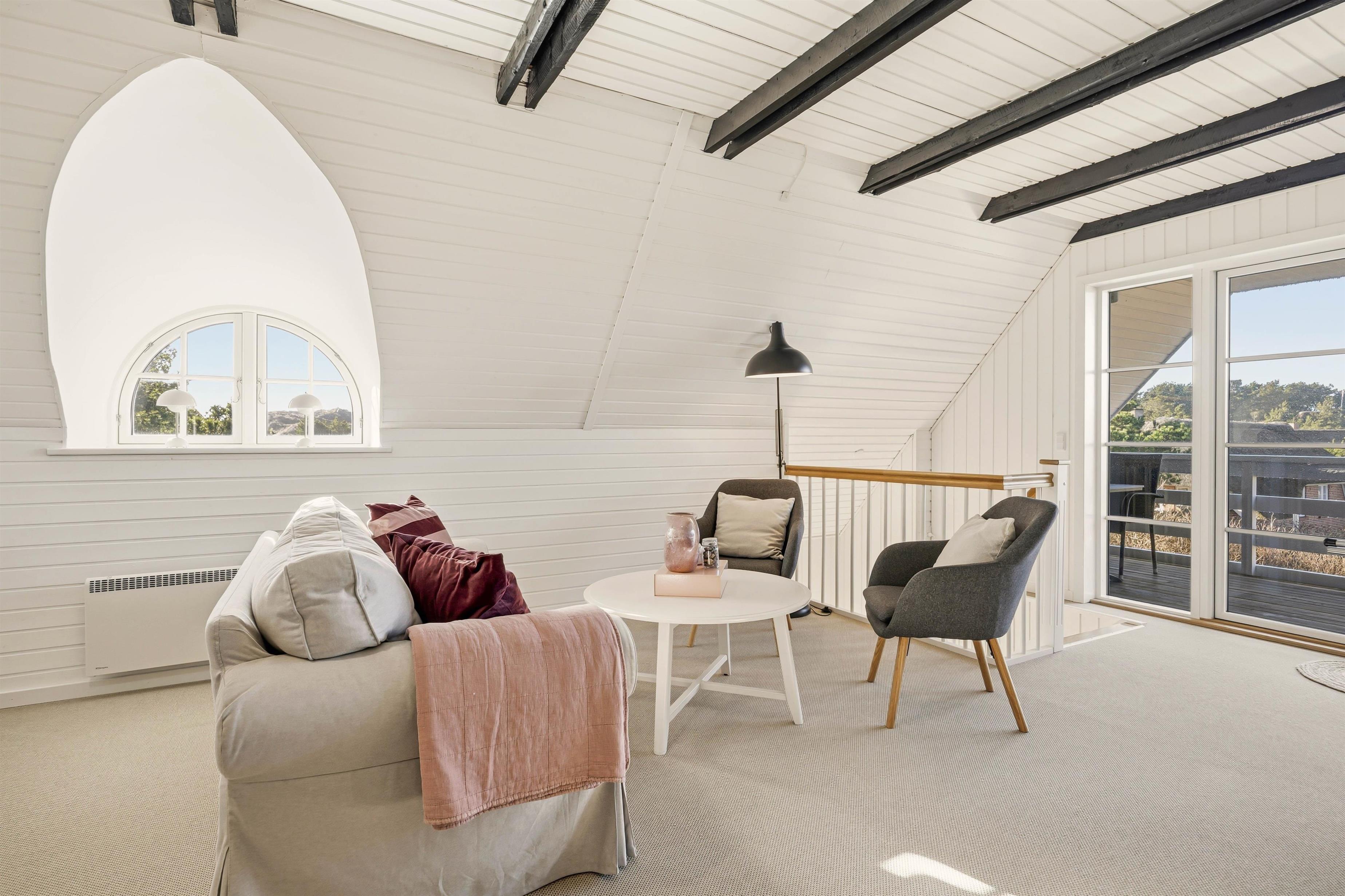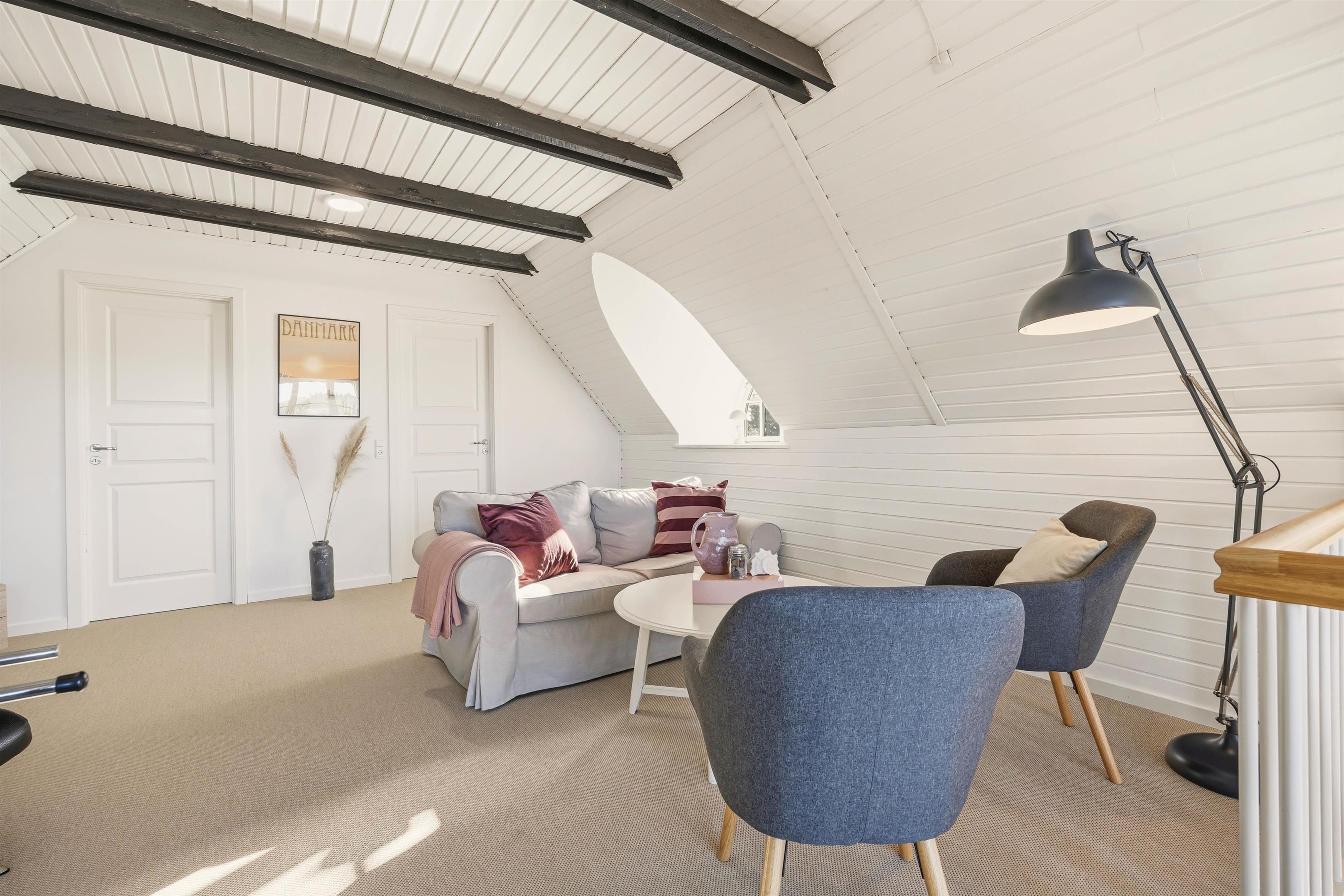 Familien kan fordele sig på to etager. På første sal ligger to soverum og et opholdsrum med tv og bordfodbold– samt en dejlig sydvendt balkon med udsigt over området.