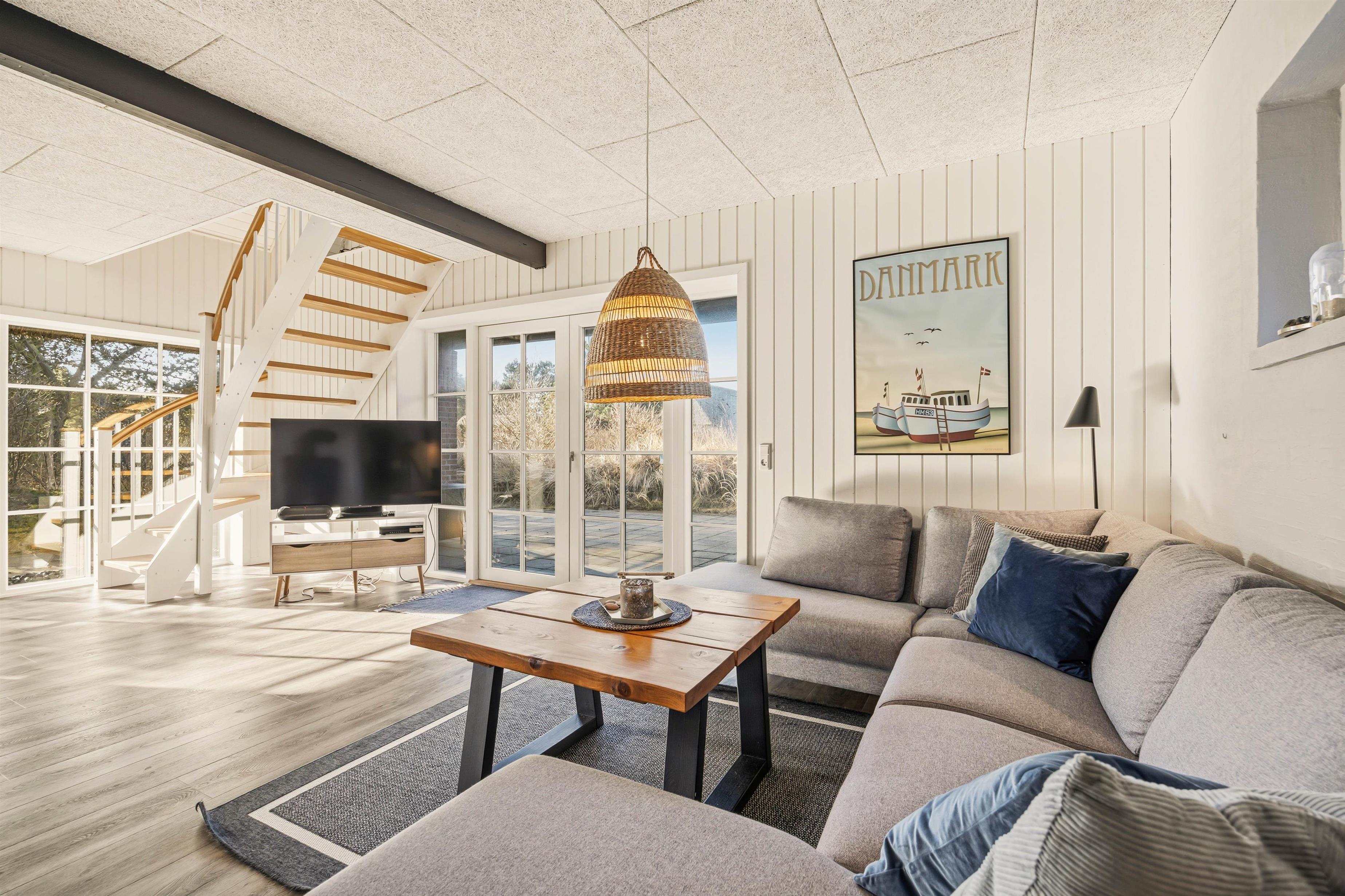 Imens syvsoverne nyder ferieroen på første sal, kan dagen begynde i stueetagen, hvor både køkken og bad samt et stort soverum befinder sig. Det store fællesrum med åbent køkken og opholdsstue med brændeovnen er det oplagte samlingssted for familiehyggetid.