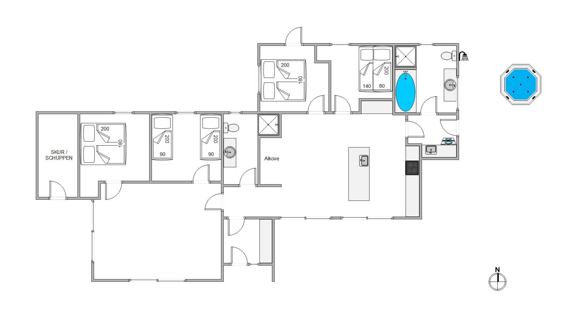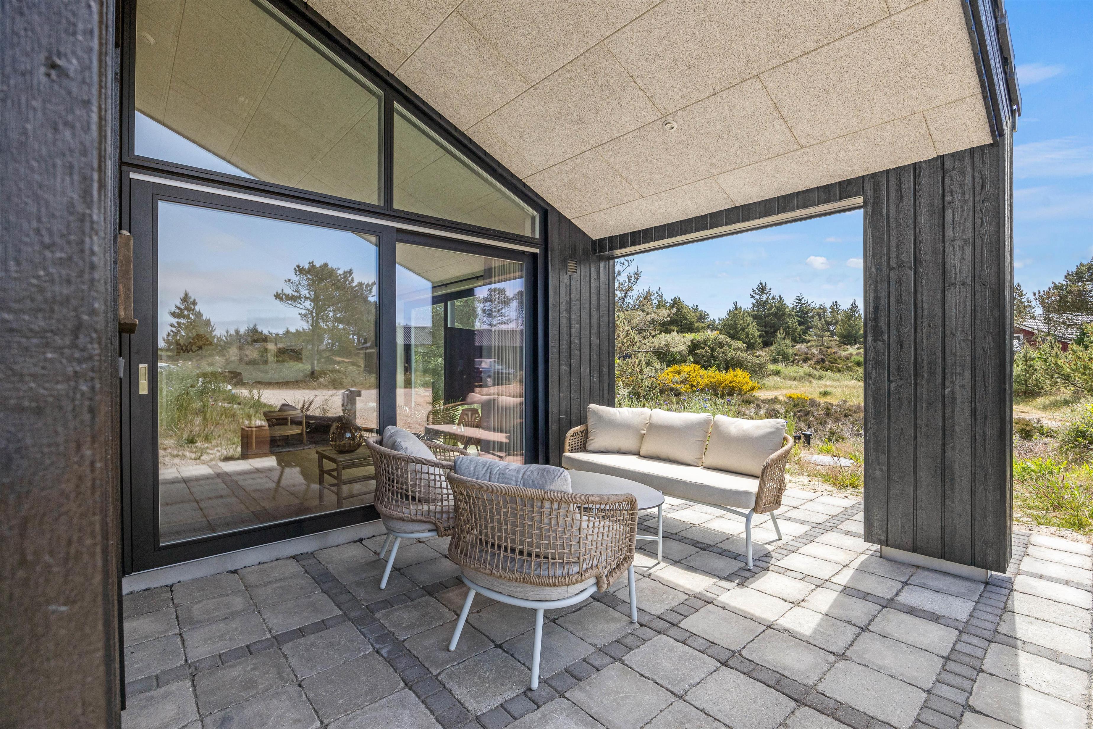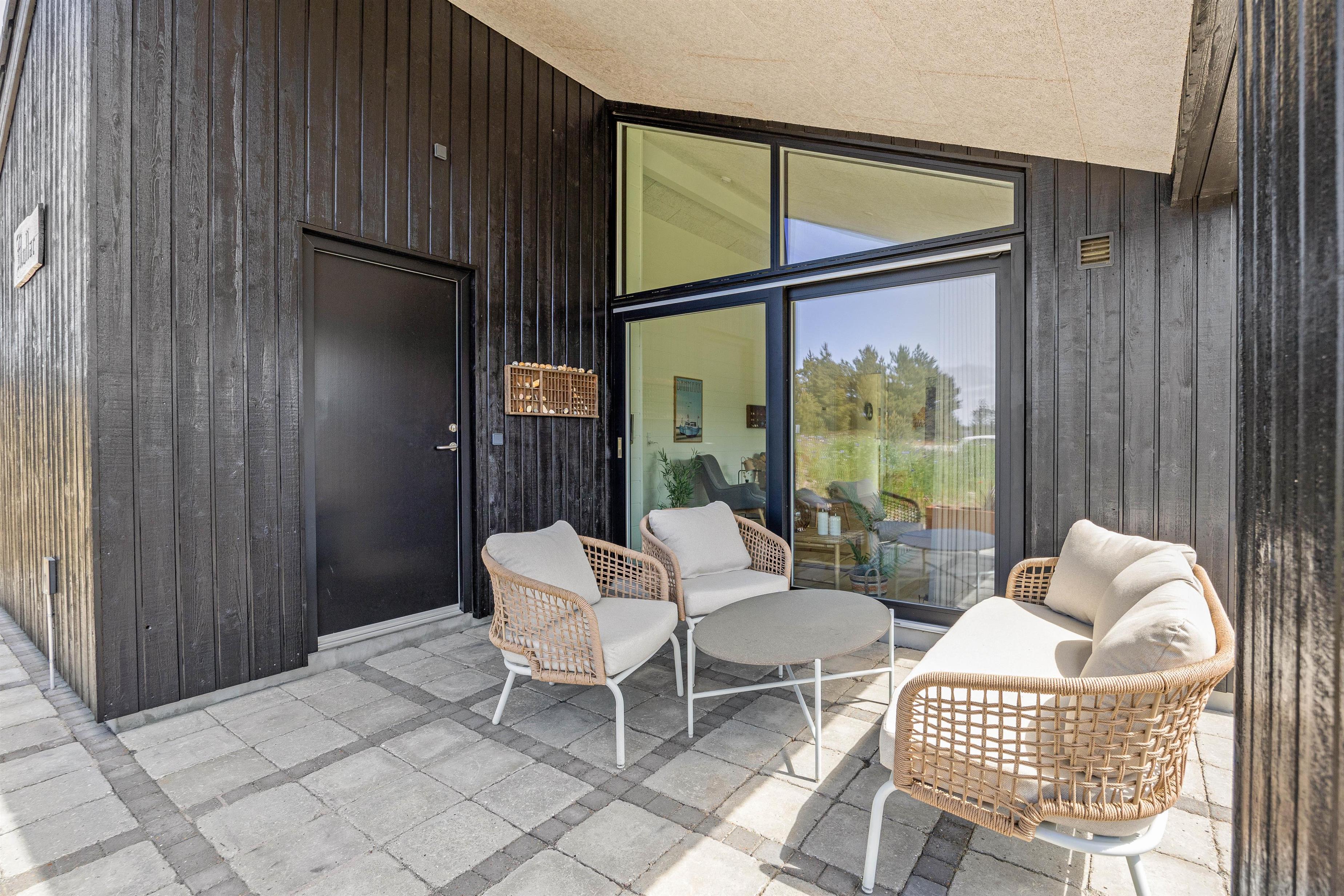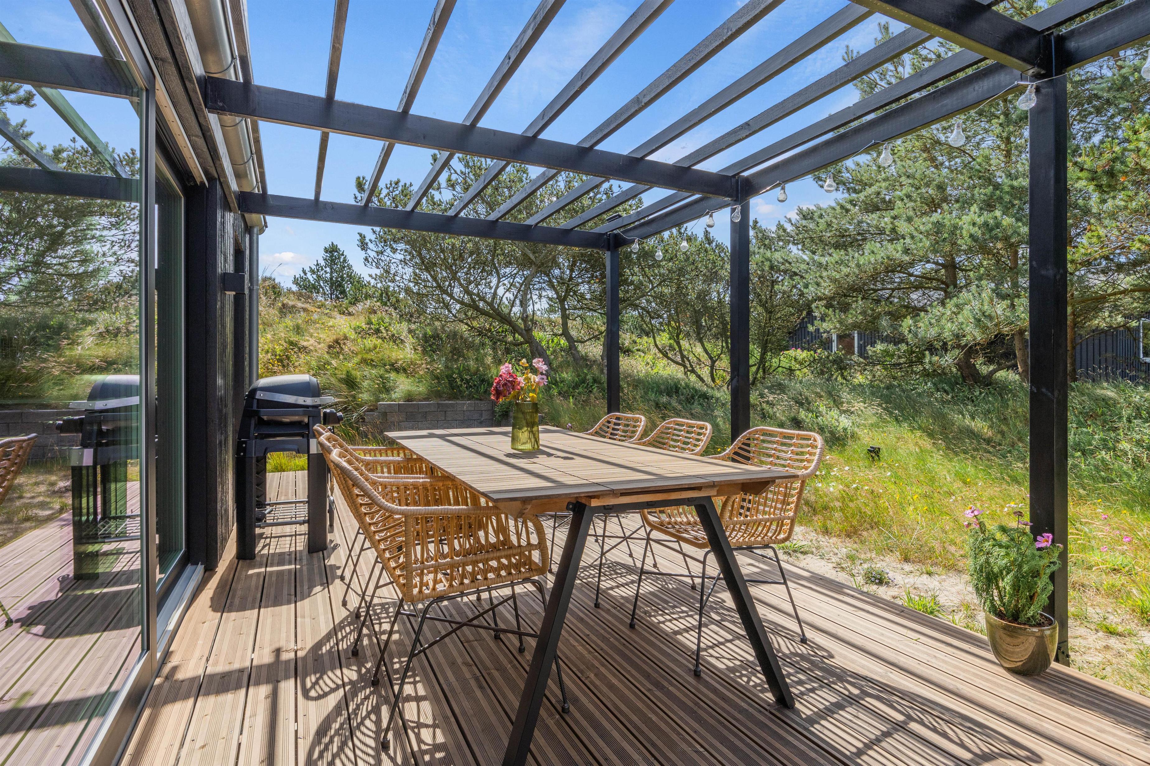 På den delvist afskærmede og delvist overdækkede terrasse har I gode muligheder for at finde en rolig plet. Komfortable terrassemøbler og liggestole står til rådighed, som I kan benytte til at sole jer, men kan også bruges til at nyde jeres aftensmad, som I har tilberedt på sommerhusets grill. Og hvad med lidt ekstra luksus ved at tage en tur i udespaen? Feriehusets udendørs bruser* er særlig praktisk, når sandet fra en dag på stranden skal skylles af.