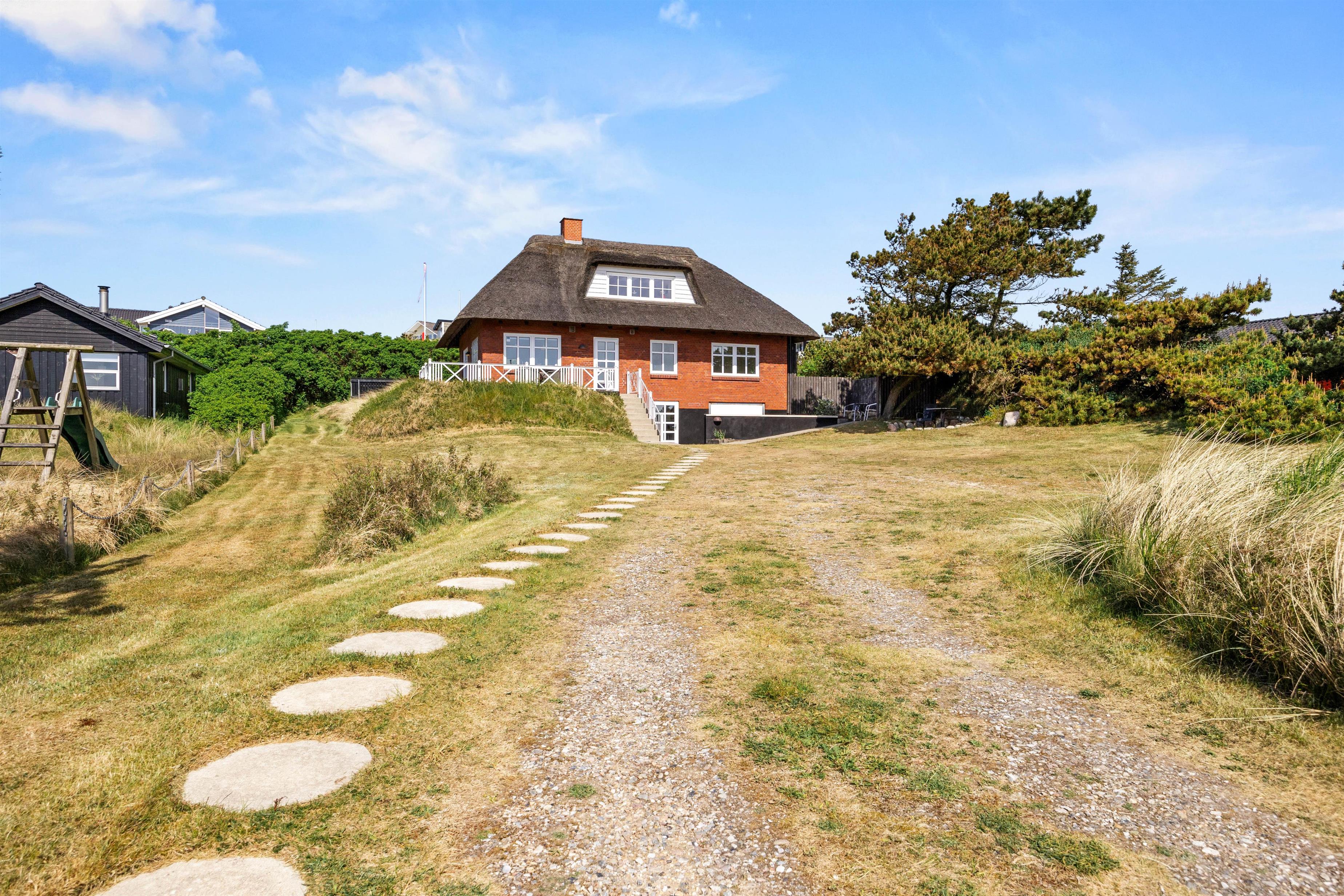 Dette stråtækte murstenshus ligger på en let kuperet grund, som giver en smuk udsigt over det nærliggende område, og skaber en charmerende indgang til sommerhuset via en trappe. Når I først er trådt op ad trappen, bliver I straks mødt af en atmosfære, der indbyder til afslapning og feriehygge, som fortsætter når I træder ind i sommerhuset. Her er der lagt op til hygge afslapning, både i stueetagen som på 1. sal, hvor der også er flere hyggelige kroge, der byder ind på en afslappende stund.
