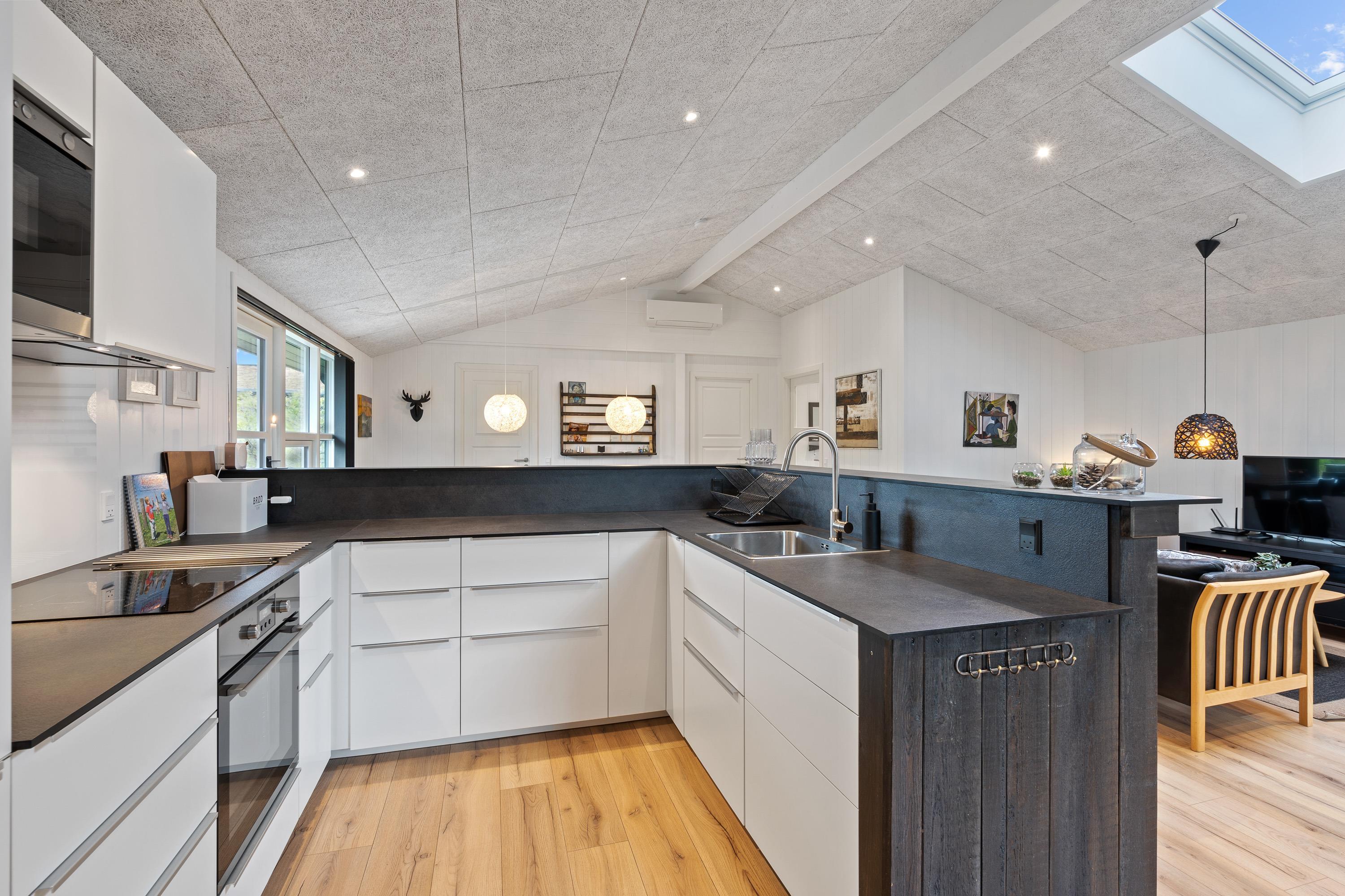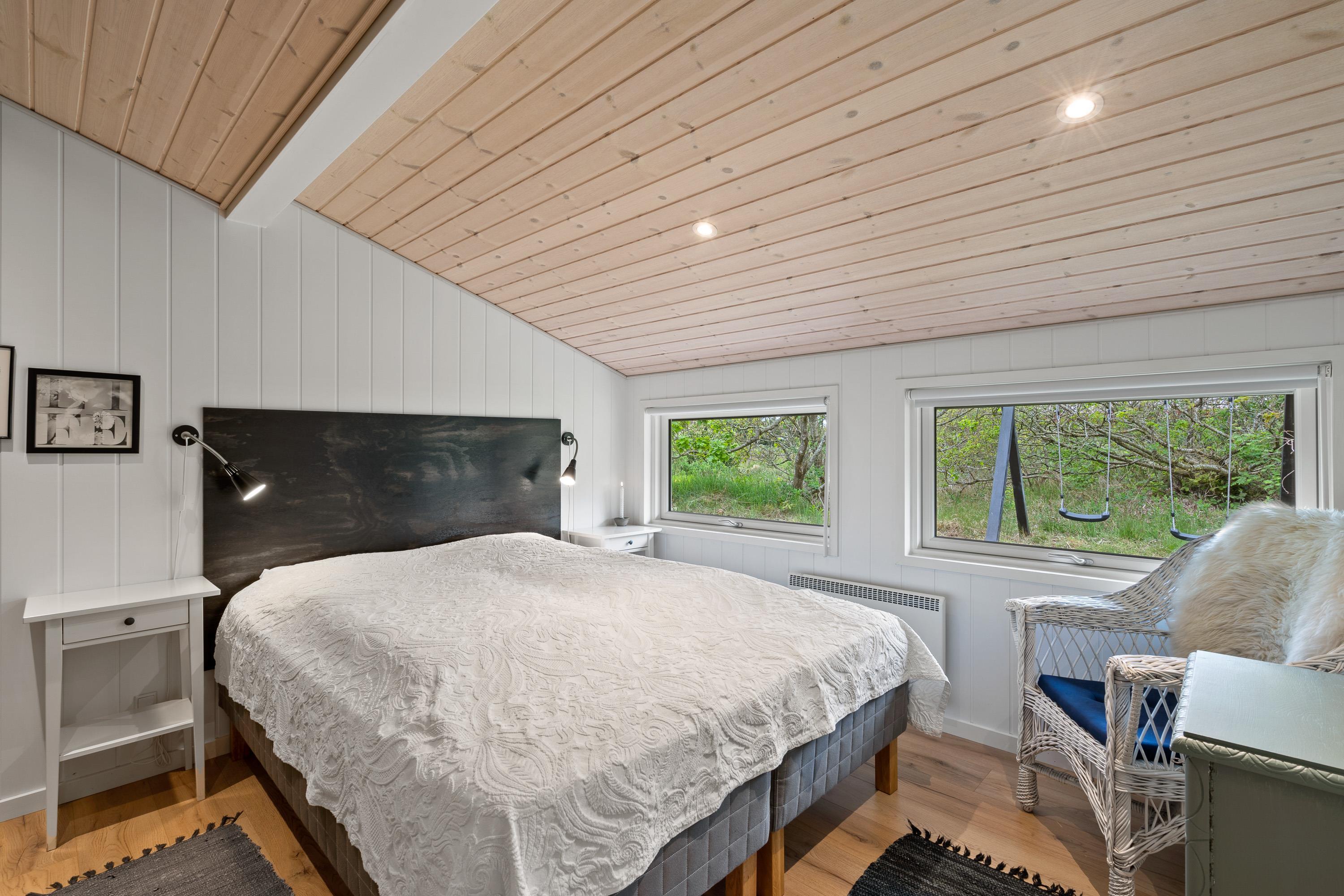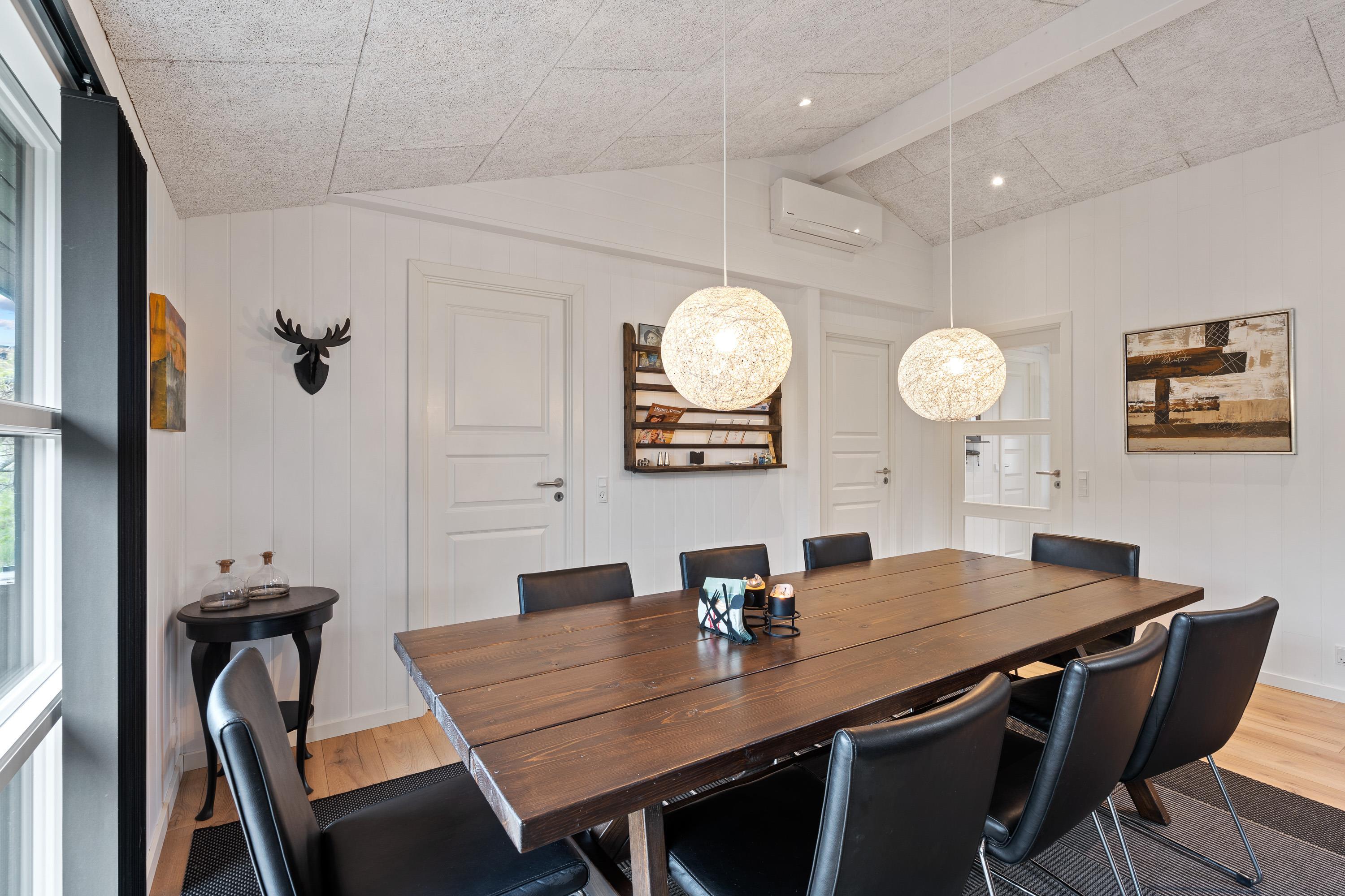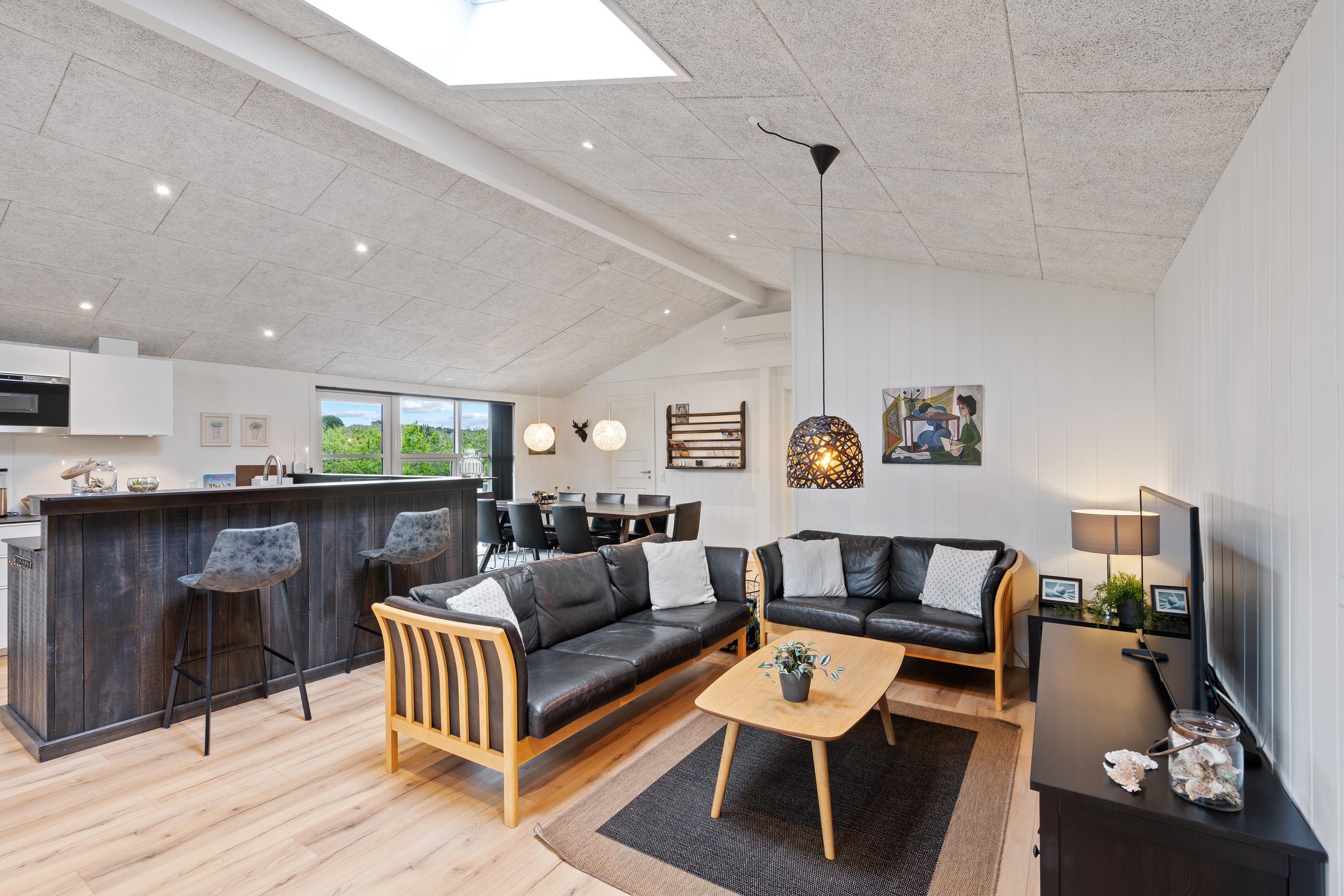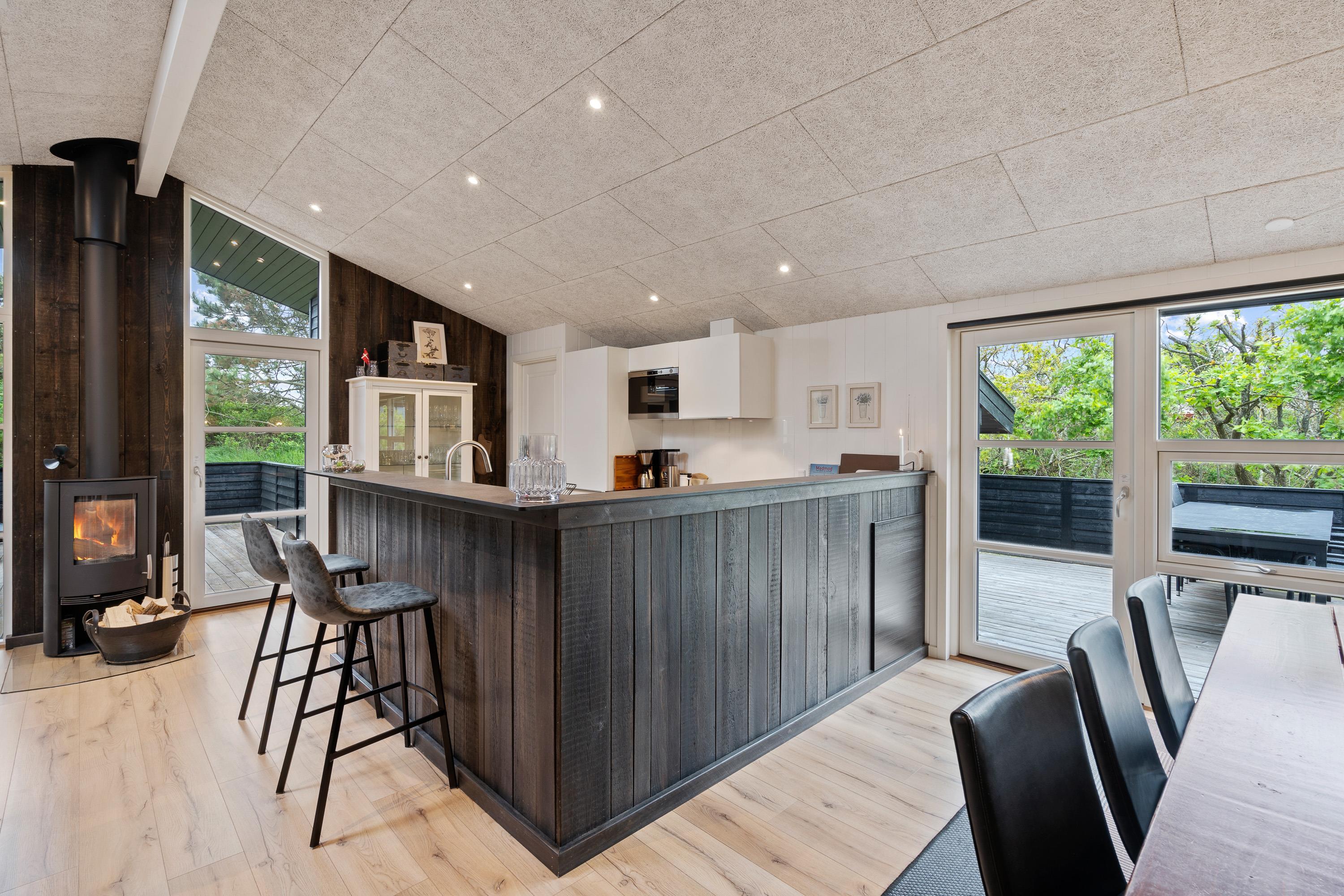Feriehuset er derudover indrettet med 4 soveværelser og det store alrum, hvor køkken, stue og spiseplads ligger i åben forbindelse. Også her kan I tilbringe mange timer i hinandens selskab, mens I laver mad, spiller spil eller ser film. I alrummet er der også en brændeovn, der sørger for den helt rette feriestemning og varme – og ellers har I en varmepumpe i feriehuset, der holder temperaturerne behagelige.