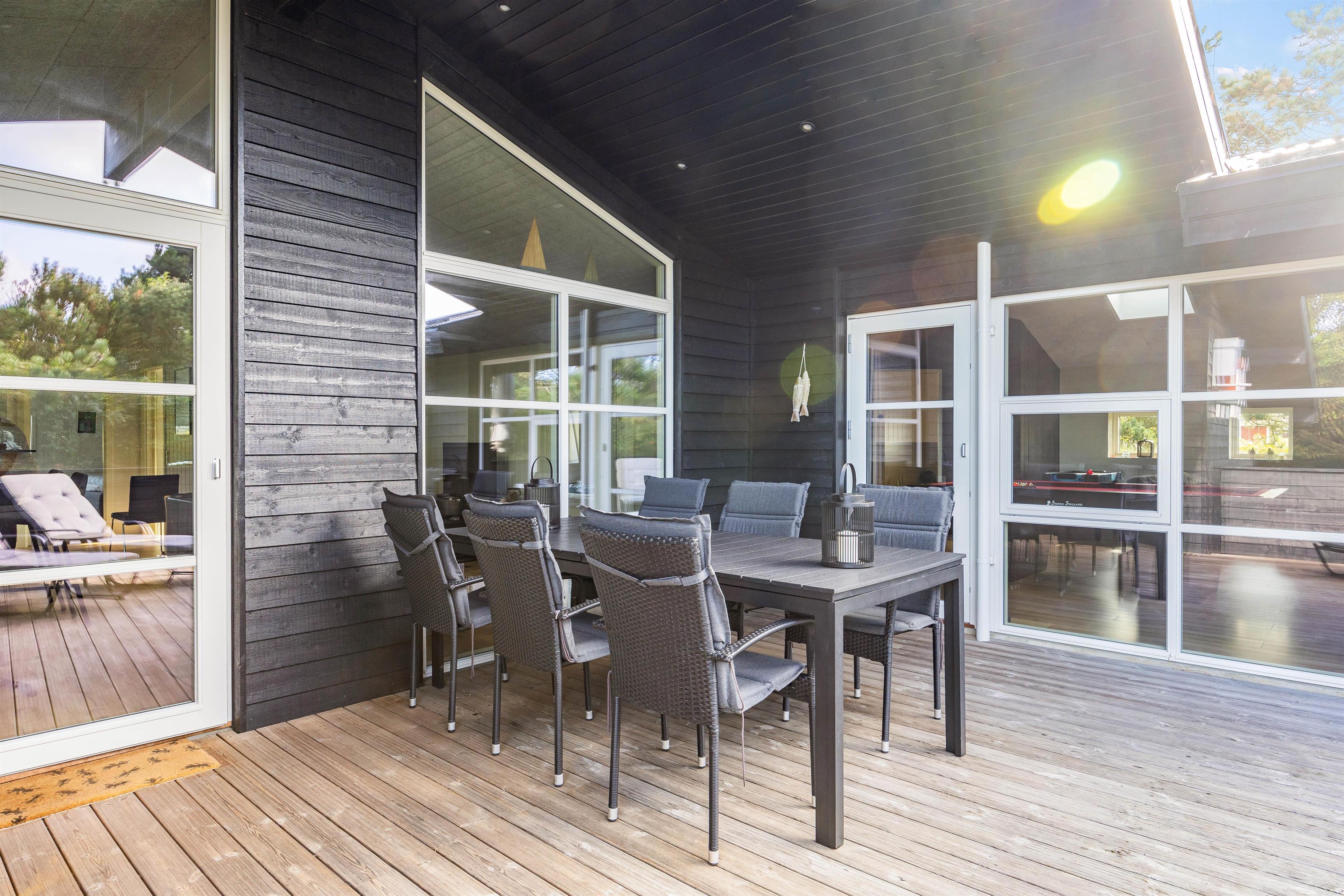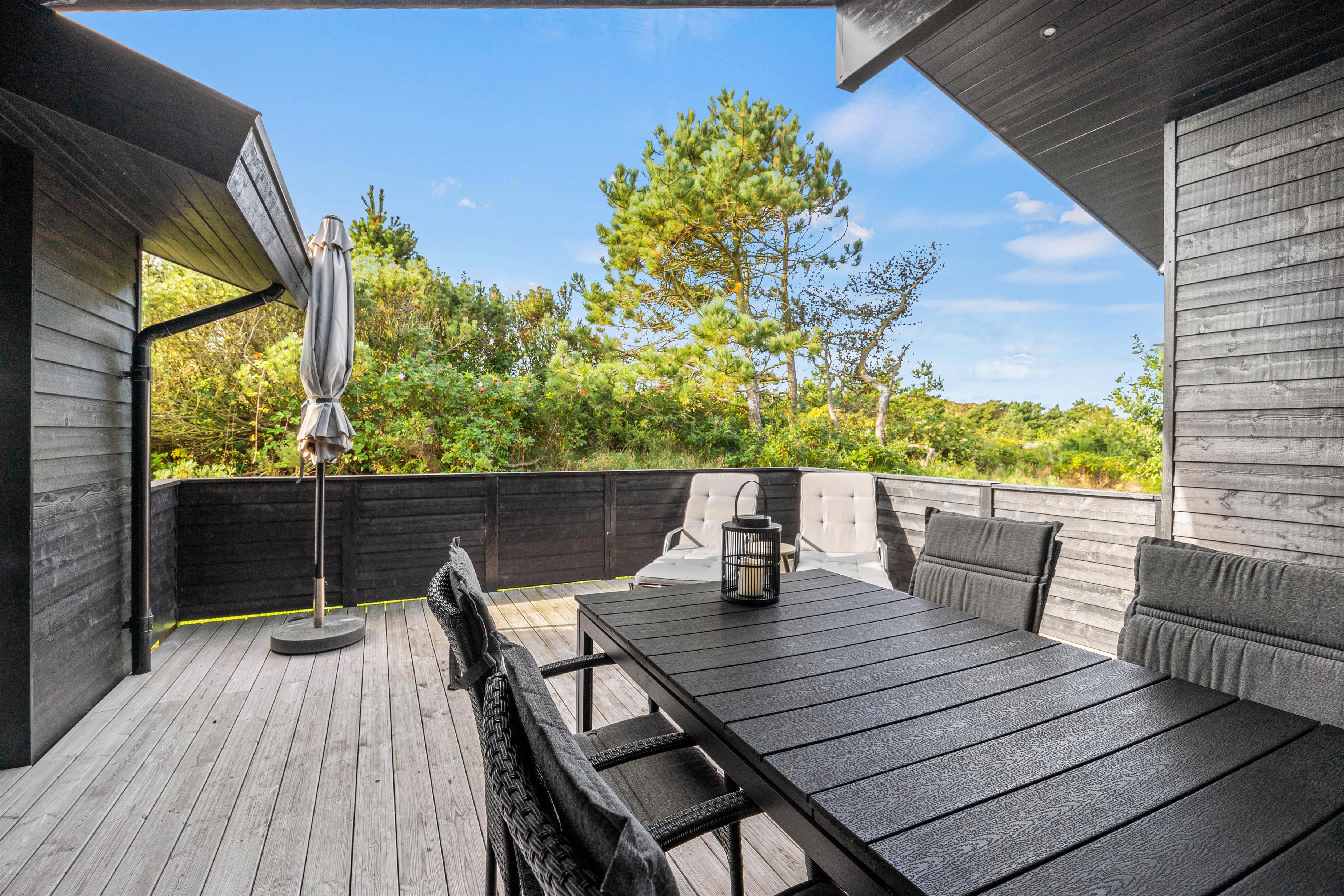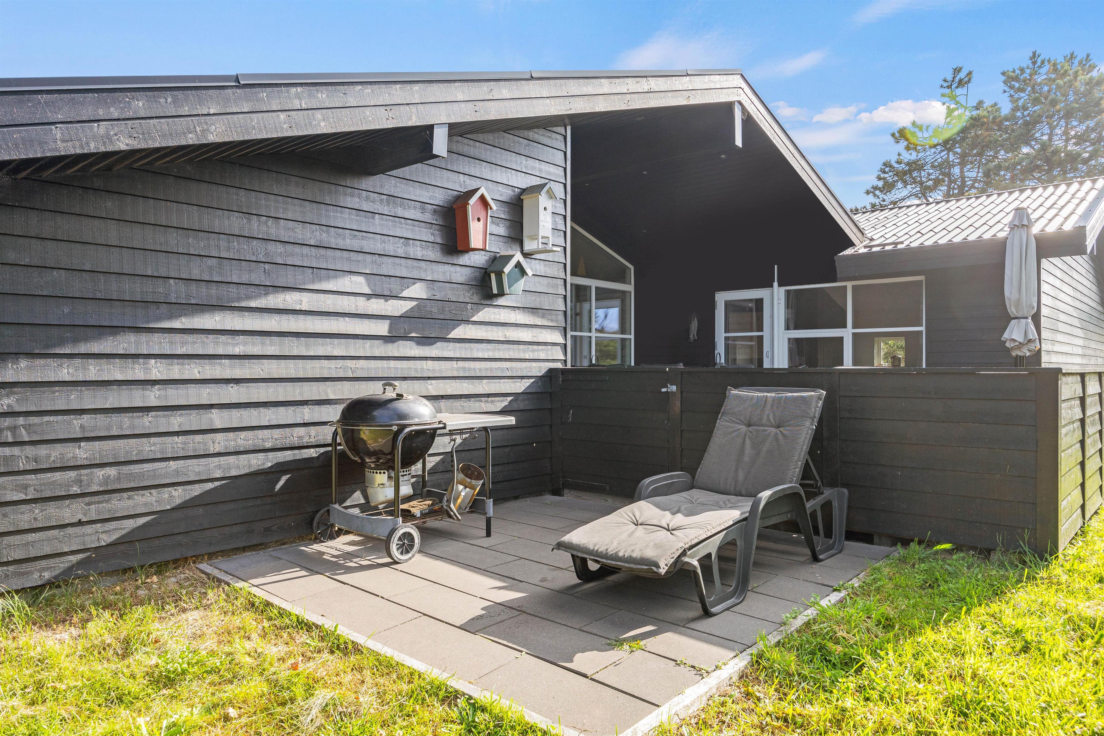 Sommerhusets udeområde er også helt fantastisk, og I har mange gode muligheder for at kunne komme ud at nyde de solrige og varme feriedage. Feriehuset byder på flere skønne terrasser, hvoraf 2 af dem er afskærmede, så I kan sidde i læ for vinden.