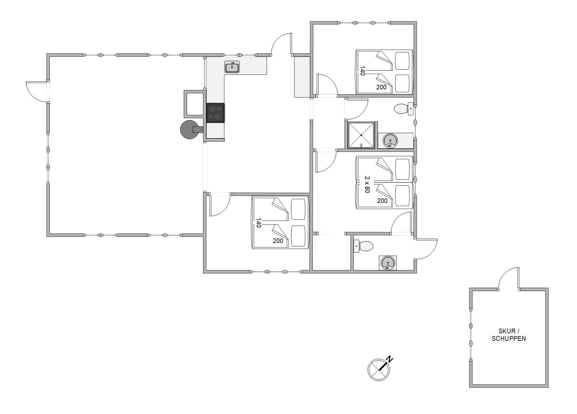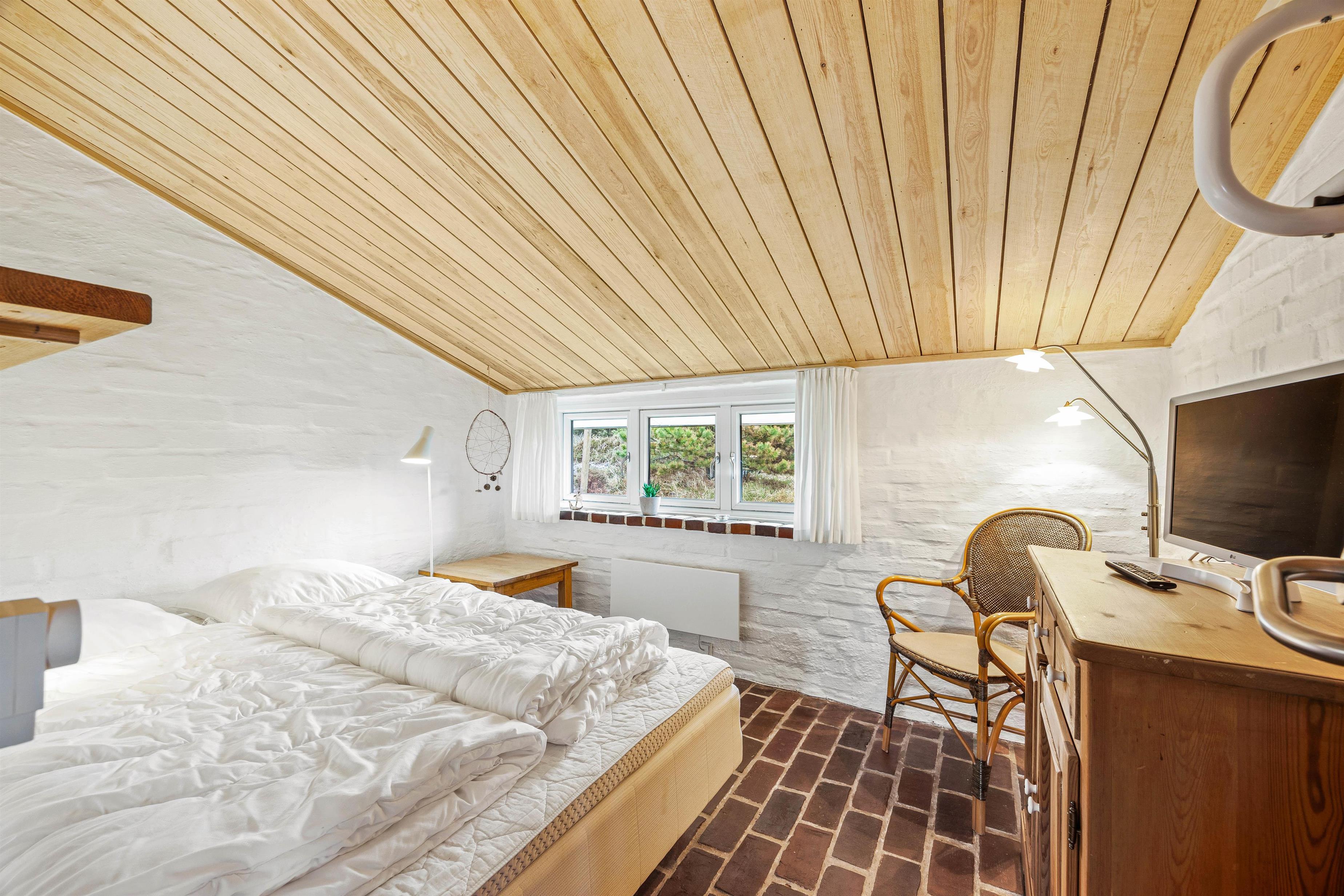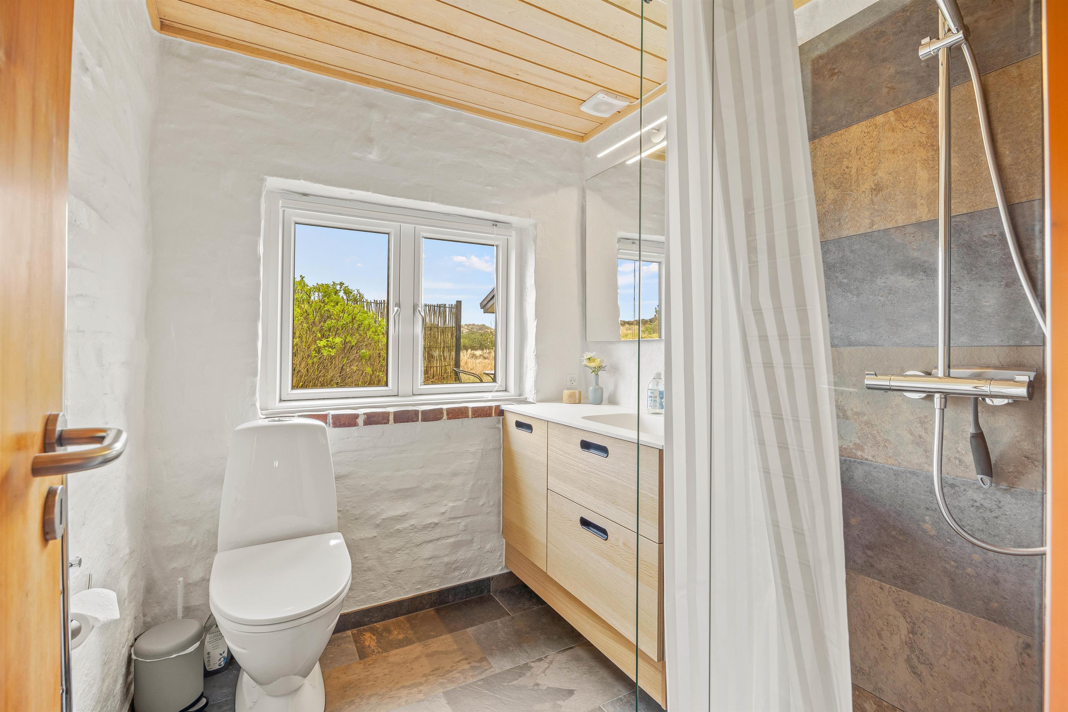 I feriehuset finder I 3 soveværelser, det ene er udstyret med to enkeltsenge og to med dobbeltseng, 140x200. Fra det største soveværelse har direkte adgang til feriehusets gæstetoilet. Både gæstetoilet og badeværelse er renoveret i 2024 og udstyret med gulvvarme.