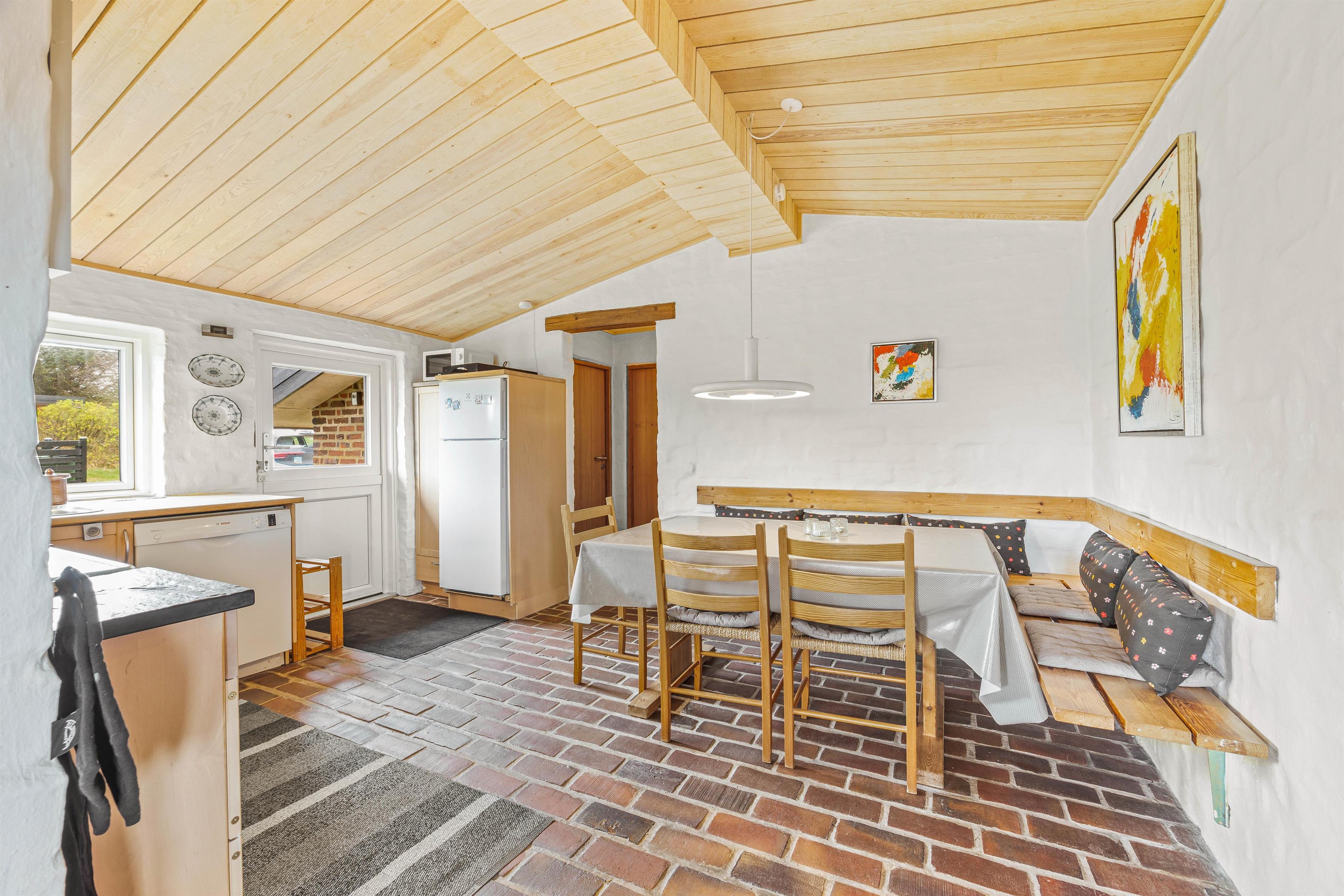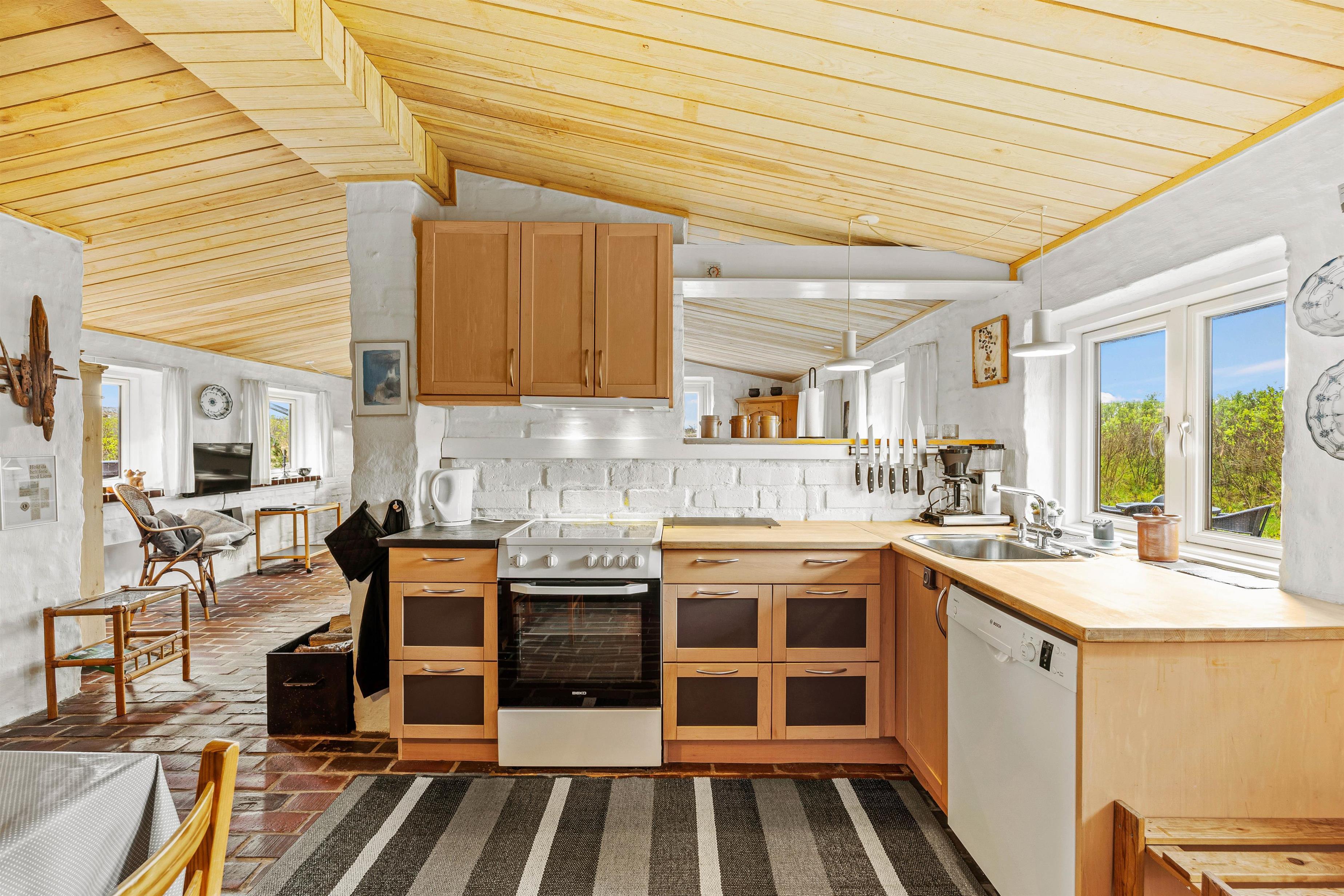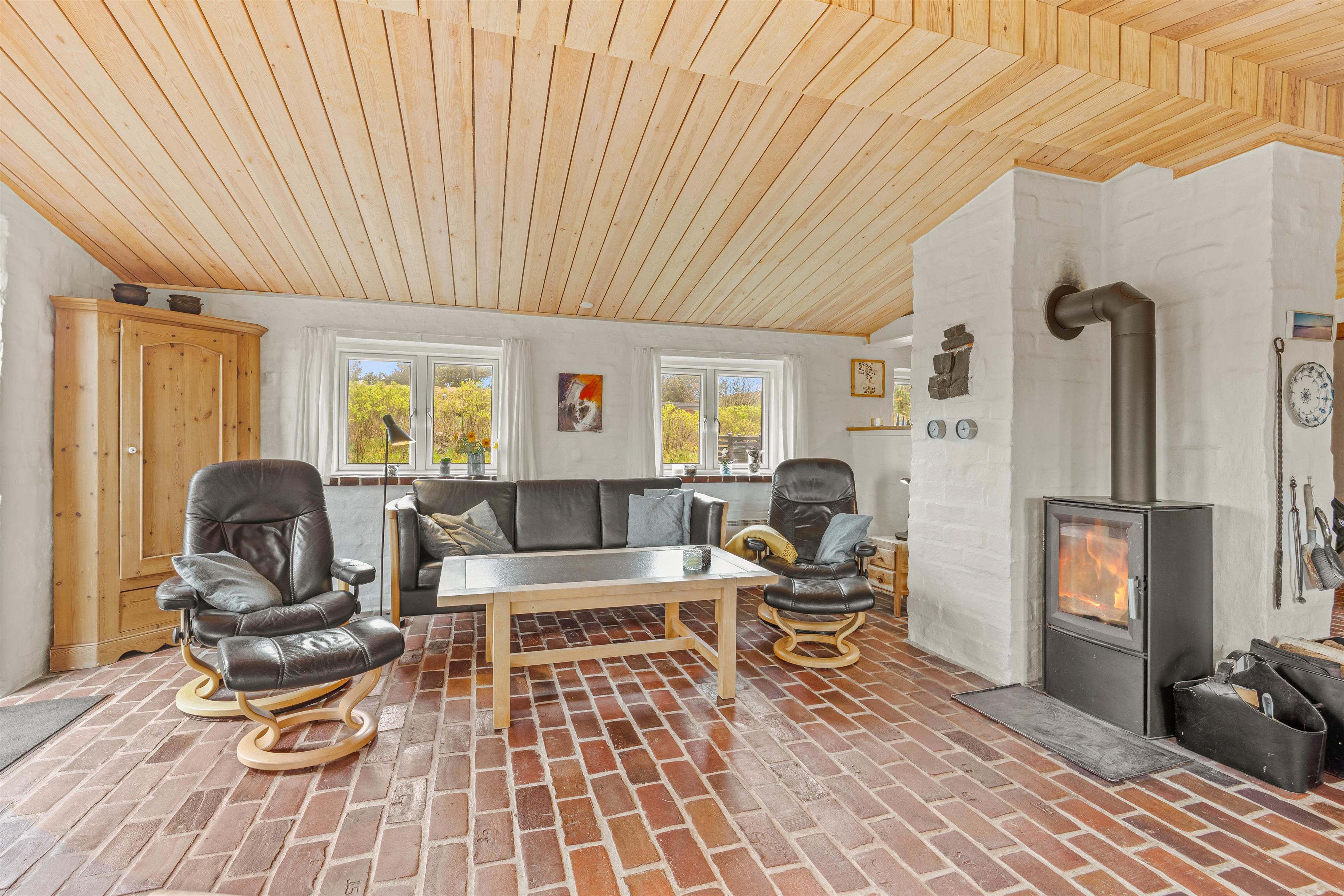 På Gederamsevej 6 ved Henne Strand finder I dette sommerhus ikke langt fra Vesterhavet. Et hyggeligt feriehus på 89m2, hvor der er plads til familielivet og hyggeligt samvær! Midtpunktet er den hyggelige stue, hvor den skønne pejs spreder varme og glæde. Her er der plads til afslapning, hyggelige spilleaftner og meget mere! Herfra er der også åbent op til køkkenet og en energibesparende varmepumpe.
