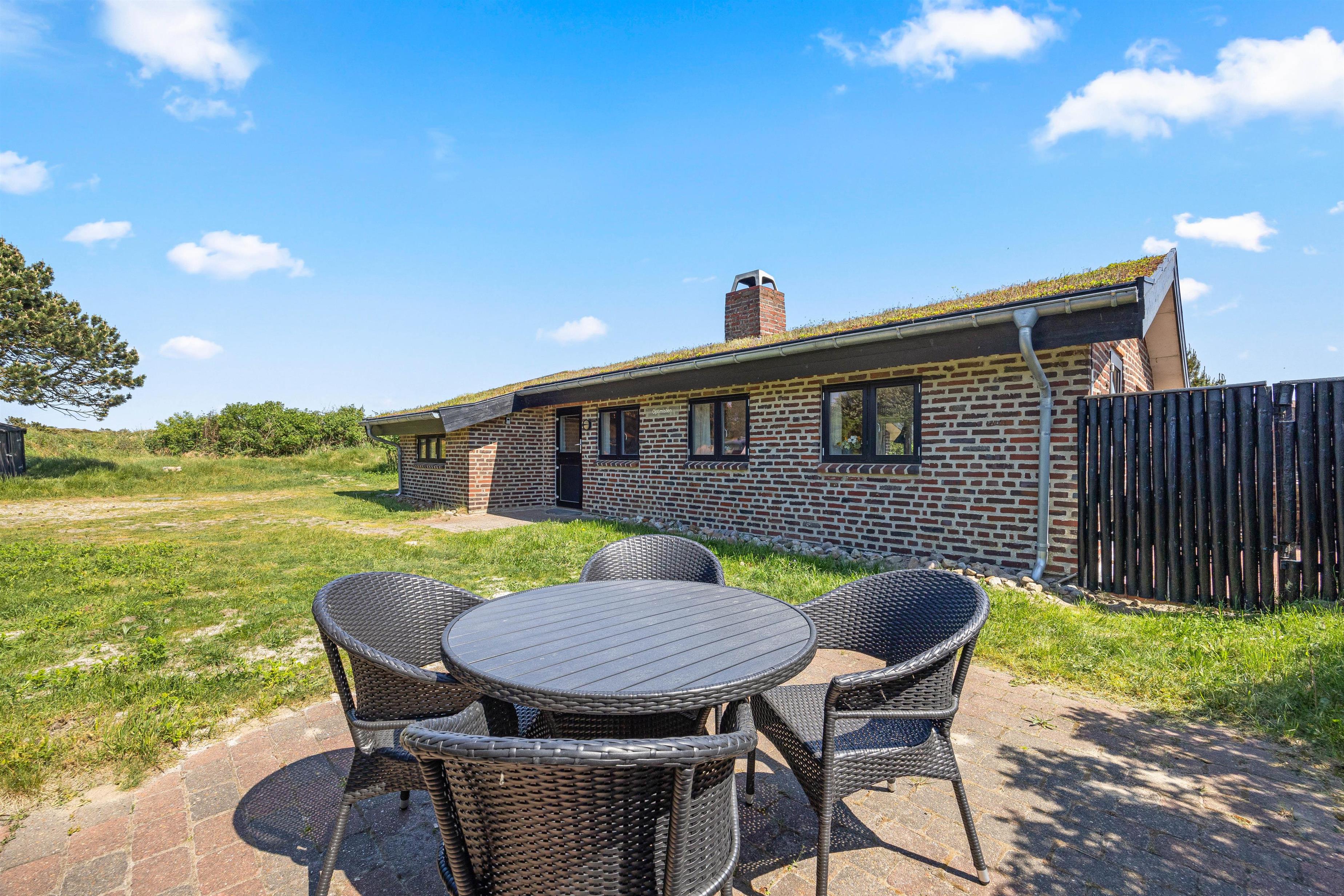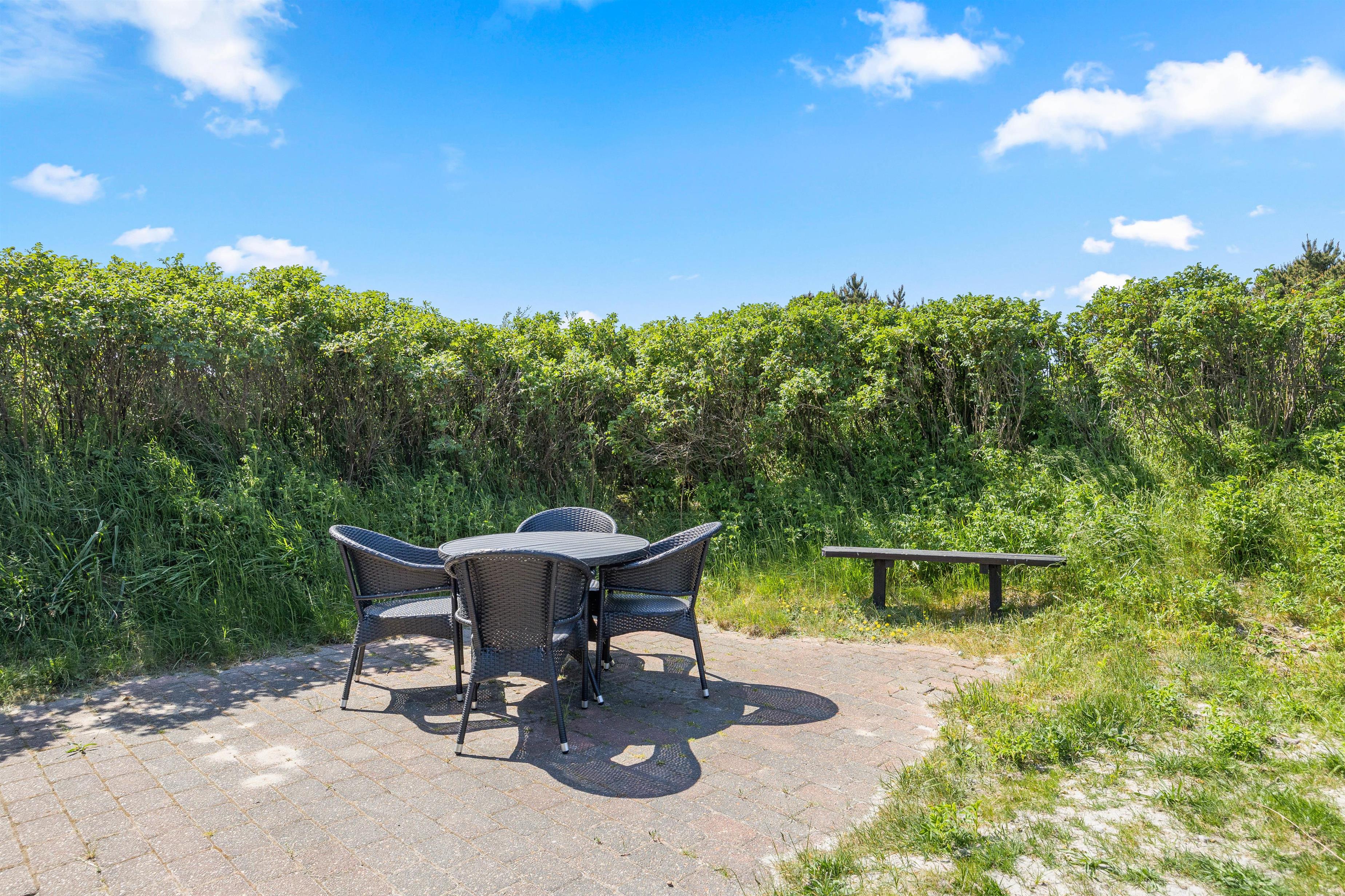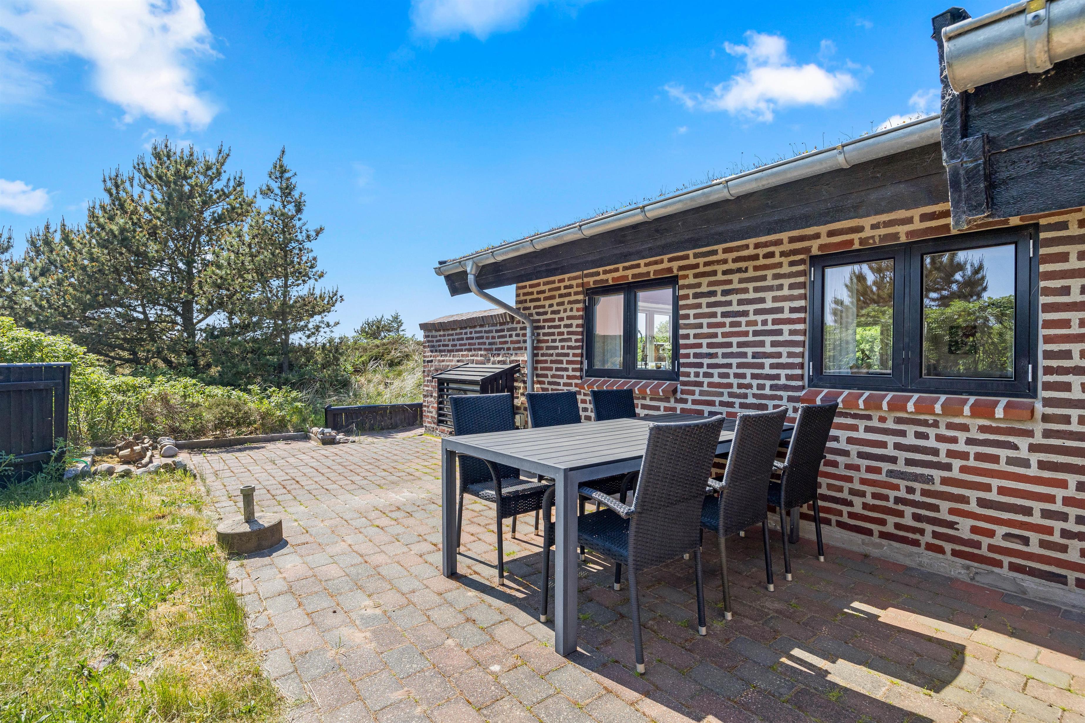 Rundt om feriehuset er der 3 skønne terrasser. Her kan I altid uanset vindretningen finde et roligt hjørne, og høre Vesterhavets brusene samt nyde den skønne udsigt. Havemøbler, solsenge og en parasol står til rådighed. Her kan I læse en god bog, drikke morgenkaffe og til aften grille god mad. Her er nemlig en gasgrill!