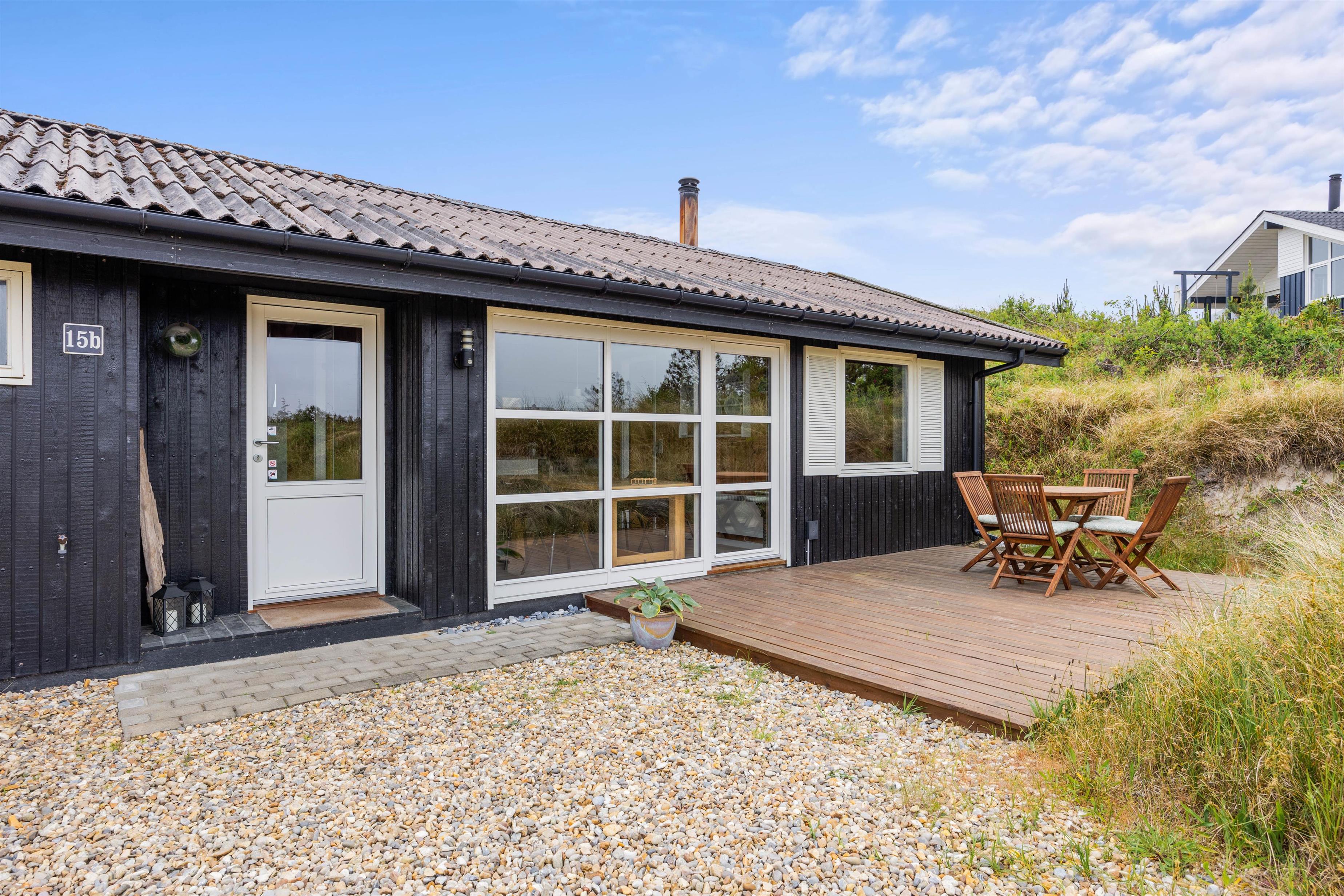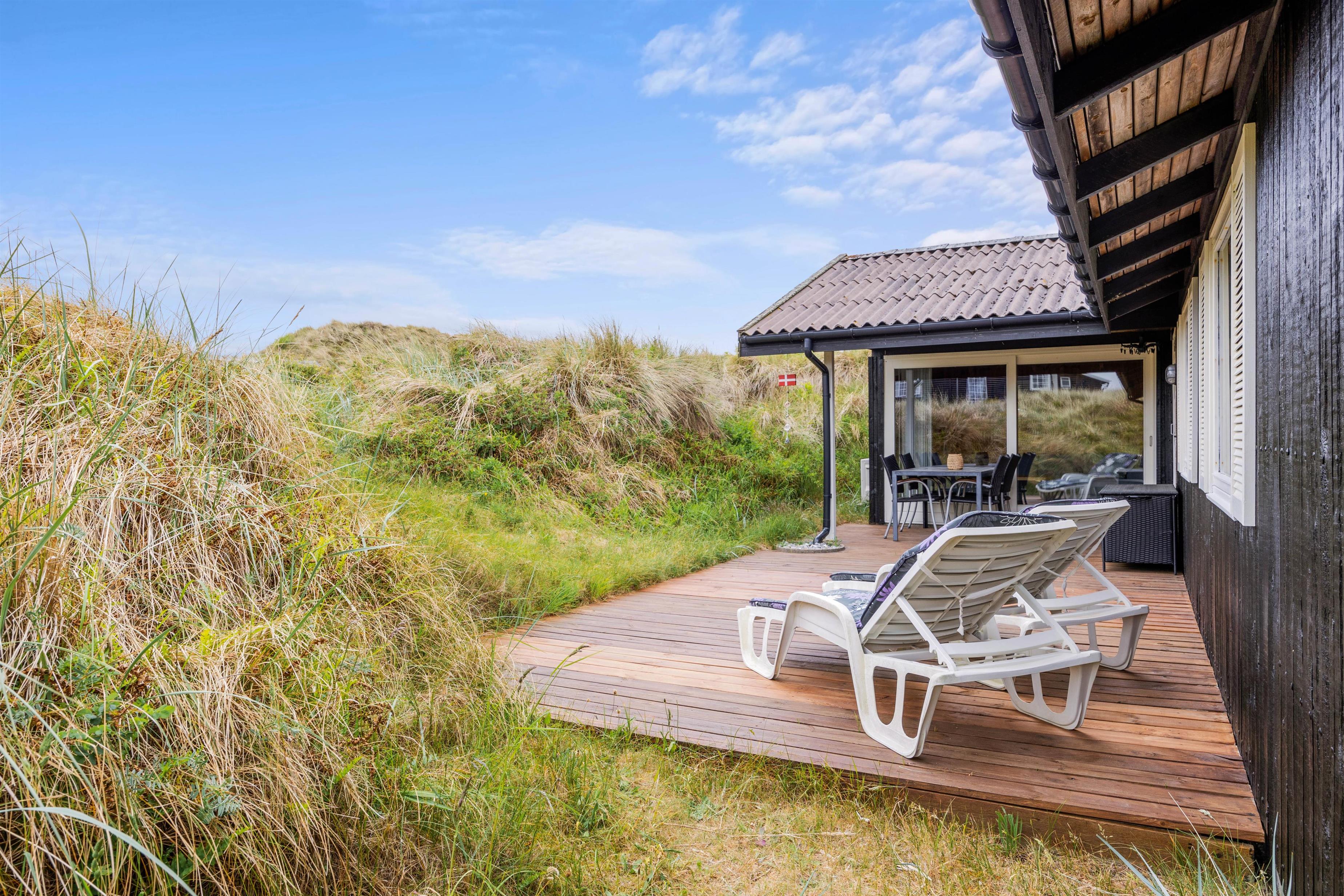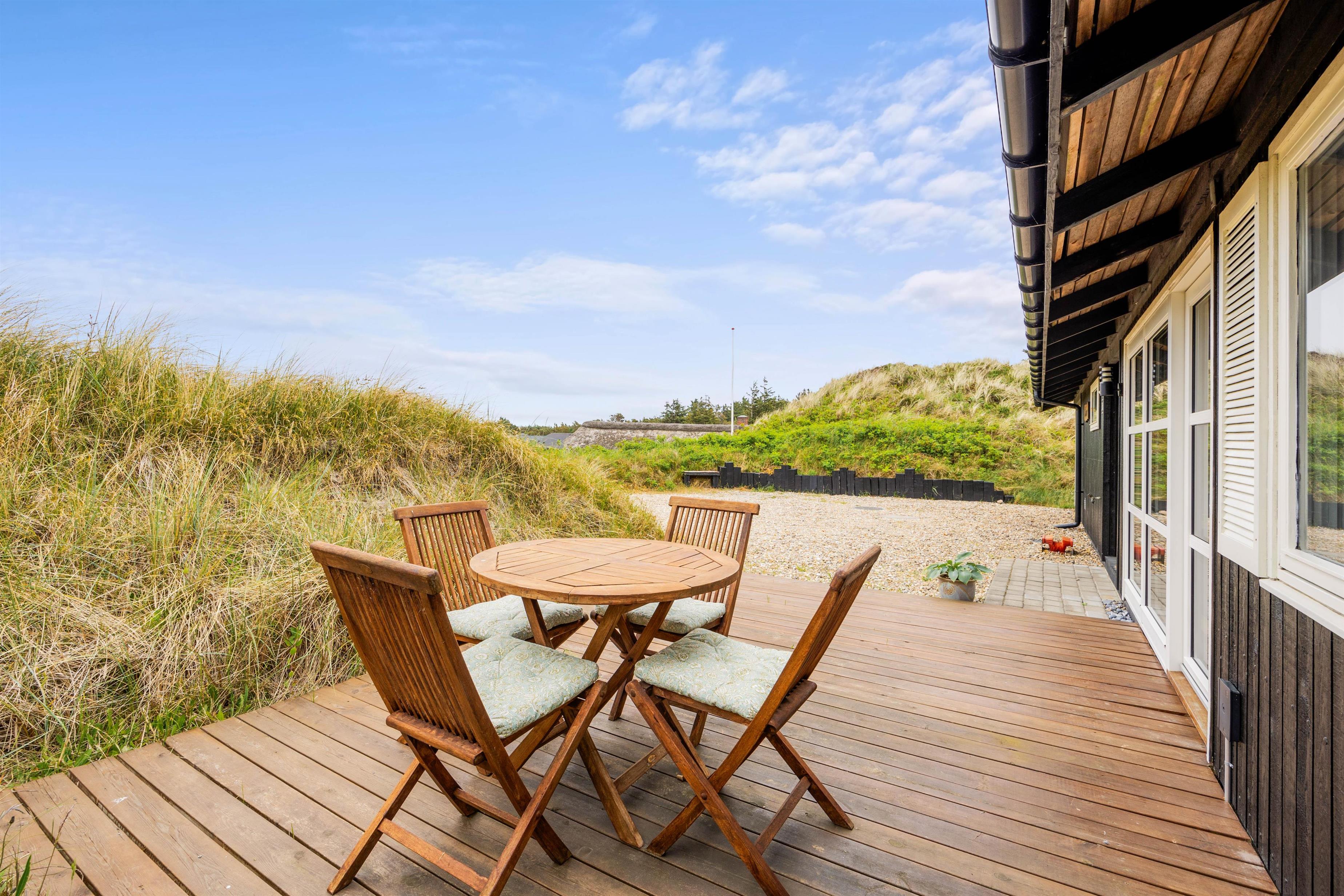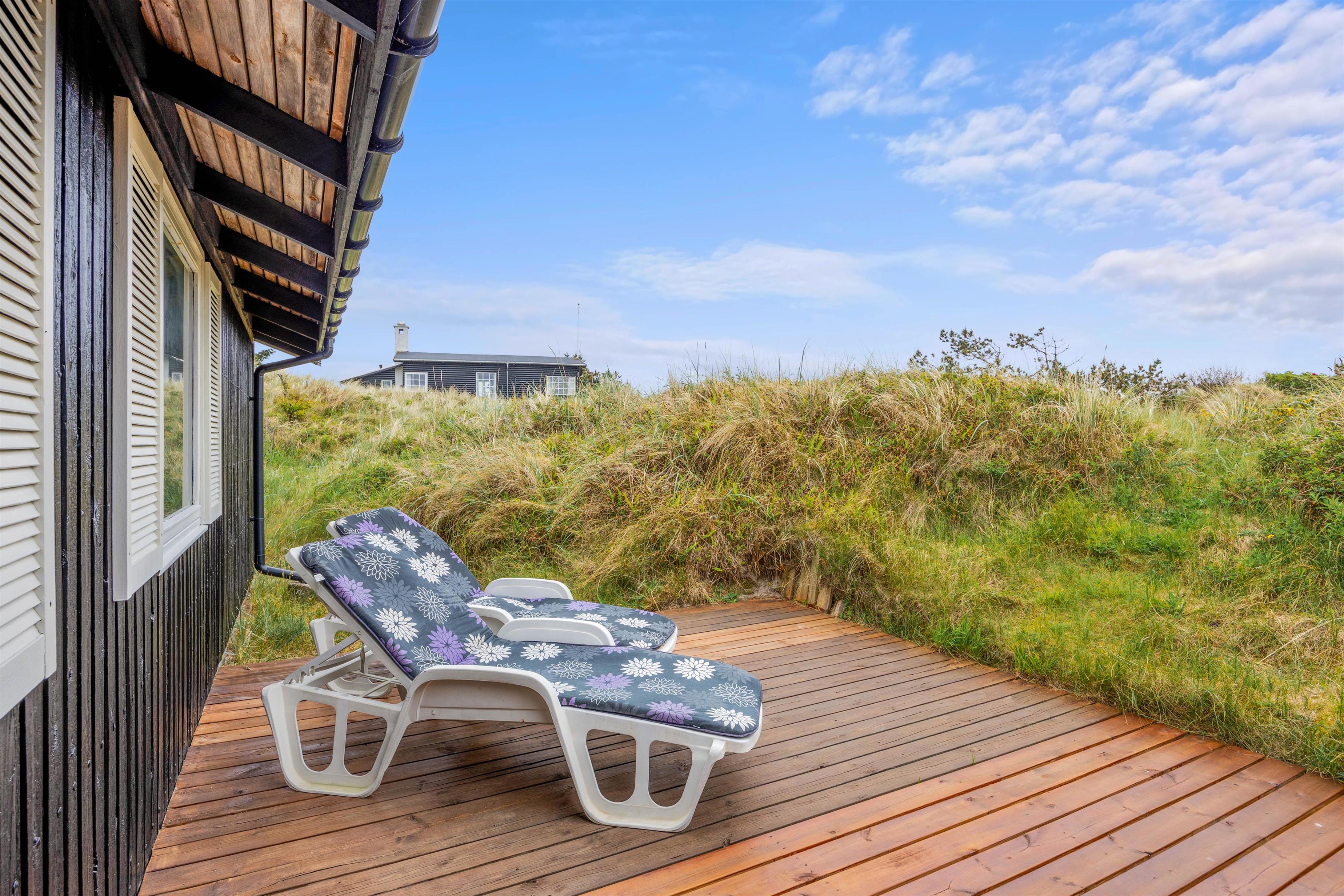 Sommerhuset på Hedelærkevej 15B er beliggende på en klit- og naturgrund på 1500m2 omgivet af klitter og buske. På terrasserne omkring feriehuset vil I helt sikkert kunne finde et behageligt sted med en god bog og en kold drink og nyde vejret – i de solvogne og havemøbler, der står til rådighed. Og skulle vejret ikke være så godt, er en del af terrassen overdækket, og vil I stadig kunne nyde den friske havluft.