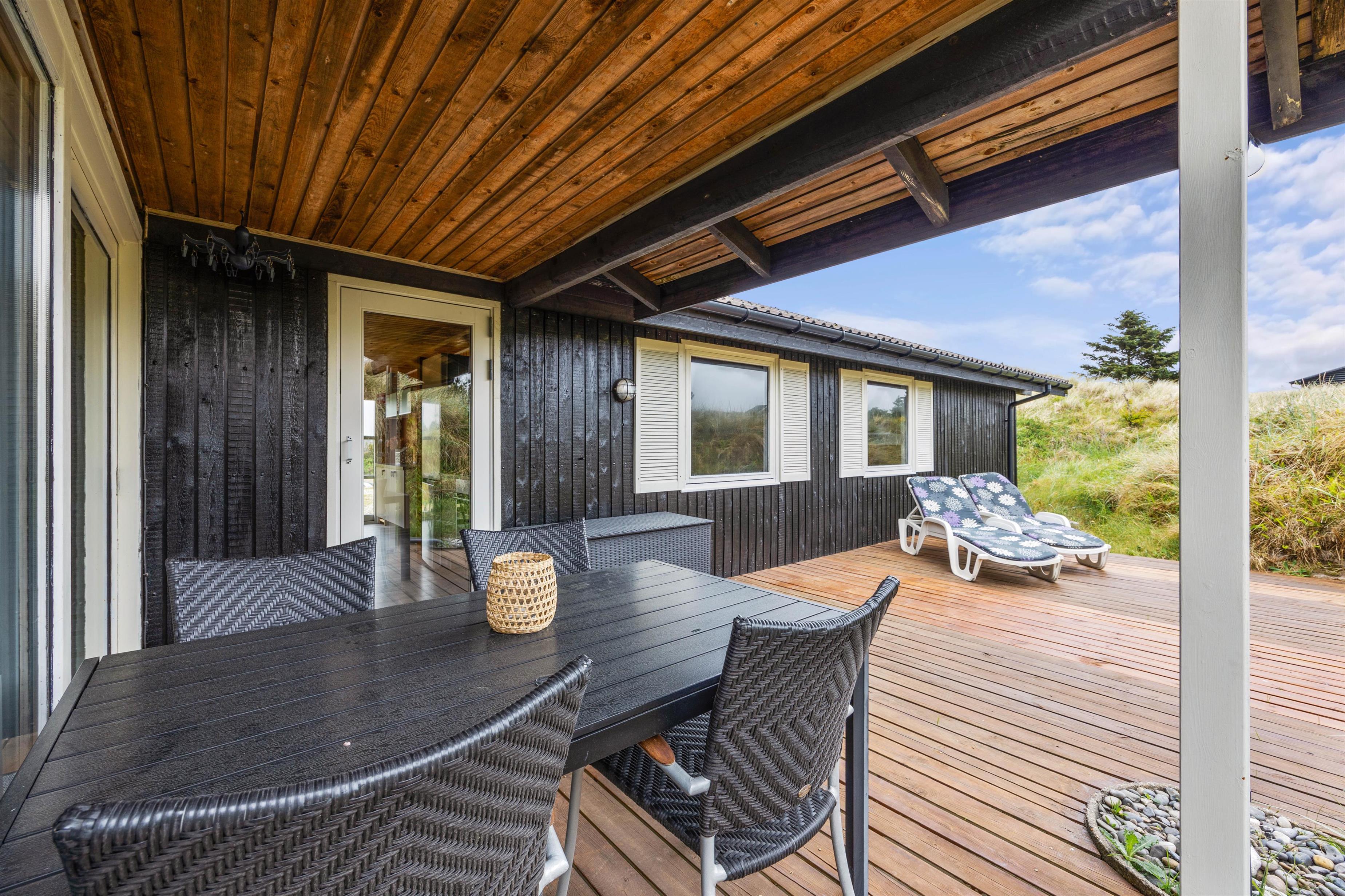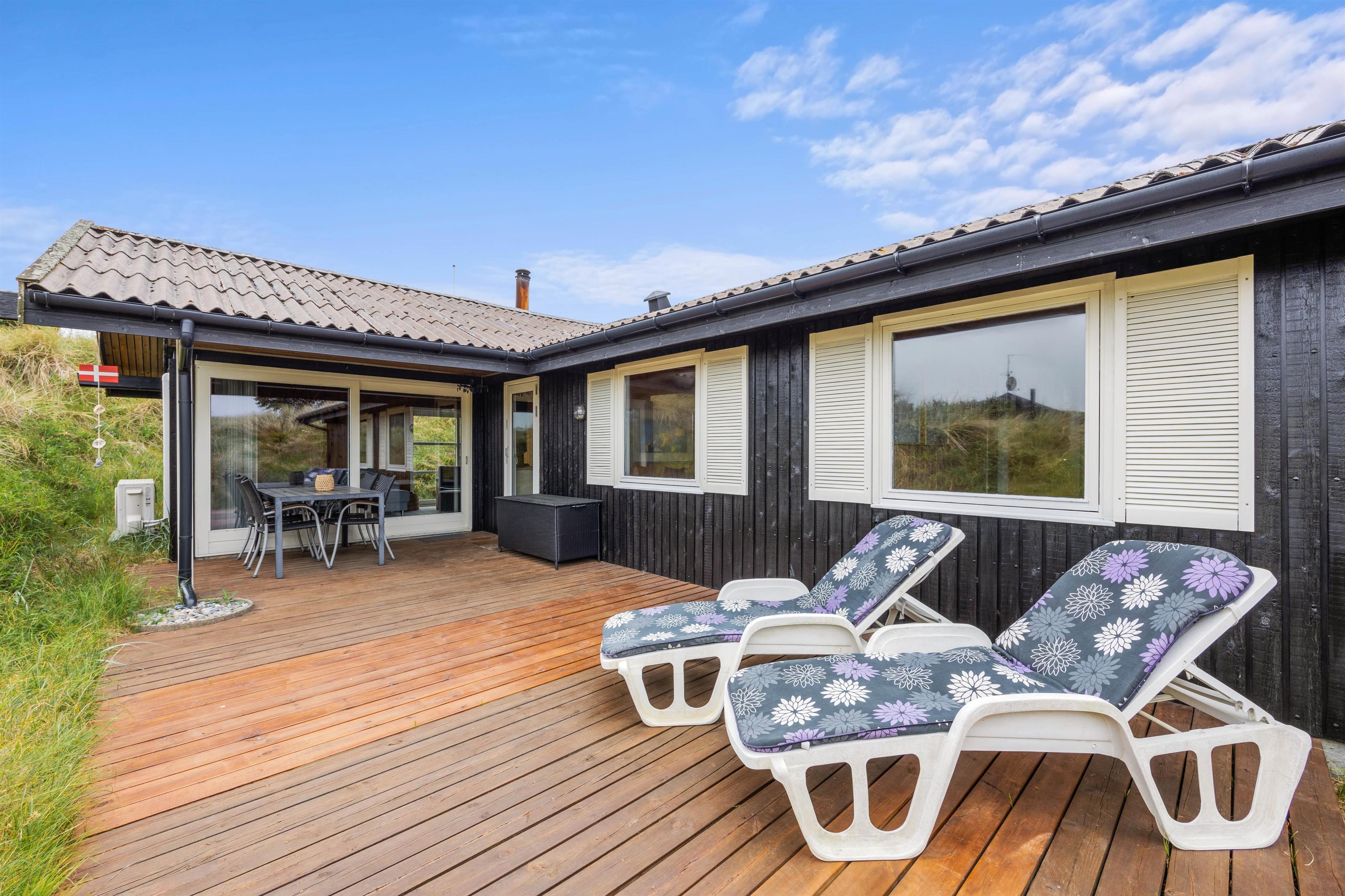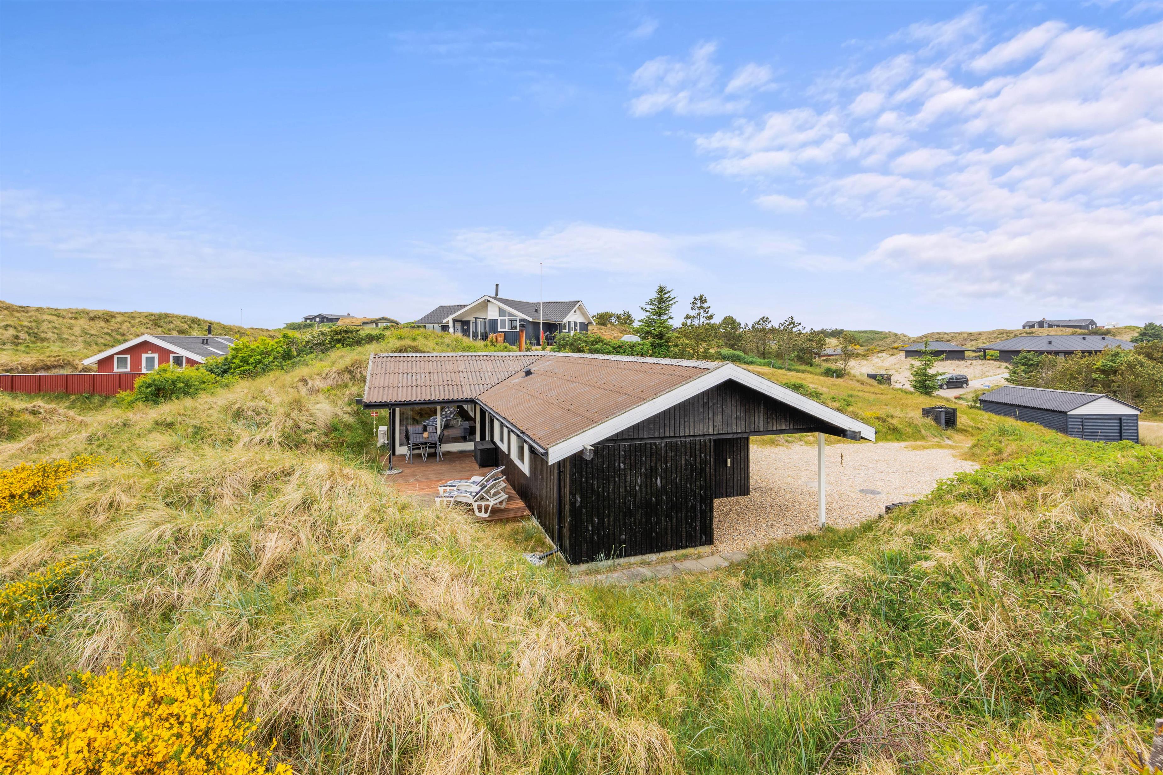 Sommerhuset på Hedelærkevej 15B er beliggende på en klit- og naturgrund på 1500m2 omgivet af klitter og buske. På terrasserne omkring feriehuset vil I helt sikkert kunne finde et behageligt sted med en god bog og en kold drink og nyde vejret – i de solvogne og havemøbler, der står til rådighed. Og skulle vejret ikke være så godt, er en del af terrassen overdækket, og vil I stadig kunne nyde den friske havluft.