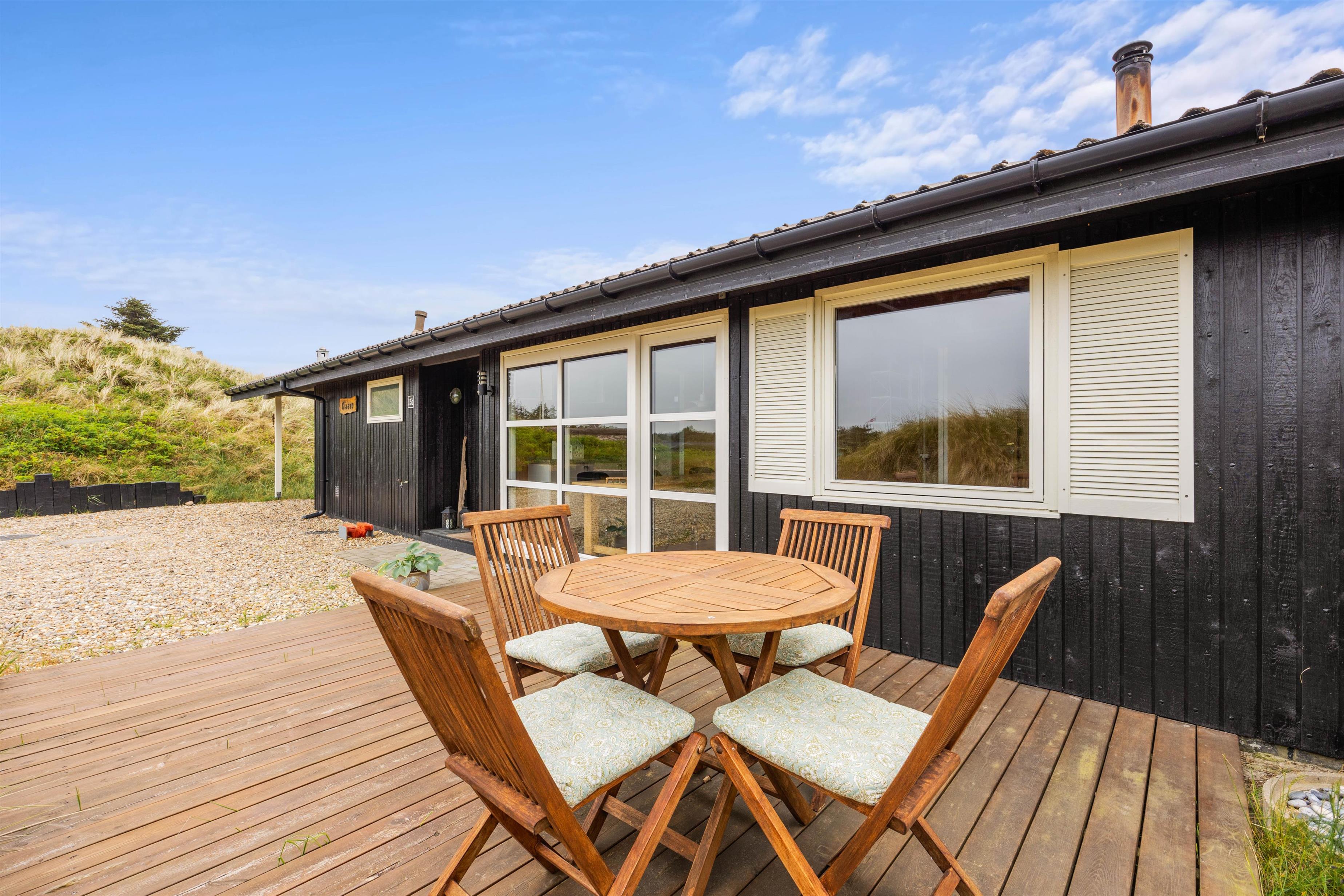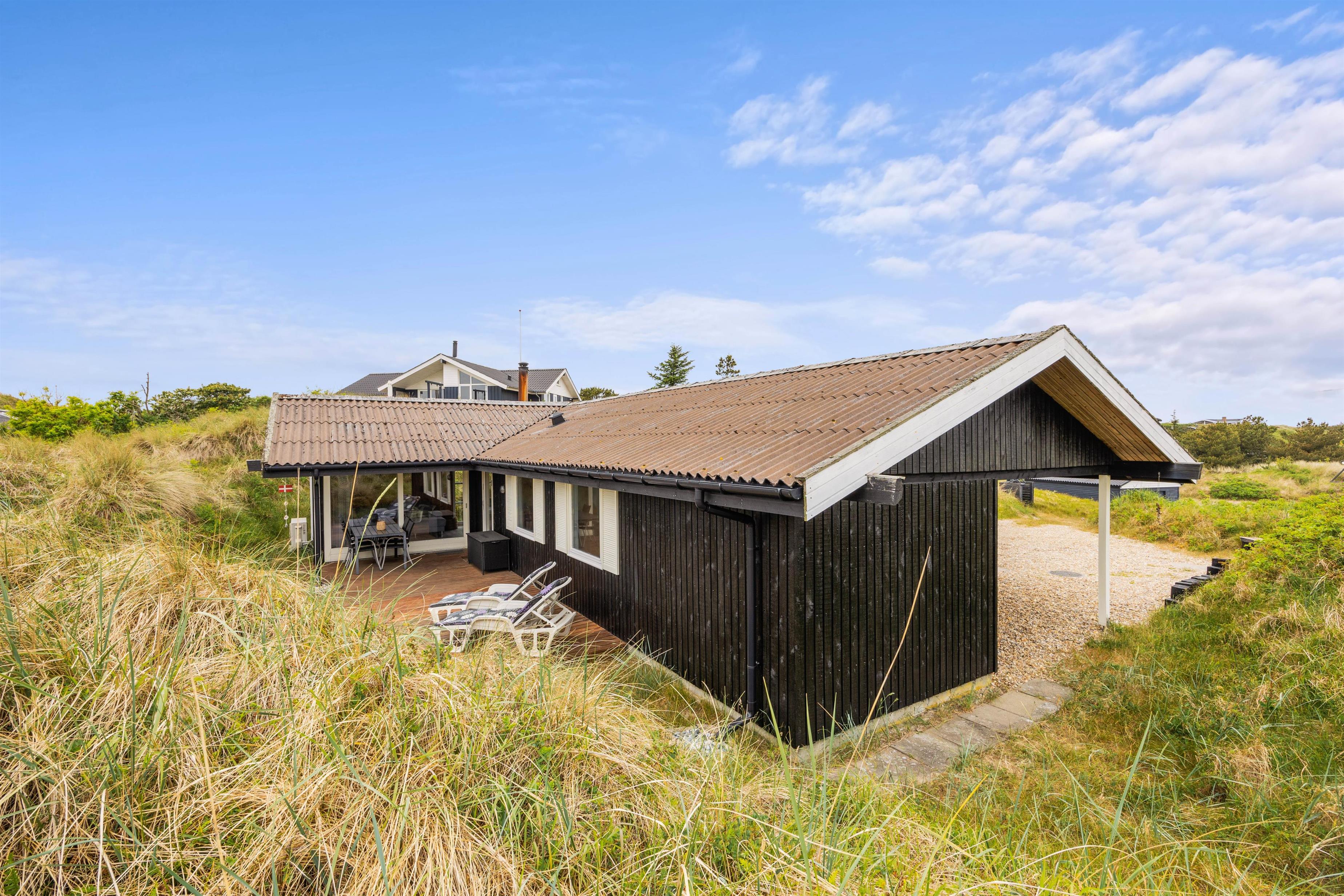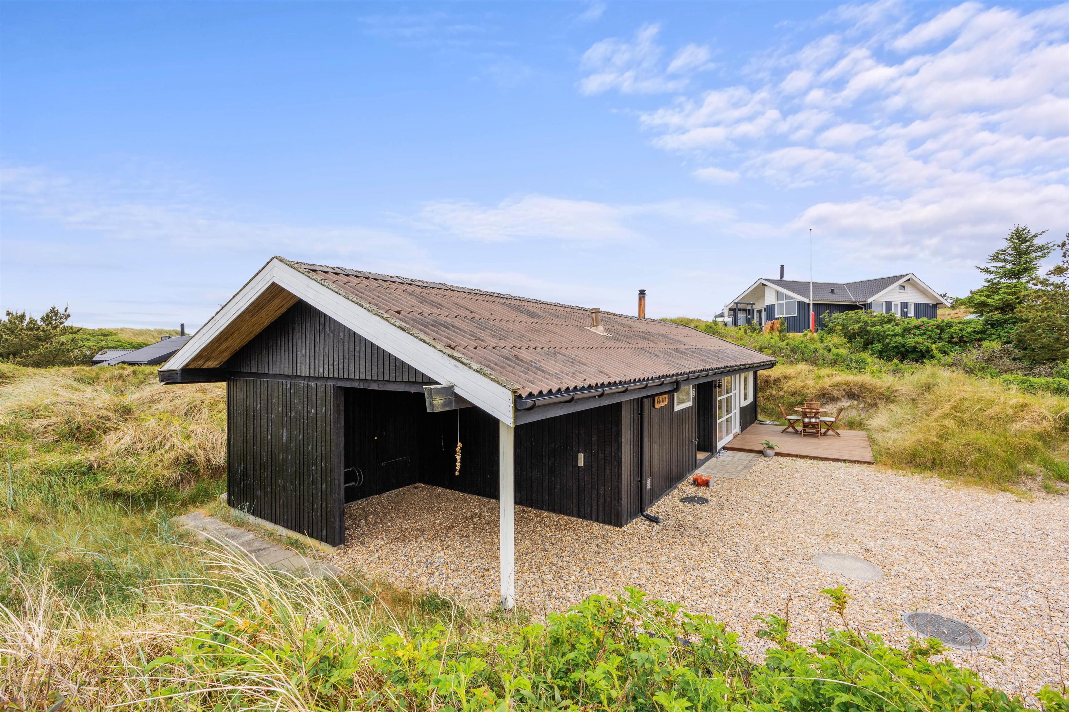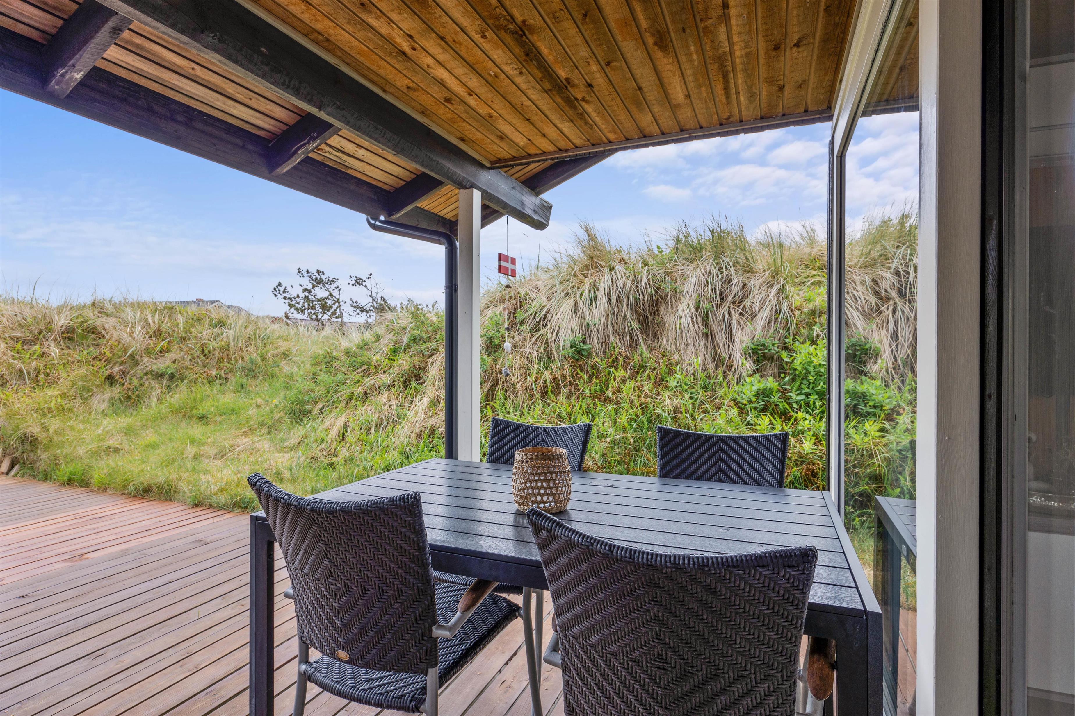 Sommerhuset på Hedelærkevej 15B er beliggende på en klit- og naturgrund på 1500m2 omgivet af klitter og buske. På terrasserne omkring feriehuset vil I helt sikkert kunne finde et behageligt sted med en god bog og en kold drink og nyde vejret – i de solvogne og havemøbler, der står til rådighed. Og skulle vejret ikke være så godt, er en del af terrassen overdækket, og vil I stadig kunne nyde den friske havluft.
