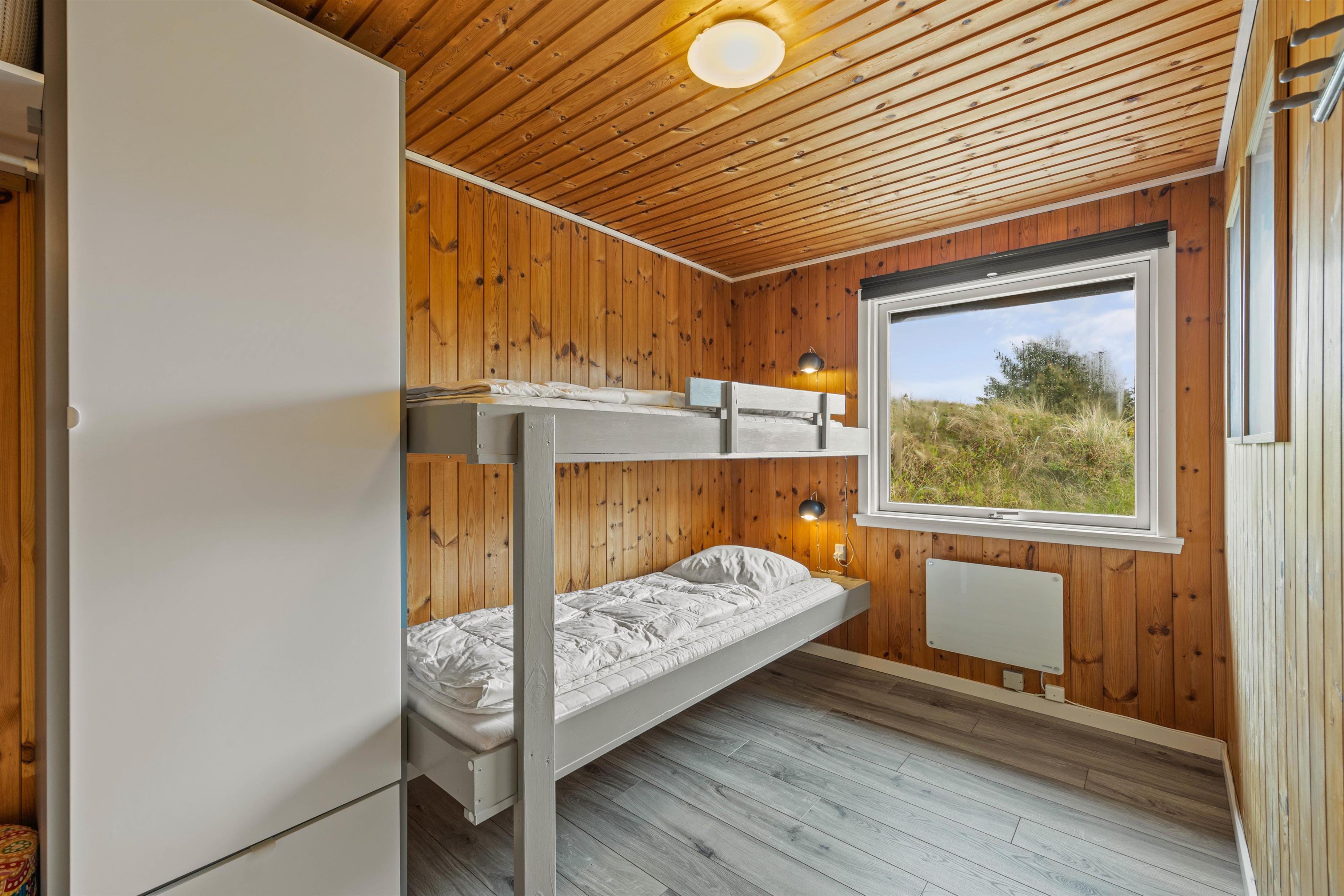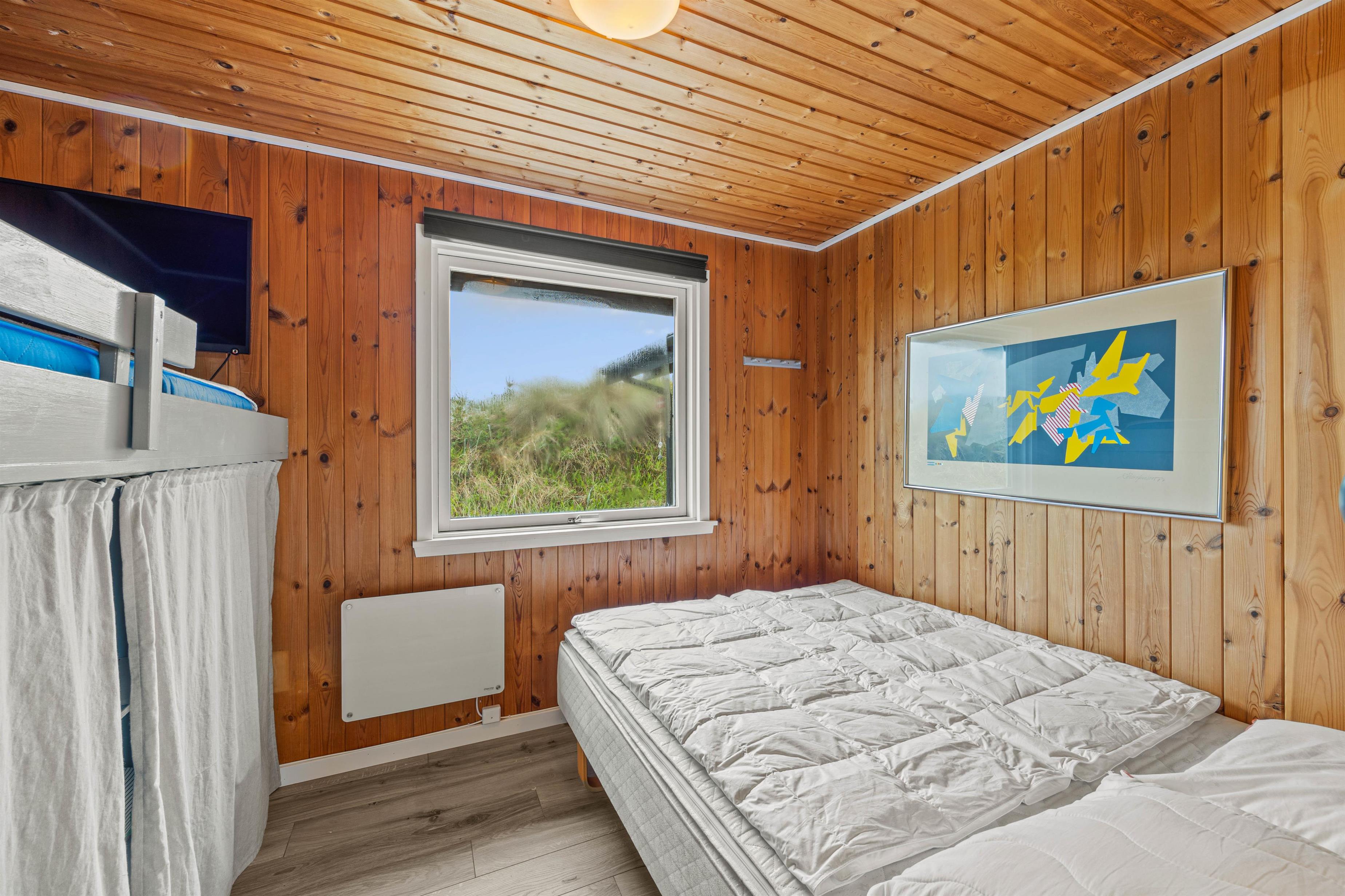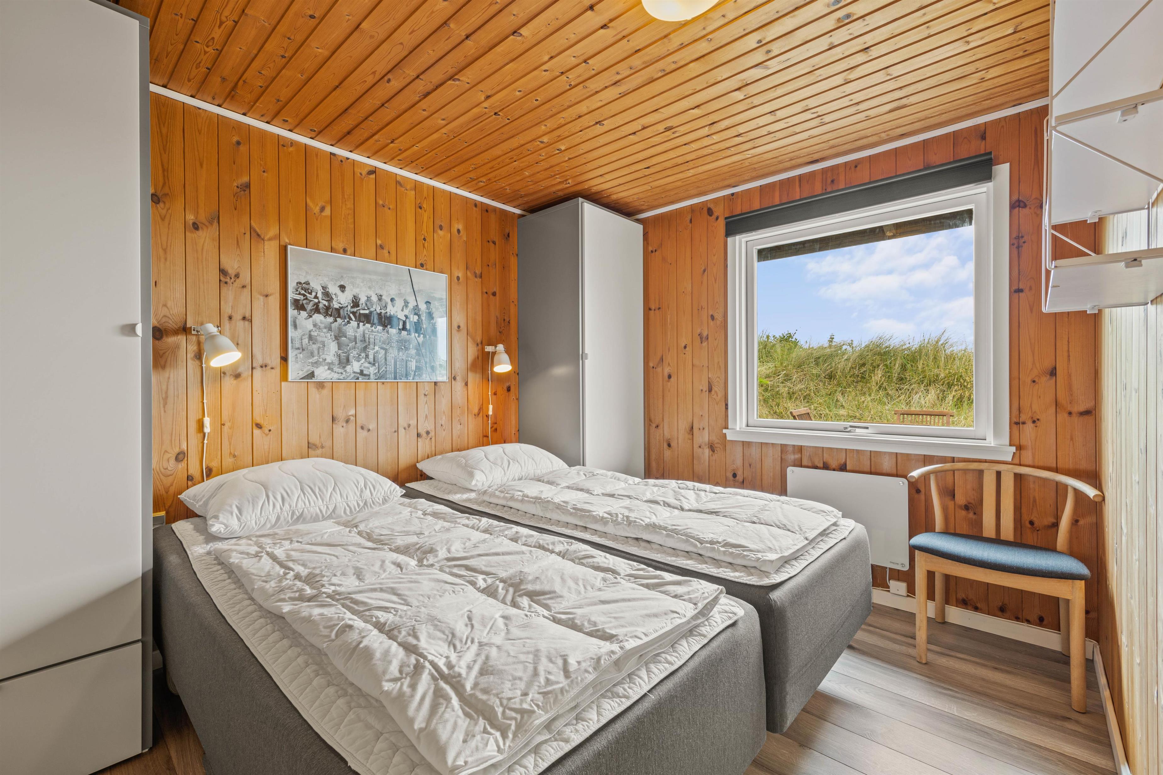 Sommerhuset har 3 soveværelser, hvoraf 2 er udstyret med en dobbeltseng. Det 3. værelse har en køjeseng. Badeværelset har gulvvarme, og her finder I også sommerhusets højdepunkt – en dejlig sauna, hvor I kan slappe af og varme jer op efter en lang tur på stranden.