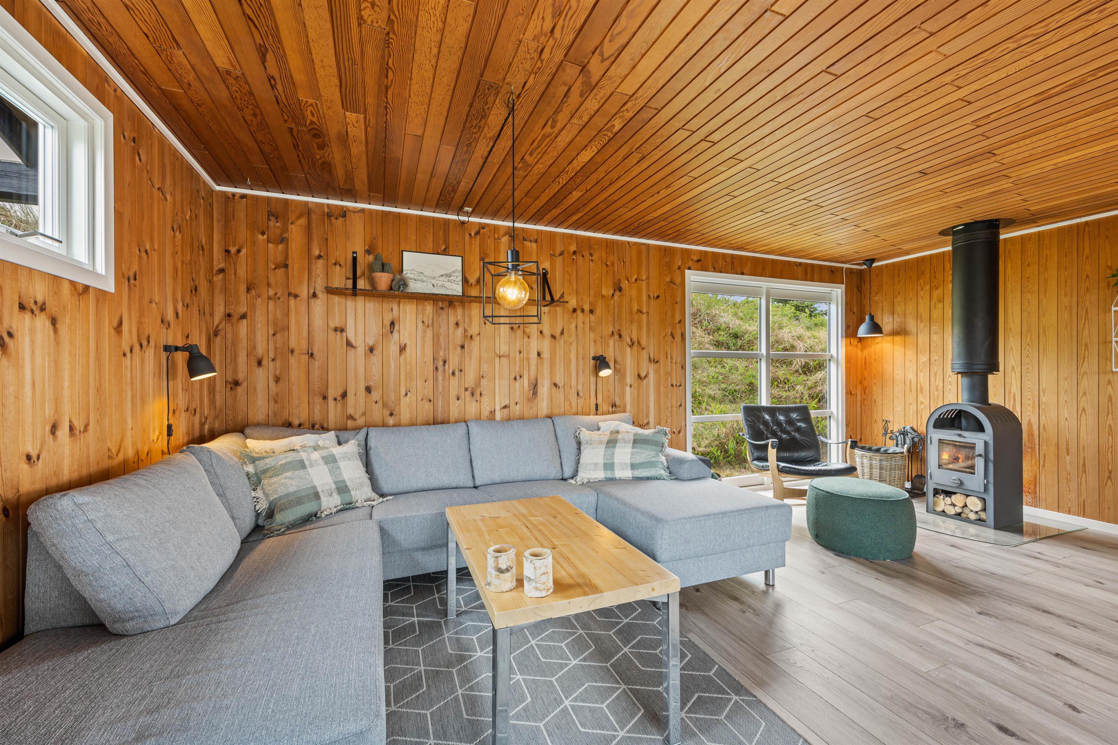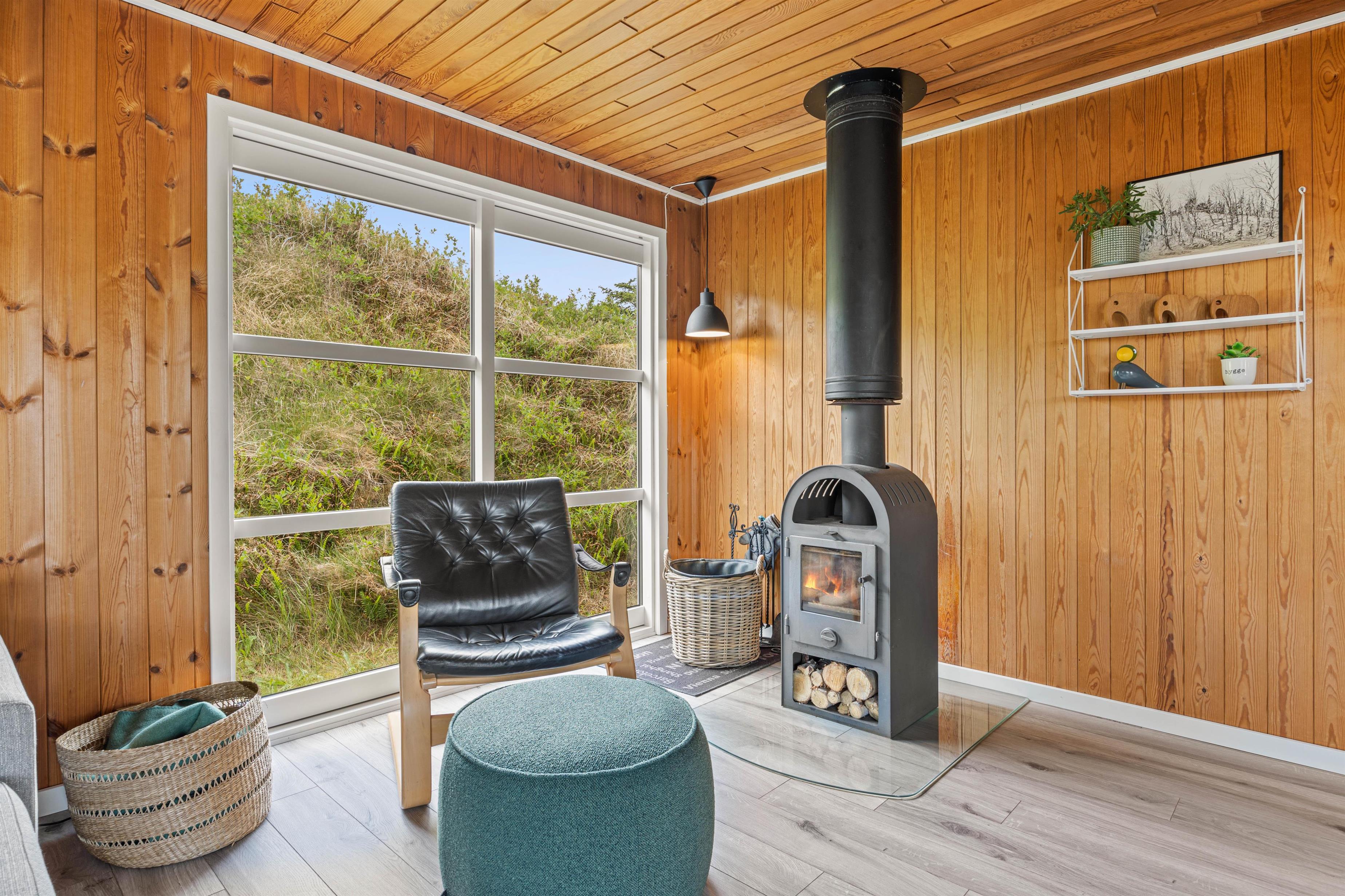 På kolde dage sørger brændeovnen i sommerhuset for hyggelig varme og den typiske feriehusstemning. Ydermere er der installeret en energibesparende luft/luft-varmepumpe i feriehuset, som sikrer en behagelig og konstant temperatur.