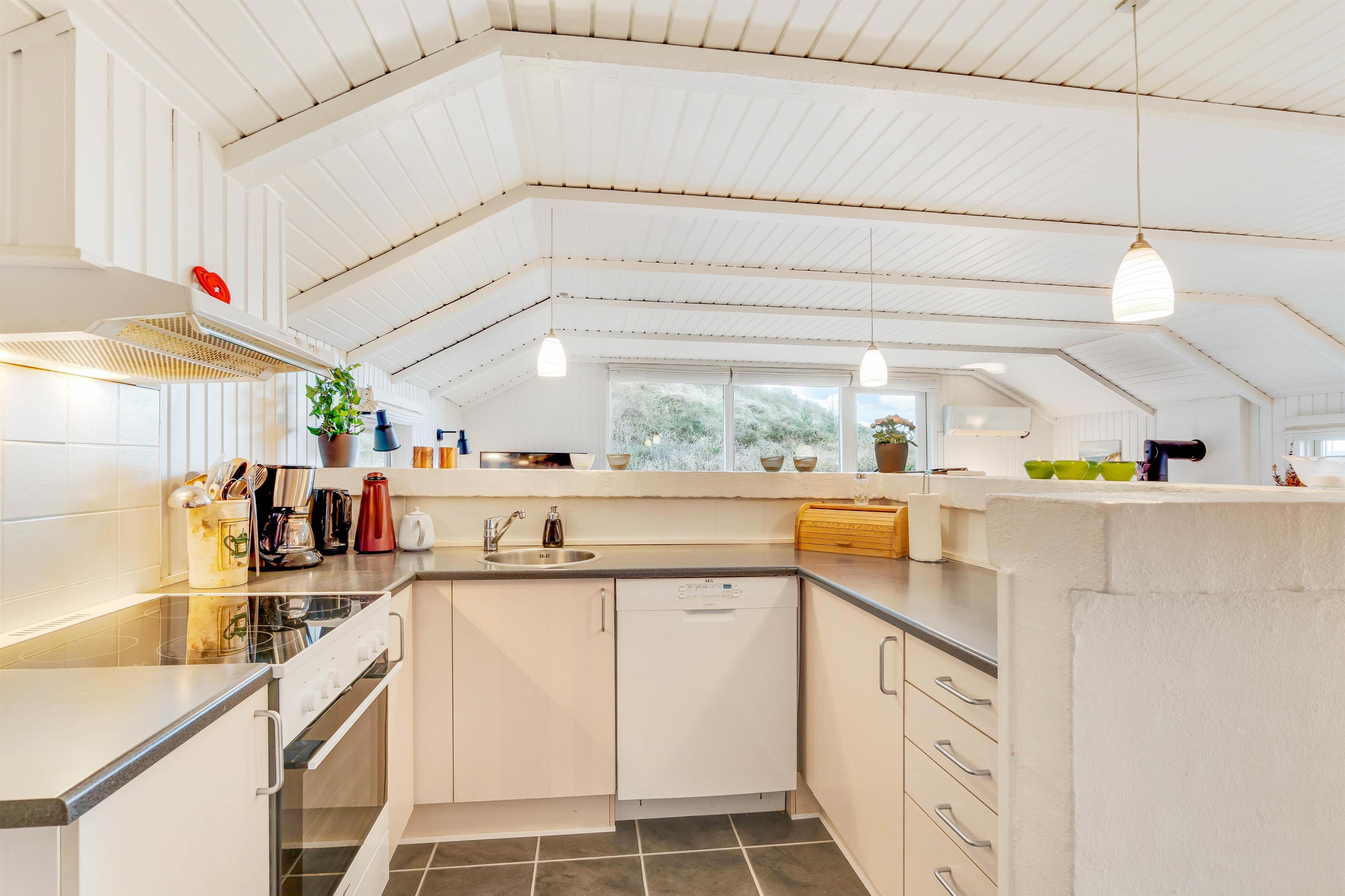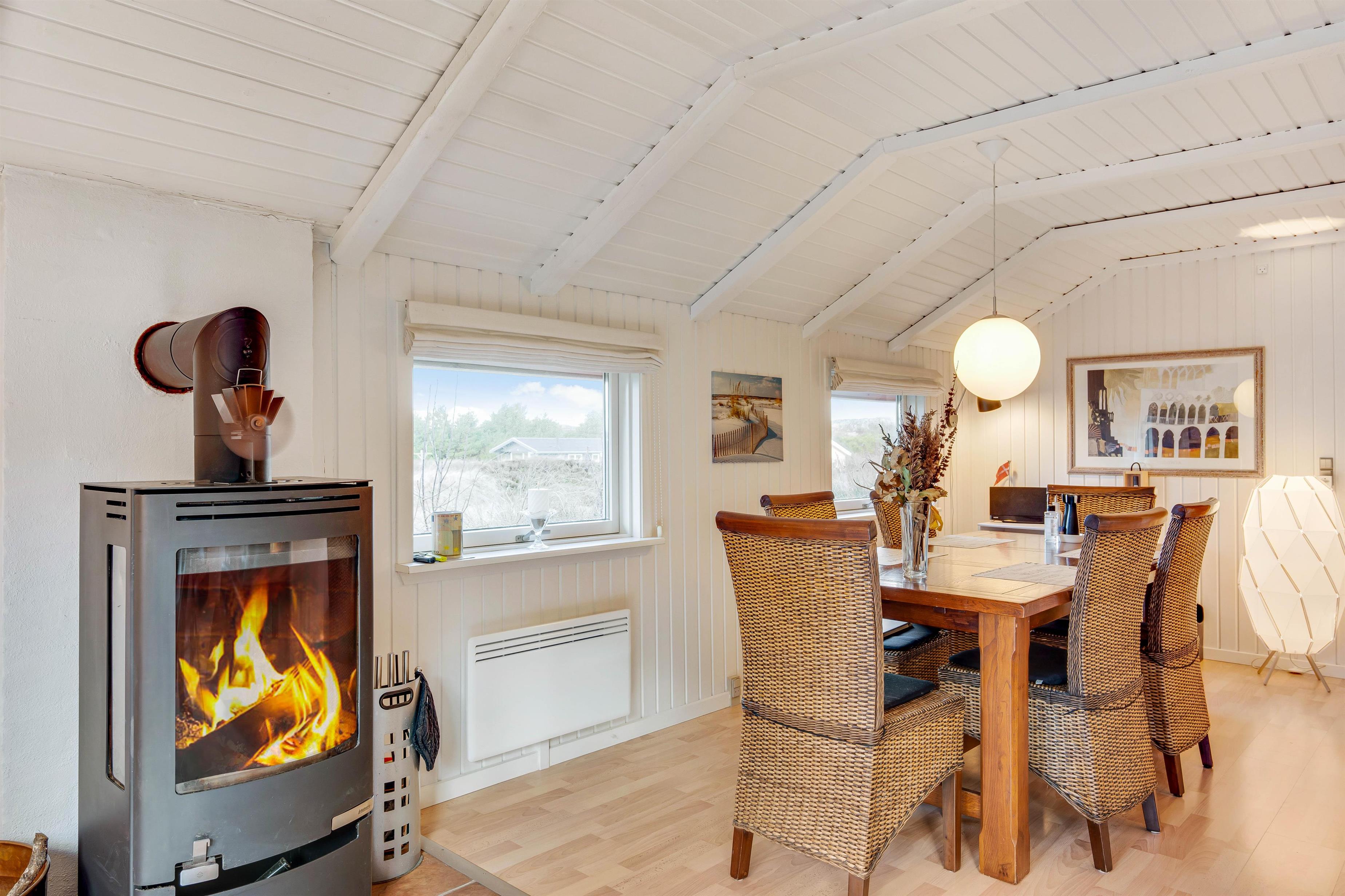 Træd inden for i dette hyggelige sommerhus, hvor de lyse omgivelser og ferieatmosfæren byder jer velkommen. Køkkenet og stuen er i åben forbindelse, så I kan nyde hinandens samvær, uanset om én laver mad, og en anden slænger sig i sofaen. Om aftenen kan hele familien samles foran fladskærms-tv’et, hvor brændeovnen øger hyggen til næste niveau.